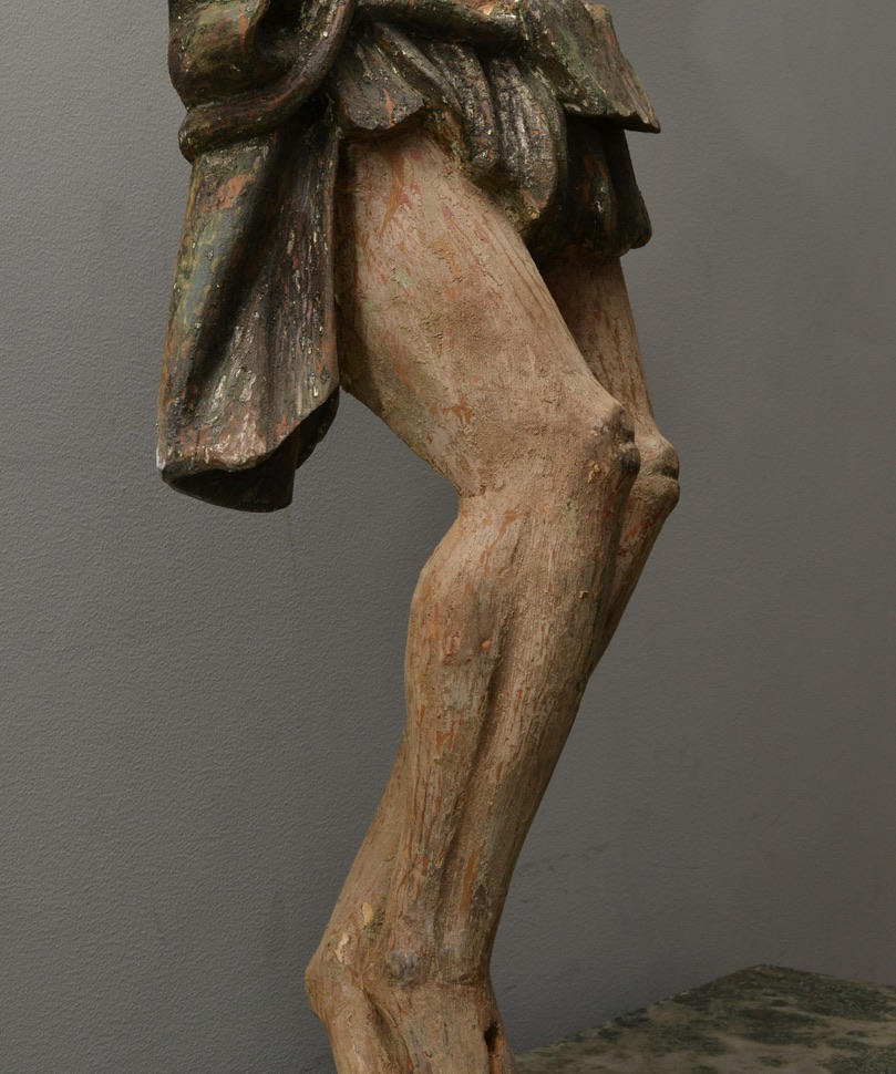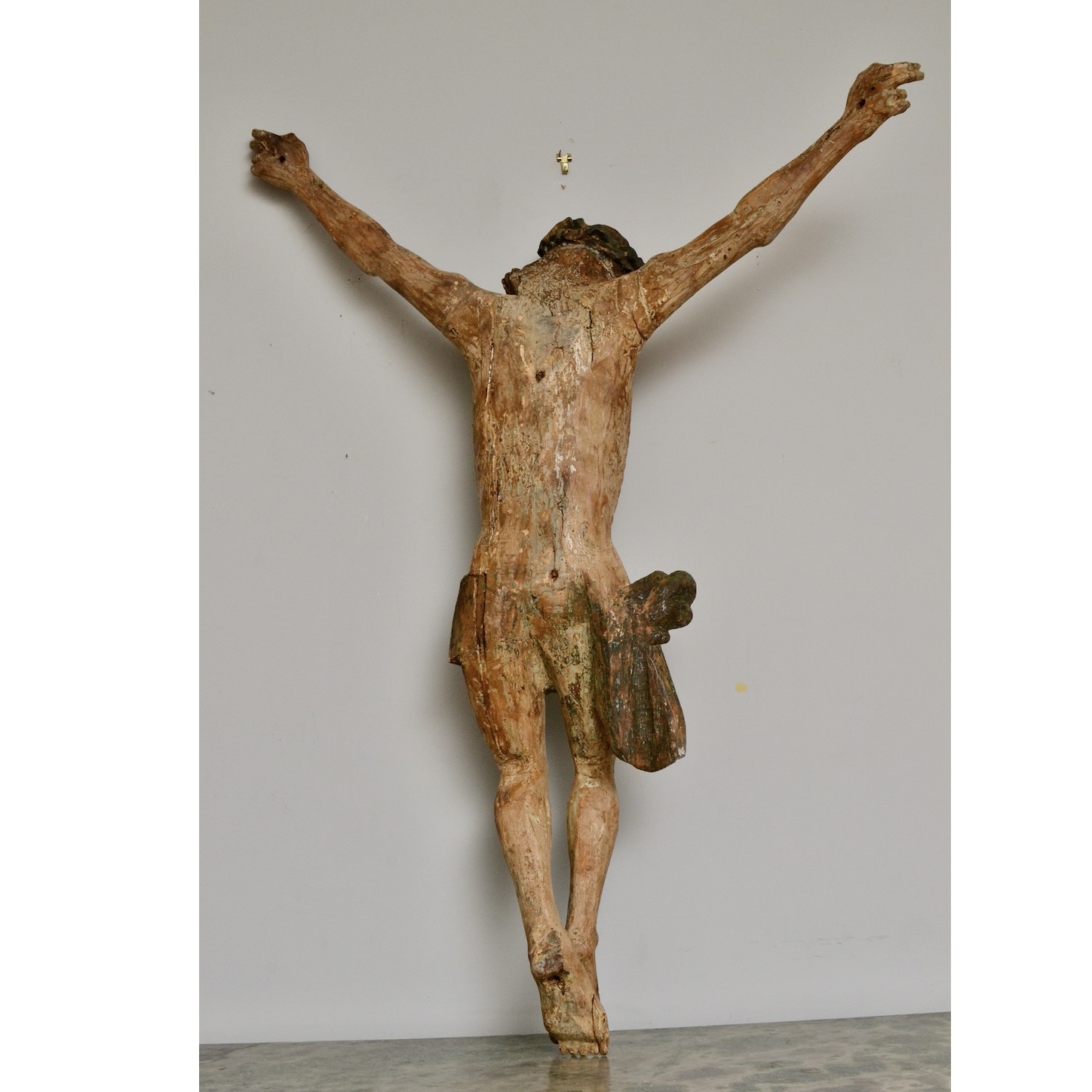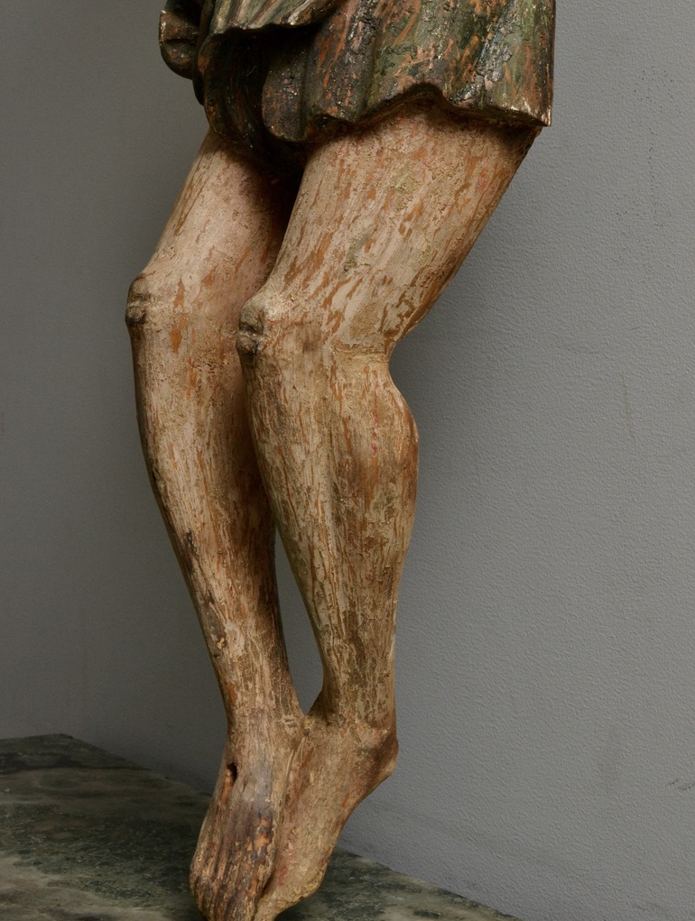 Sometimes relics where hidden in these sculptures and it is possible that there is a hidden space in our Christ on his left side where the ribs are. A lid looking piece with part of his ribs sculptured to be part of the rest is visible on the left side opposite his wound.