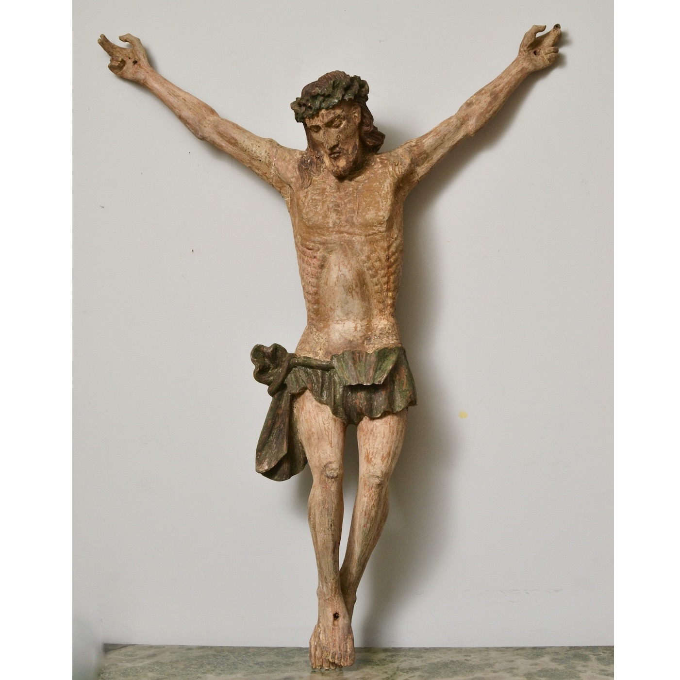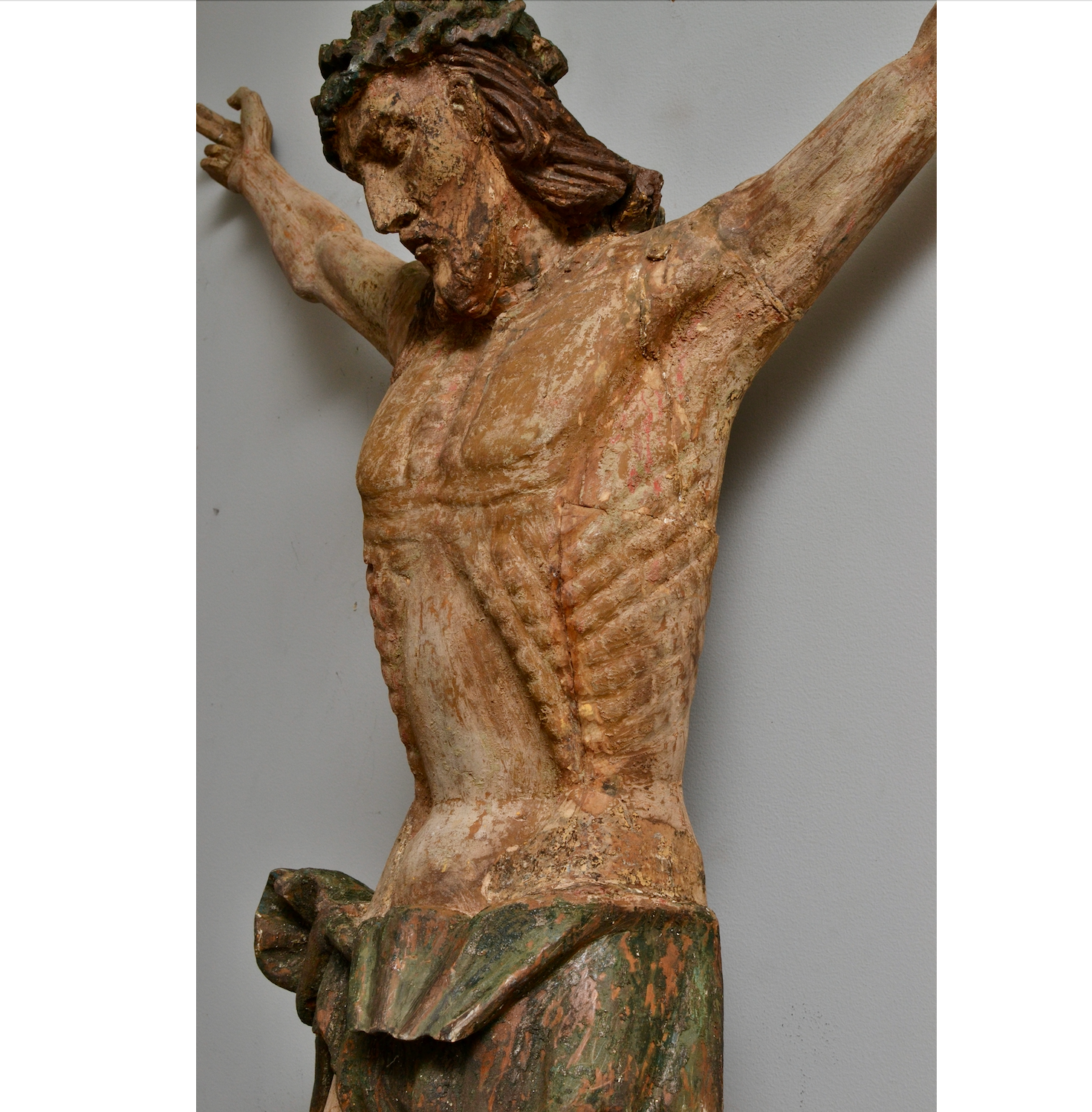 Rare late 15th century or early 16th century Gothic Corpus Christi wood sculpture. Probably North German or South Sweden. This large Christ sculpture has a worn beautiful original polychrome painted surface. It is a striking sculpture with Christ´s suffering clearly expressed. The way the rib cage is sculpted is very unusual. There is a Corpus Christi sculpture in the Historic museum of Stockholm with a similar treatment.