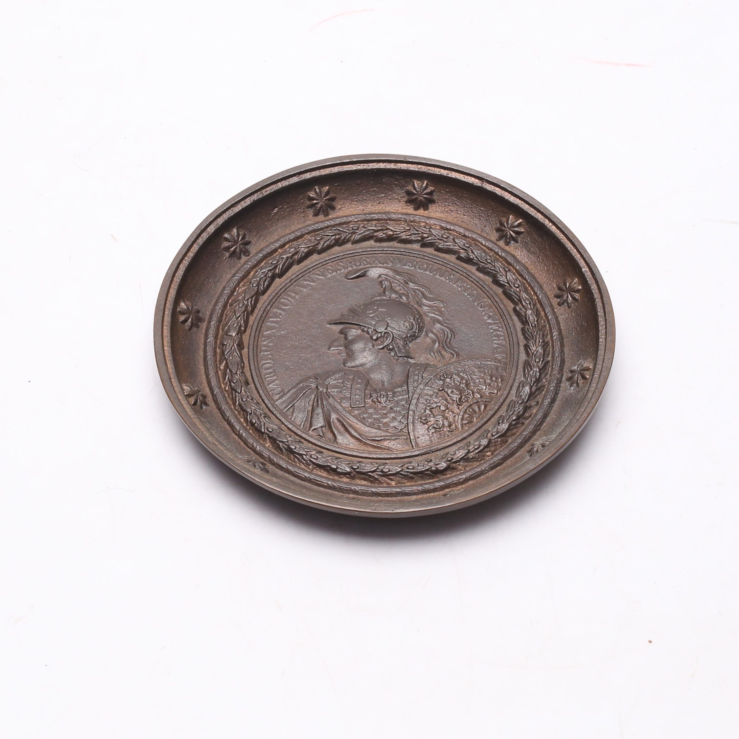 It is a relief portrait of Karl XIV Johan as a Roman general, with text "Carolus XIV Iohannes Rex Sveciae et Norvegiae" and made by Finspång's foundry. It has a small metal loop attached on the back so that it can hang on a wall.