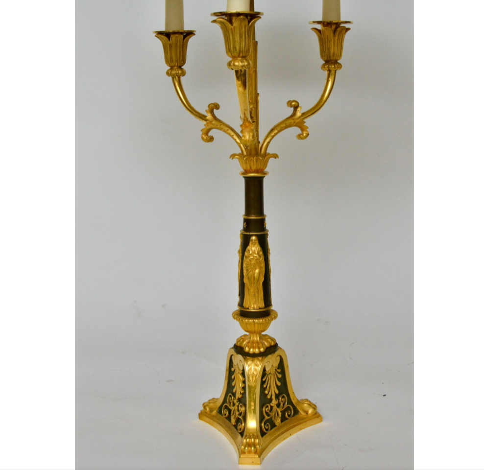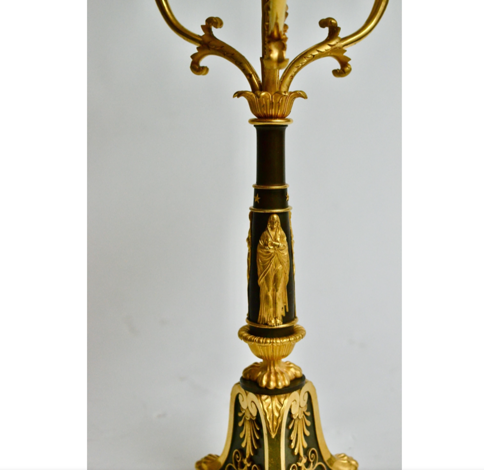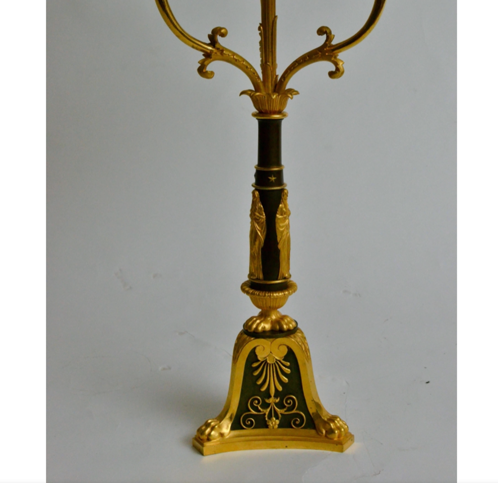 A very large and impressive empire gilt and patinated bronze table bouillotte or candelabra lamp. A green painted and gilt metal lamp shade with gilt bronze mounts of medusa heads and laurel-crowns. The shade is mounted on a square steel rod and adjustable in height with an arrow shaped gilt pin screw. Three gilt bronze arms with three single candleholders is mounted on the central gilt and patinated bronze stem and below the arms are three gilt finely executed vestals mounted. The gilt bronze candelabra is finely cast and chiseled and of unusual quality. Made in Paris ca.1810-1820.