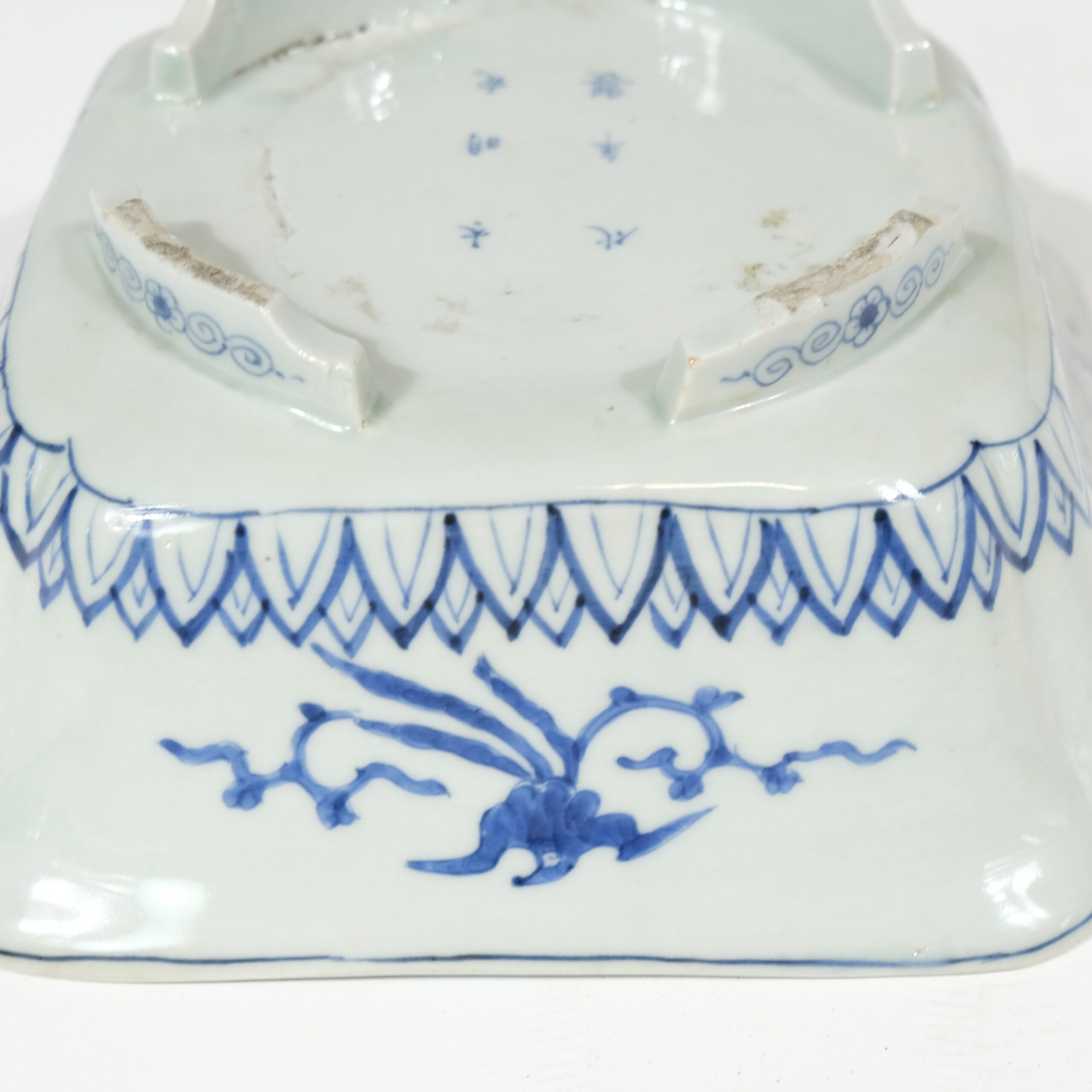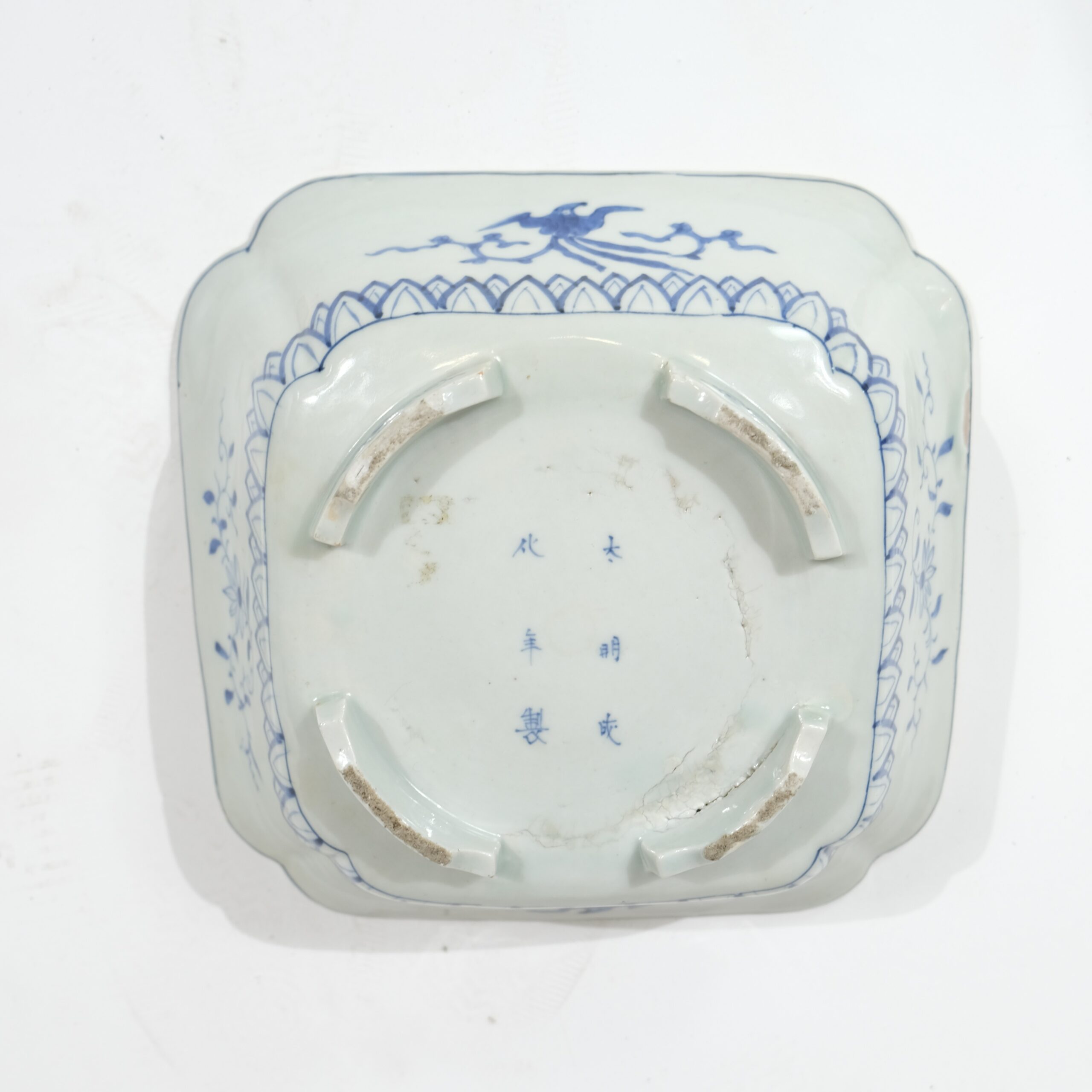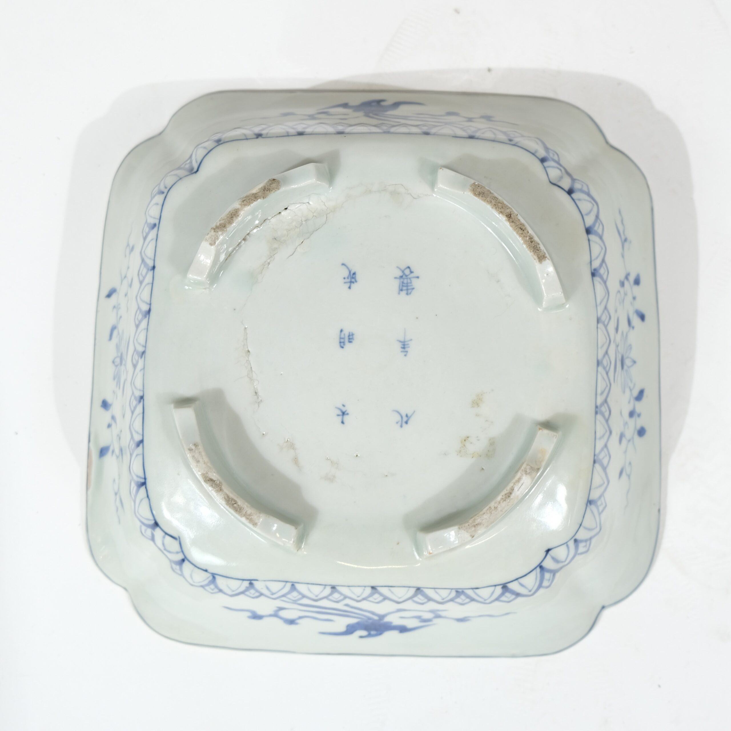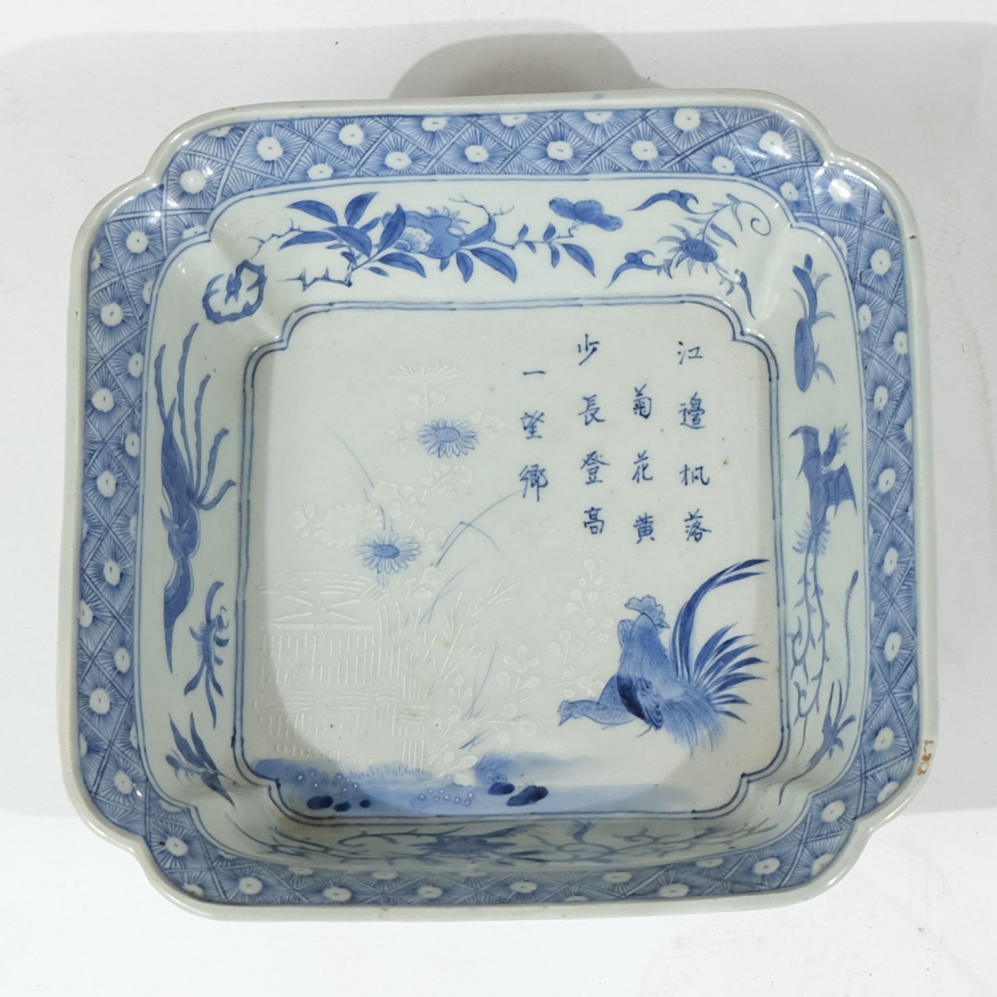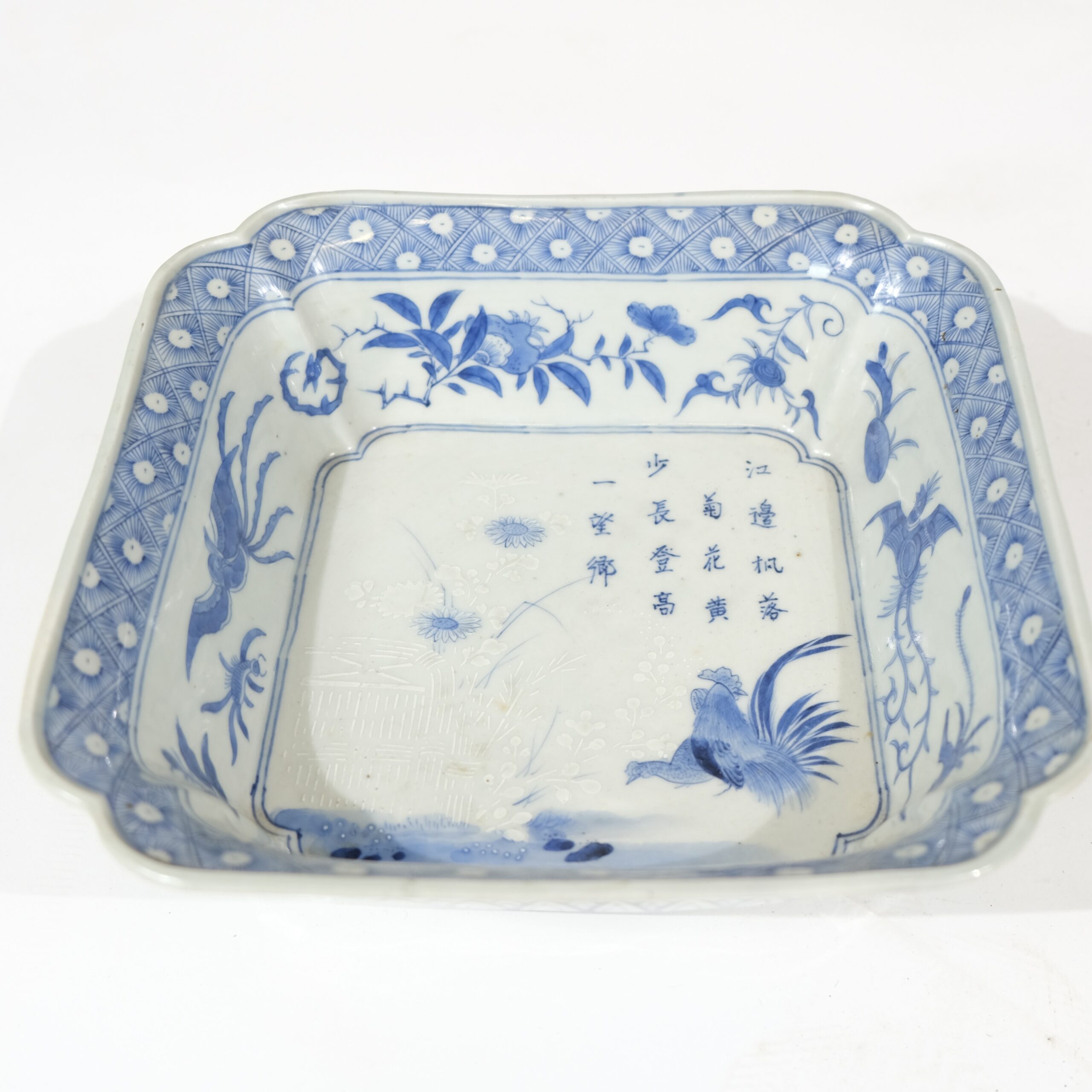 A rectangular Japanese porcelain bowl decorated in blue and white colours. Motives of a poem, a rooster and a hen.