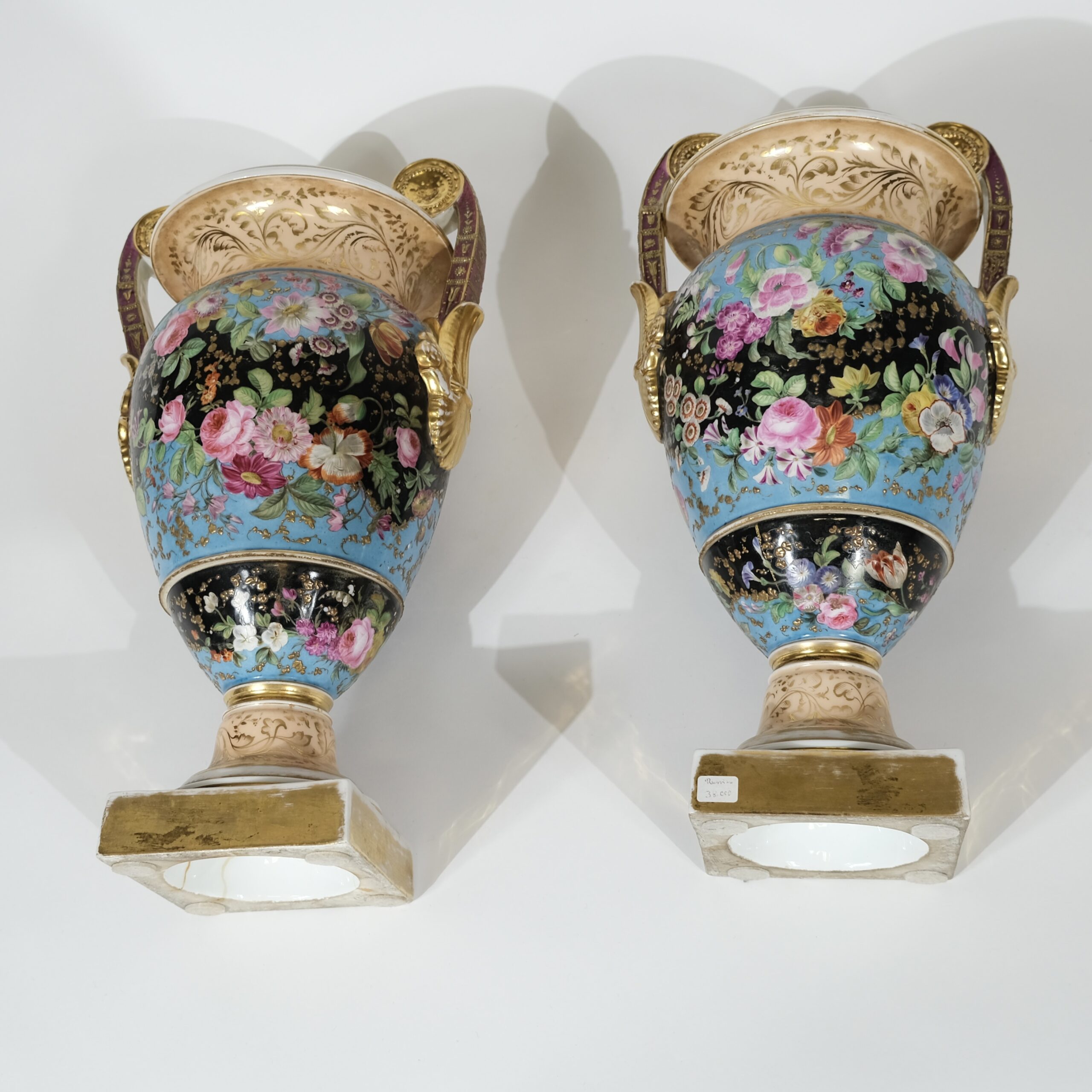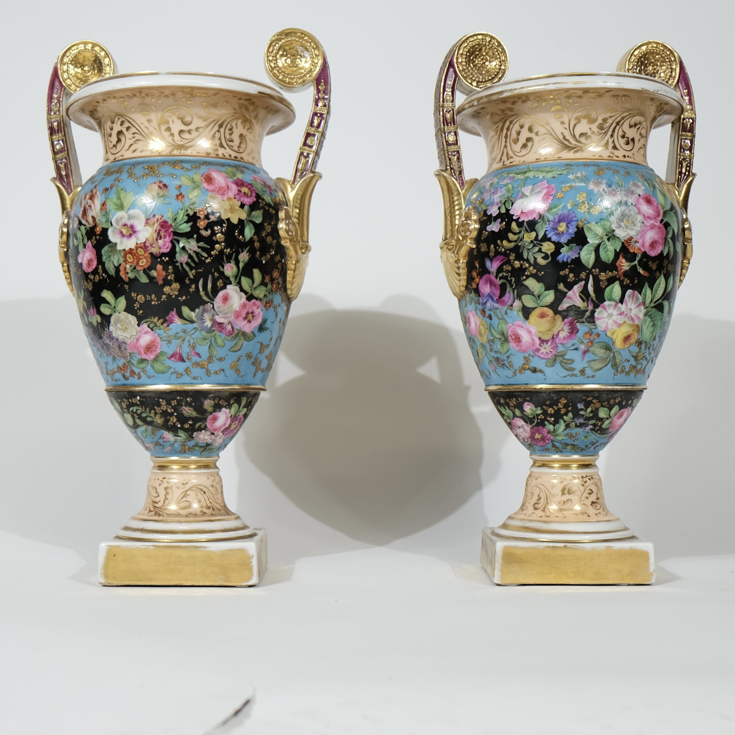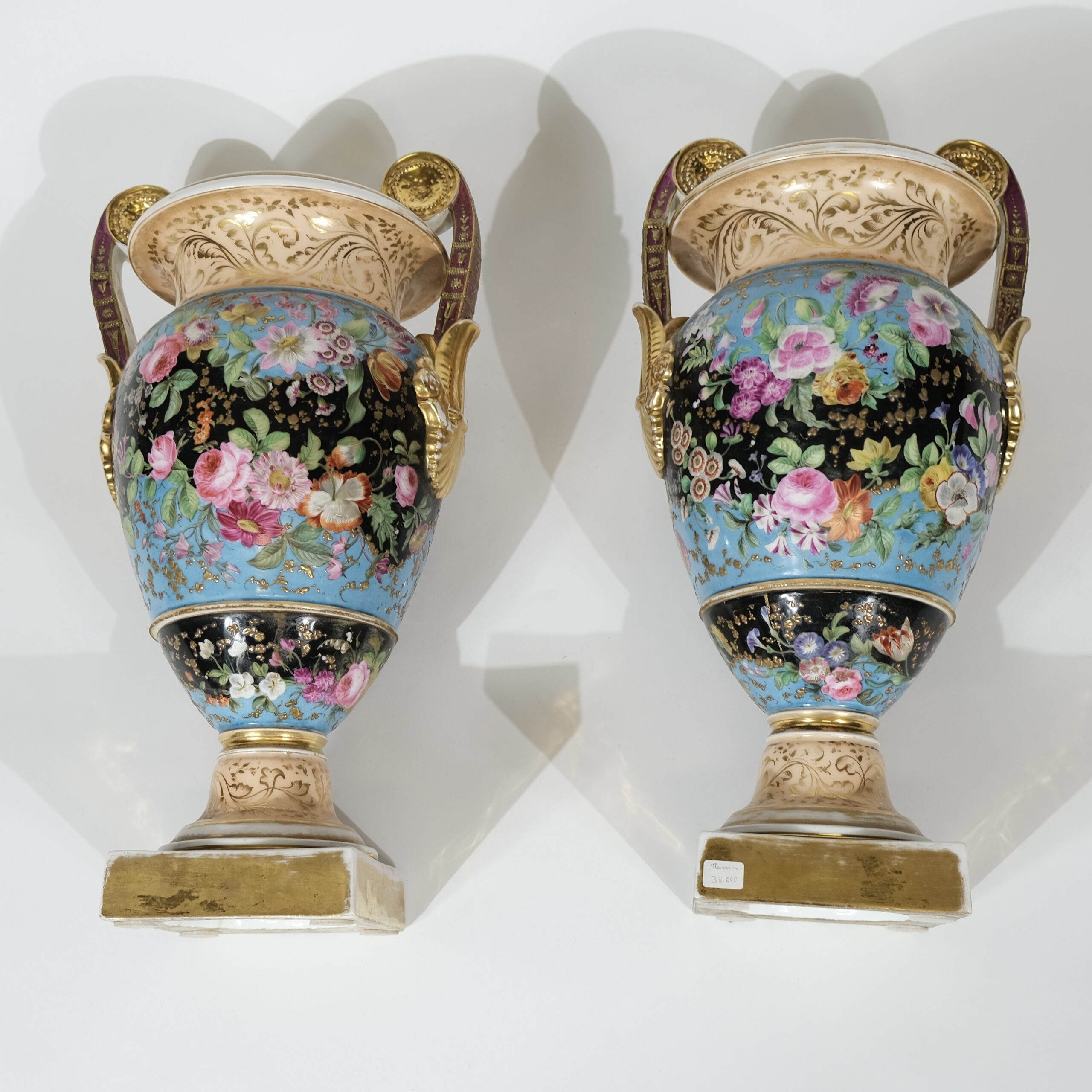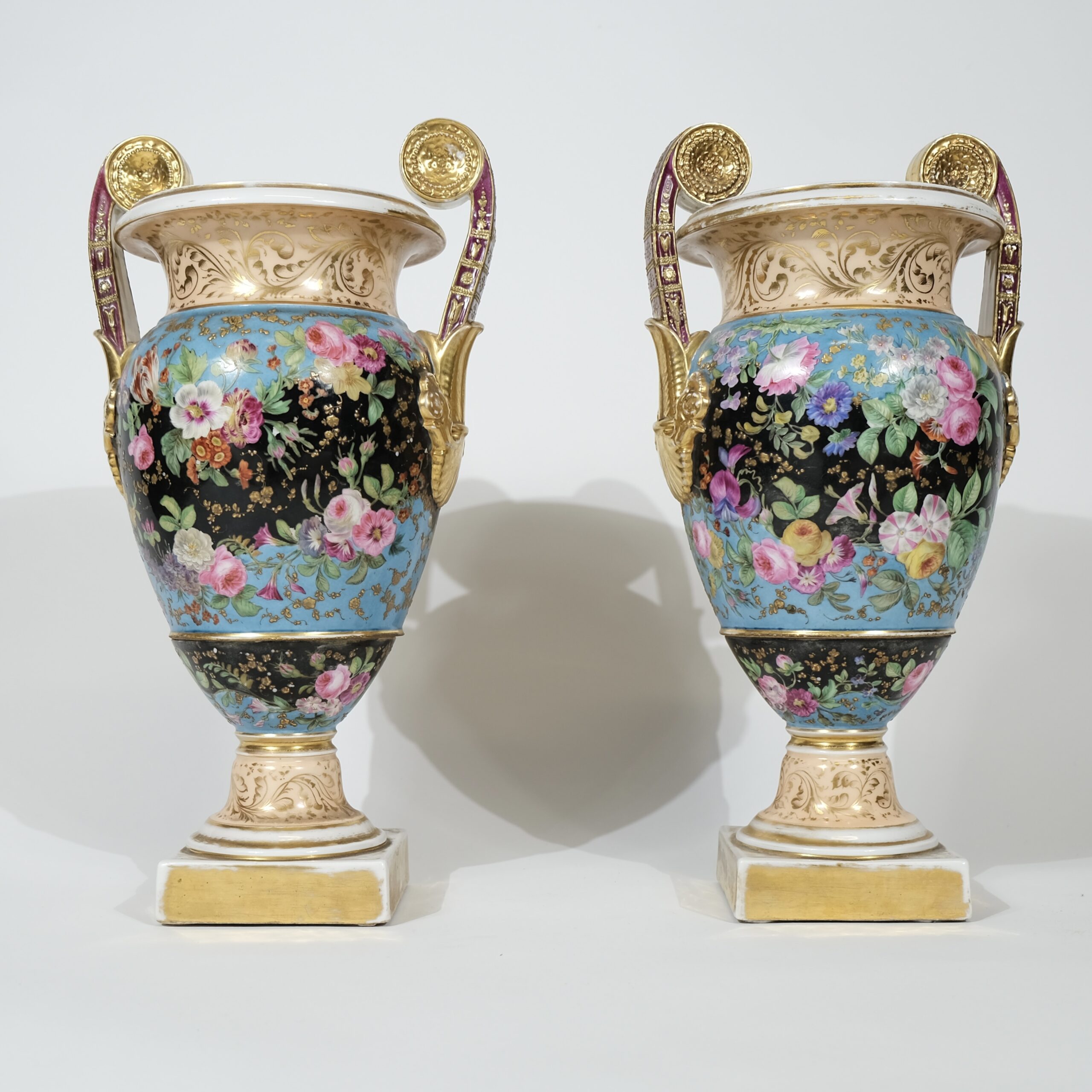 Apair of Empire porcelain vases that seamlessly merge timeless elegance with botanical artistry. Adorned with exquisite motifs of flowers set against a dramatic black background, these vases encapsulate the opulence of the Empire style while celebrating the beauty of nature. Fantastic quality of the paintings.