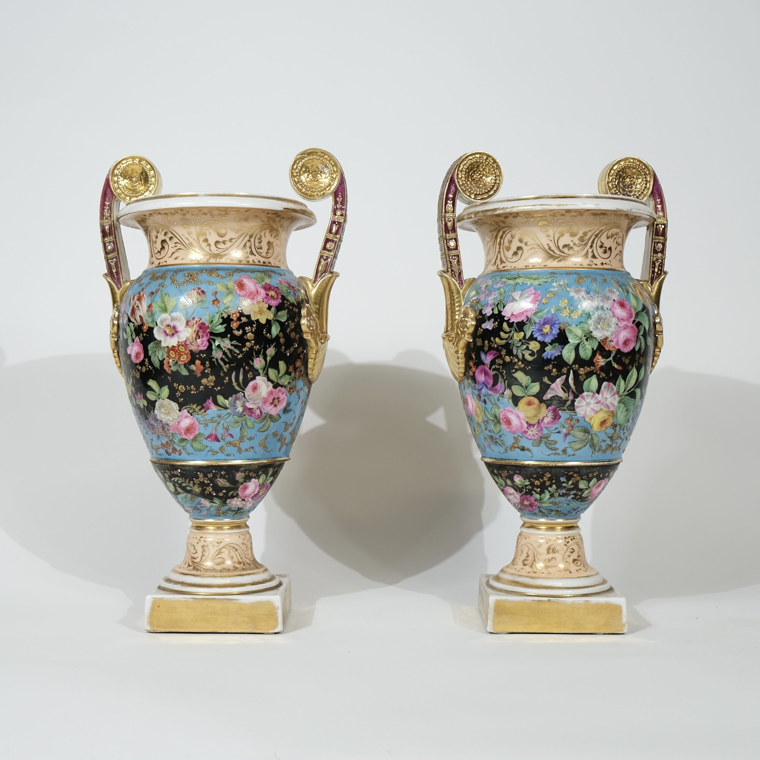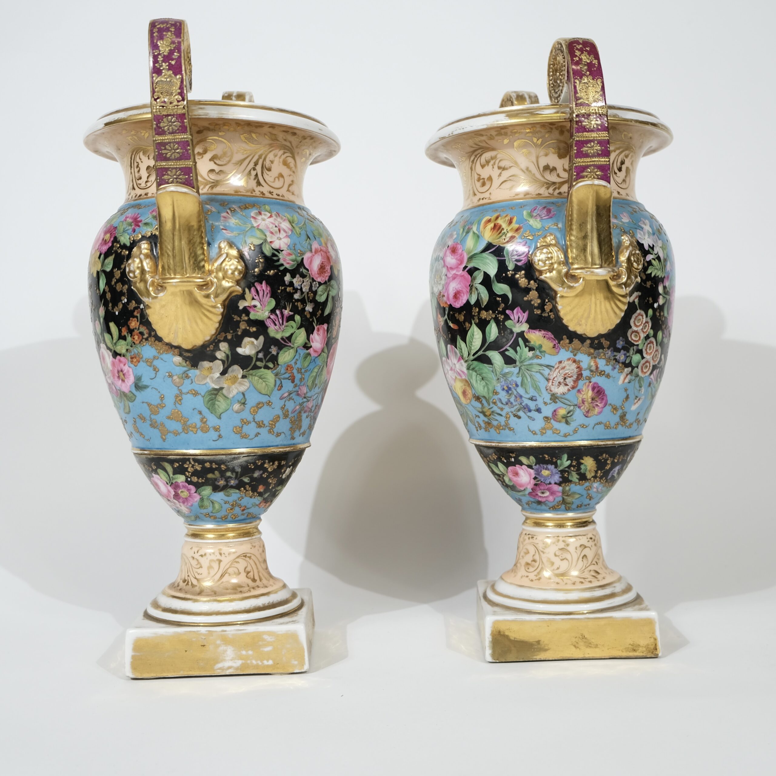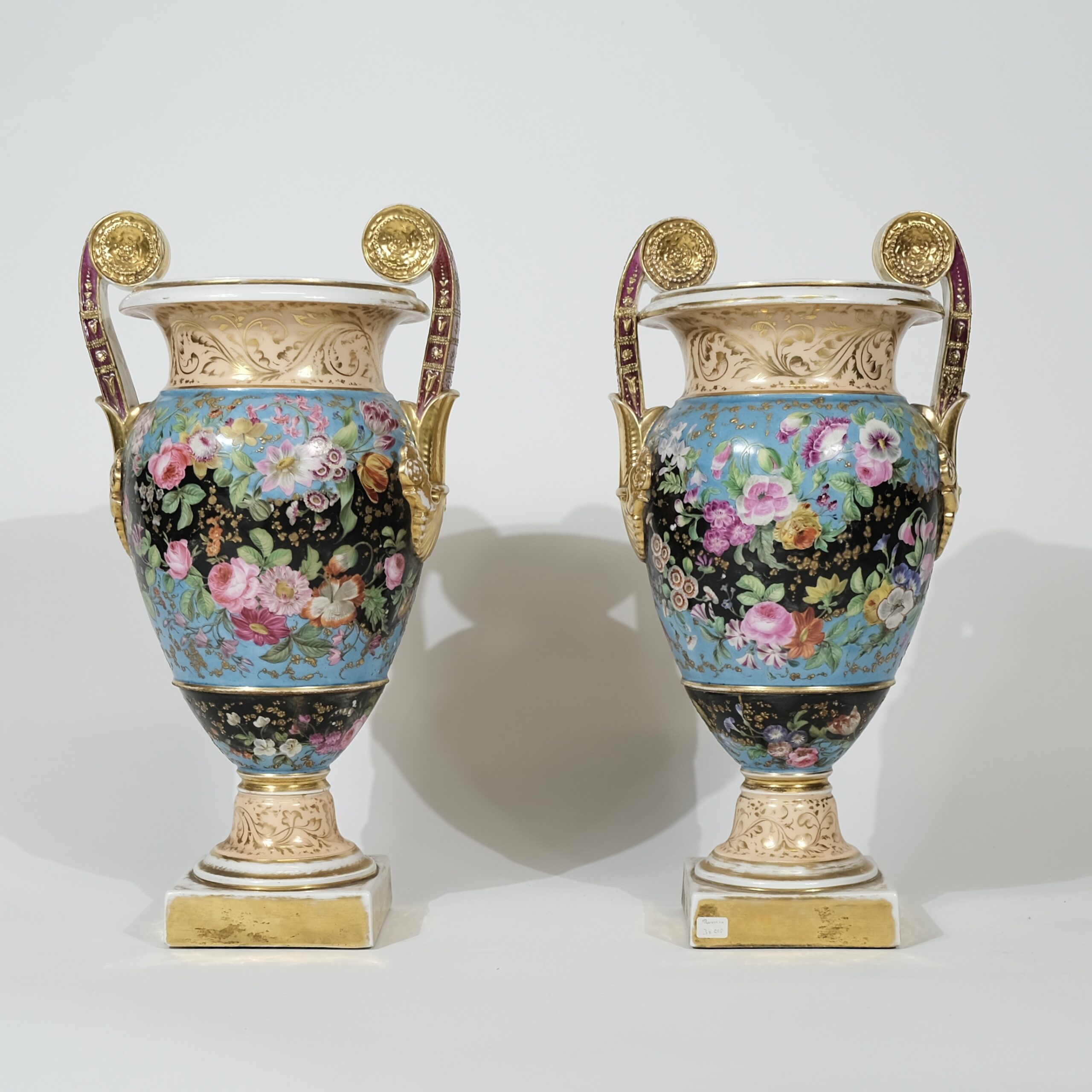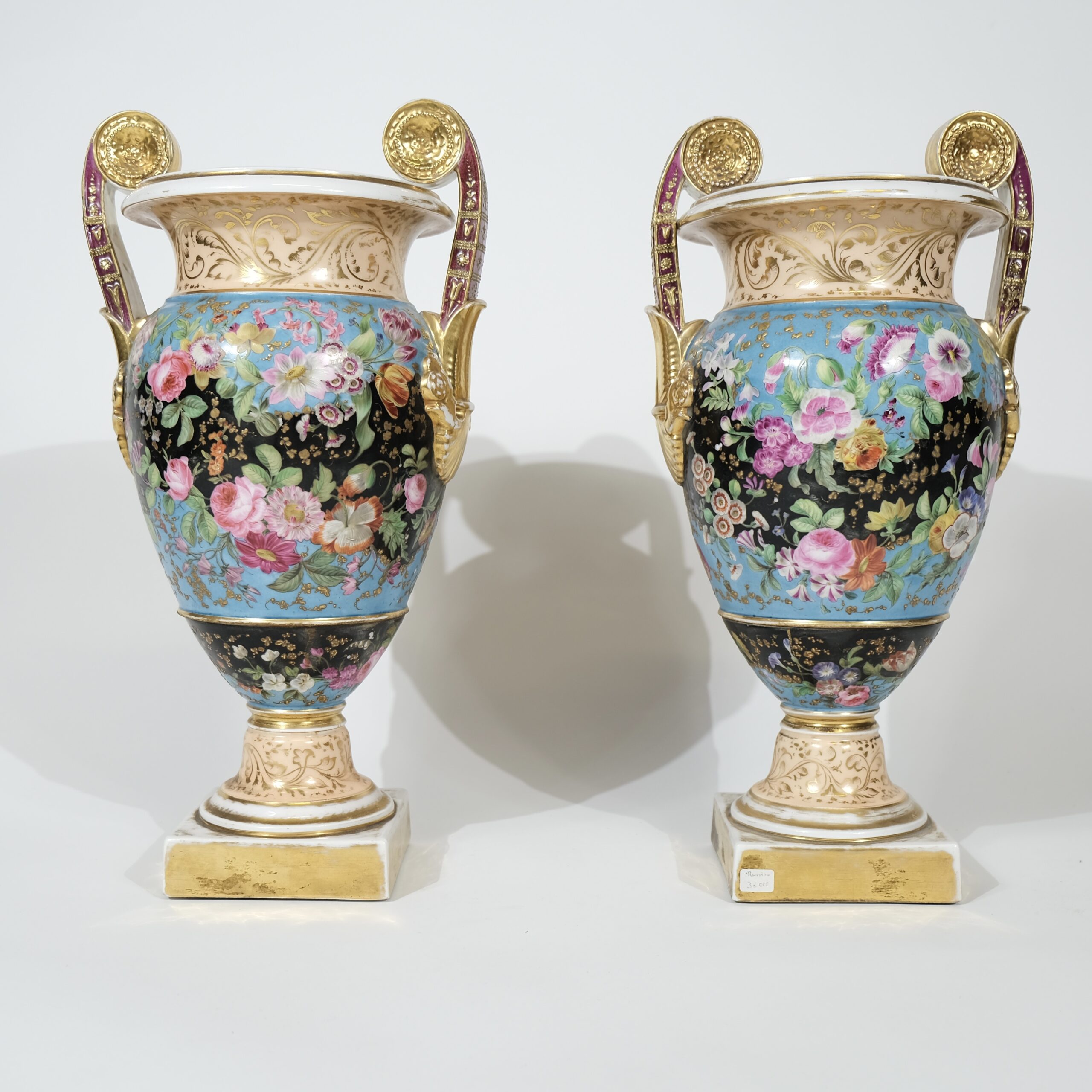 Apair of Empire porcelain vases that seamlessly merge timeless elegance with botanical artistry. Adorned with exquisite motifs of flowers set against a dramatic black background, these vases encapsulate the opulence of the Empire style while celebrating the beauty of nature. Fantastic quality of the paintings.