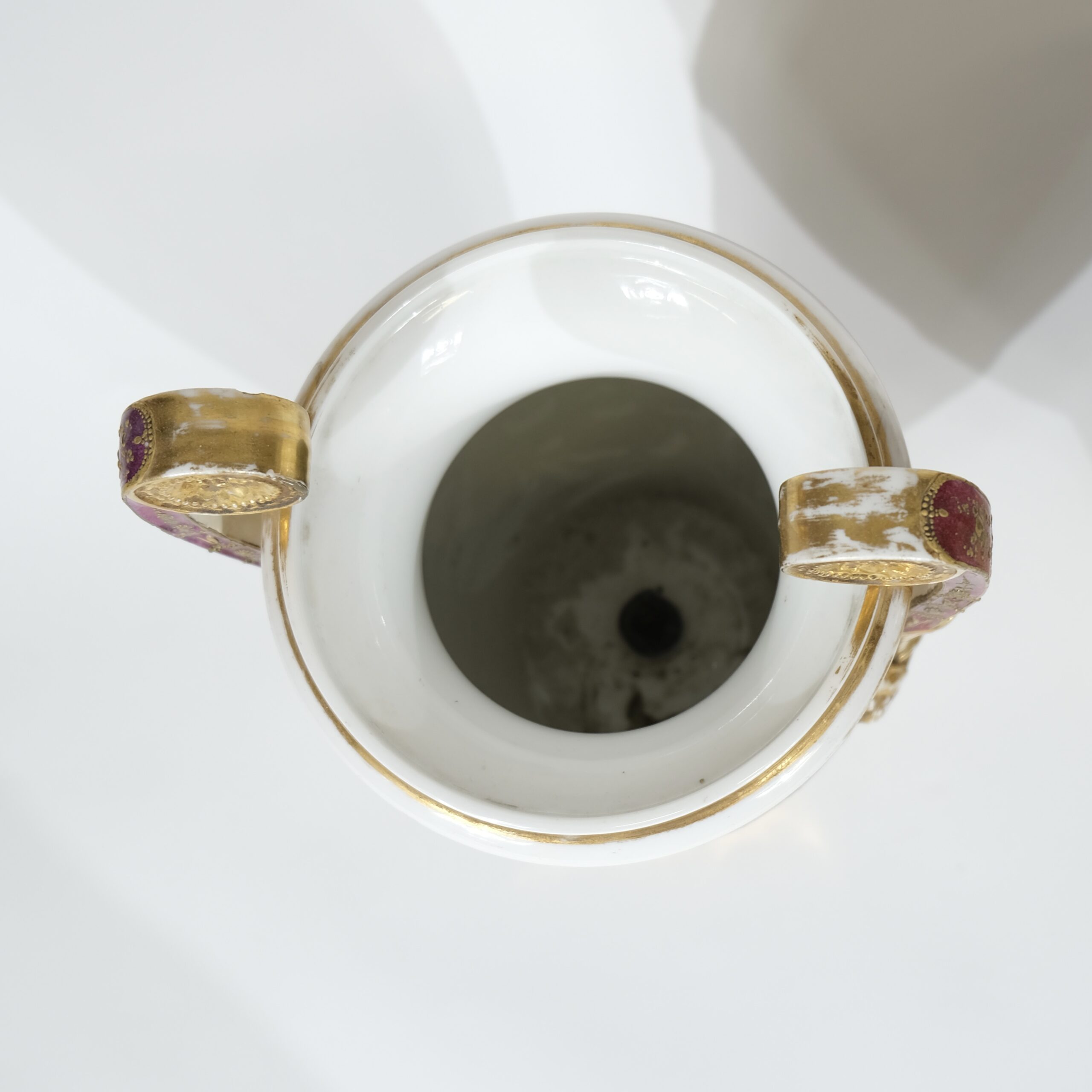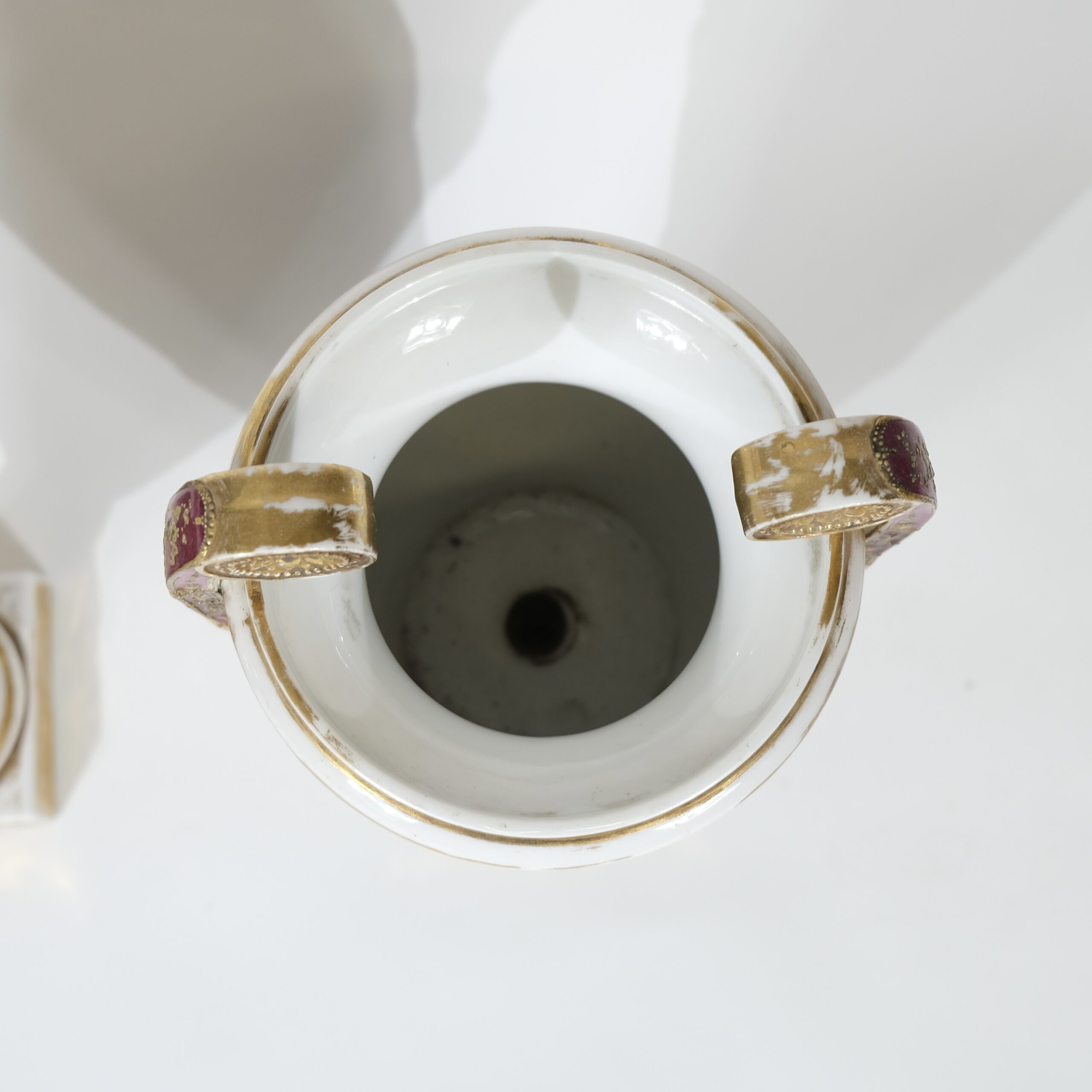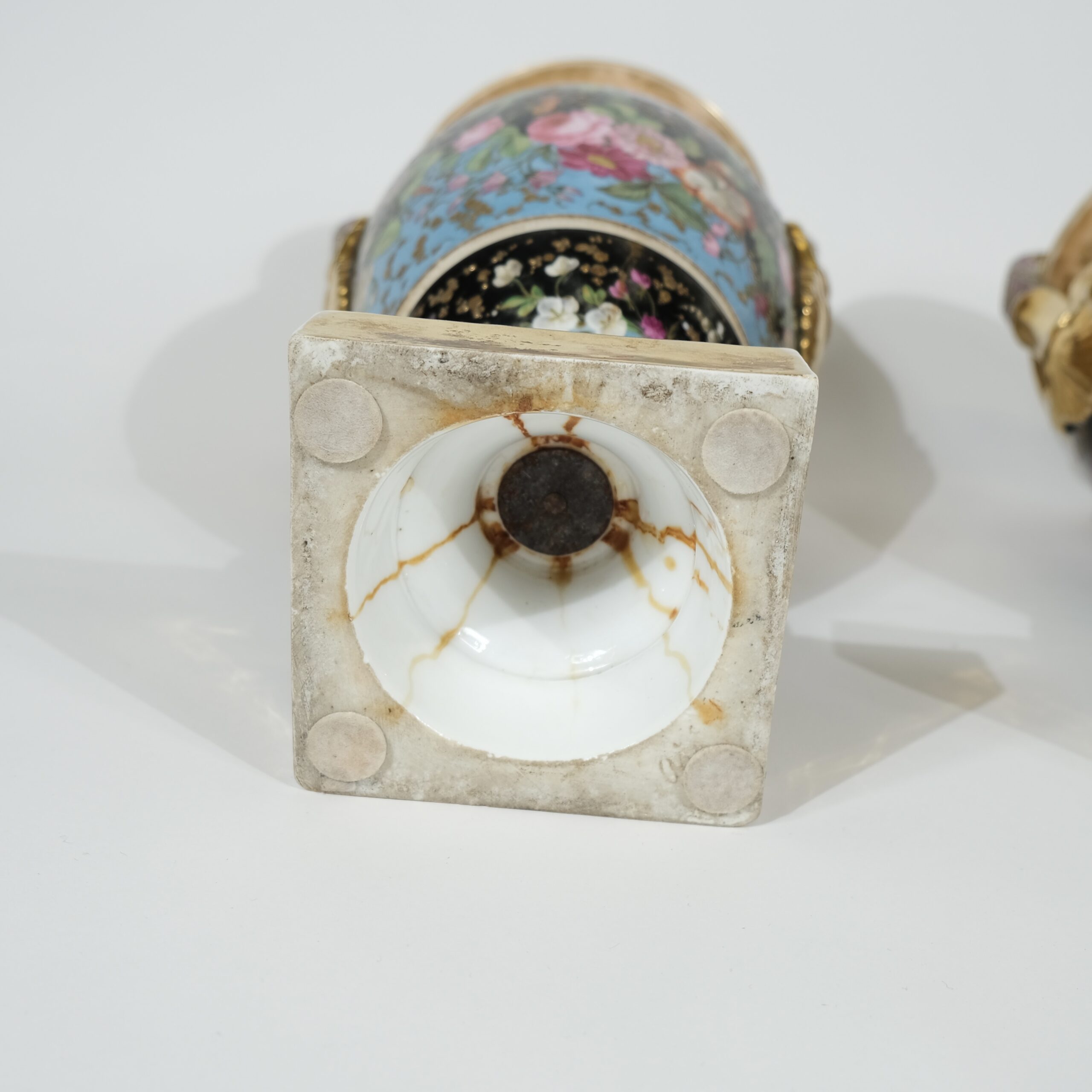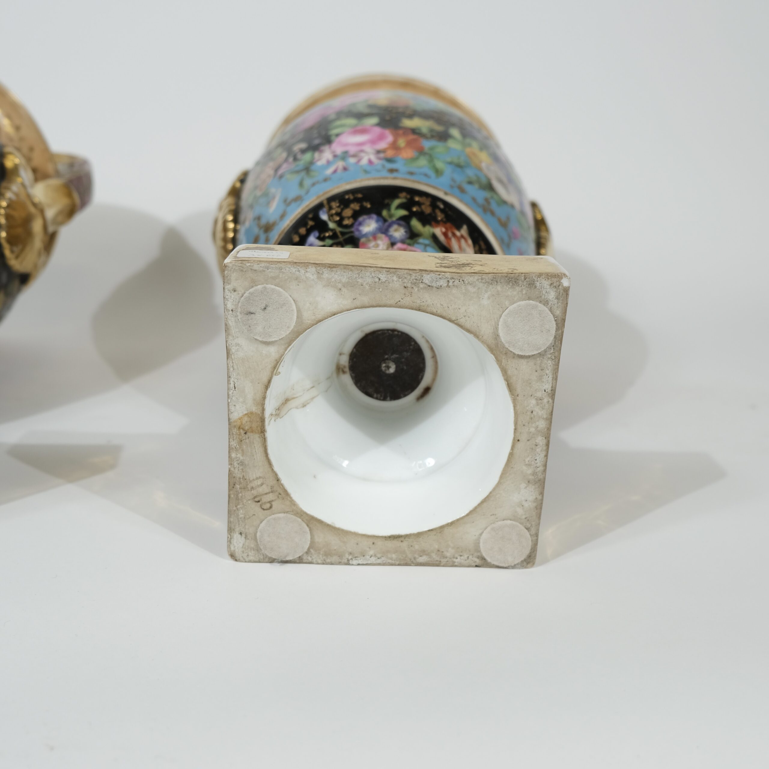 Apair of Empire porcelain vases that seamlessly merge timeless elegance with botanical artistry. Adorned with exquisite motifs of flowers set against a dramatic black background, these vases encapsulate the opulence of the Empire style while celebrating the beauty of nature. Fantastic quality of the paintings.