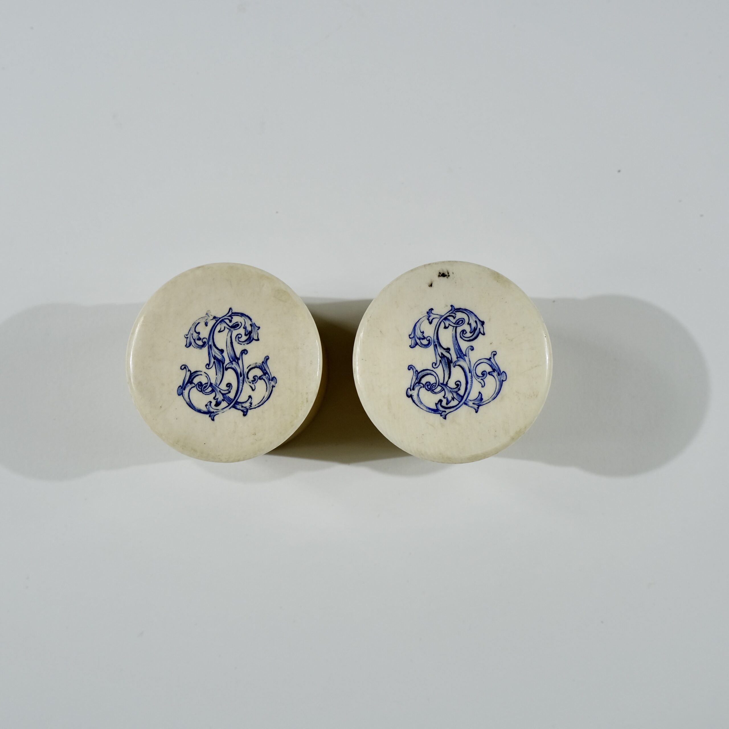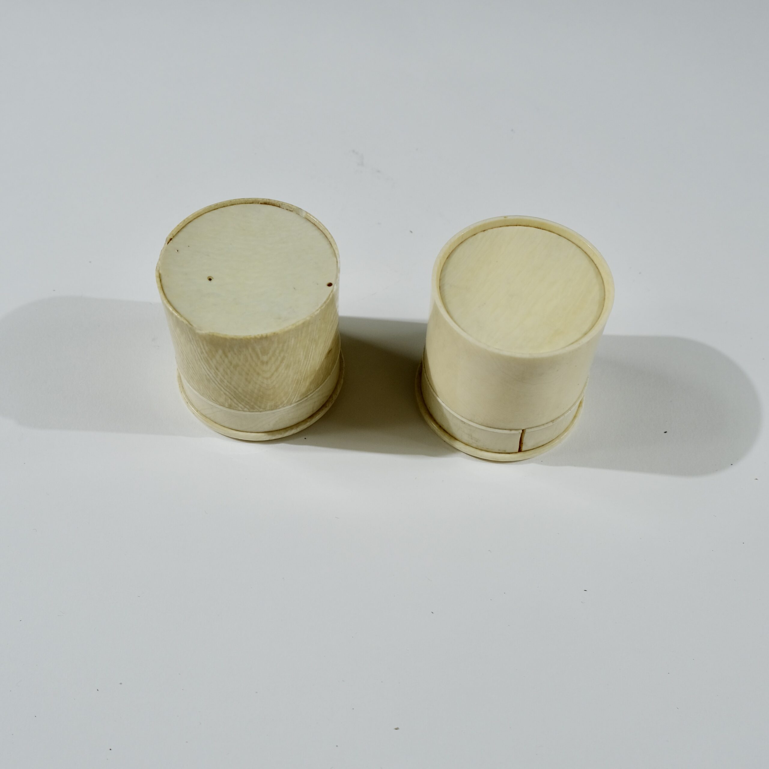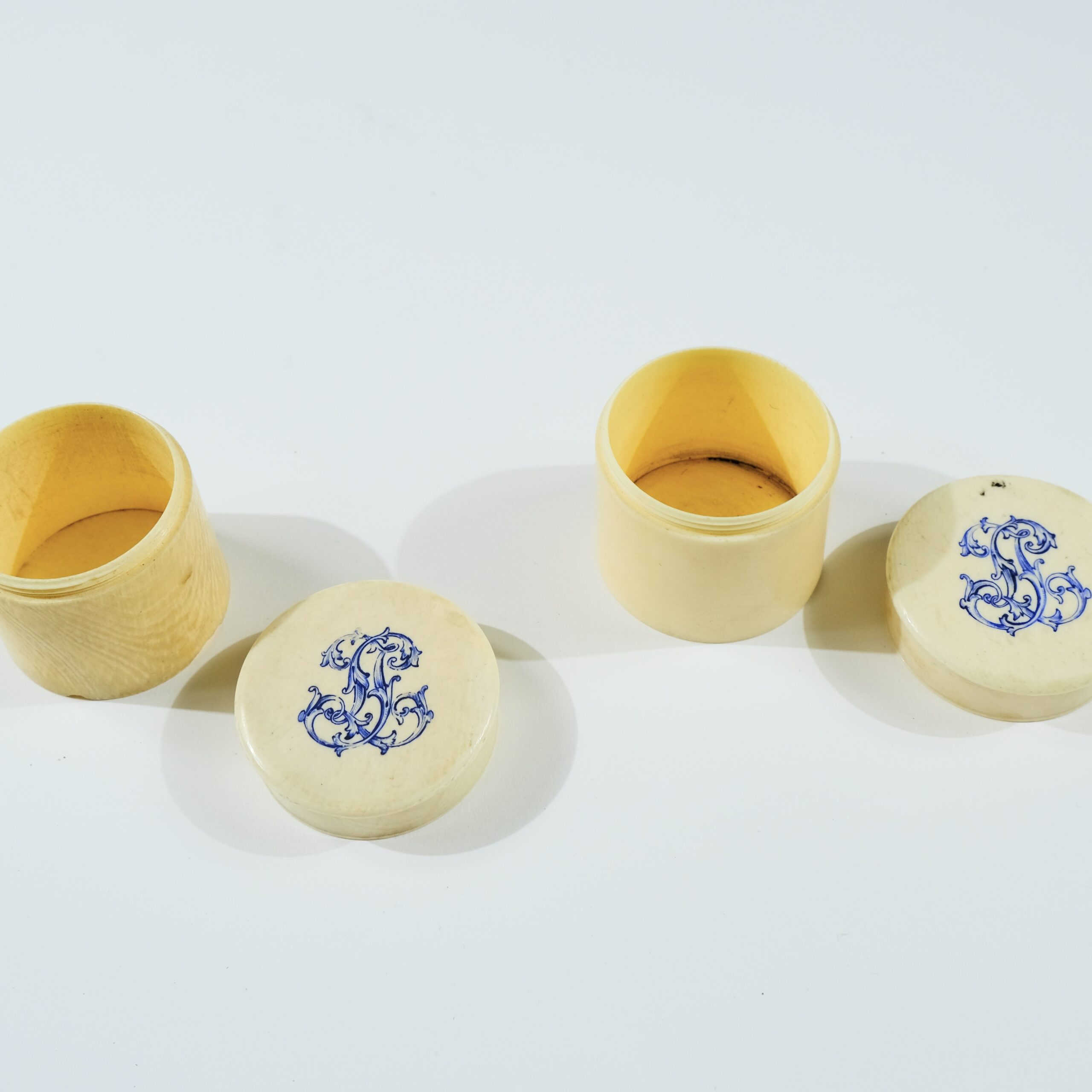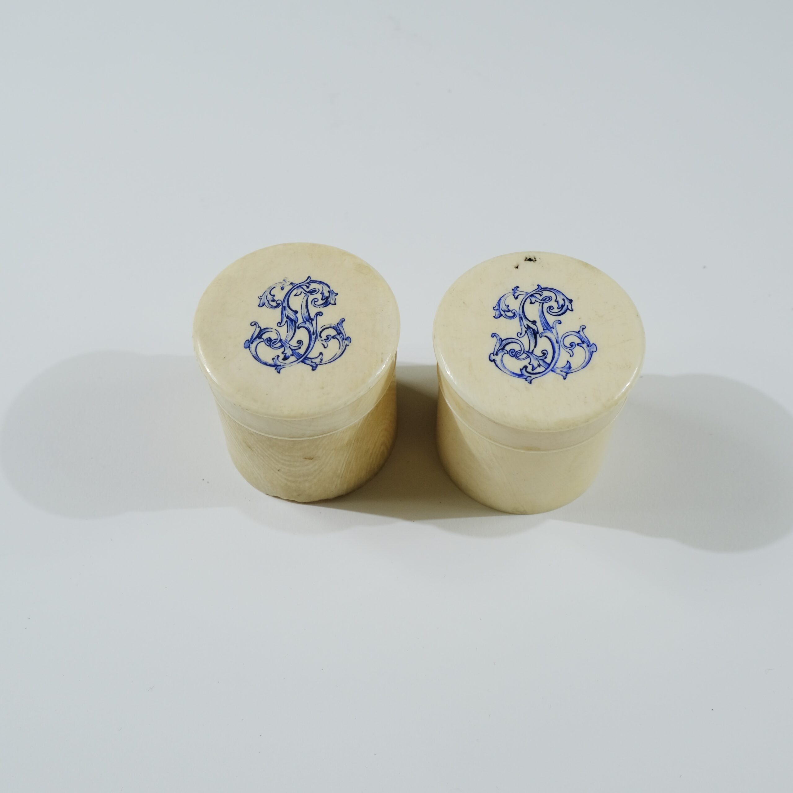 A pair of round boxes with lids made of bone, The tops that have monograms with the letters J L are are threaded to the boxes. Late 19th c