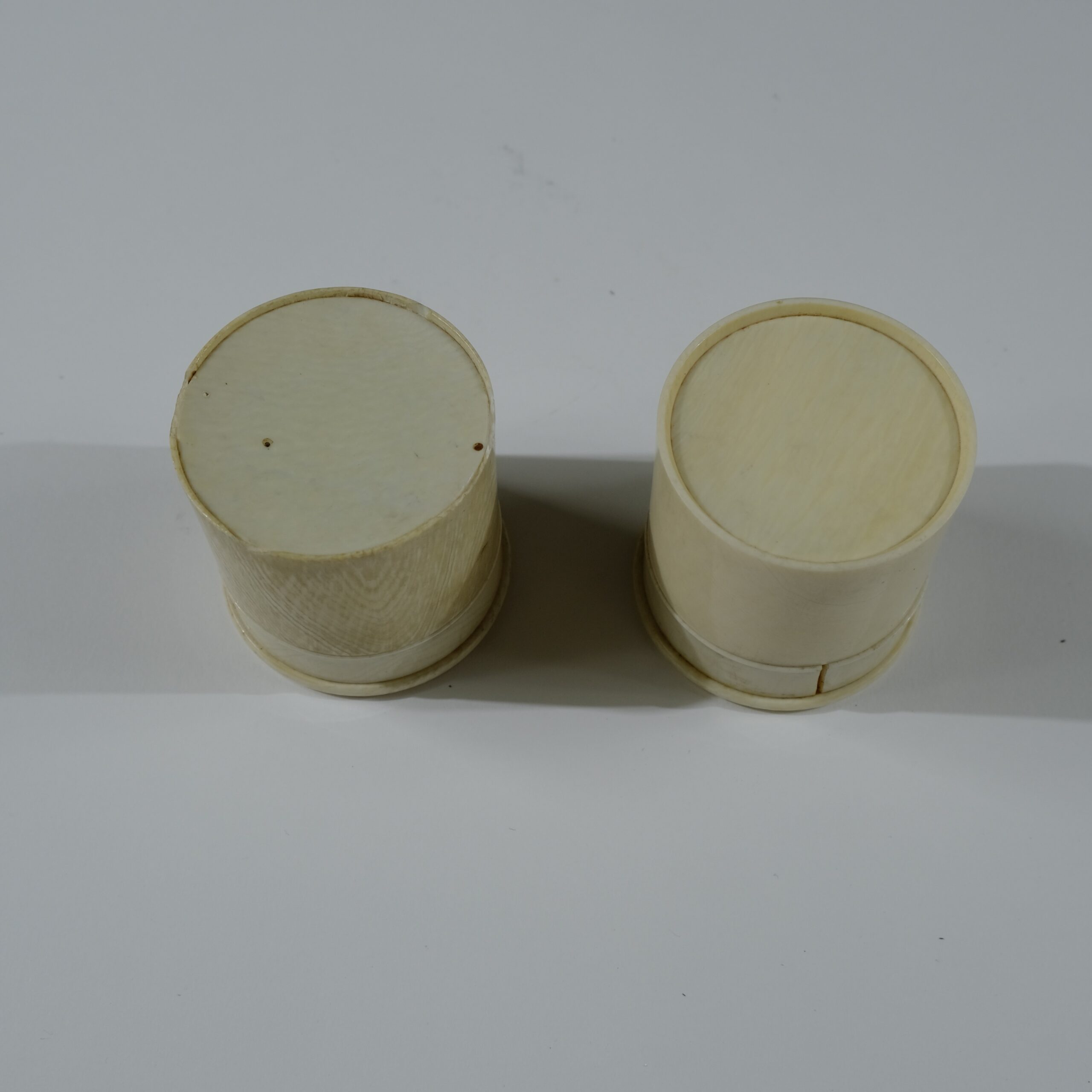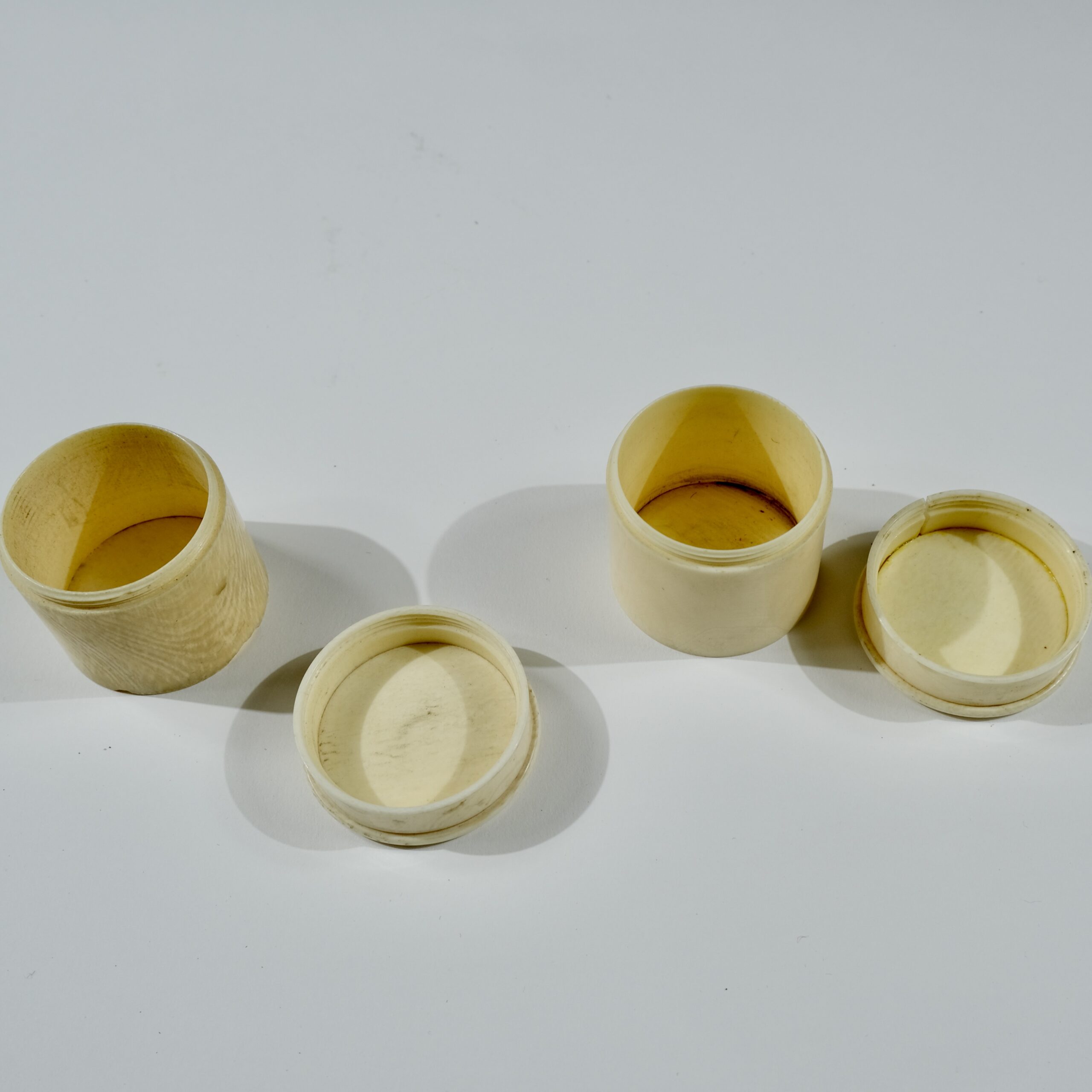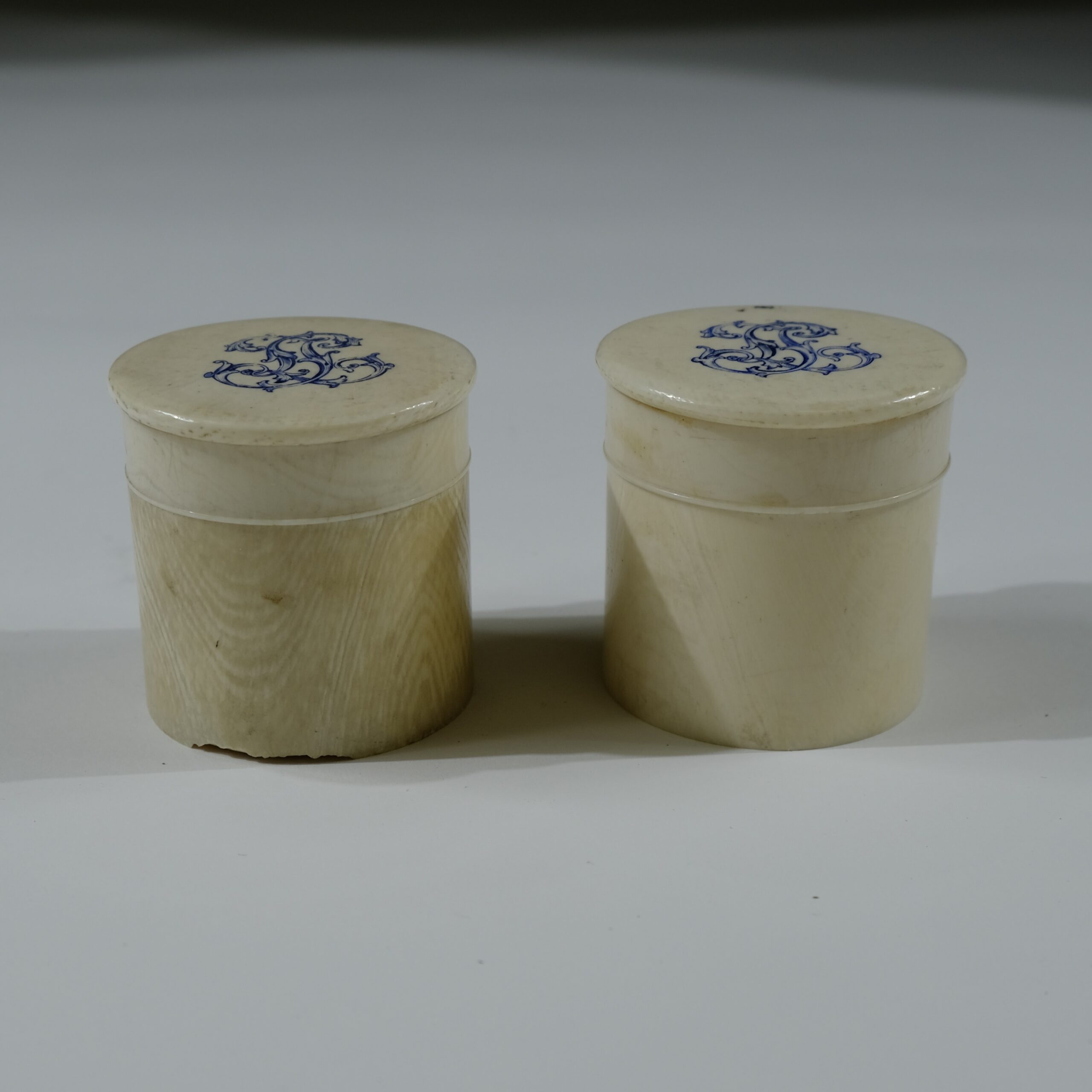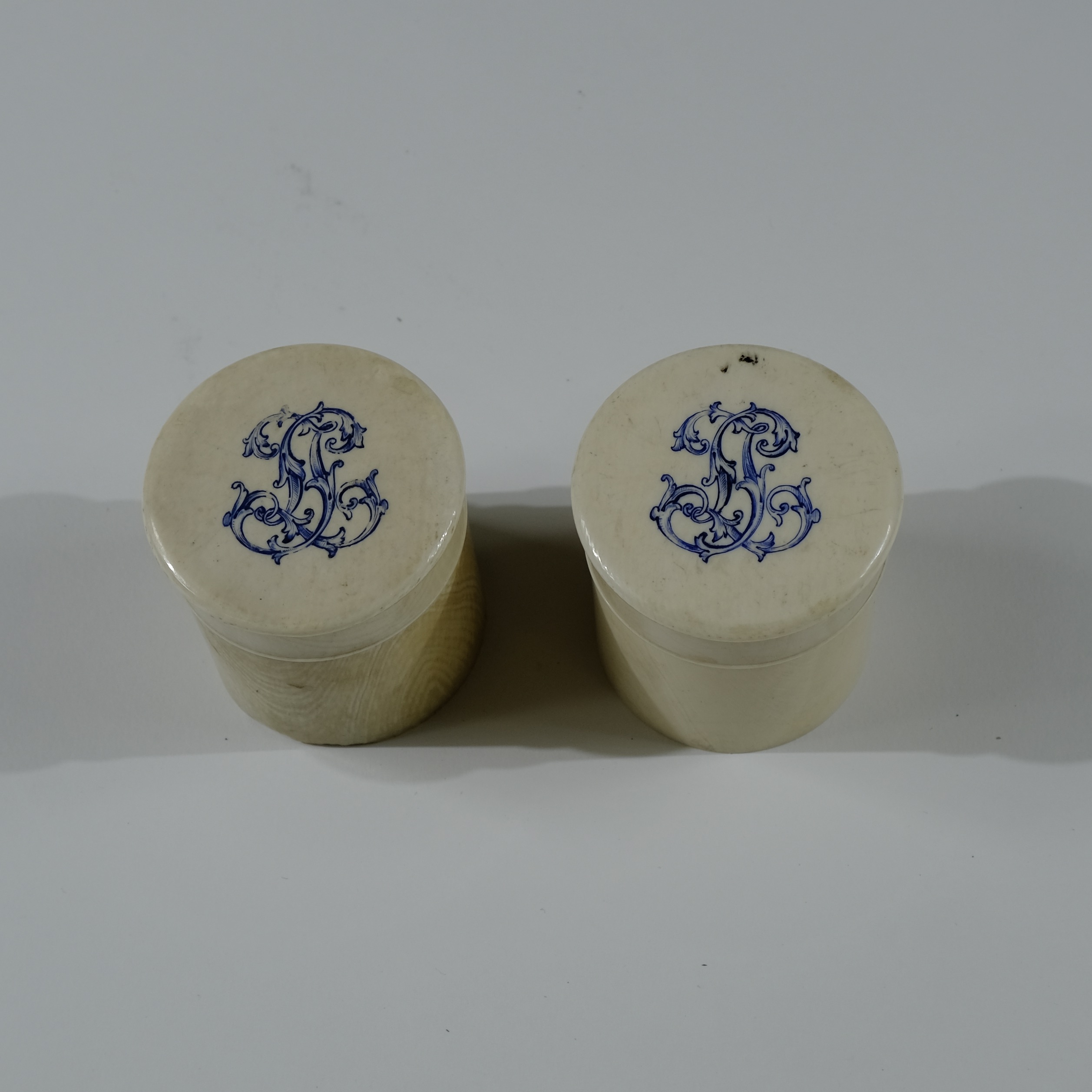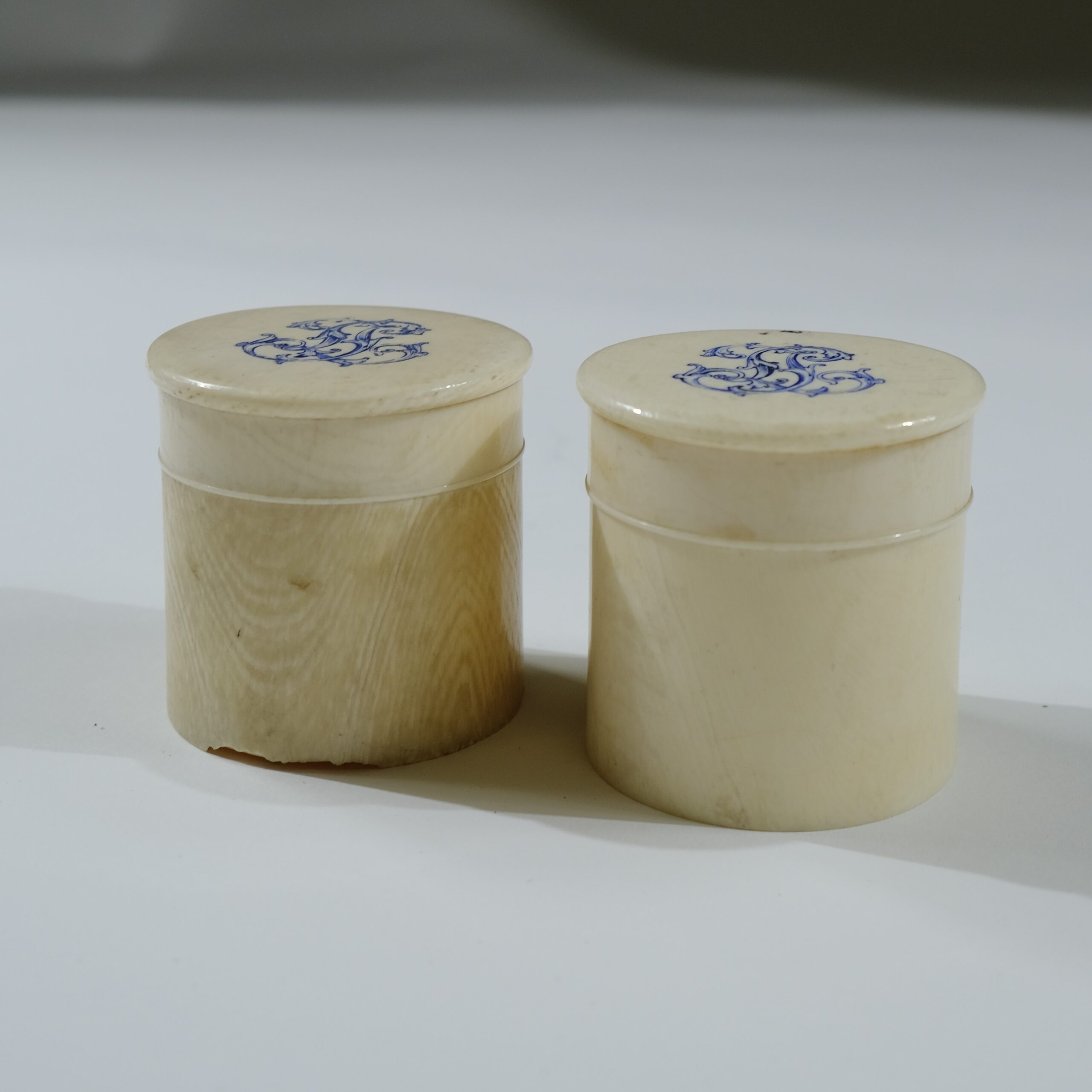 A pair of small round boxes with lids that screw on. the lids with monograms J L in blue.