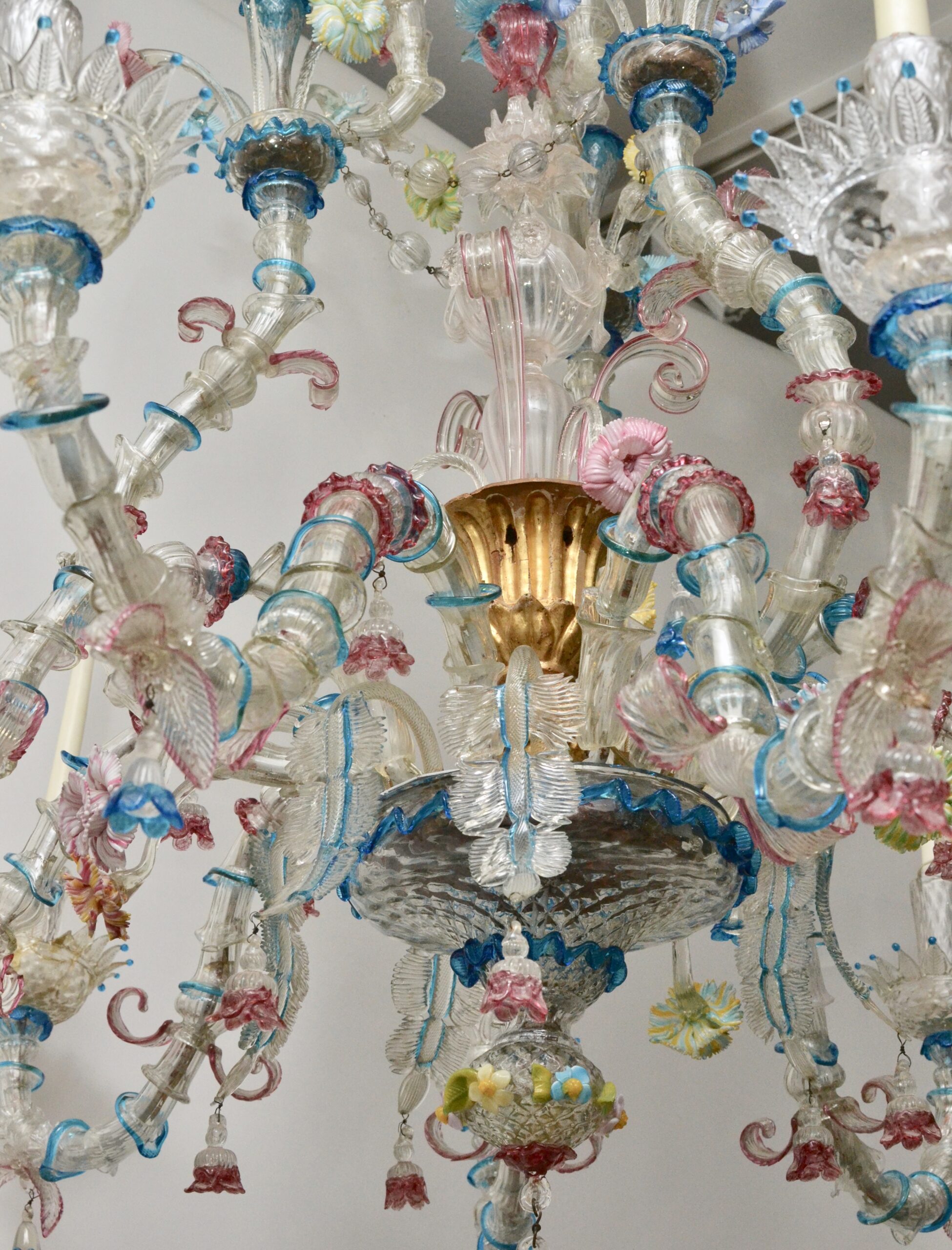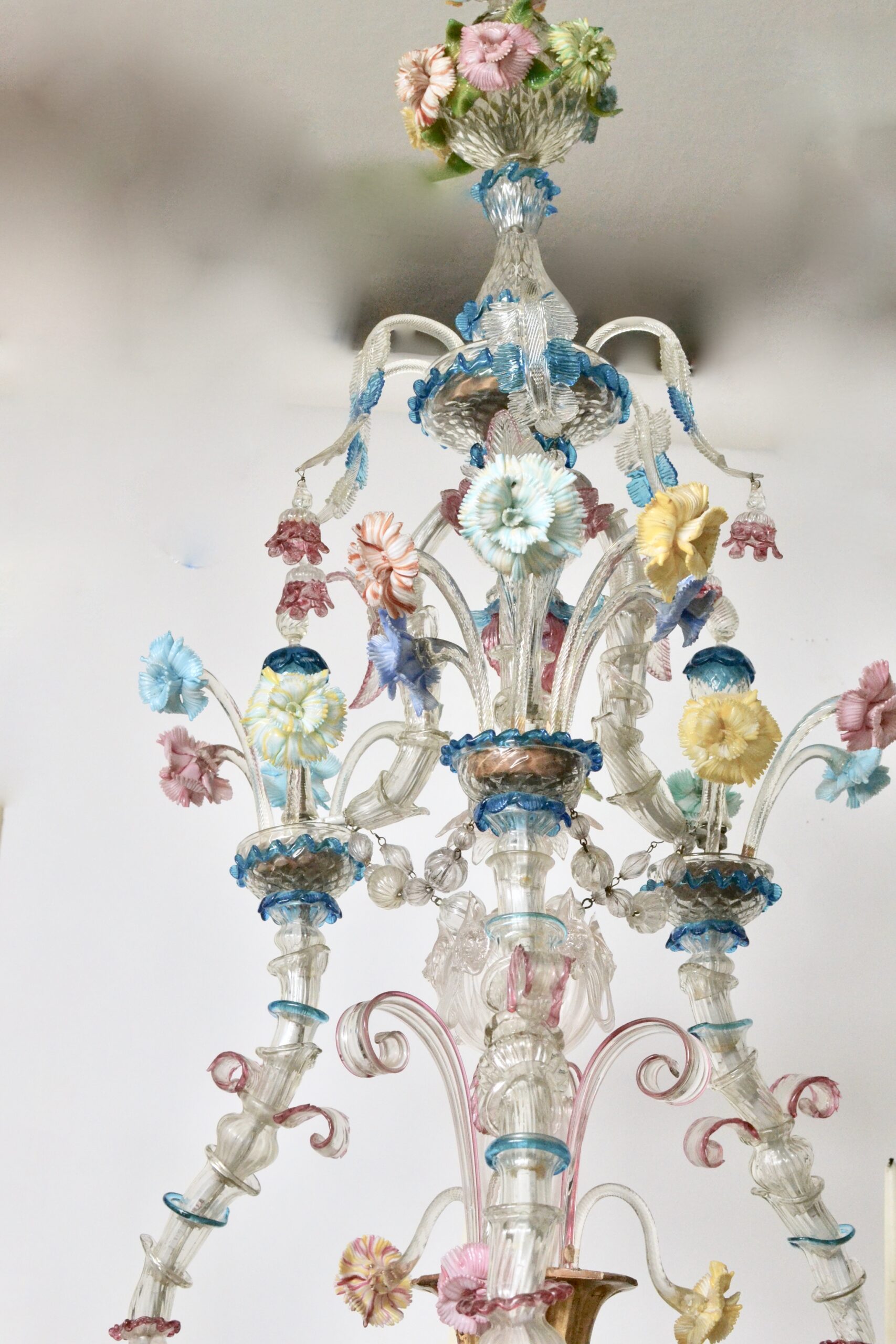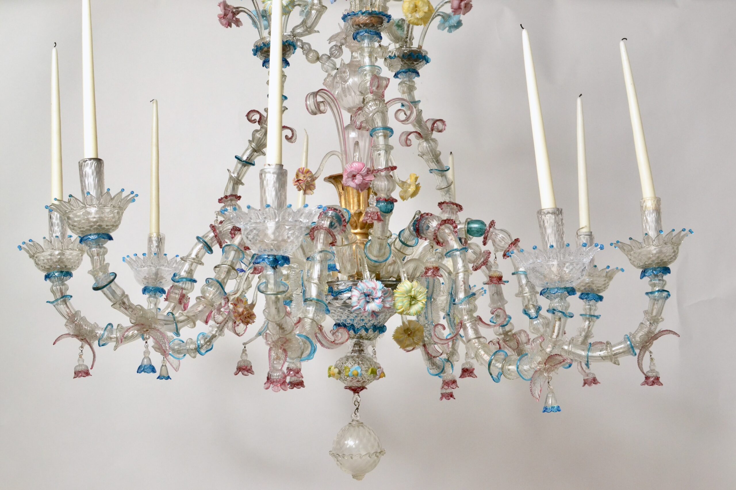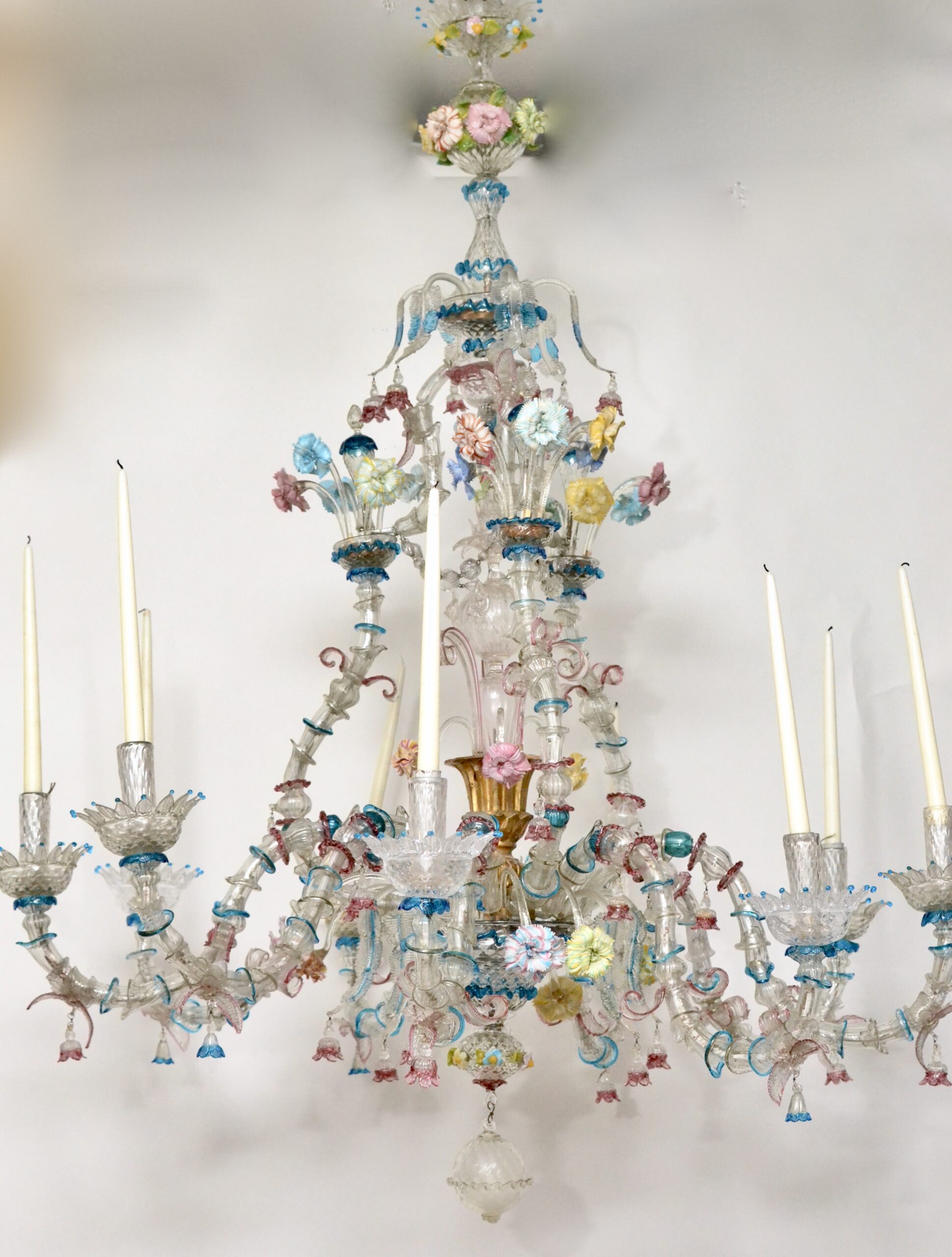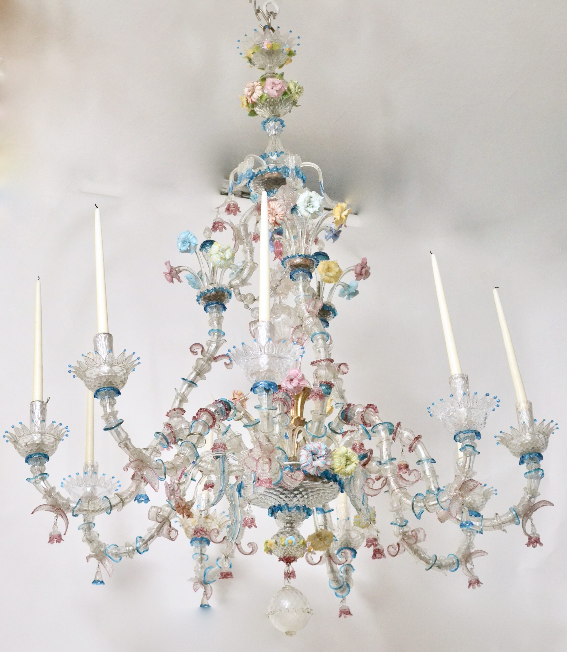 A large 19th century Venetian polychrome Murano glass eight-light chandelier with scrolled candle arms, decorated with flowers and leaves. Murano glass chandeliers have a unique history that is intertwined with their location. They stem from Venice, Italy, where glass blowing was practiced as early as the 14th century. Today still, these chandeliers continue to be produced in the city of Venice only. In the 18th century, Murano glassblowers started to introduce new products such as glass mirrors and chandeliers. The chandeliers were such a success that they instantly brought the fashion of glass chandeliers to a new dimension - which is still felt today. The first Murano glass chandeliers produced by Venetian glassmakers date back around the year 1700. This new type of chandelier was called “ciocca”, which translates literally to "bouquet of flowers". Their shape was inspired by an original architectural concept: the inside space is left almost empty. Decorations are spread around the central support, distanced by the length of the arms. One of the common use of the huge Murano chandeliers was as interior lighting of theatres and palaces. Giuseppe Briati was one of the most famous producers of chandeliers. In 1724, he created what became known as the Rezzonico Chandelier, the first chandelier of its kind.