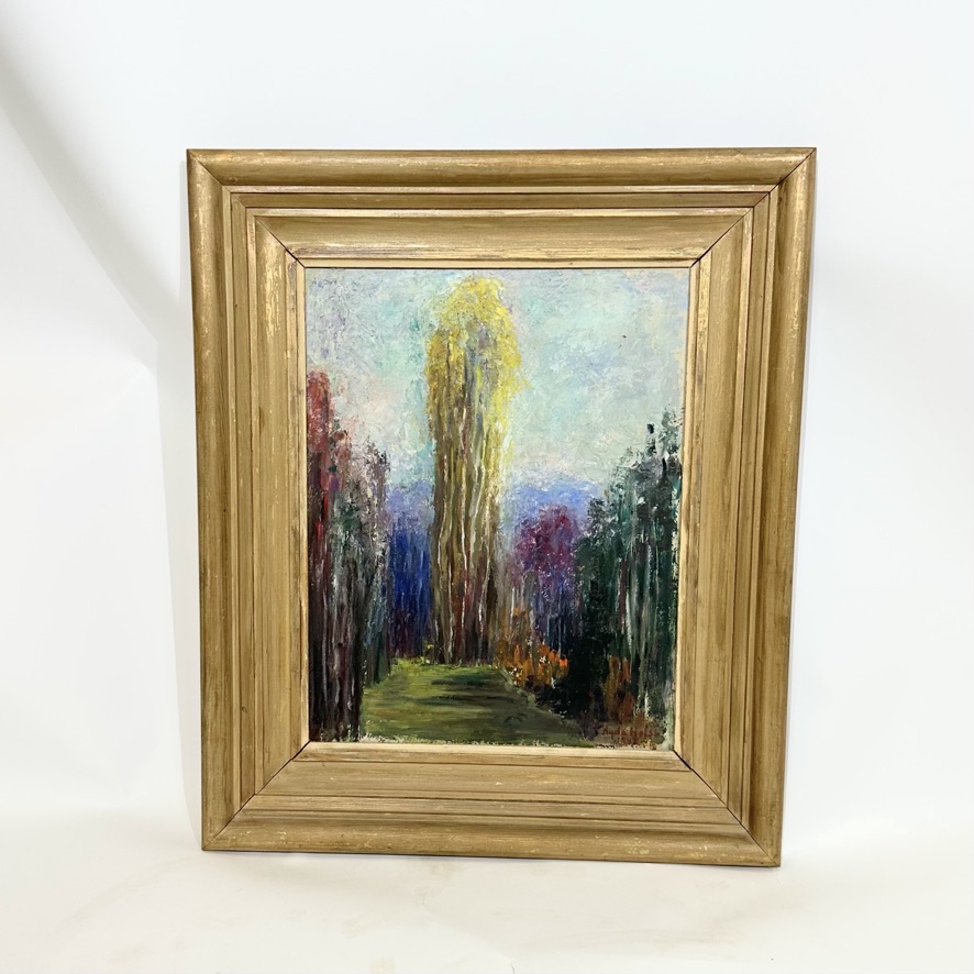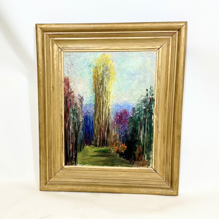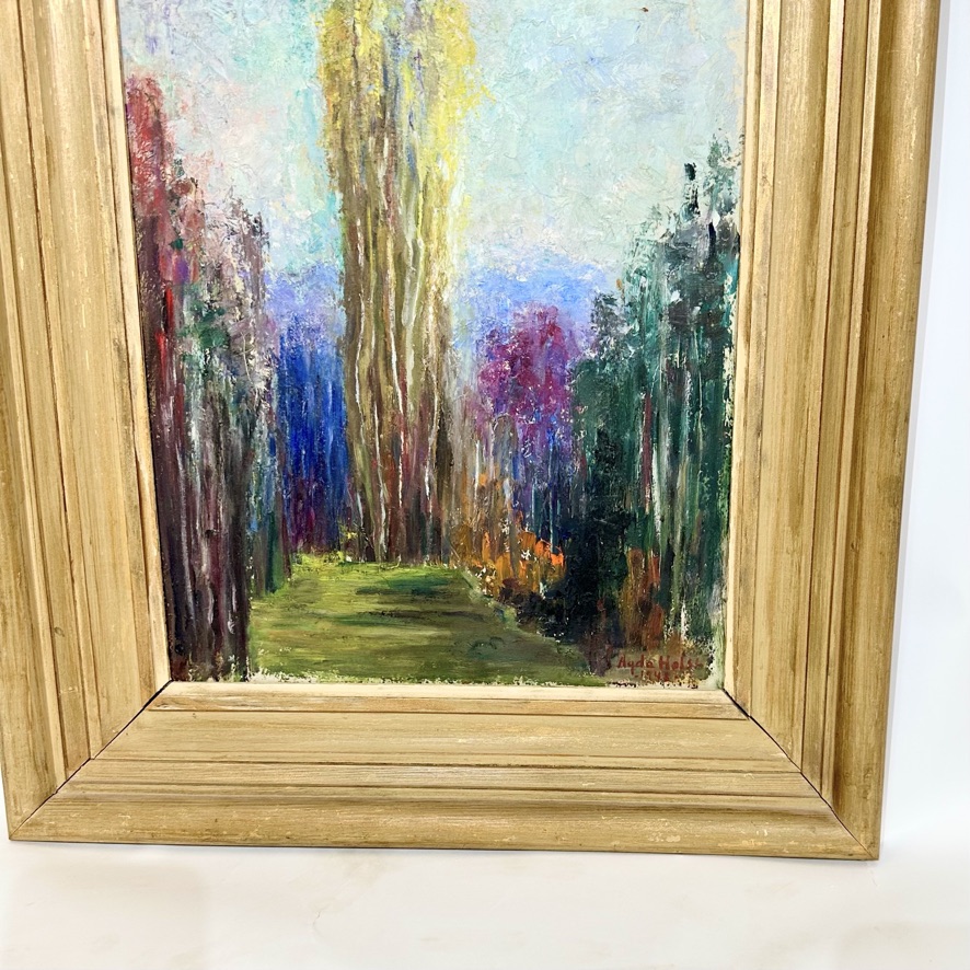 A vibrant painting depicting an avenue lined with poplar trees in fall colors, prominently featuring a very large, centrally placed yellow poplar. Possibly an American poplar. The artist, Agda Holst, has employed a diverse palette of colors to the poplars, creating a dynamic and colorful composition. This oil on panel is signed and dated by Holst in 1948. The work exemplifies her use of color and form, characteristics that defined her artistic practice throughout her career. Agda Holst was a Swedish modernist painter known for her precise study of form, stylized compositions, and ability to merge structured geometry with expressive color. Her works, often still lifes, portraits, and figure studies, reflect a balance between naturalistic representation and modernist influences such as Cubism and New Objectivity. Holst's artistic journey began in 1907 at the Académie Colarossi in Paris, where she studied under Christian Krohg. Seeking further refinement, she moved to Munich between 1910 and 1911, studying with Julius Exter, known for his teachings in portrait and genre painting. In 1911–1912, she returned to Paris to study under Kees van Dongen, whose bold use of color and strong contrasts left a lasting impression on her work. The early 1920s marked another period of study in Paris, this time under André Lhote, who instilled in her a structured approach to composition and geometric clarity. Holst’s first public exhibition took place in 1916, when she displayed paintings in a bookstore window in Kristianstad. Her official debut followed at Skånes konstförening in Malmö. By the late 1920s, she had established herself as a professional artist, holding her first solo exhibition at Lund University’s Art Museum in 1927. This success led to portrait commissions. Throughout her career, Holst exhibited widely, with solo shows in Skåne and participation in group exhibitions in Stockholm, Copenhagen, Bordeaux, and New York. In 1931, she held a significant solo exhibition at Malmö City Hall, followed by a show at Gothenburg’s Art Hall in 1932, where her self-portrait At the Easel received critical acclaim. Her works were also featured at the Salon des Indépendants in Bordeaux. Despite being the only woman in the male-dominated artist collective Aura, founded in 1928, Holst was highly respected by her colleagues. Unlike many female artists of her time, she was treated as an equal by her male peers, who recognized her talent and professionalism. Her work evolved throughout her career, moving from precisely structured portraits to more expressive and textured compositions. The late 1930s saw an increased focus on still lifes, where she explored the interplay of form and color in a Cubist-influenced style. Her 1948 painting of the poplar-lined avenue exemplifies her mature artistic voice, where vibrant hues and dynamic composition come together in a striking yet harmonious manner. In 1945, Kristianstad’s museum held a retrospective exhibition celebrating 40 years of Holst’s work, tracing her artistic evolution from academic studies to modernist expression. By this time, she had gained the financial freedom to paint without commercial constraints, allowing her work to take on a more introspective and experimental tone. Many of her later works became increasingly expressive, with biblical themes, palette knife techniques, and sketch-like compositions. In 1964, she was awarded Kristianstad’s first cultural prize, and in 1965, a retrospective exhibition at the city’s museum further solidified her legacy. As her eyesight deteriorated in later years, she adapted her technique, working more with pastels. Agda Holst passed away in 1976 in her lifelong home in Kristianstad. Her influence on Swedish modernism remains significant, and her works continue to be displayed in posthumous exhibitions.