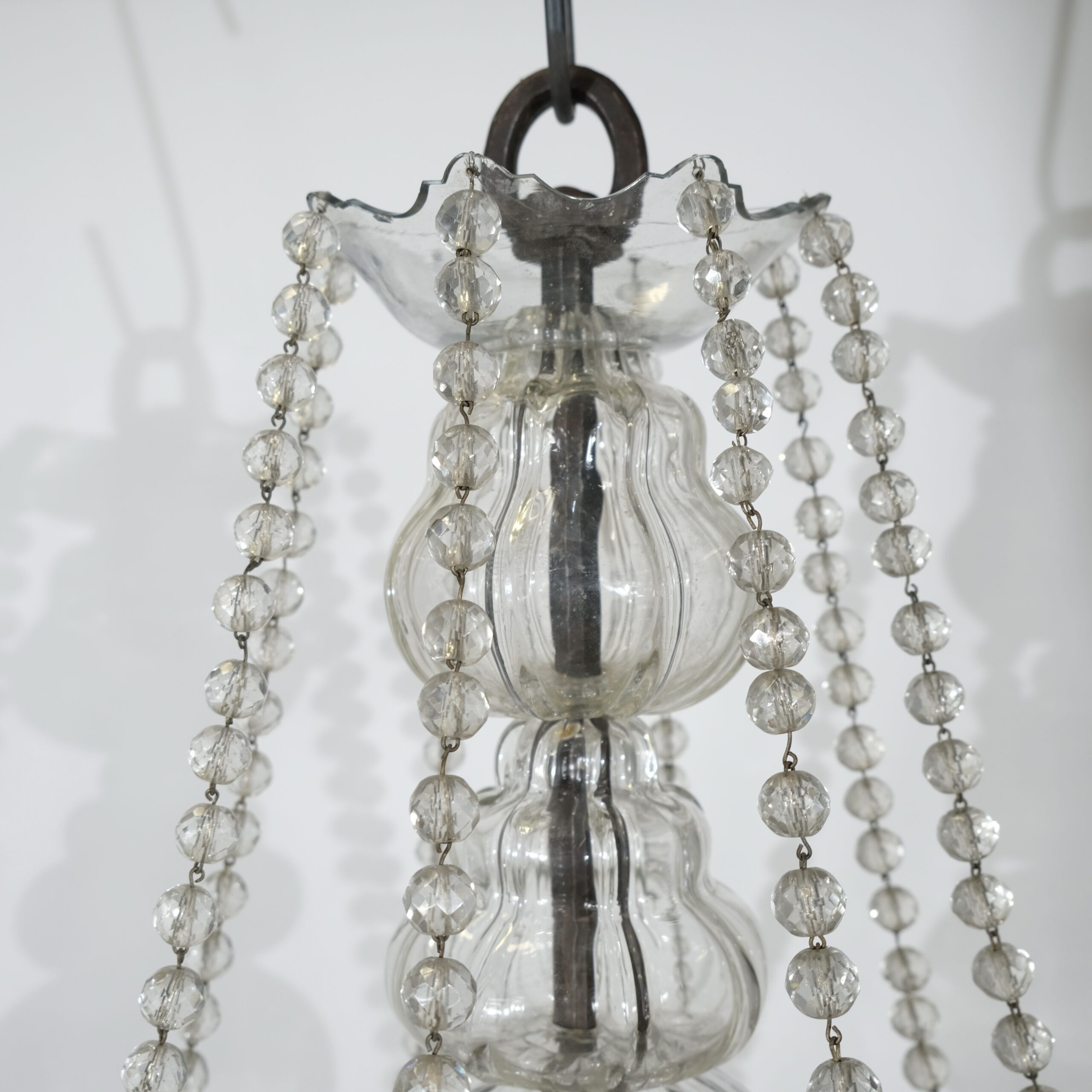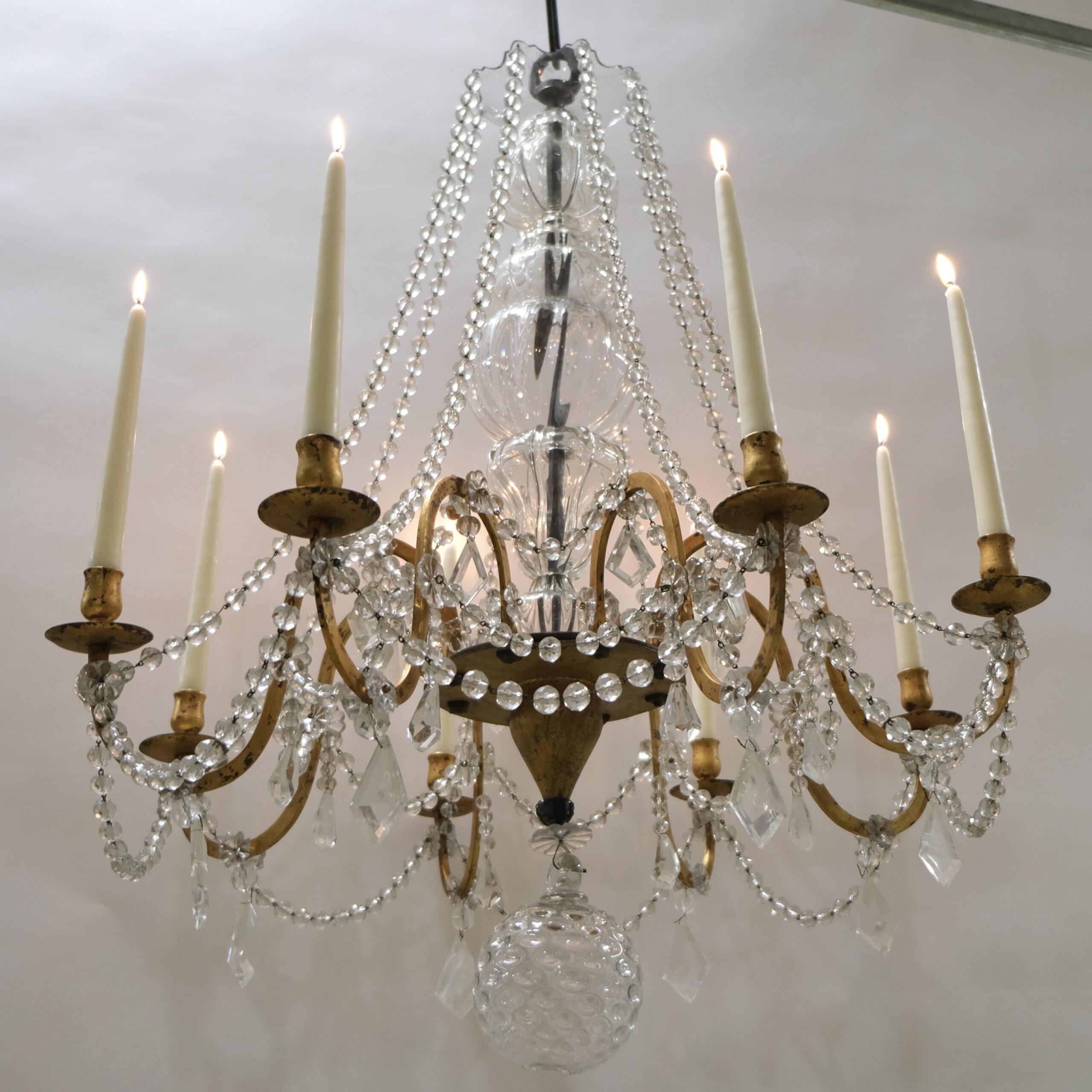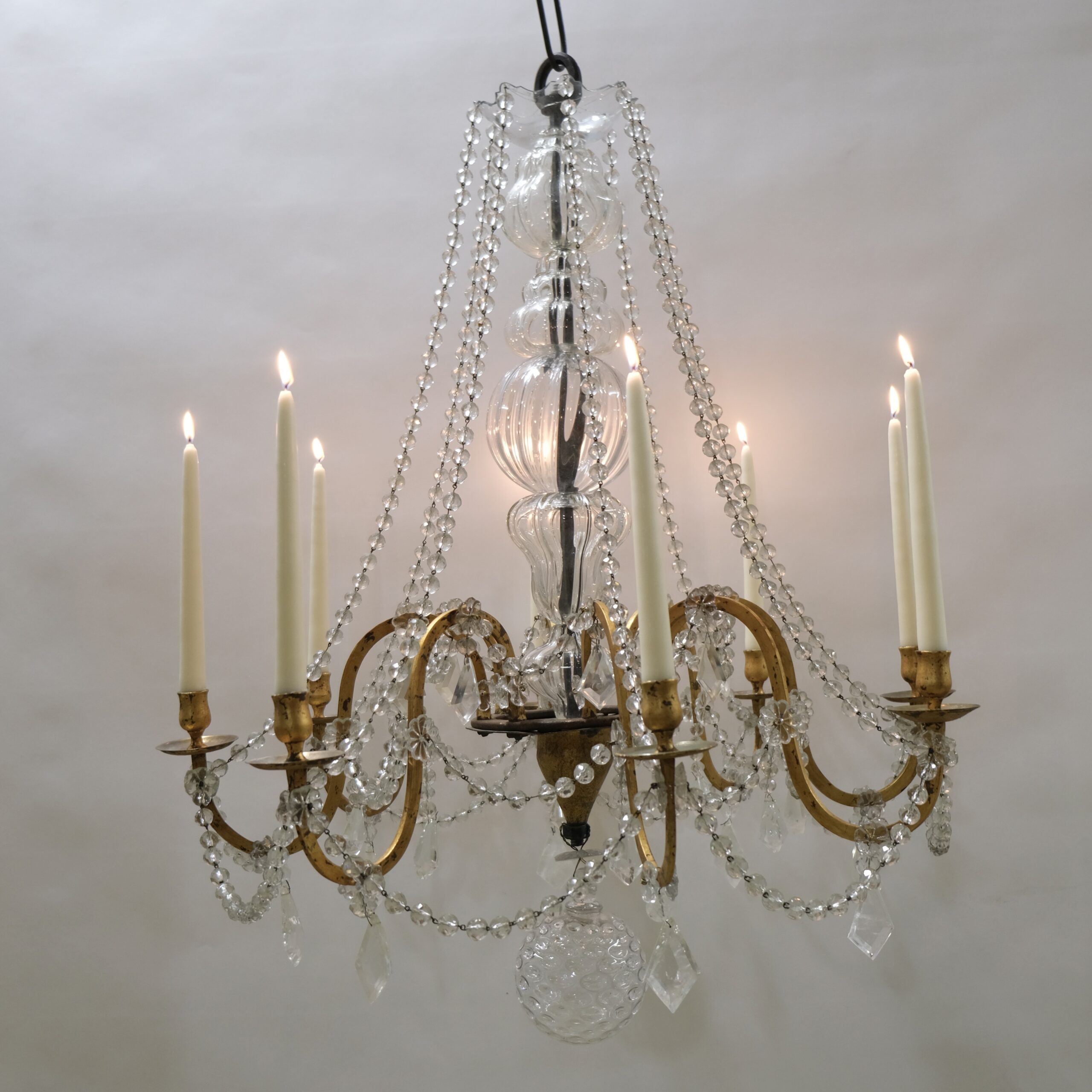 This antique chandelier with eight arms and candleholders has fantastic proportions and a truly genuin feeling to it. A thick forged iron pool is the central stem of the chandelier. It is covered with handblown crystal that gives it a lively, charming feeling. From the circular bottom part the eight S-shaped arms stands out. The ironwork is artistically done where the circular holder for the candle-arms is decorated with a fine engraved pattern. Every arm is held by an iron large iron nut. From the crystal plate-shaped roof long chains of crystal beads hang and are attached to the urn-shaped candleholders.