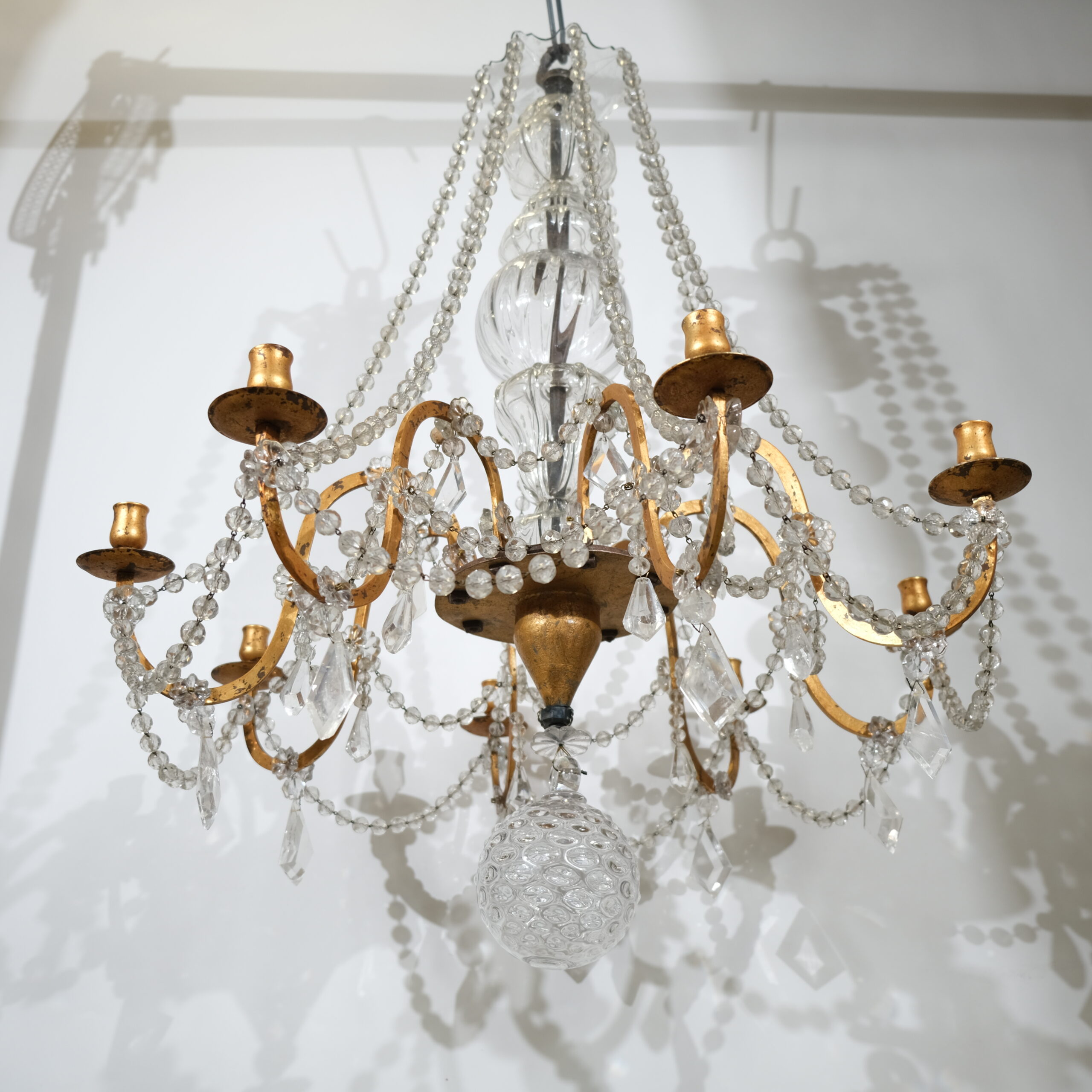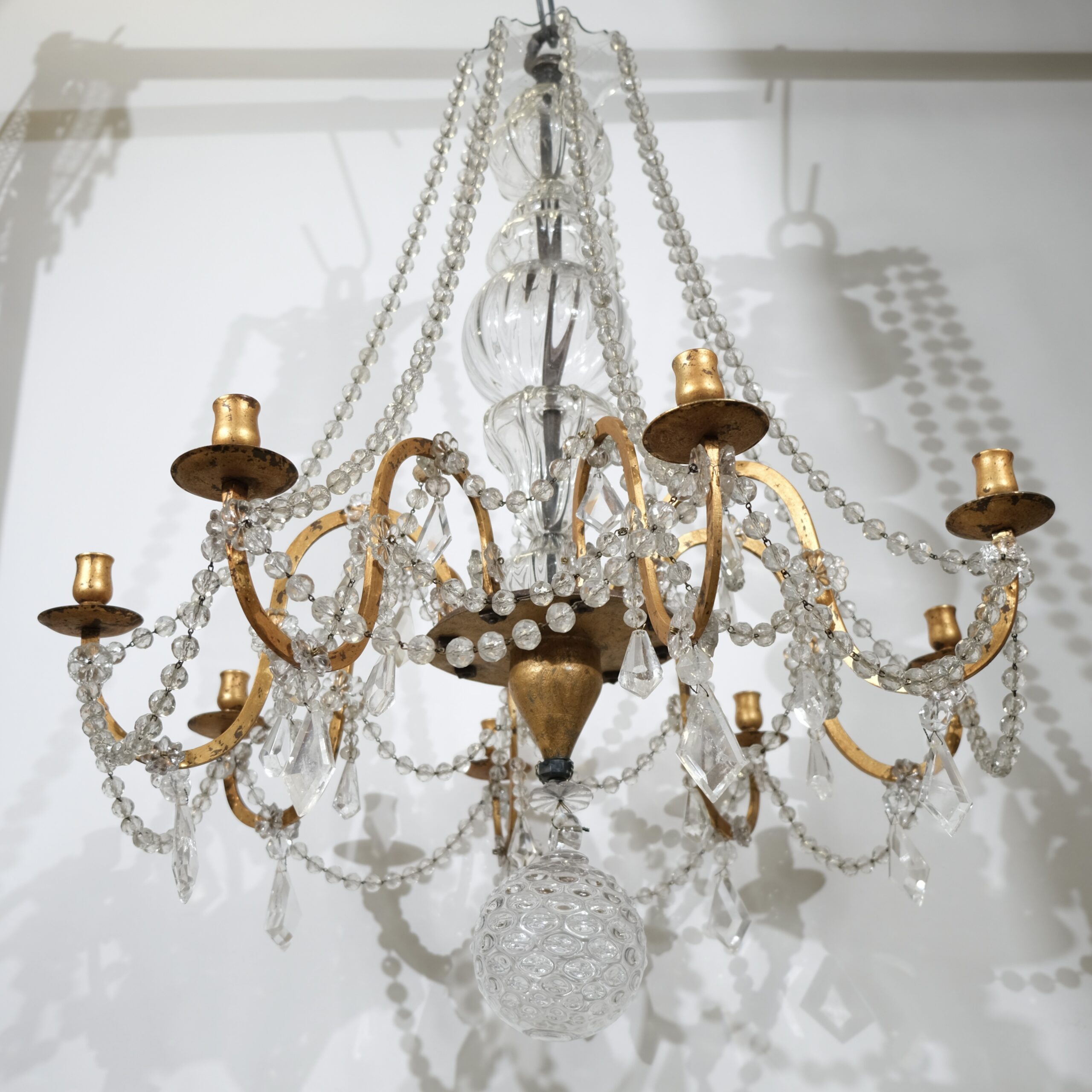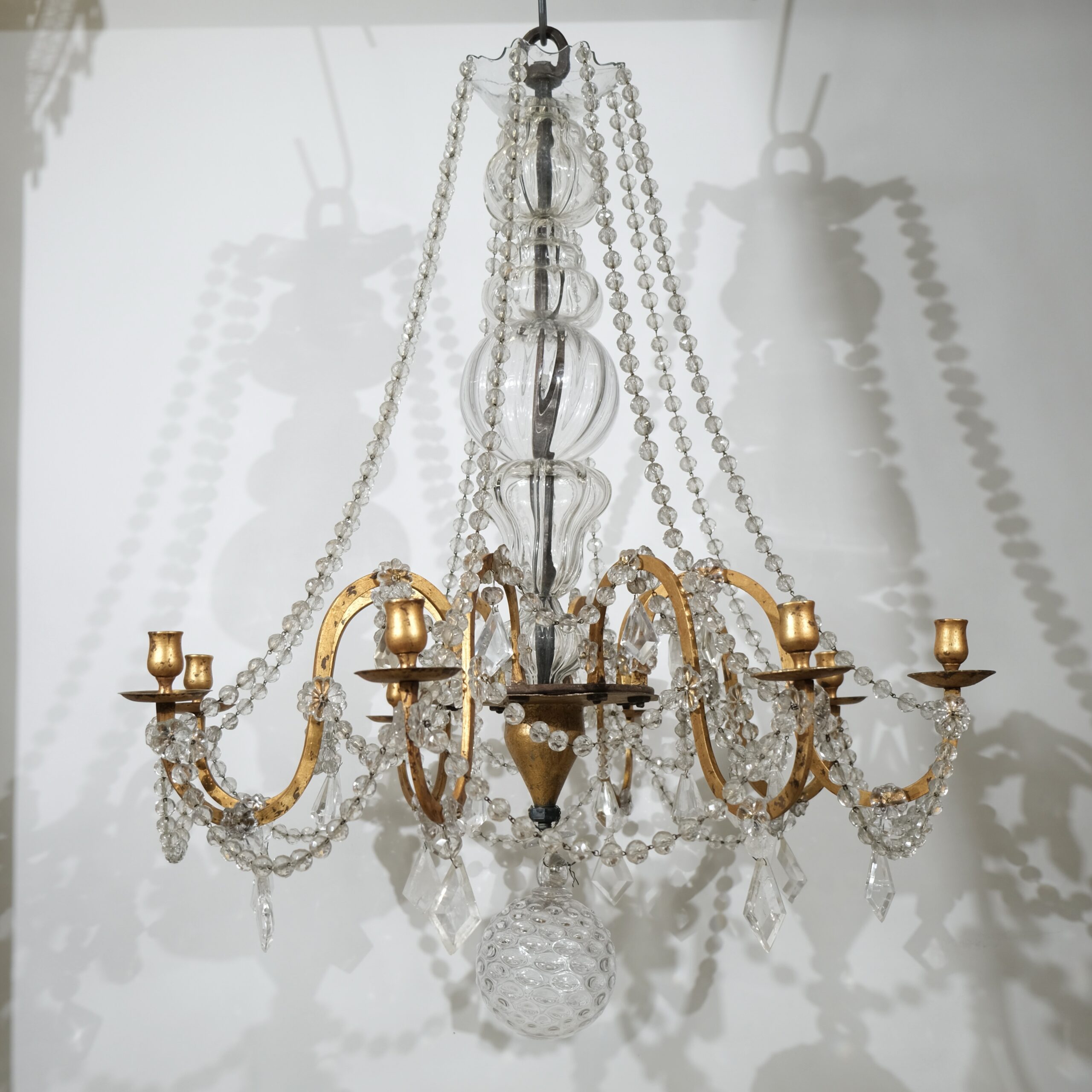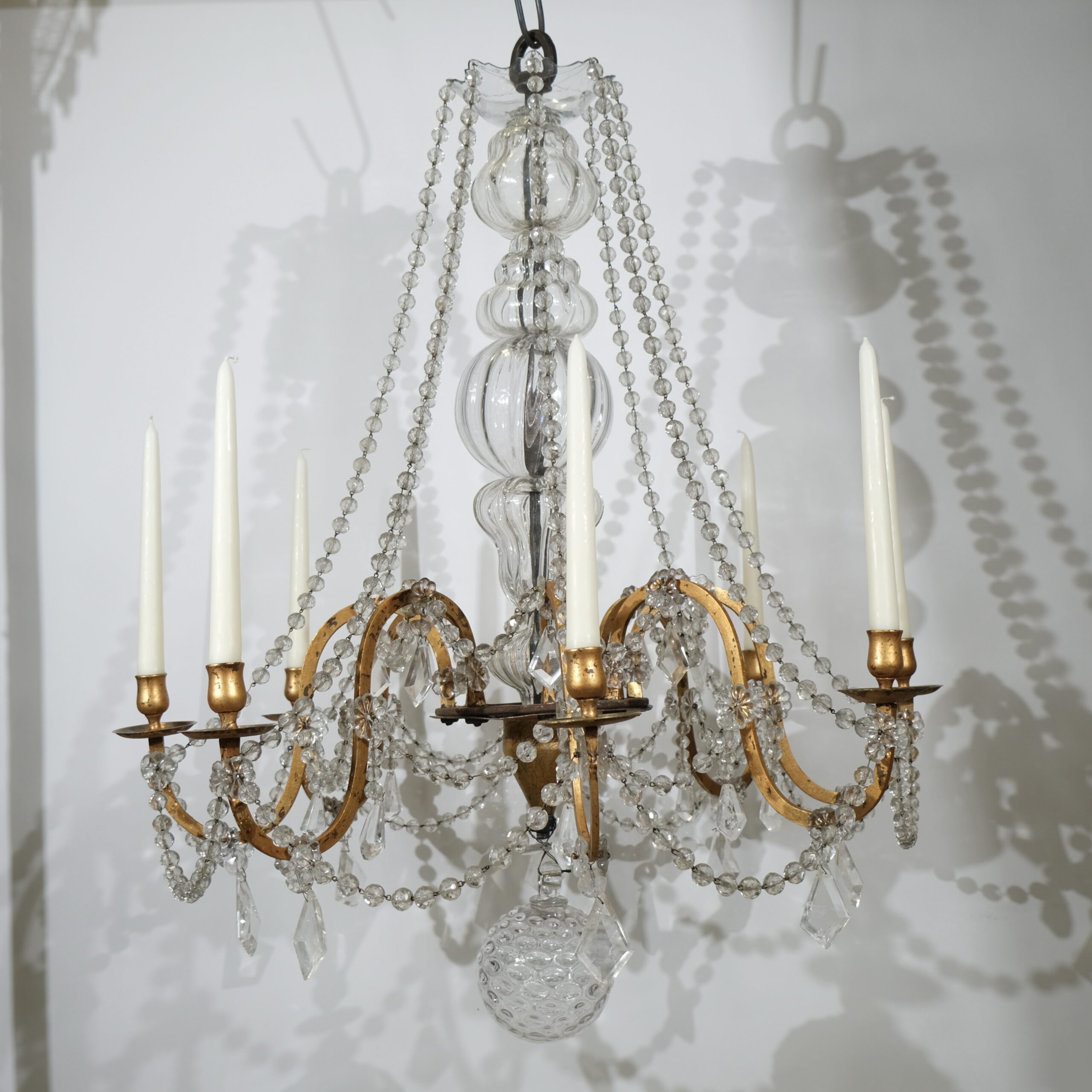 This antique chandelier with eight arms and candleholders has fantastic proportions and a truly genuin feeling to it. A thick forged iron pool is the central stem of the chandelier. It is covered with handblown crystal that gives it a lively, charming feeling. From the circular bottom part the eight S-shaped arms stands out. The ironwork is artistically done where the circular holder for the candle-arms is decorated with a fine engraved pattern. Every arm is held by an iron large iron nut. From the crystal plate-shaped roof long chains of crystal beads hang and are attached to the urn-shaped candleholders.