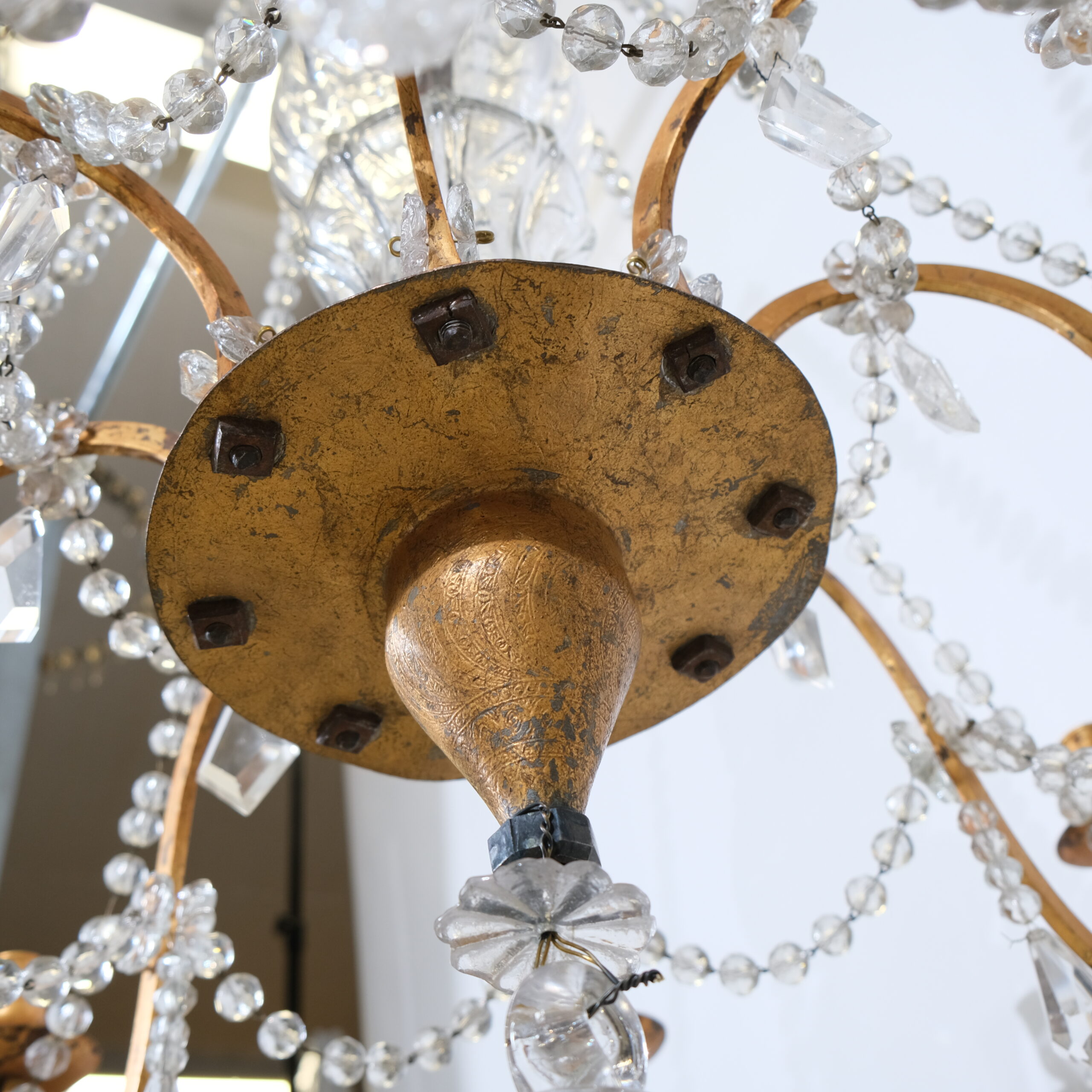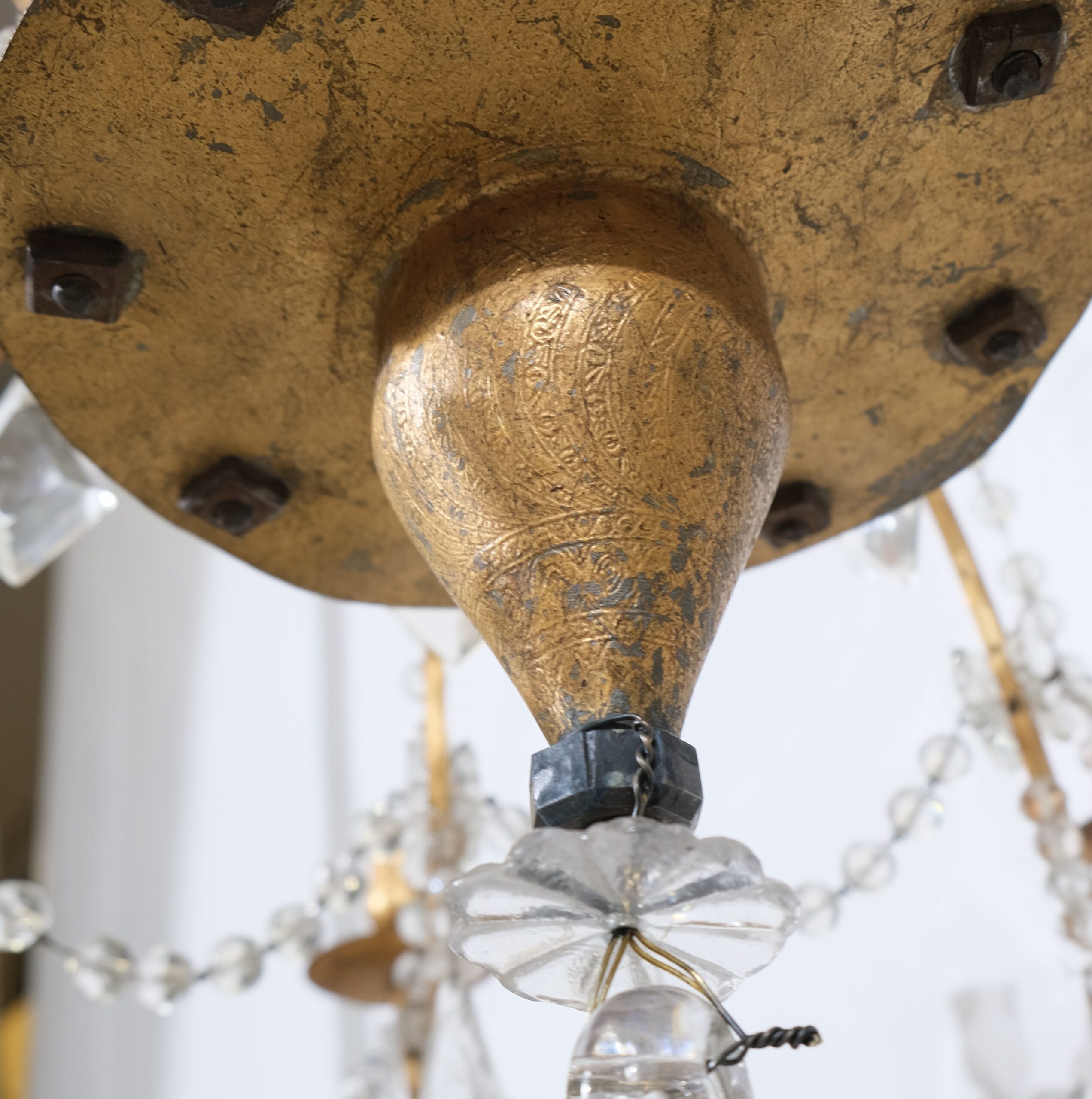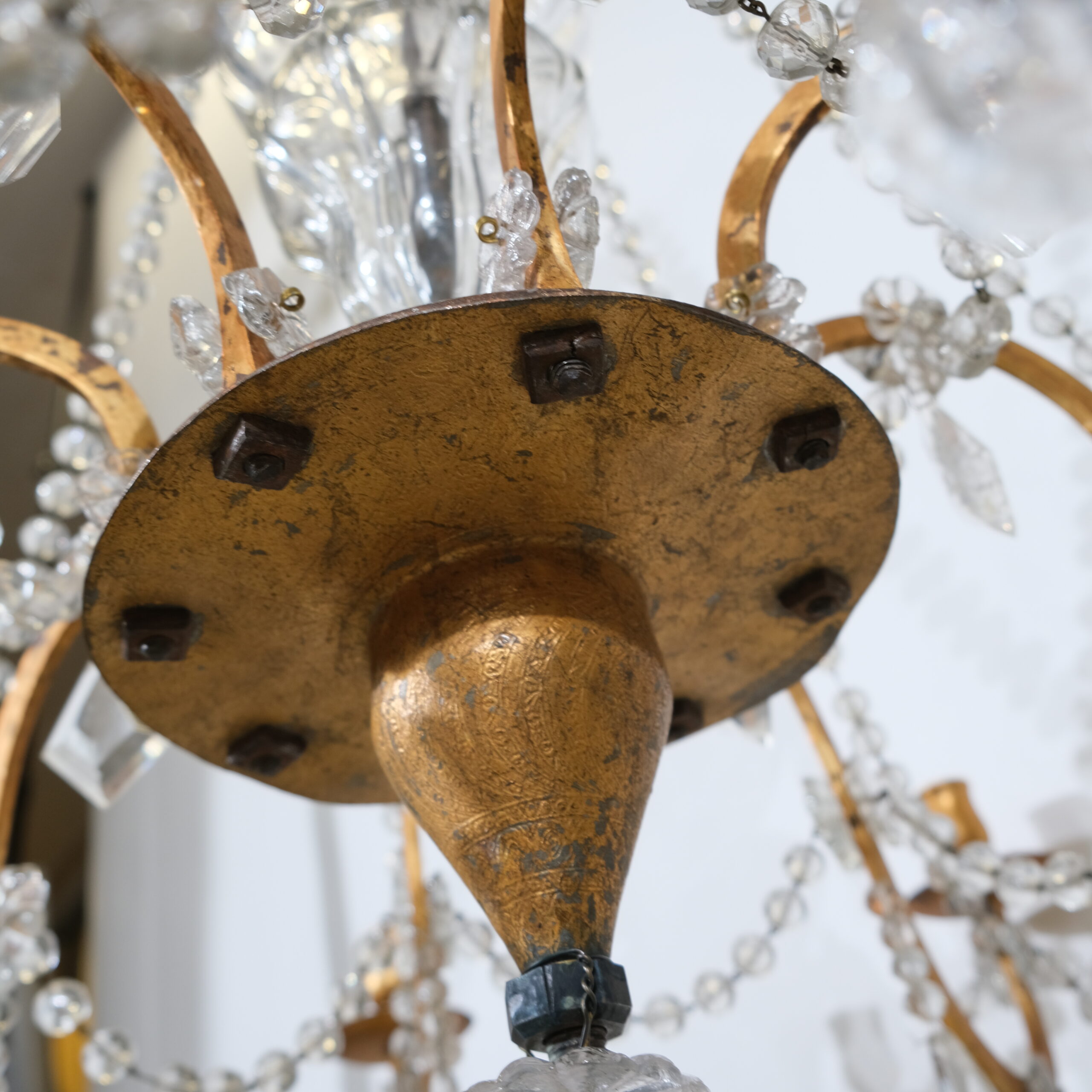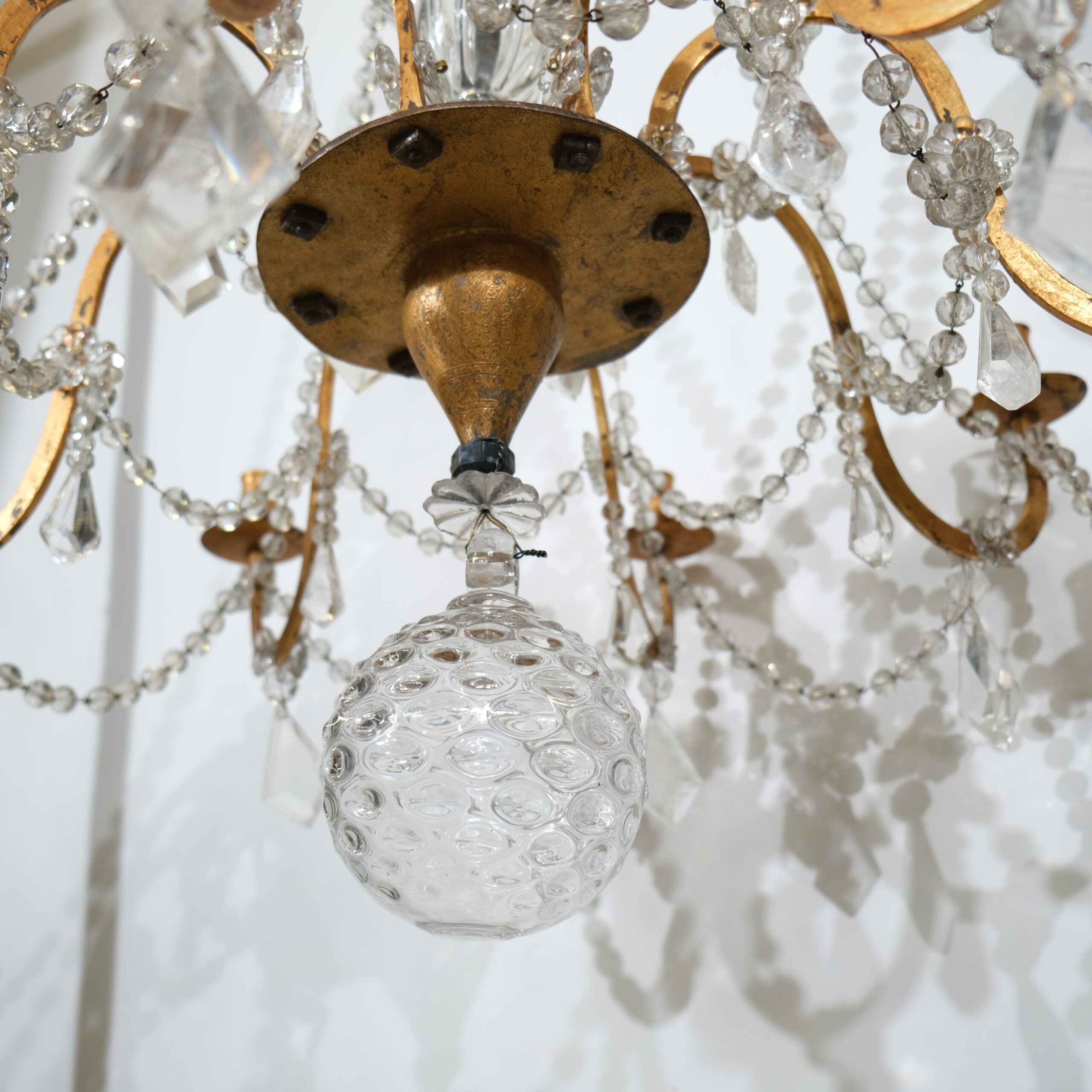 Antique 8-light iron and crystal chandelier.