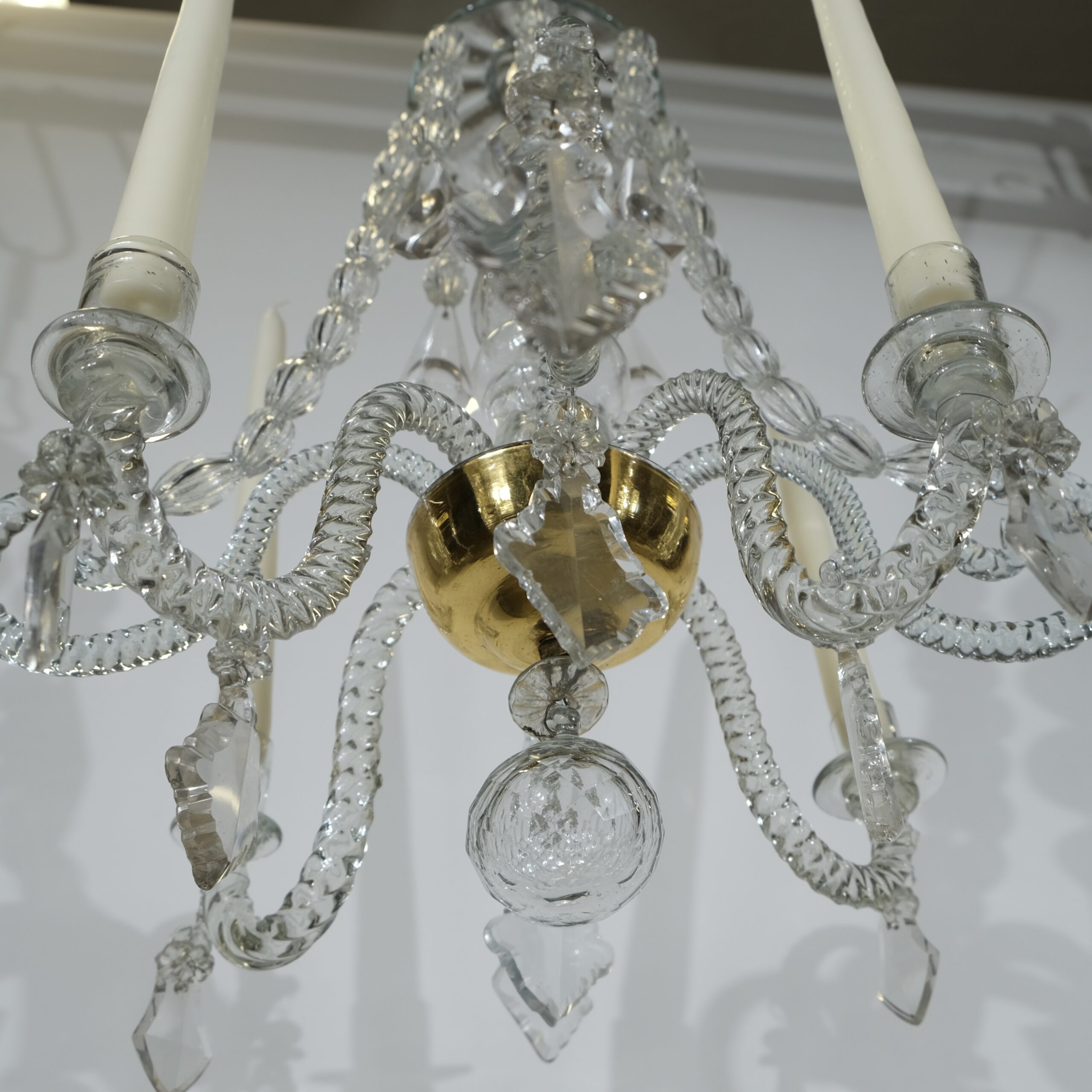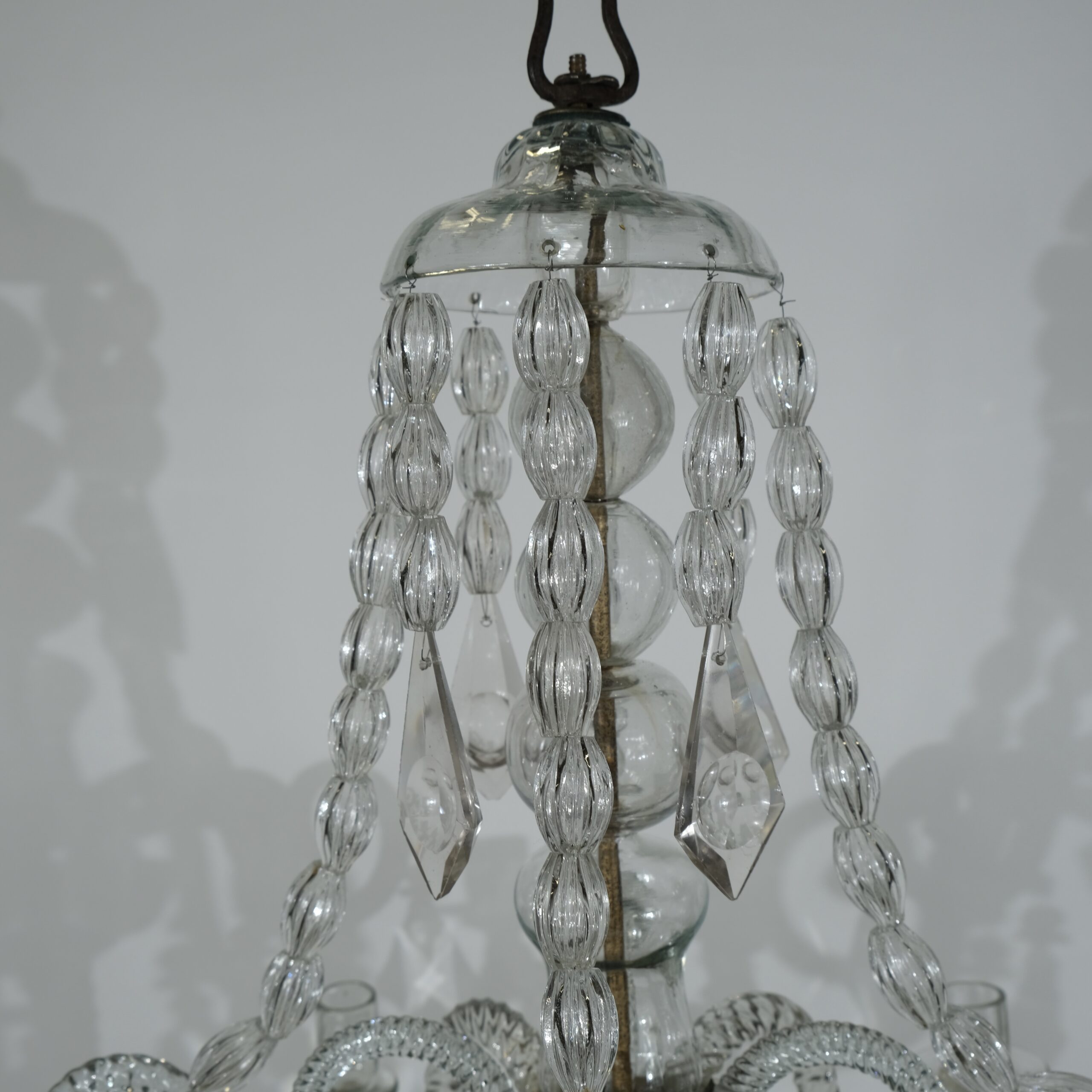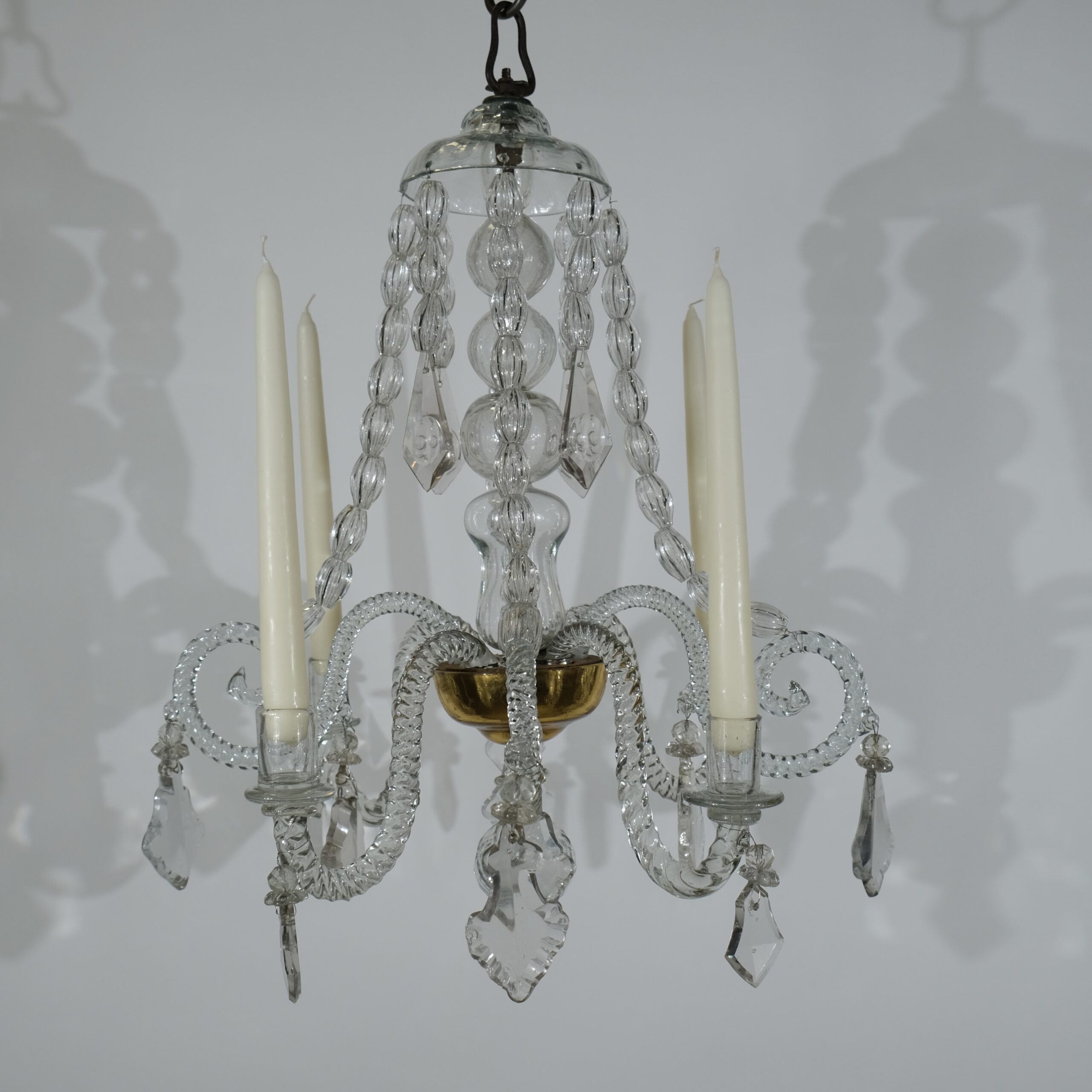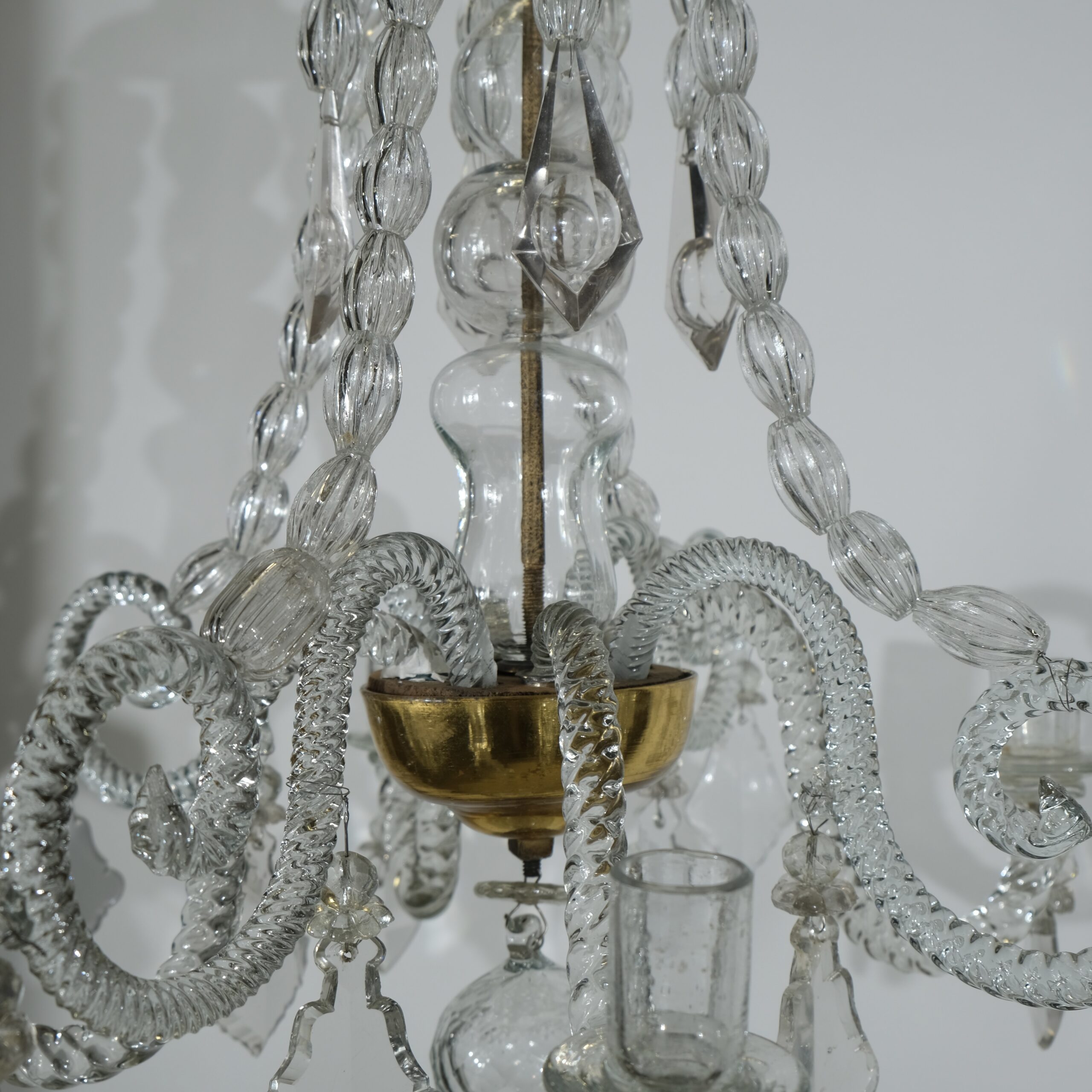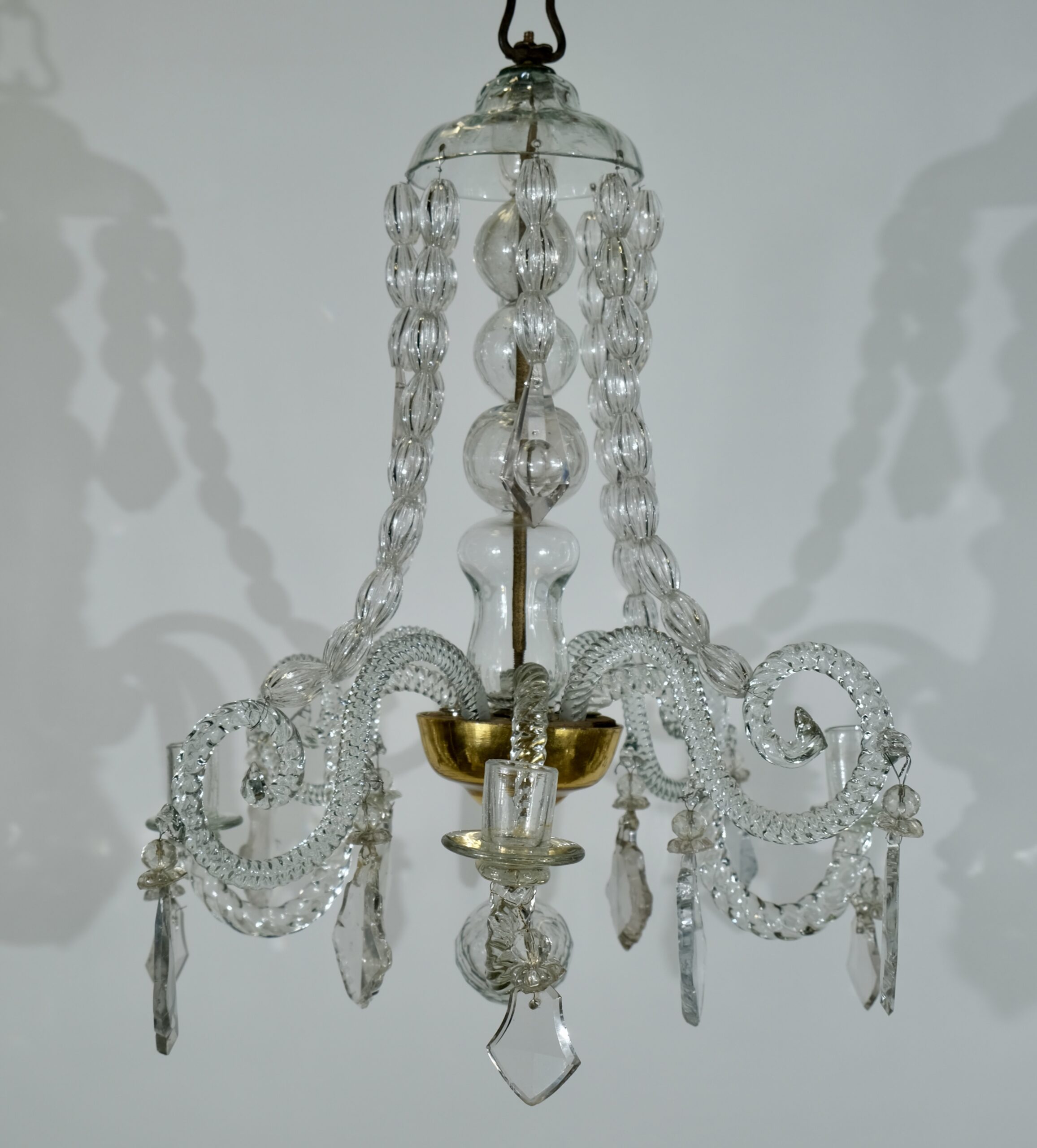 A small 18th c chandelier in unusually good condition. The central part of the chandelier has a stem of blown crystal balls that all are kept together by a forged iron pool. The four arms with candleholders as well as the decorative ribs in-between are all made of crystal glass in the fashion of the 18th c.