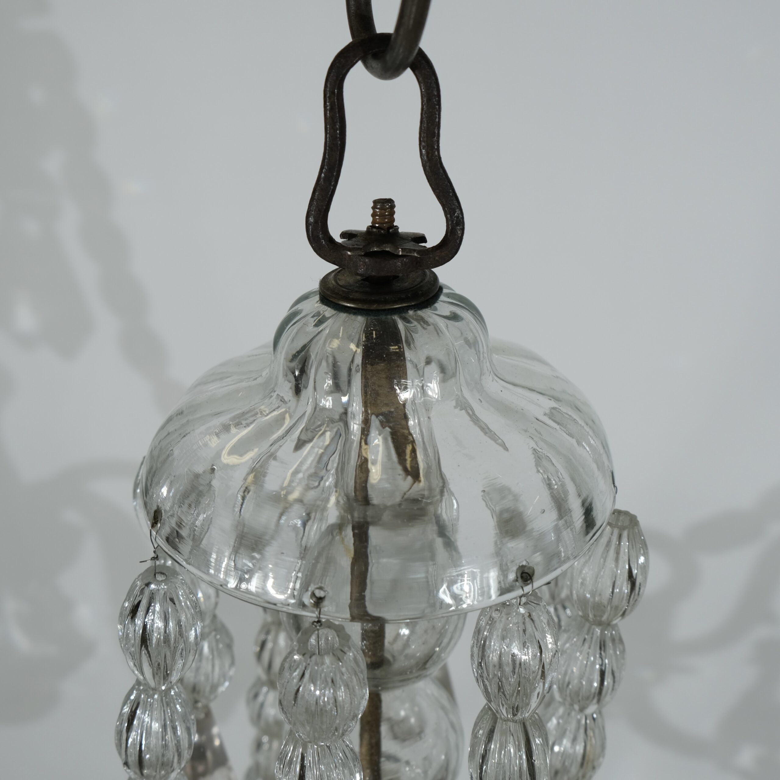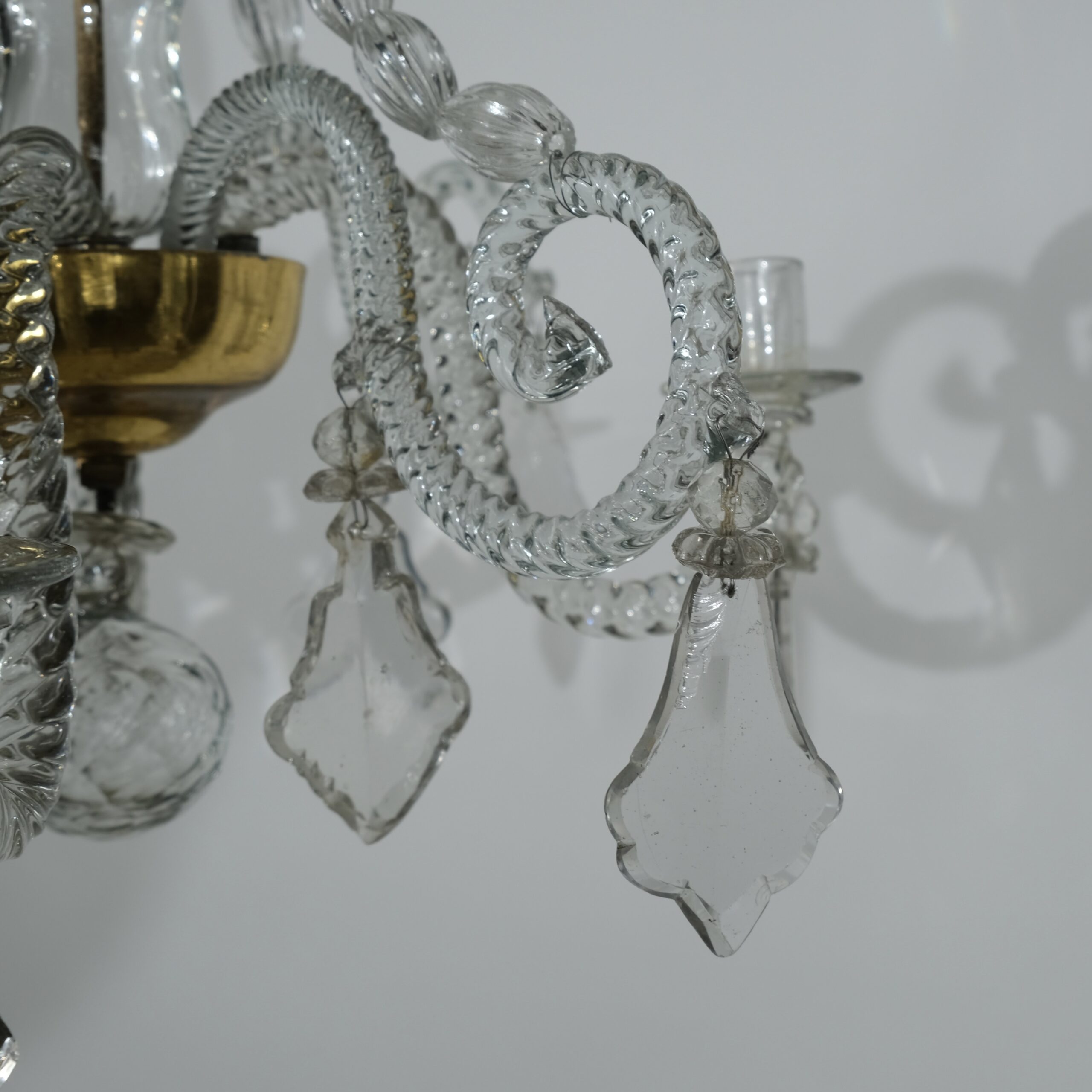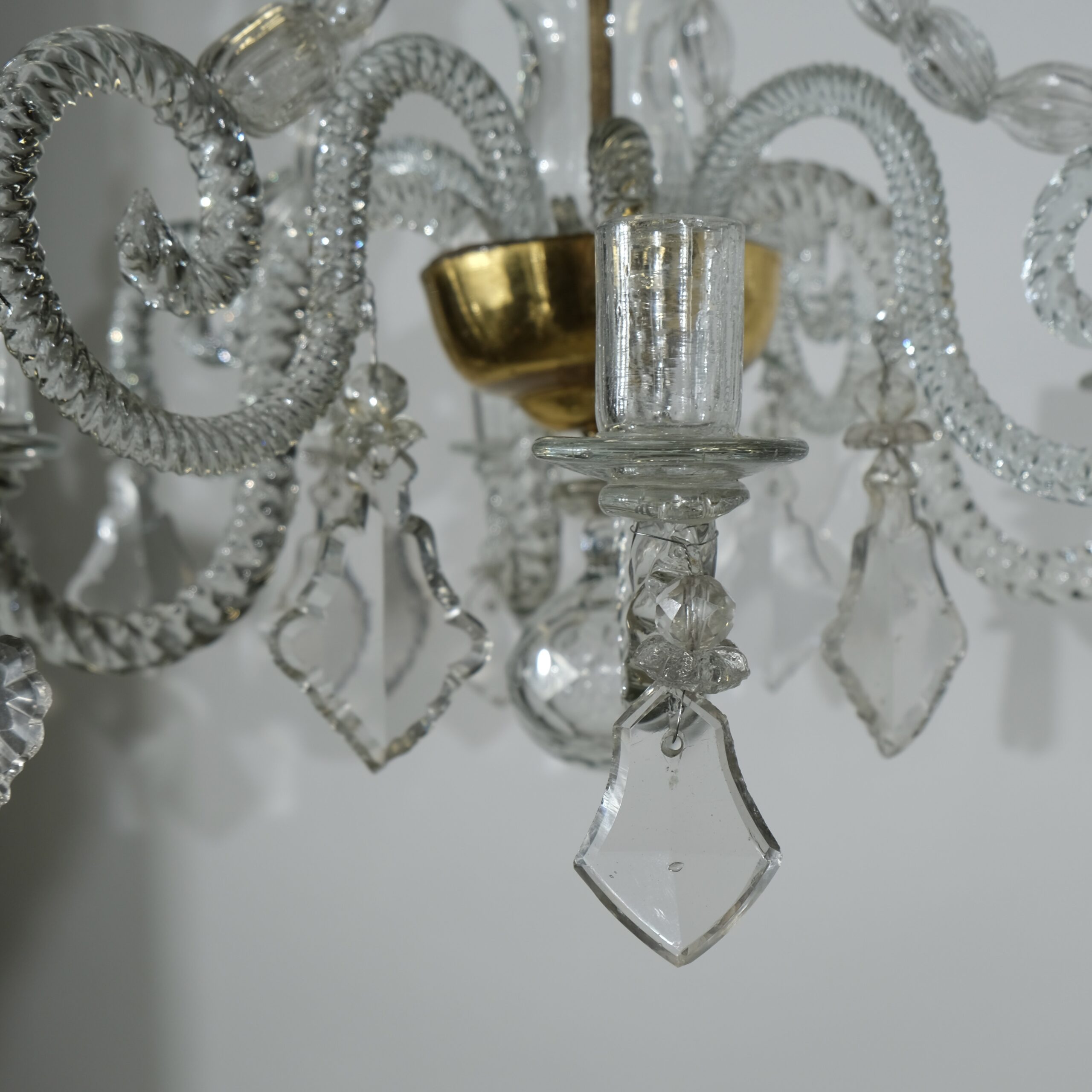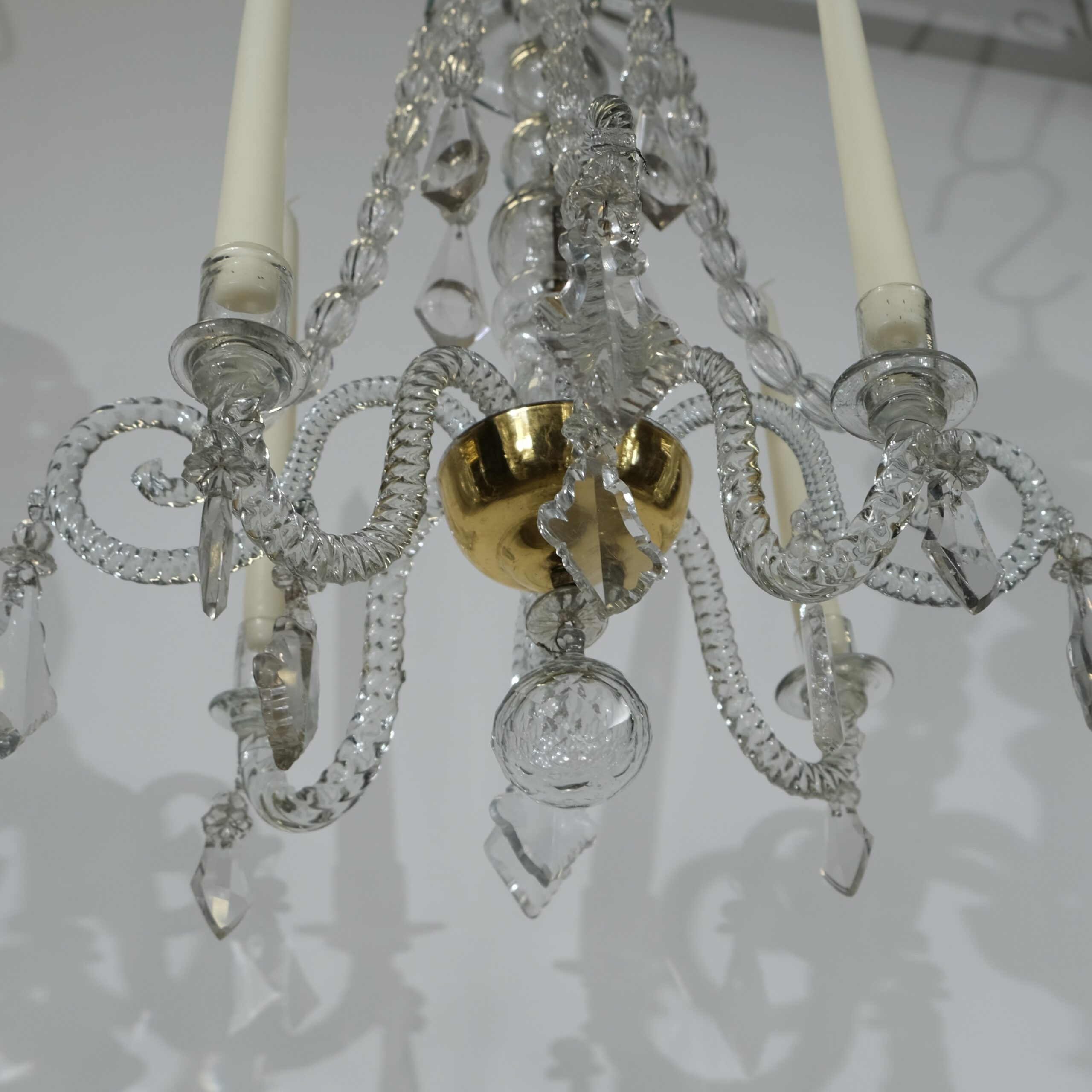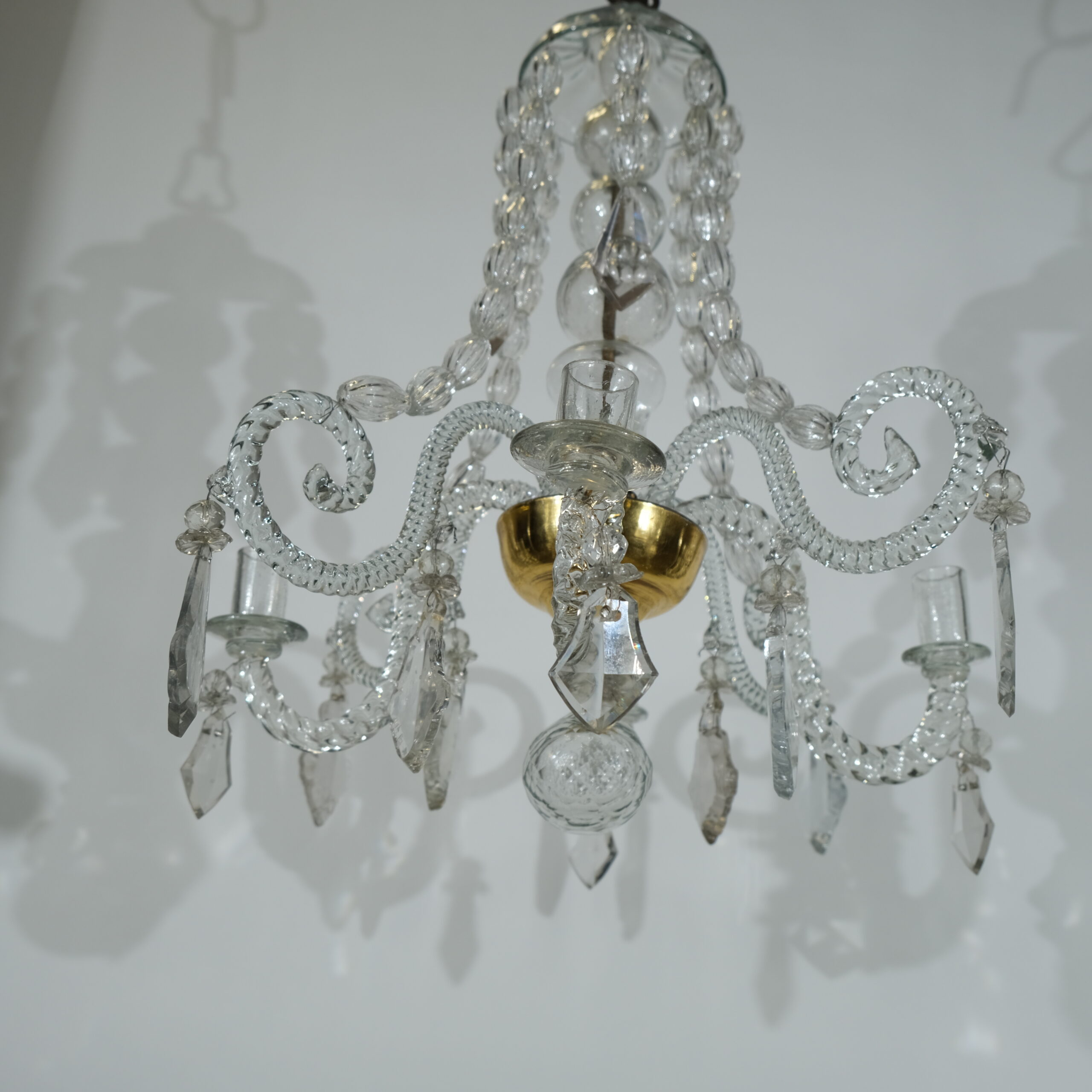 A small 18th c chandelier in unusually good condition. The central part of the chandelier has a stem of blown crystal balls that all are kept together by a forged iron pool. The four arms with candleholders as well as the decorative ribs in-between are all made of crystal glass in the fashion of the 18th c.
