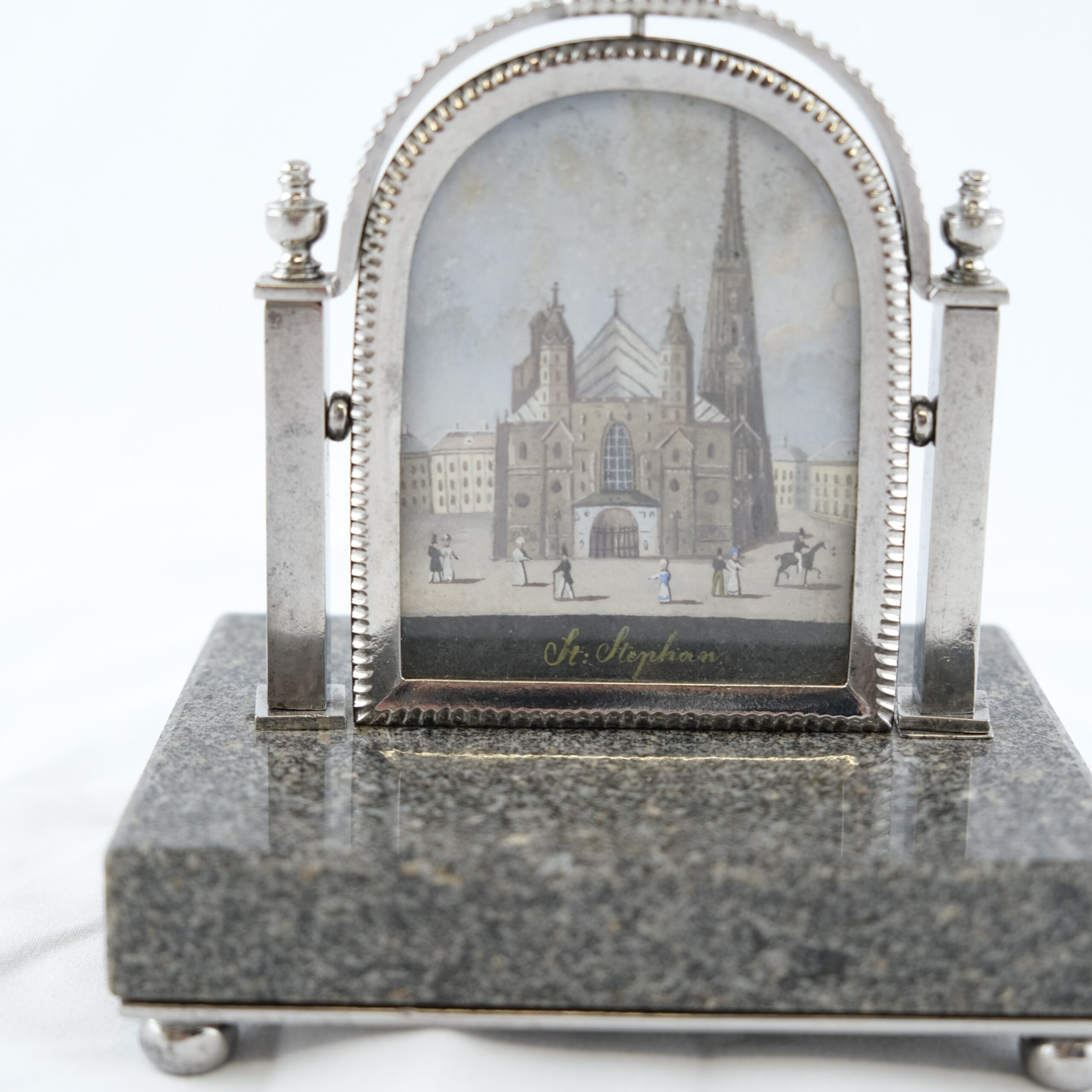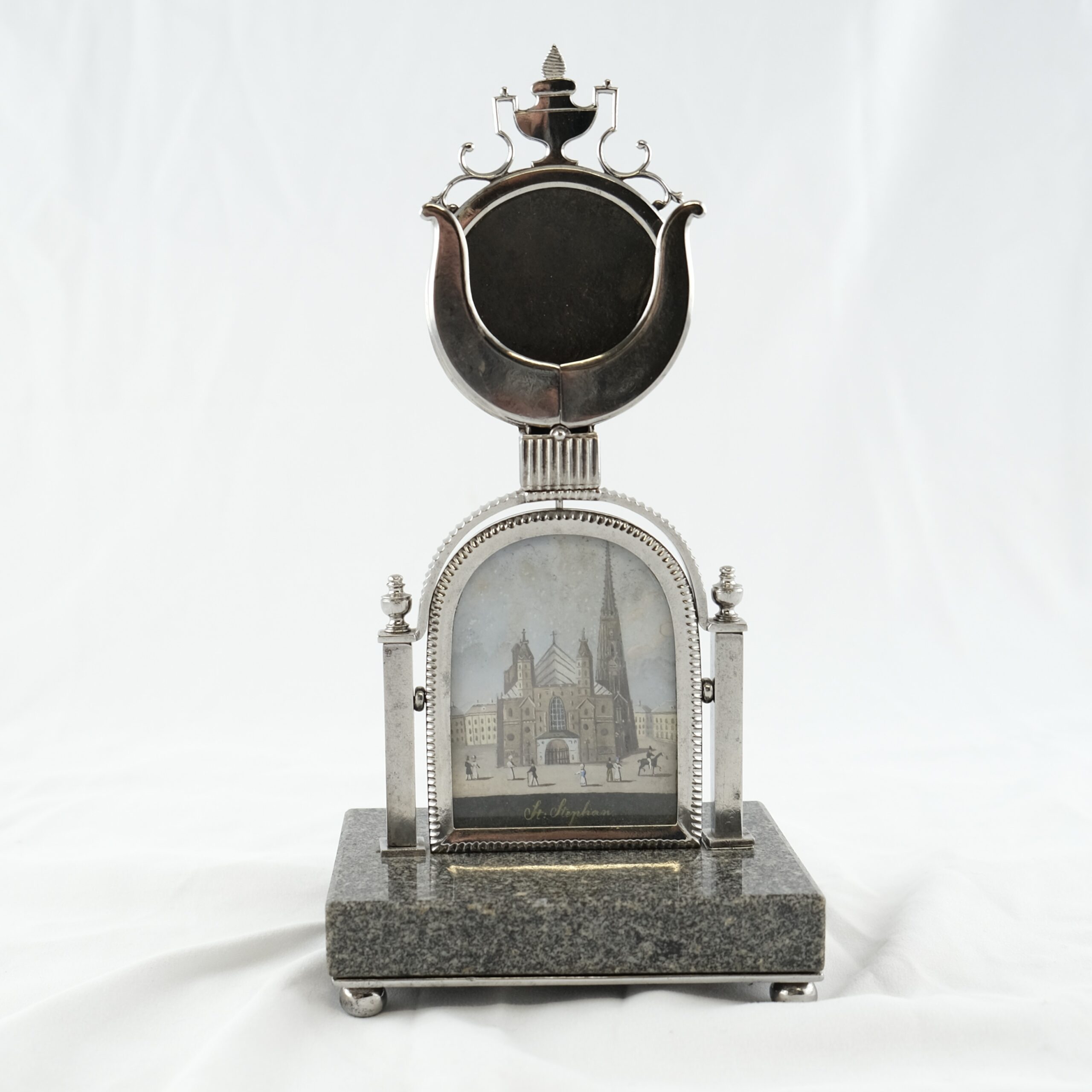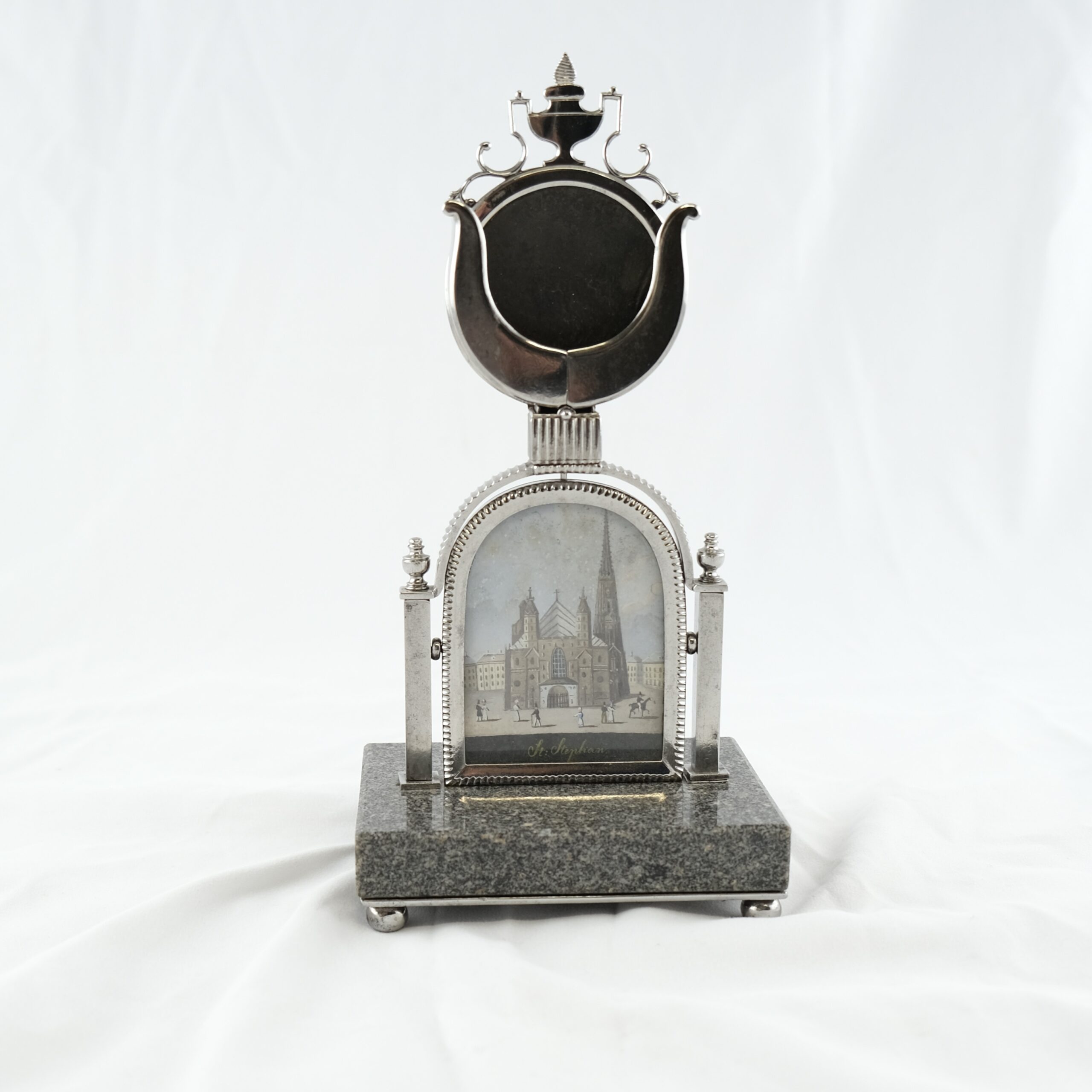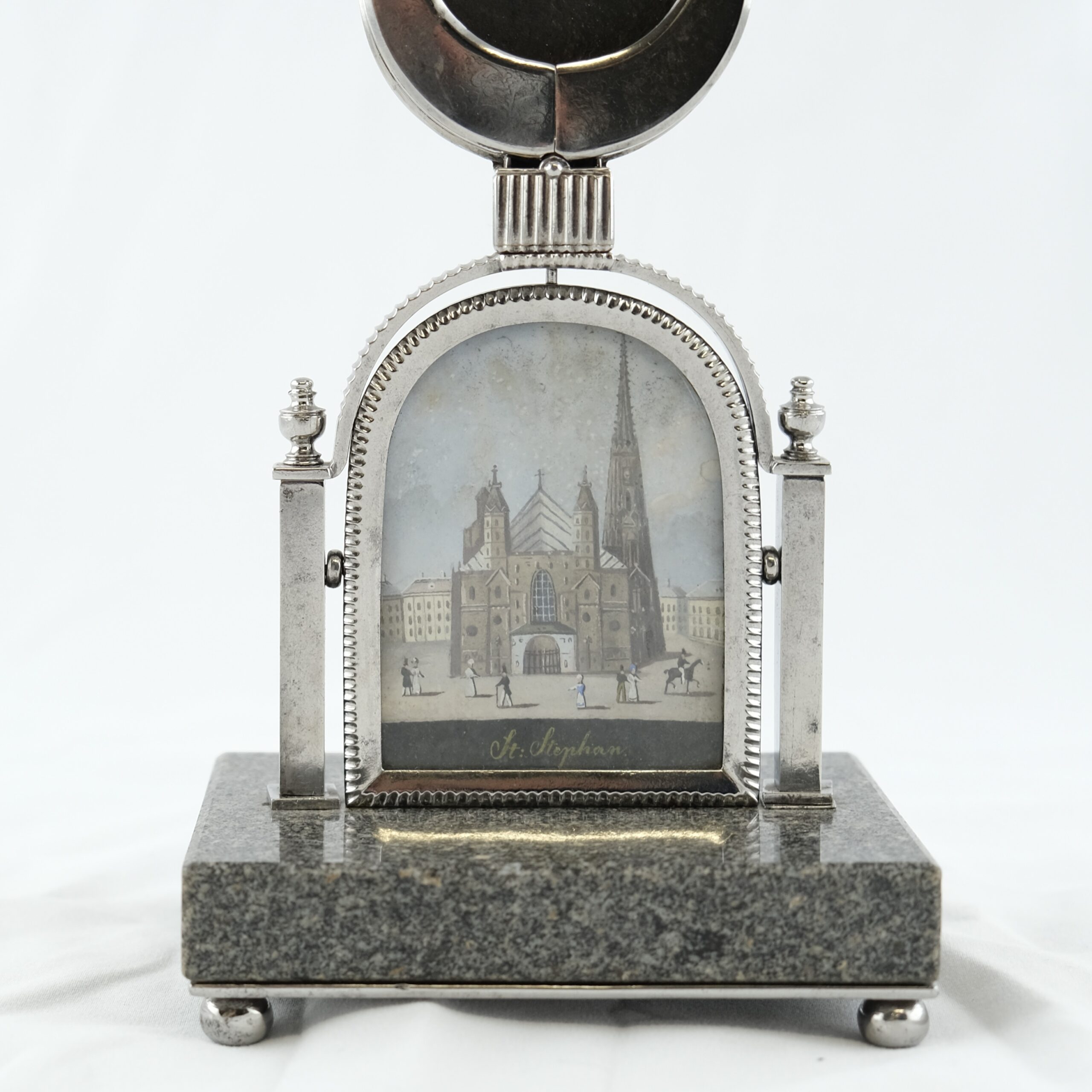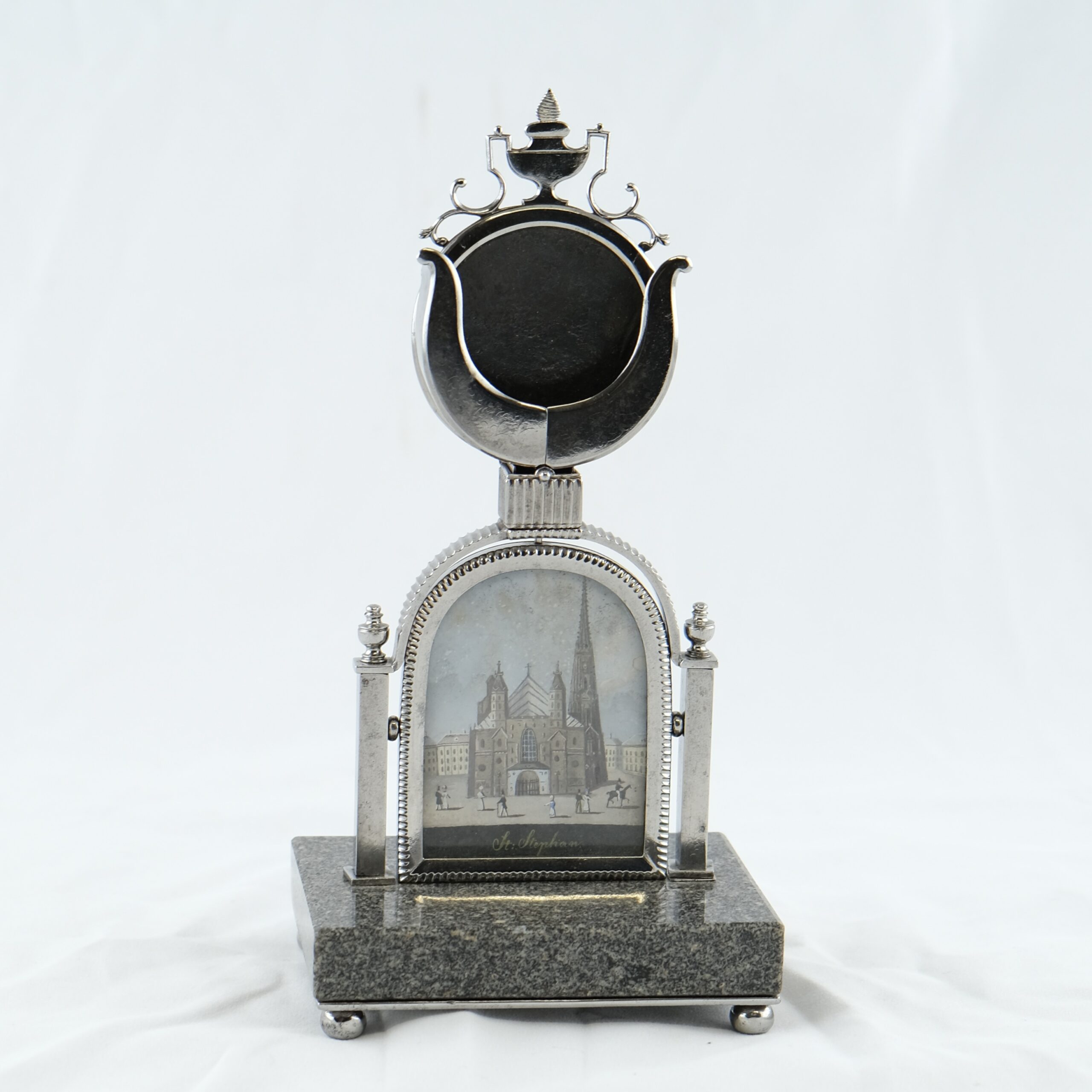 A beautiful and exclusive clock stand made of steel and granite. Holding a picture of the Stephans-dome. The most famous church in Wienna, Austria.