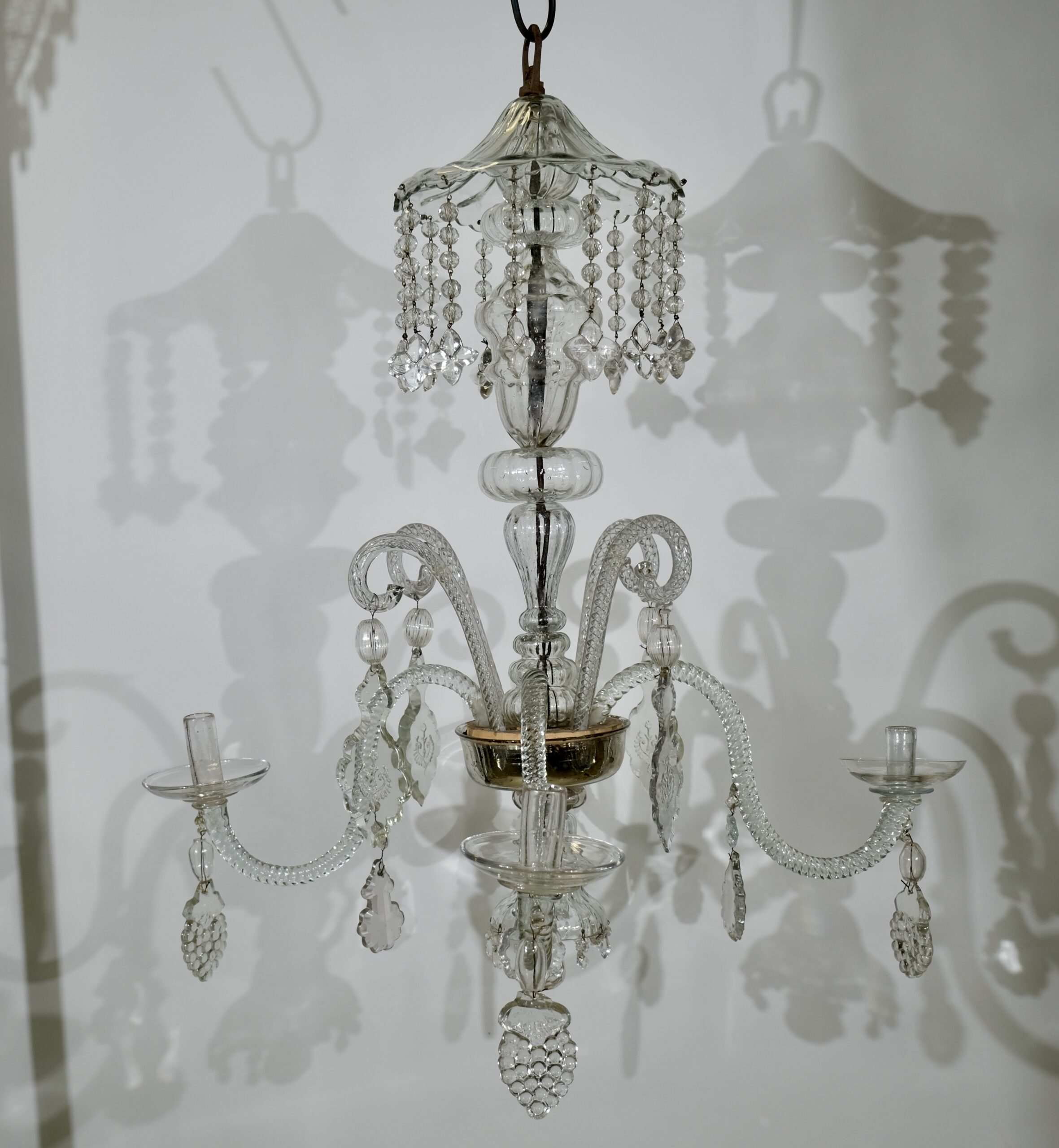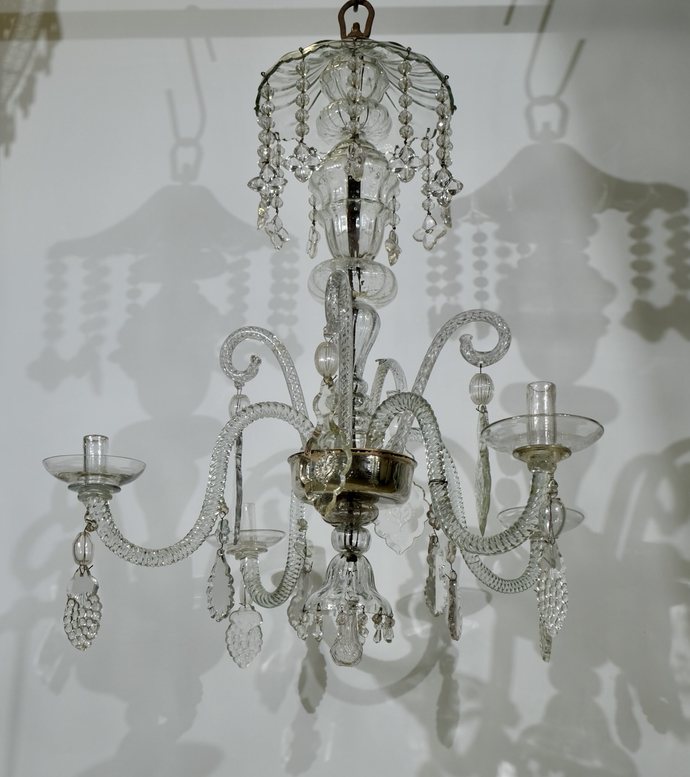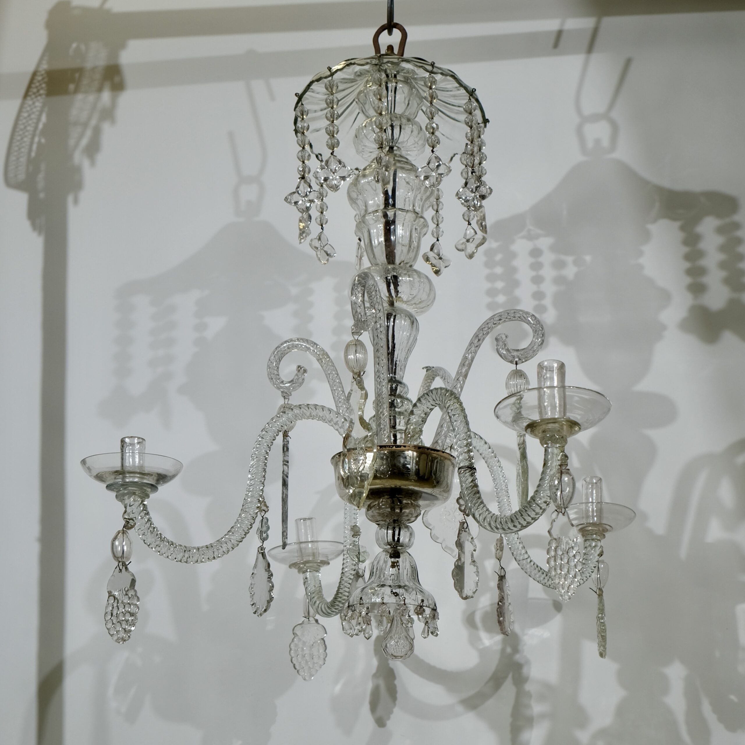 The crystal bowl that holds the S-shaped arms is inside silvered and this is original from the 18th c. The chandelier has historically interesting pendants in the shape of grapes and stars and the largest crystal pendants have engraved motives.