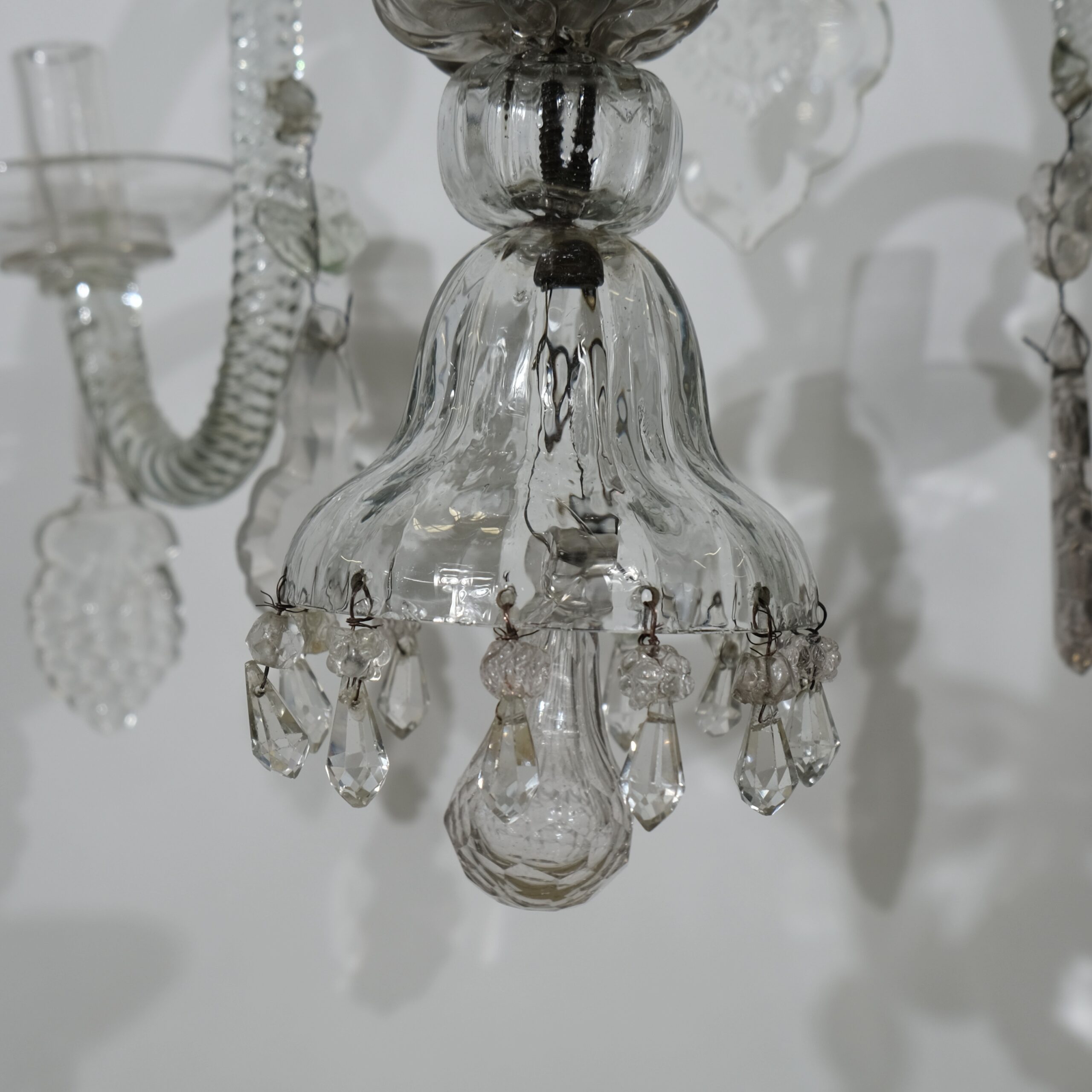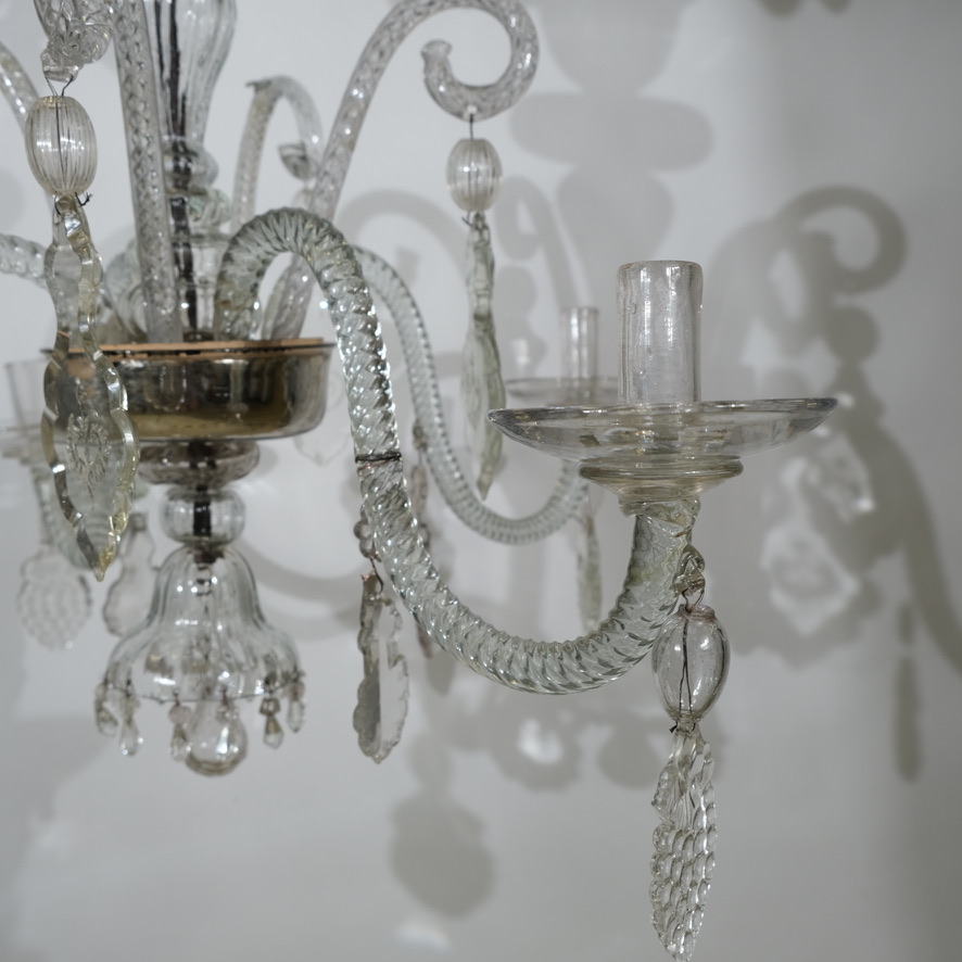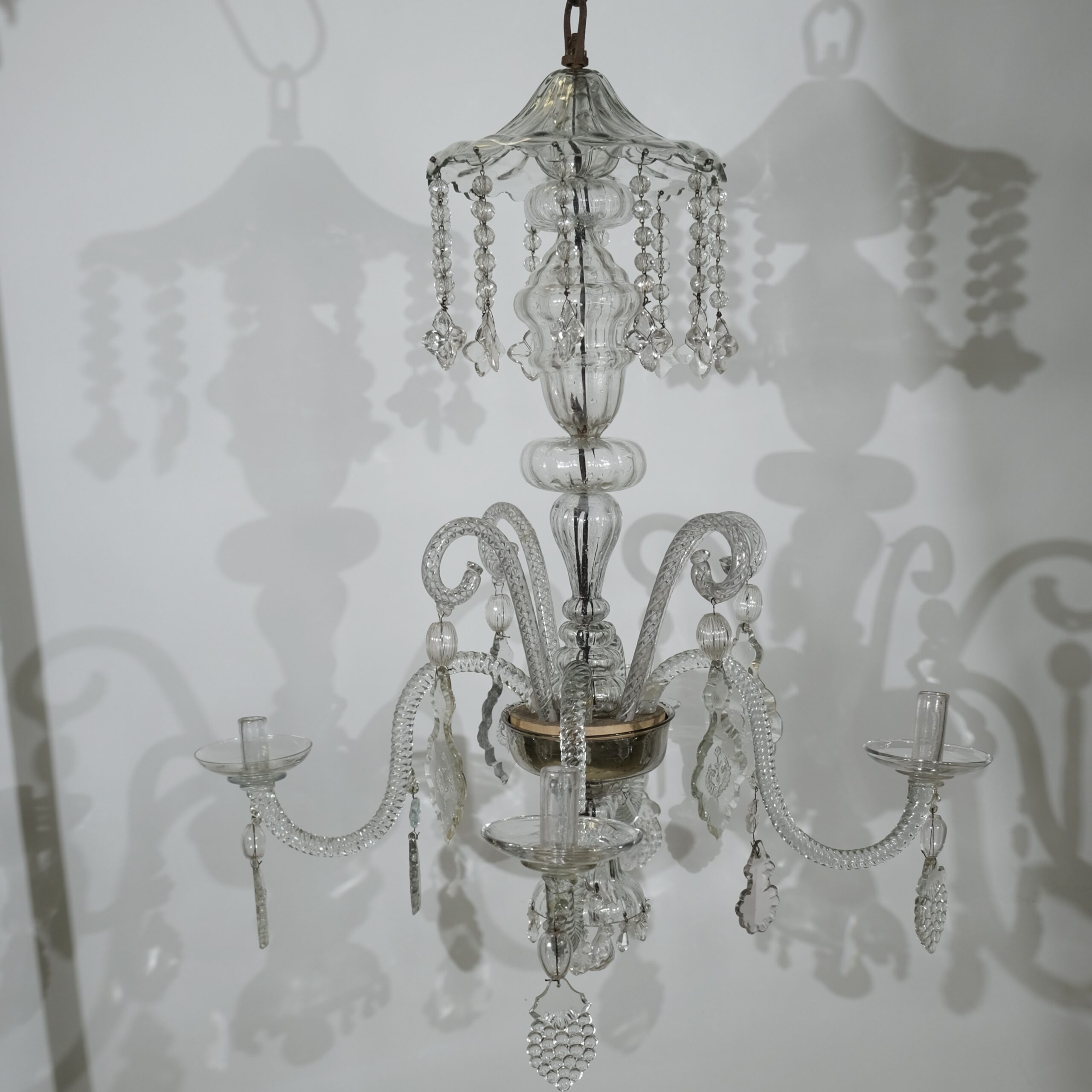 The crystal bowl that holds the S-shaped arms is inside silvered and this is original from the 18th c. The chandelier has historically interesting pendants in the shape of grapes and stars and the largest crystal pendants have engraved motives.