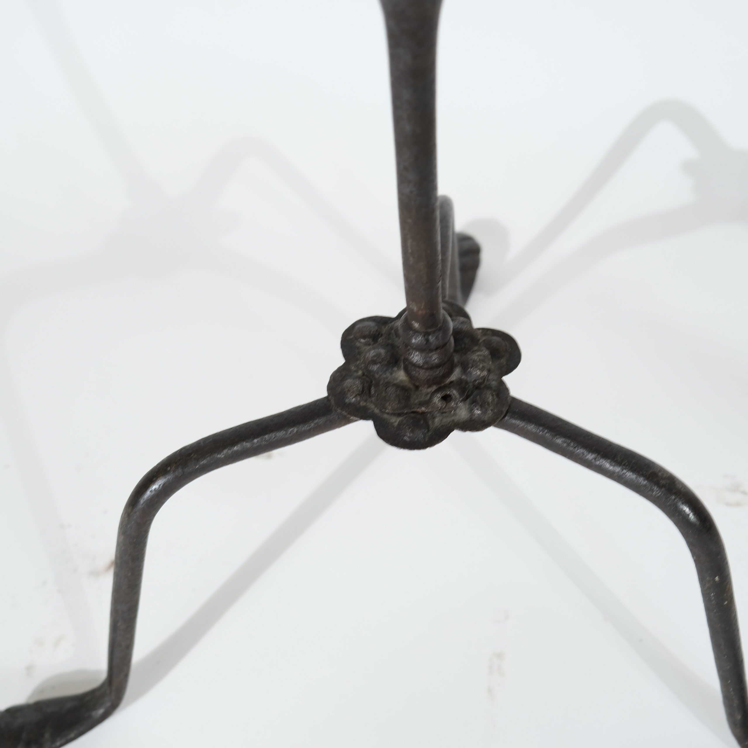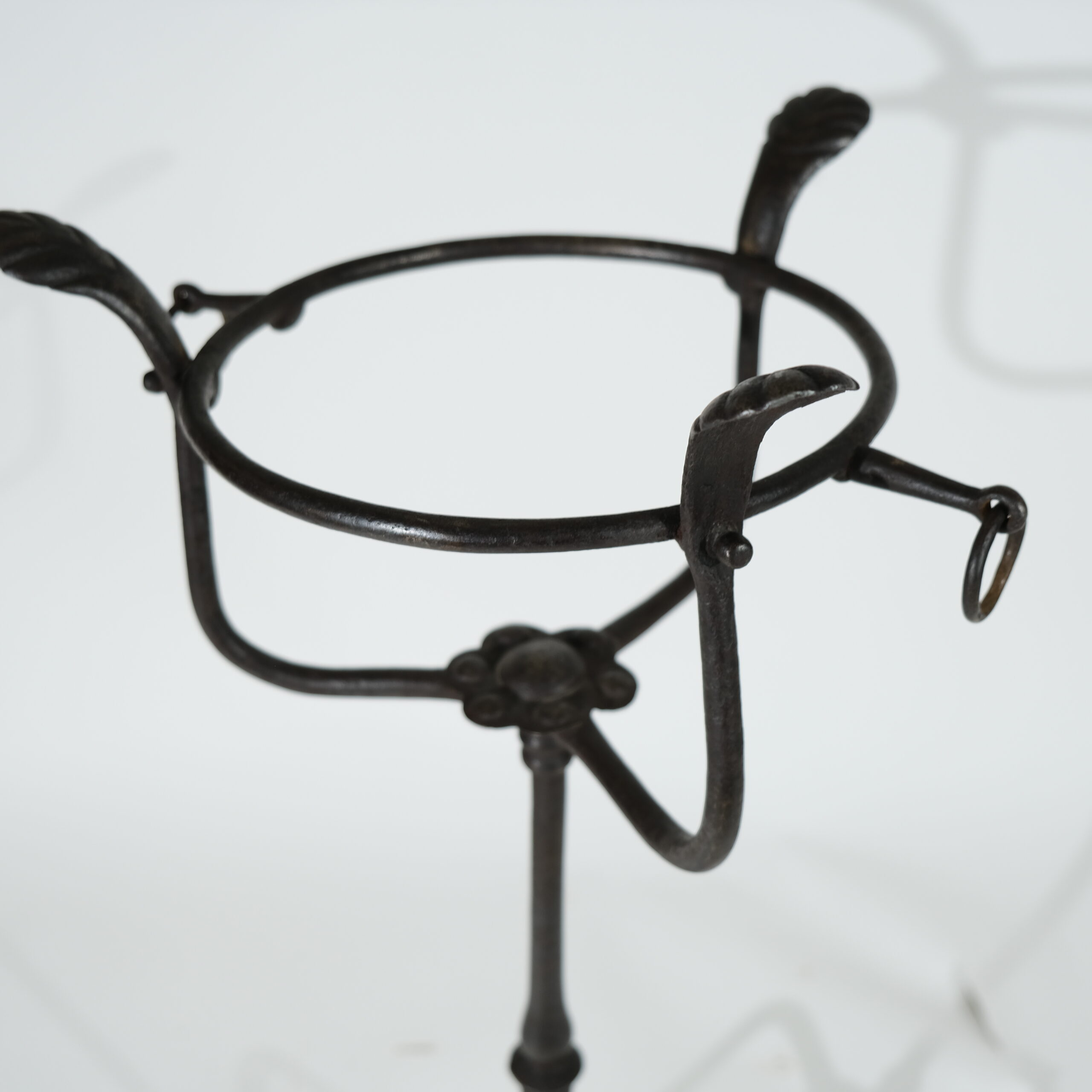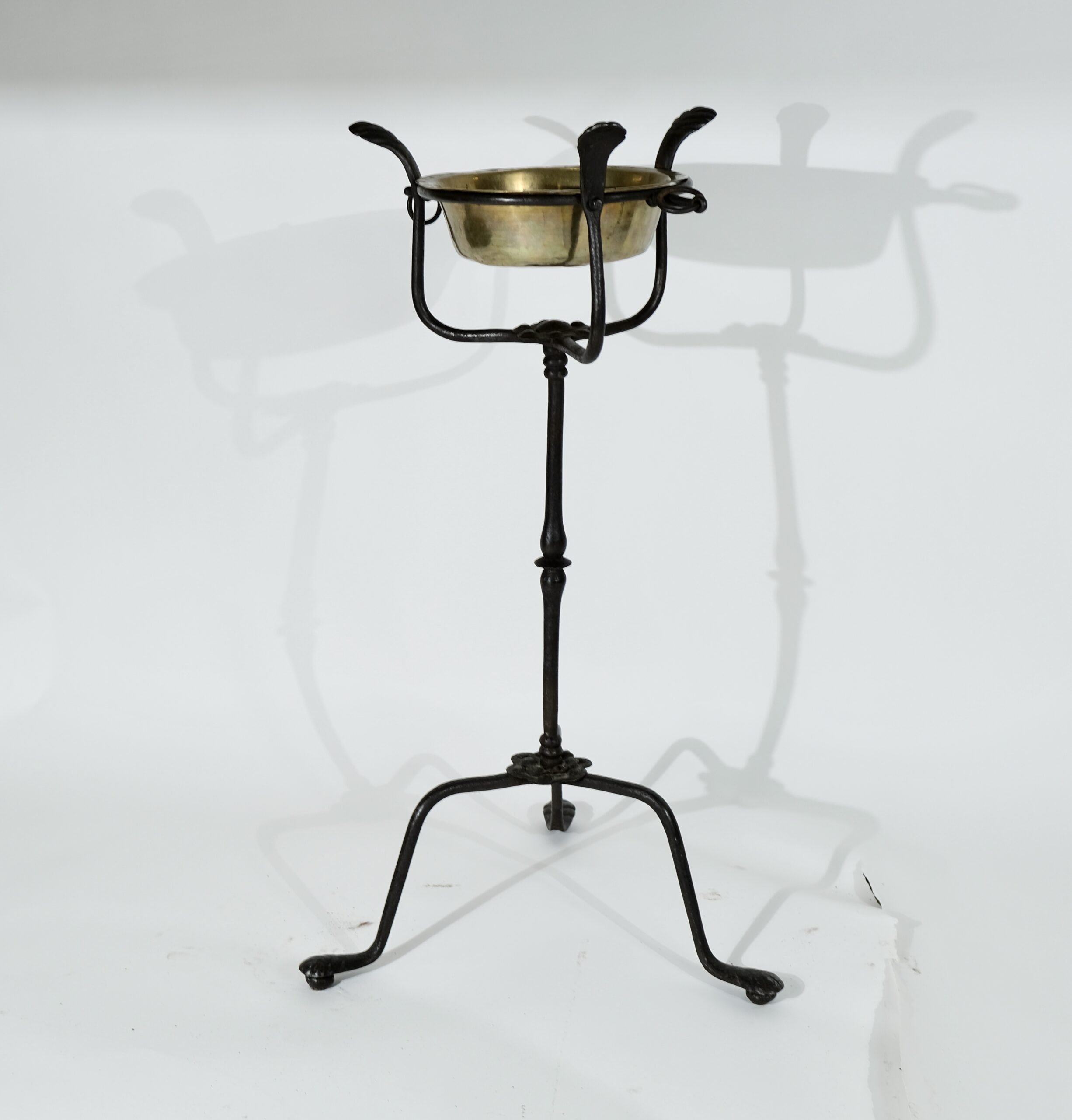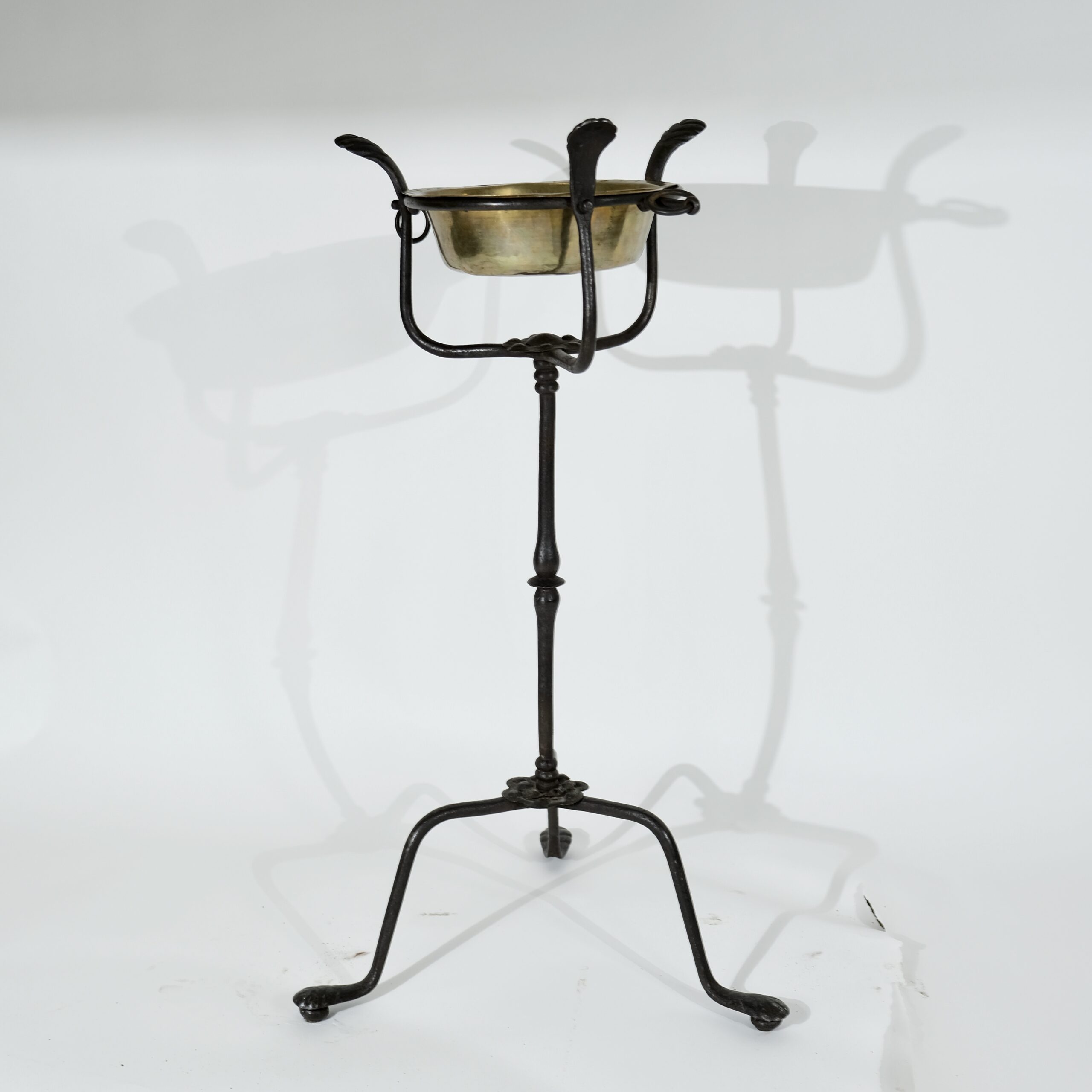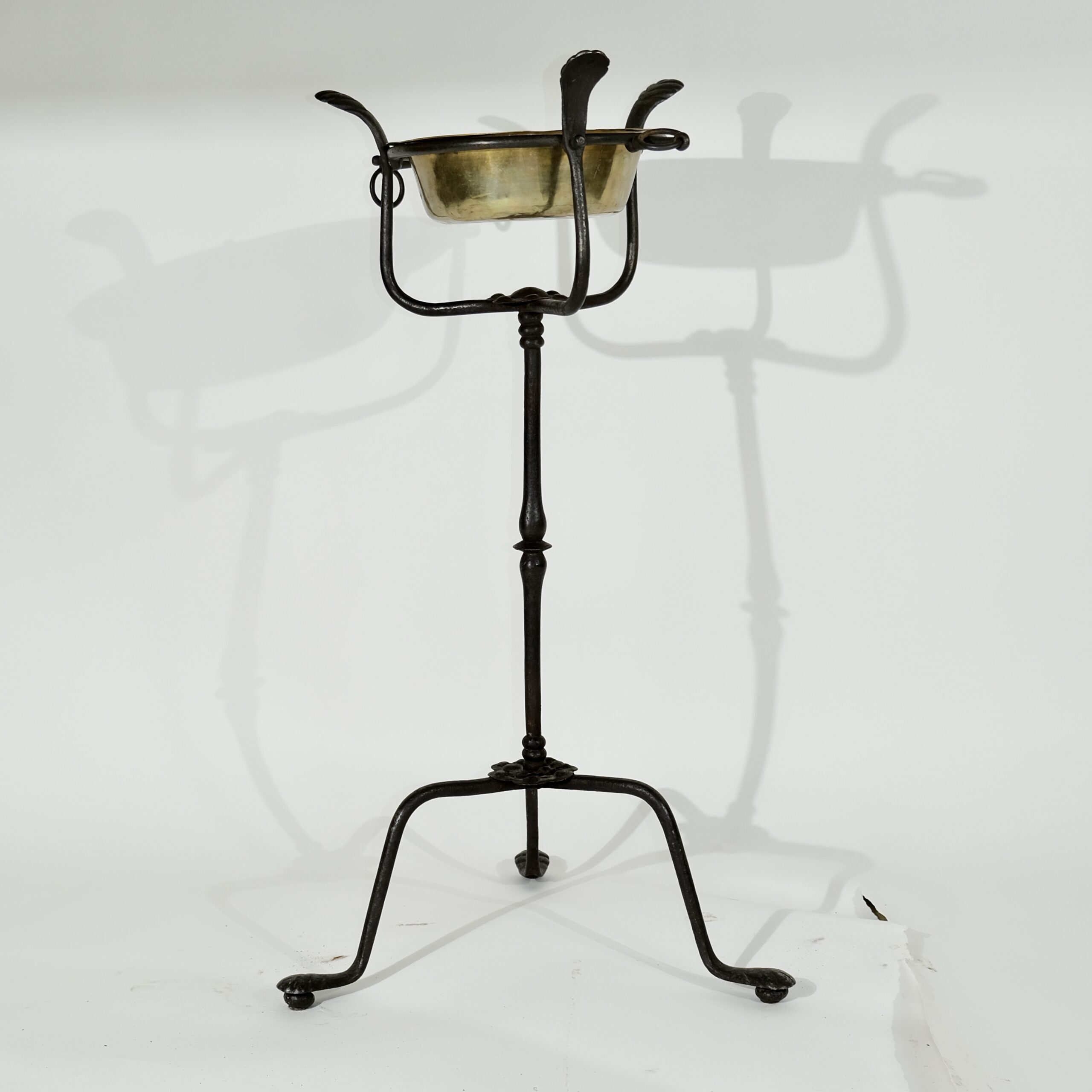 A forged iron stand with a brass bowl. North European and made in the late 17th century