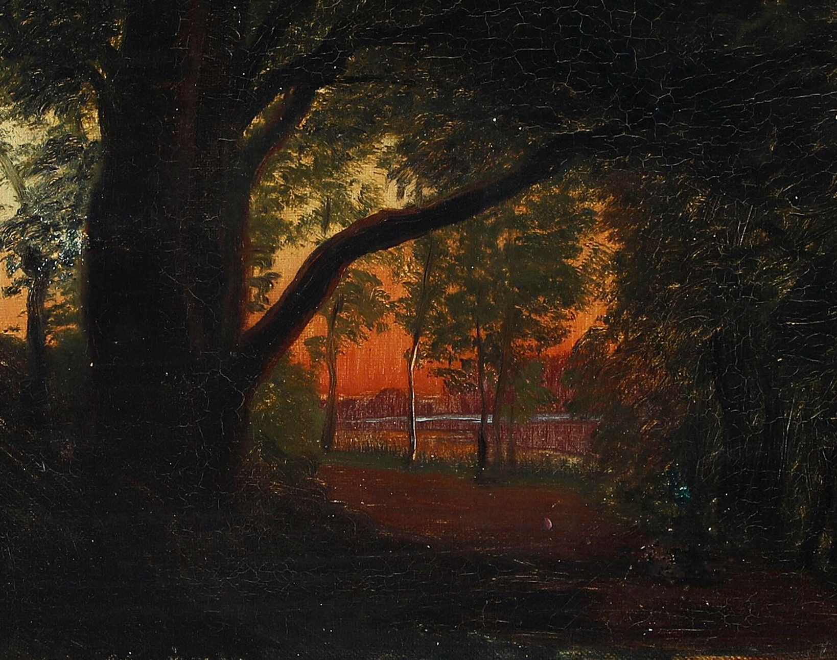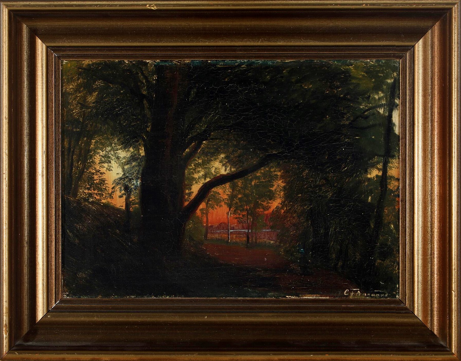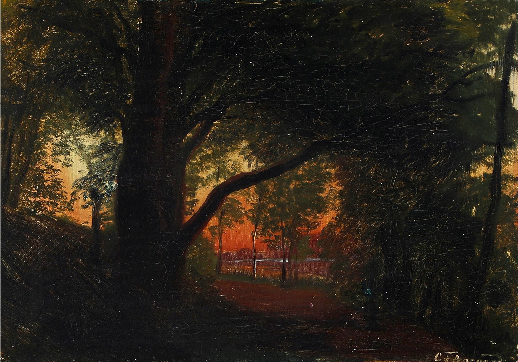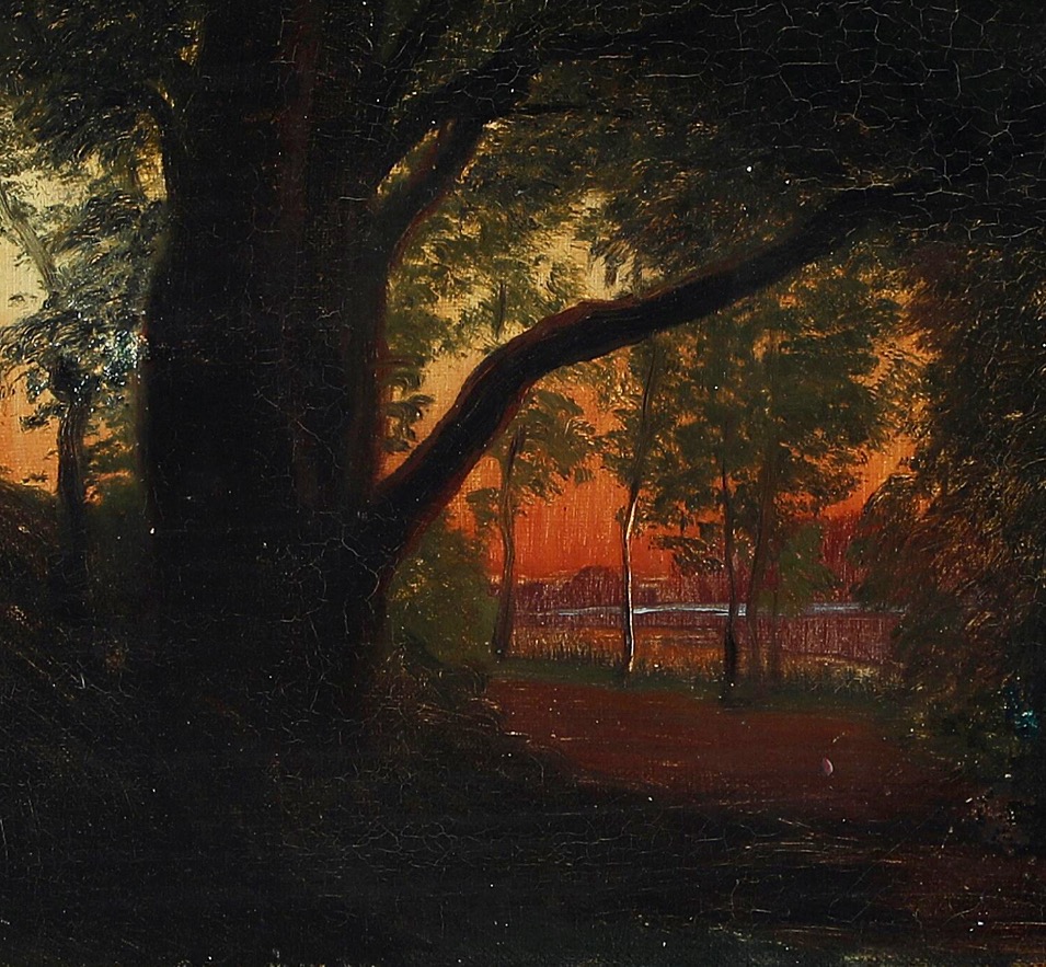 Carl Frederik Aagaard, Sunset over Dyrehaven. Signed C.F. Aagaard. Oil on canvas laid on card box panel. 22×32 cm without frame. A tergo written: "Prof C F Aagaard Sonedgang Jægersborg Dyrehave 1860" and "til højre for døren", the last text meaning "to the right of the door" and possibly meaning a placement in a room. Probably painted "en plein air". which comes from the French and means the act of painting outdoors.