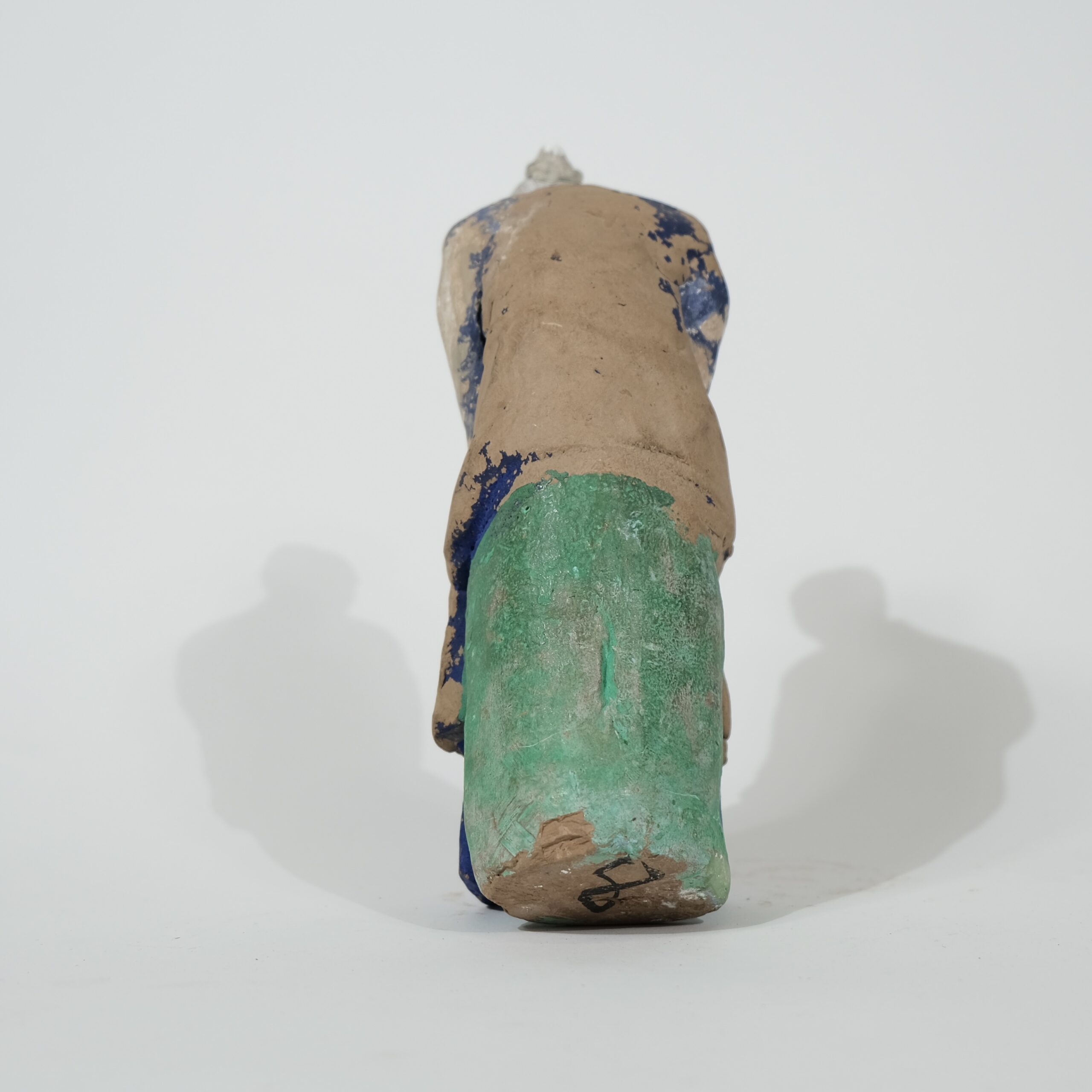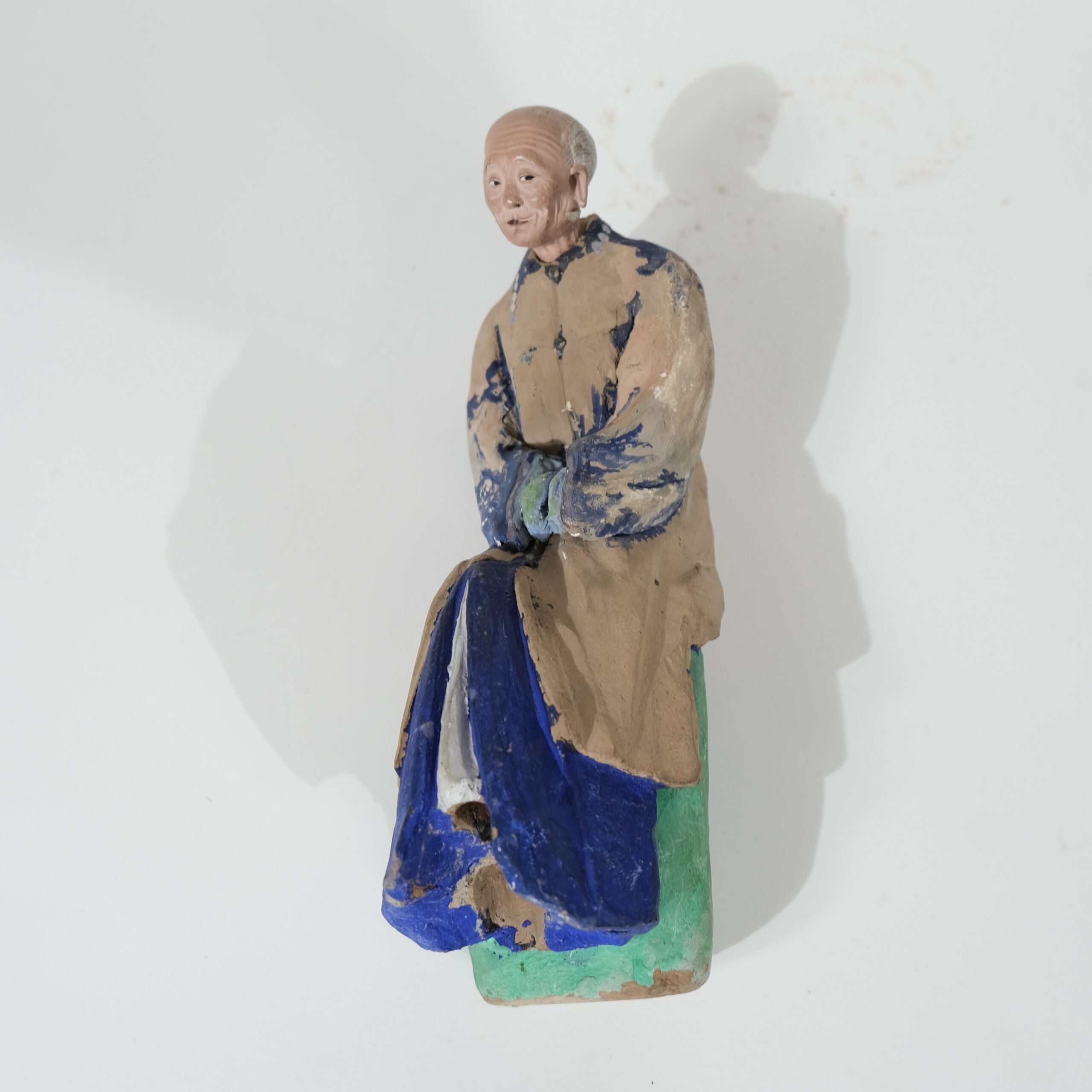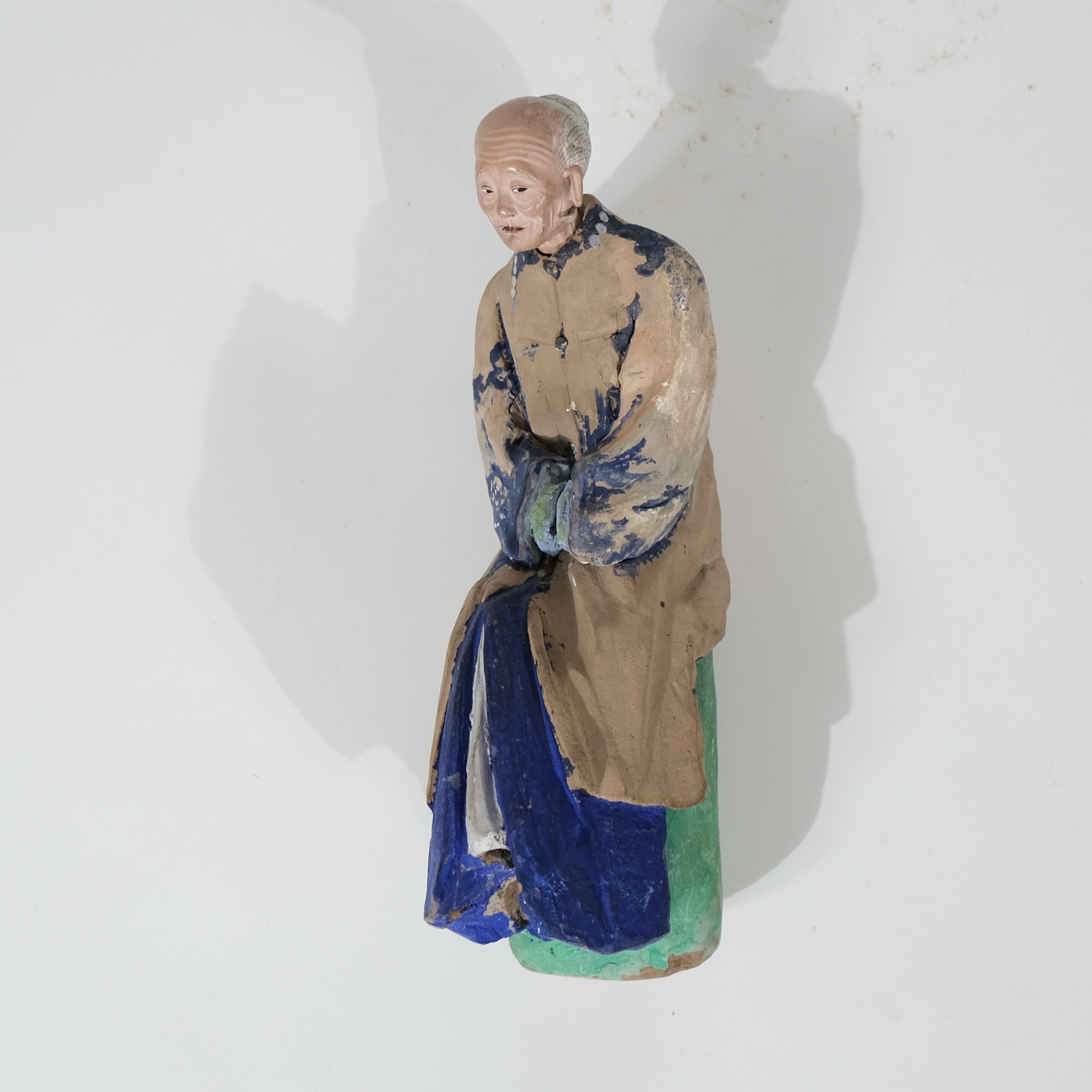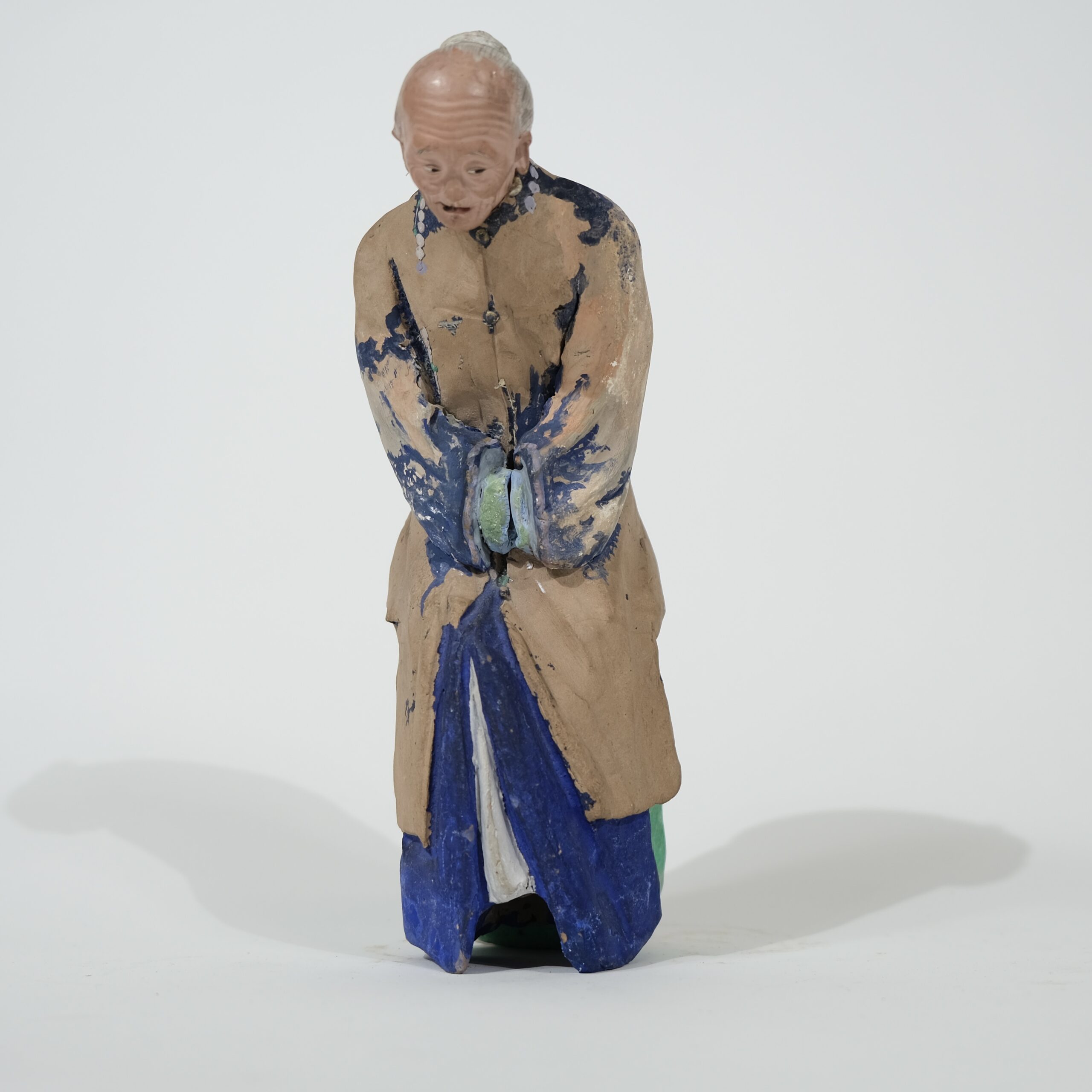 A Chinese sculptured and painted clay figure of an elderly man. 19th century. Partly worn off paint and probably missing a pair of feet.