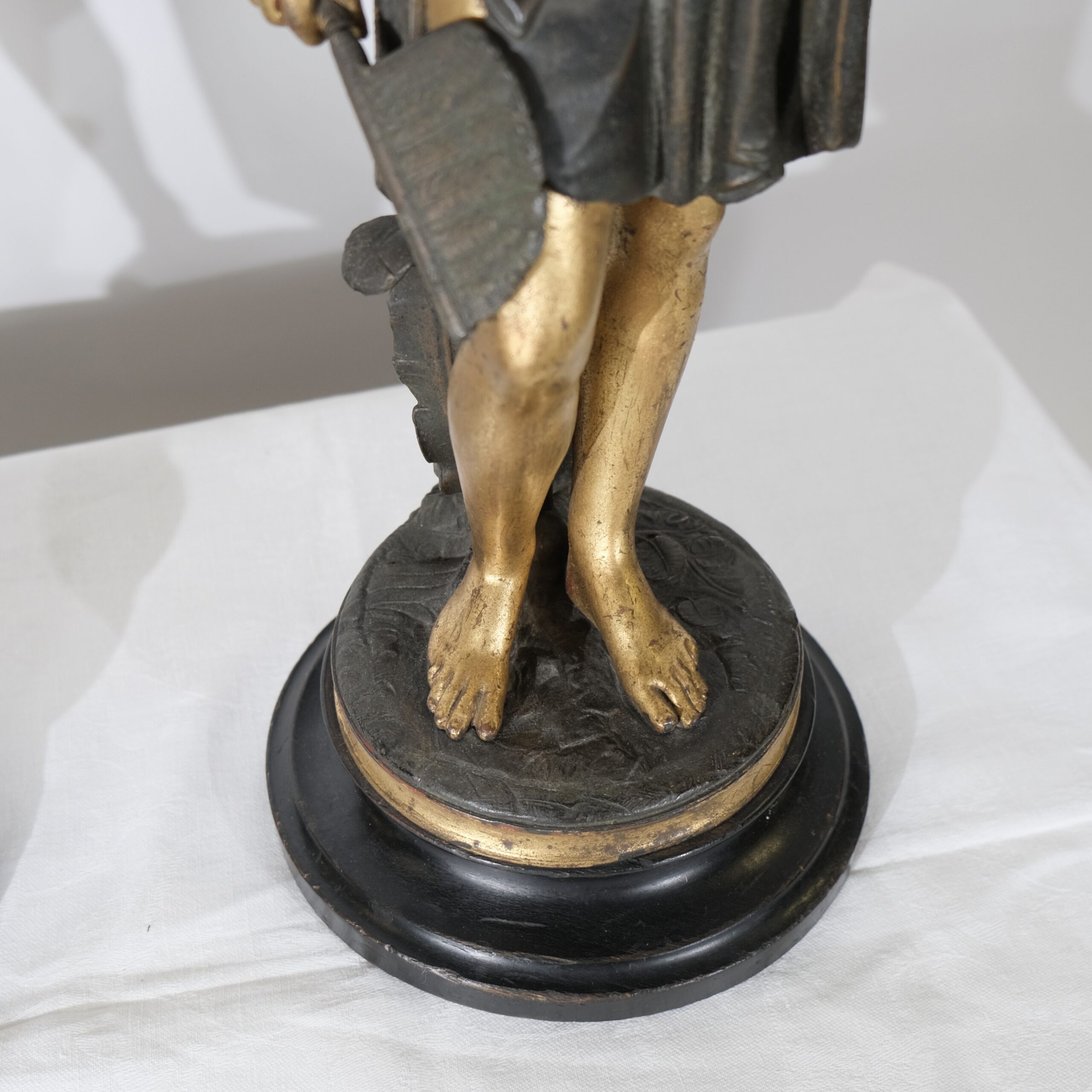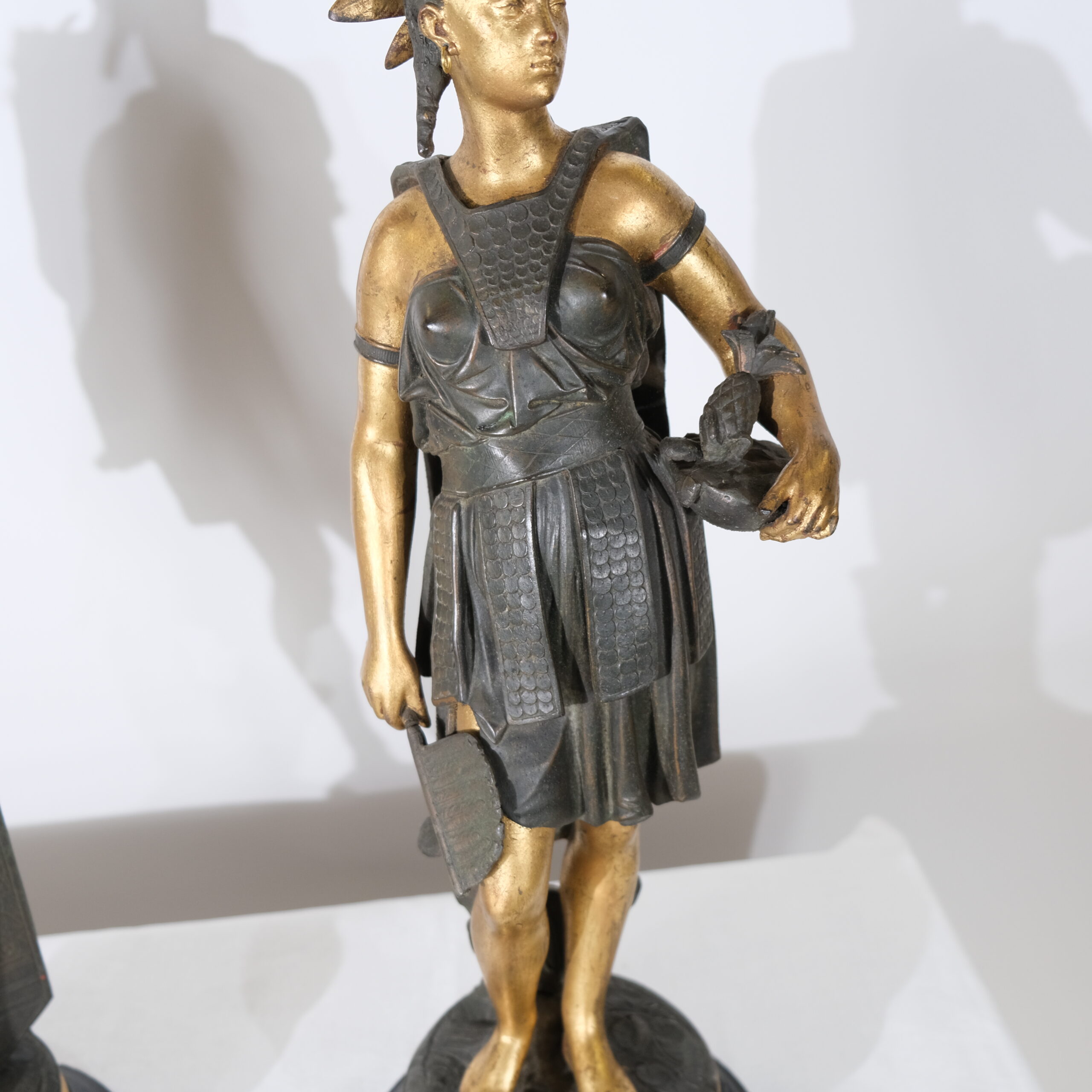 This pair of sculptures, titled "Guerrier des Amériques" by French sculptor J.J. Salmson (1823-1902), depict two American Indian warriors in a striking and detailed manner. Both figures stand proudly on round, black bases with golden accents, which enhance their presence. The sculptures are made of patinated and gilded bronce, creating a visually compelling contrast between the dark patination and gold highlights.