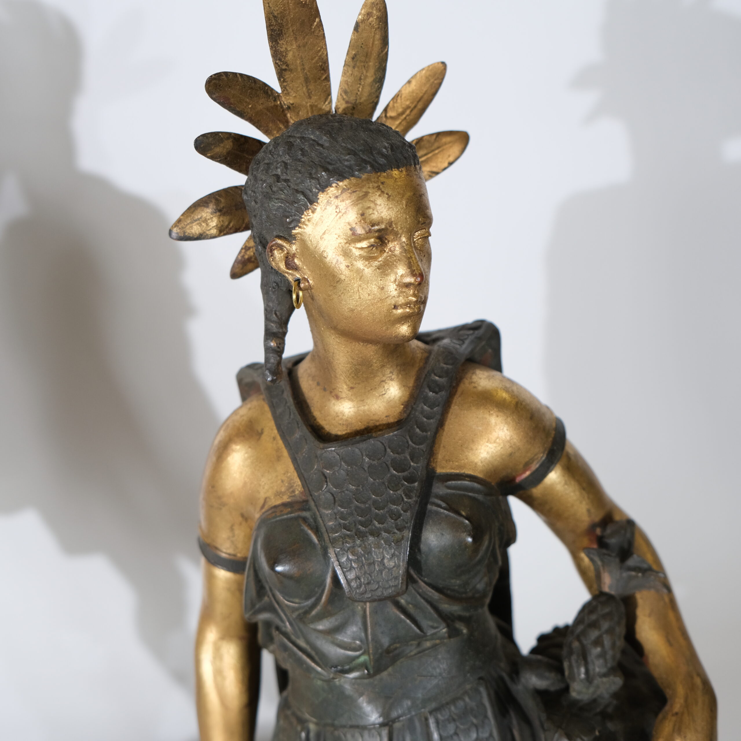 The female warrior on the right is adorned with a feathered headdress and wears a richly textile, and metal armour. She holds a pineapple in her right hand which symbolises welcoming and stands confidently, her gaze directed outward. These sculptures not only capture the artistry of Salmson but also reflect a romanticized view of Native American culture from a European perspective.
