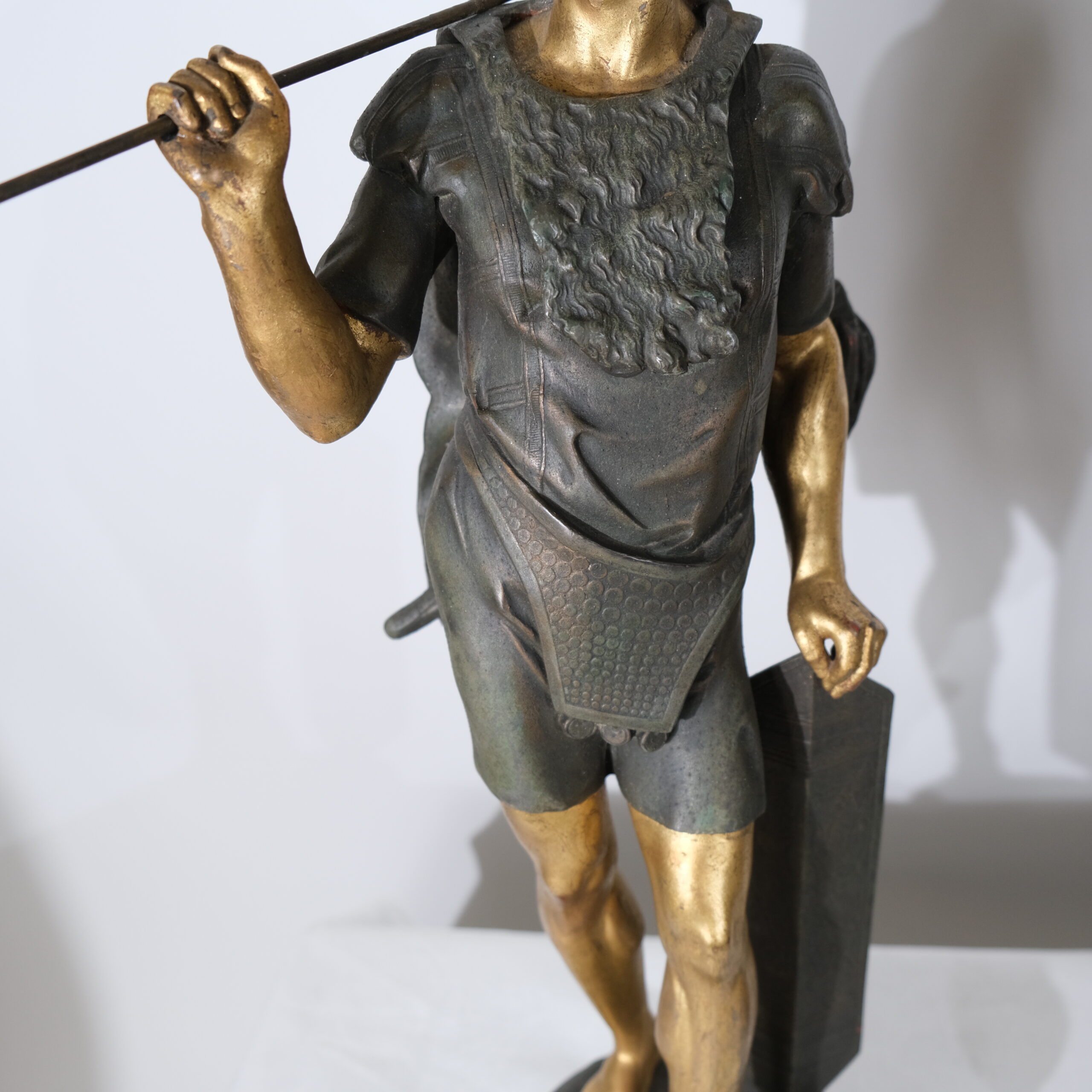 The warrior on the left holds a spear and shield, dressed in traditional attire with a fur garment draped across his chest and short trousers. His pose is dynamic, with one leg slightly forward, exuding a sense of readiness and strength.