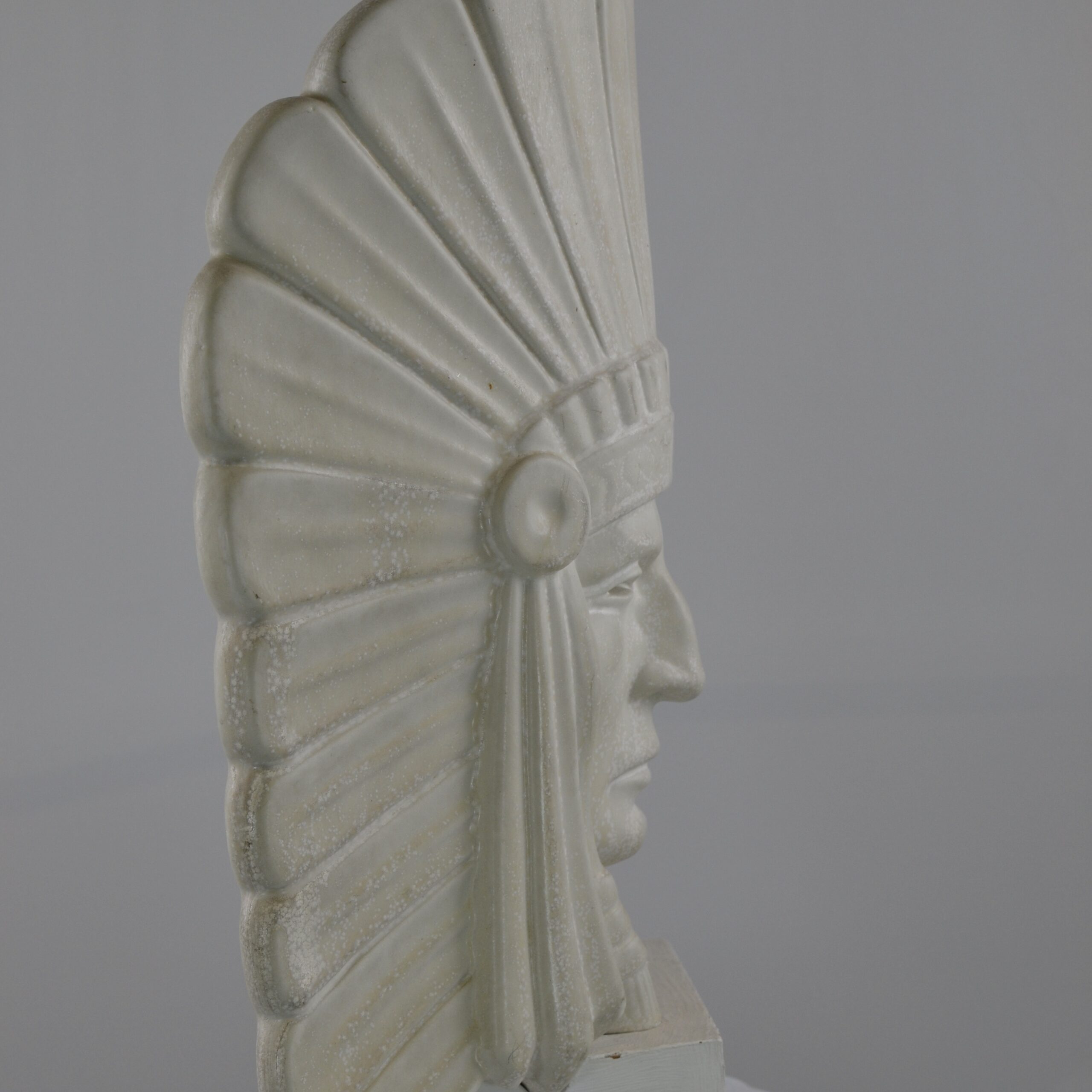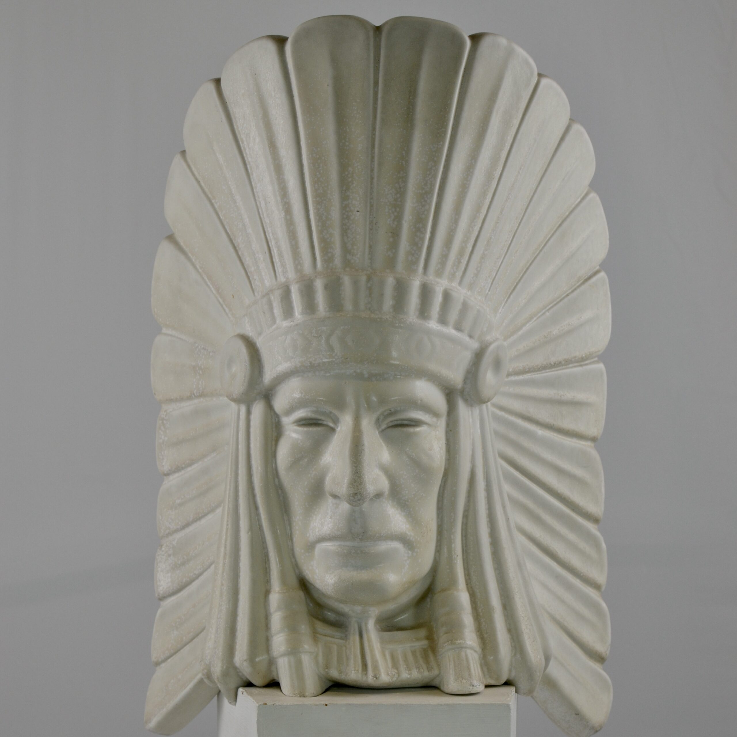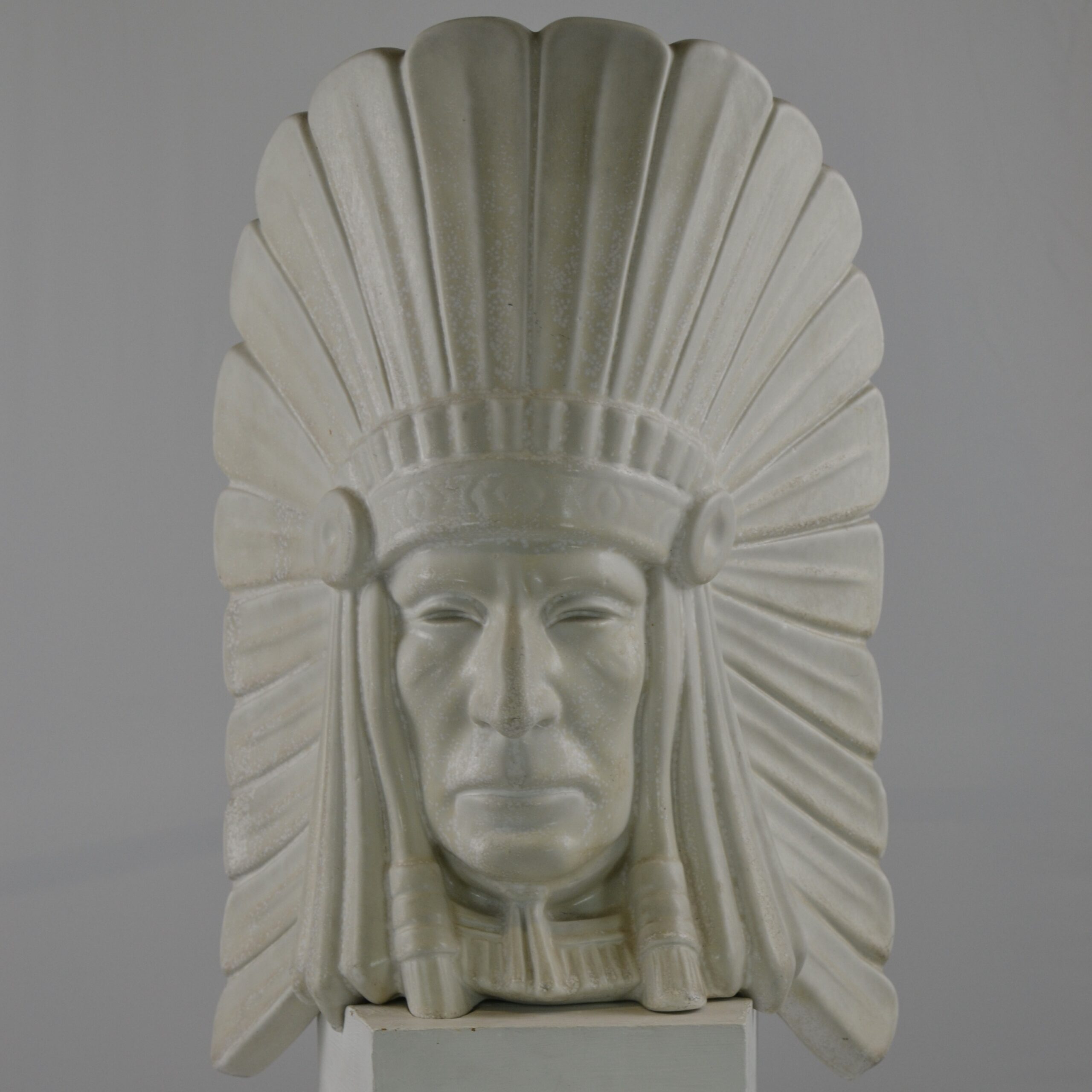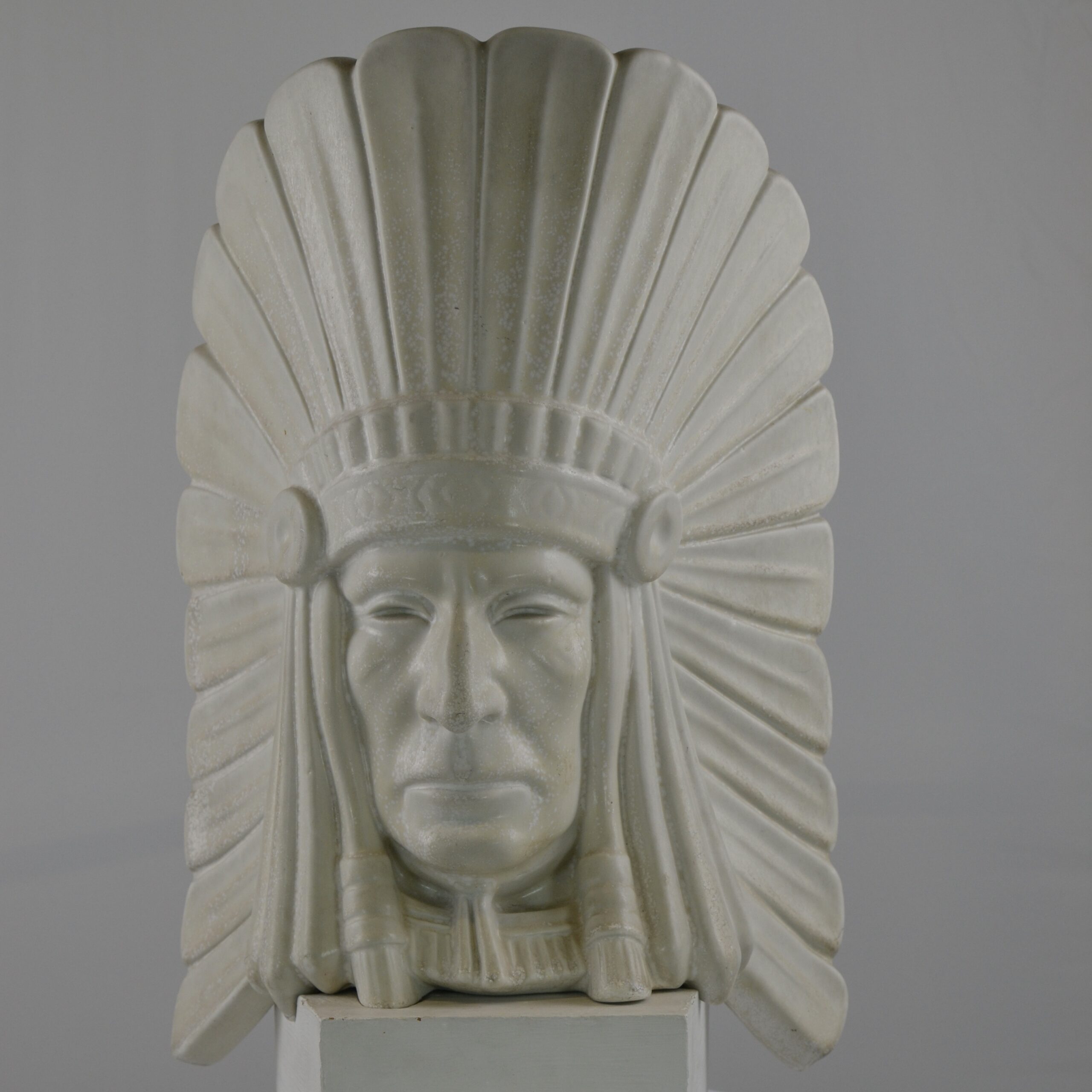 A sculptured head of an American Indian Chief. It is said that this really is a self-portrait of Gunnar Nylund, the artist. It has its original wooden stand . The height is 42 cm without the stand and 46.5 cm with the stand. The sculpture is numbered 20/100. It is signed G.N. and marked Rörstrand. It has great artistic feeling to it.