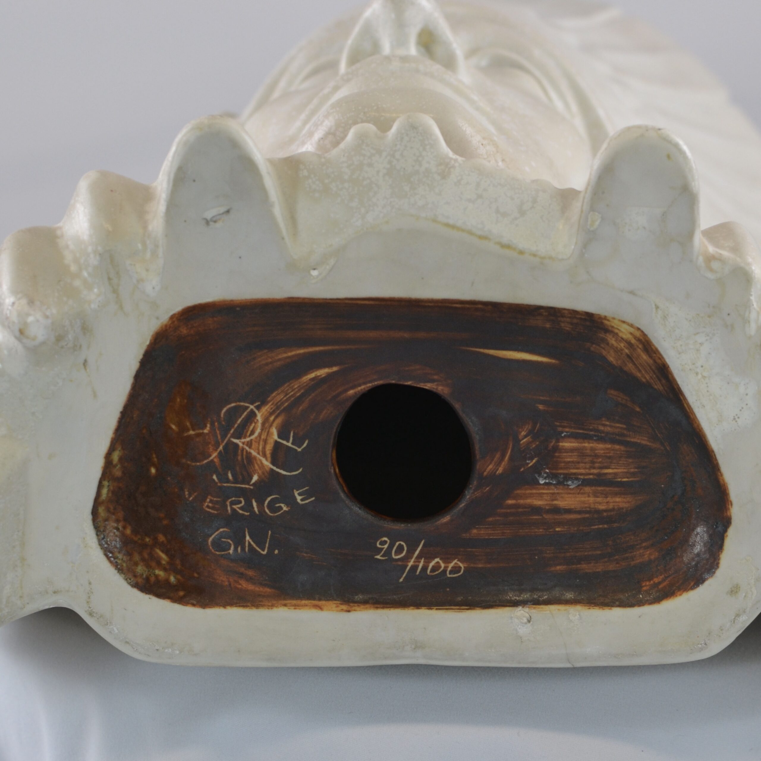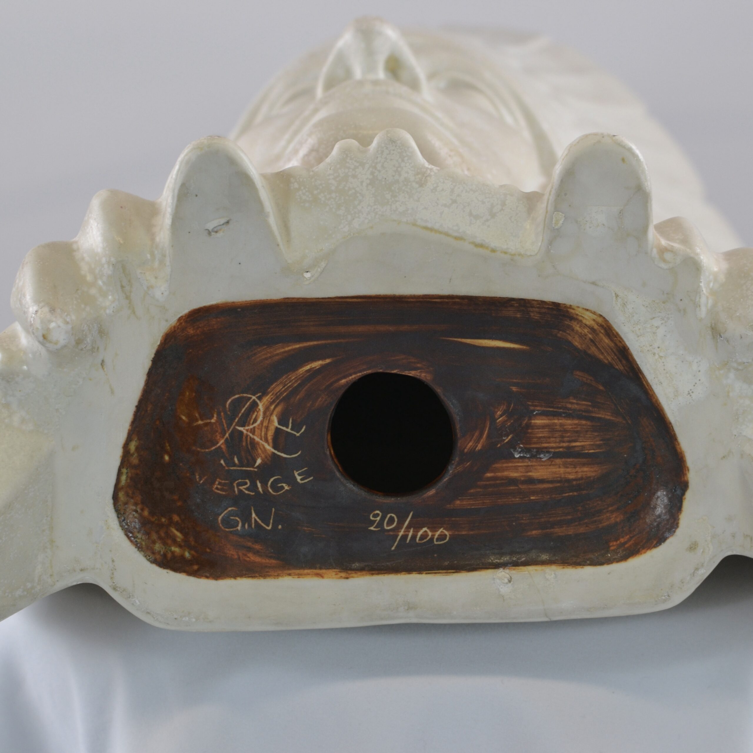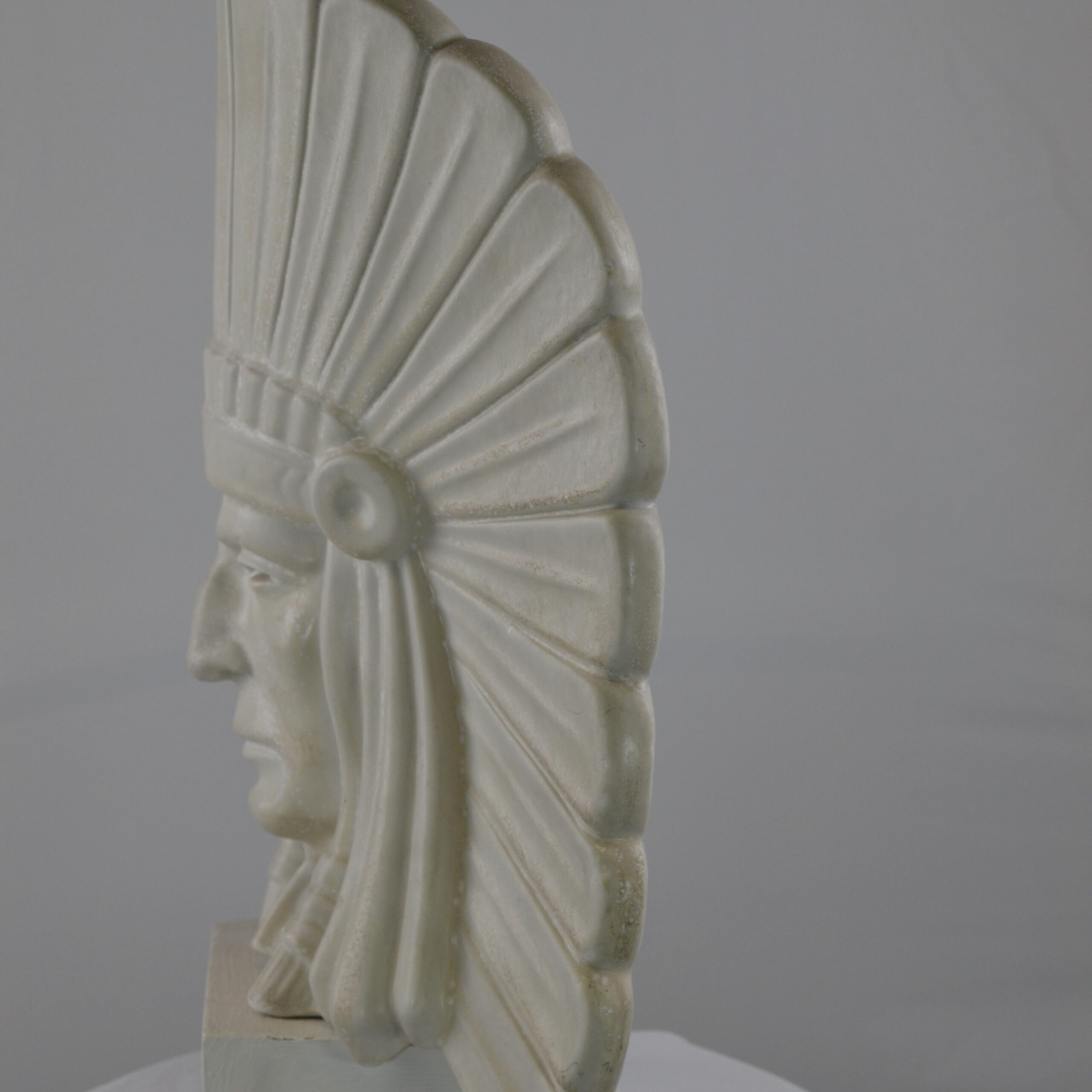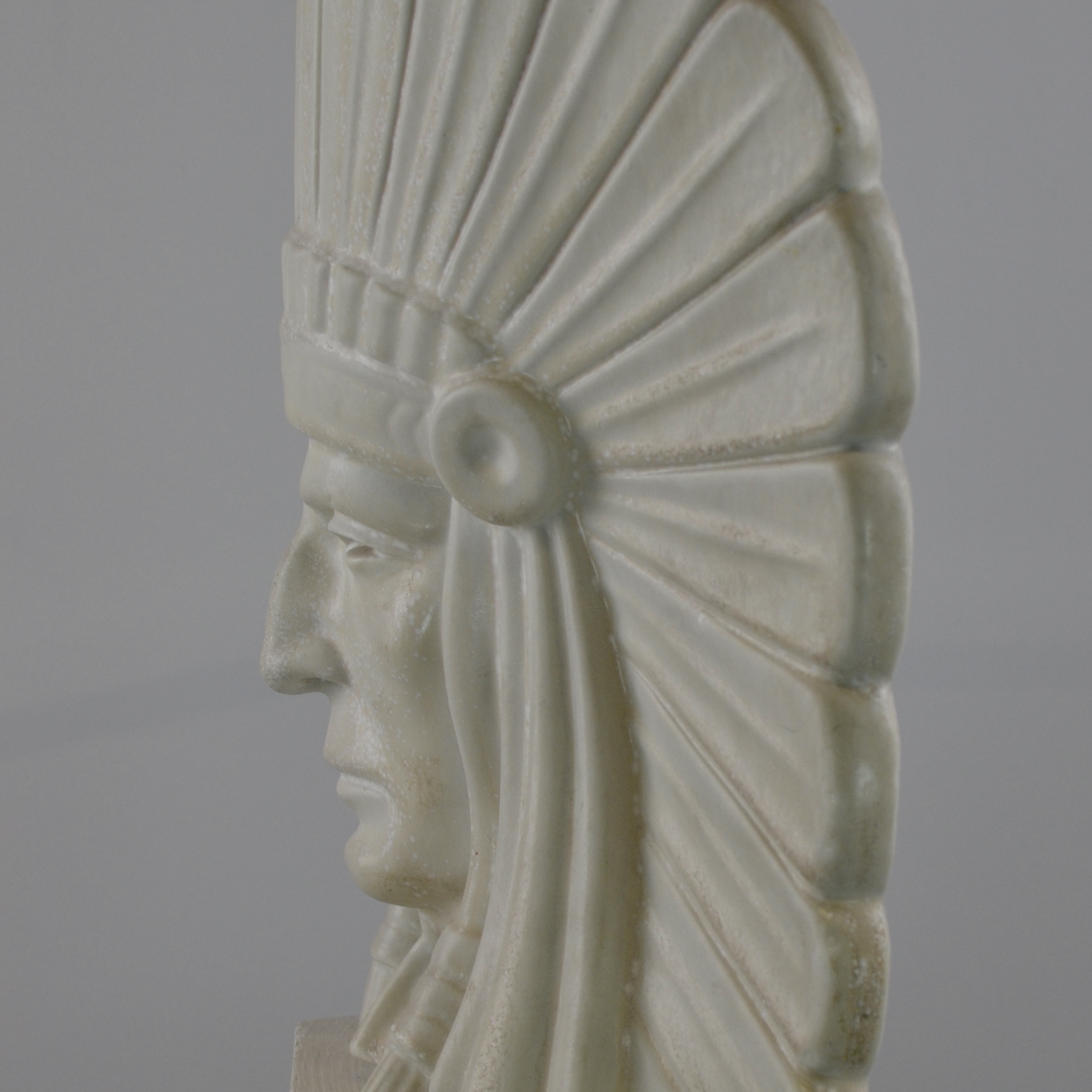 A sculptured head of an American Indian Chief. It is said that this really is a self-portrait of Gunnar Nylund, the artist. It has its original wooden stand . The height is 42 cm without the stand and 46.5 cm with the stand. The sculpture is numbered 20/100. It is signed G.N. and marked Rörstrand. It has great artistic feeling to it.