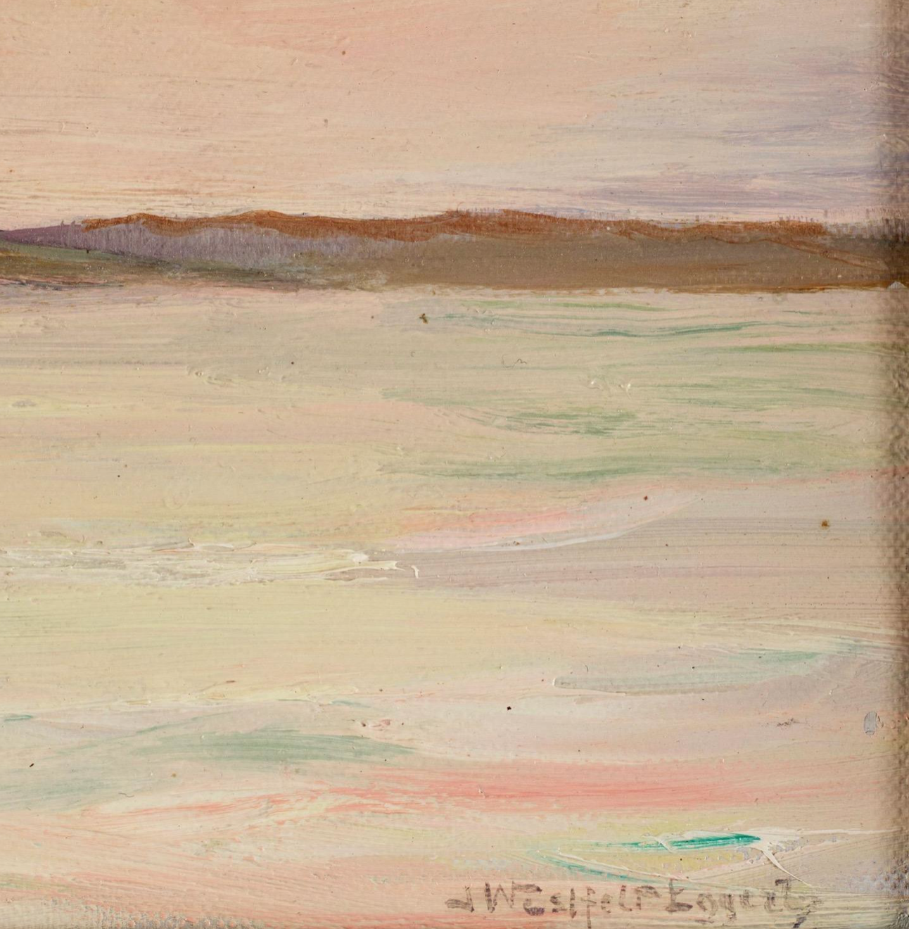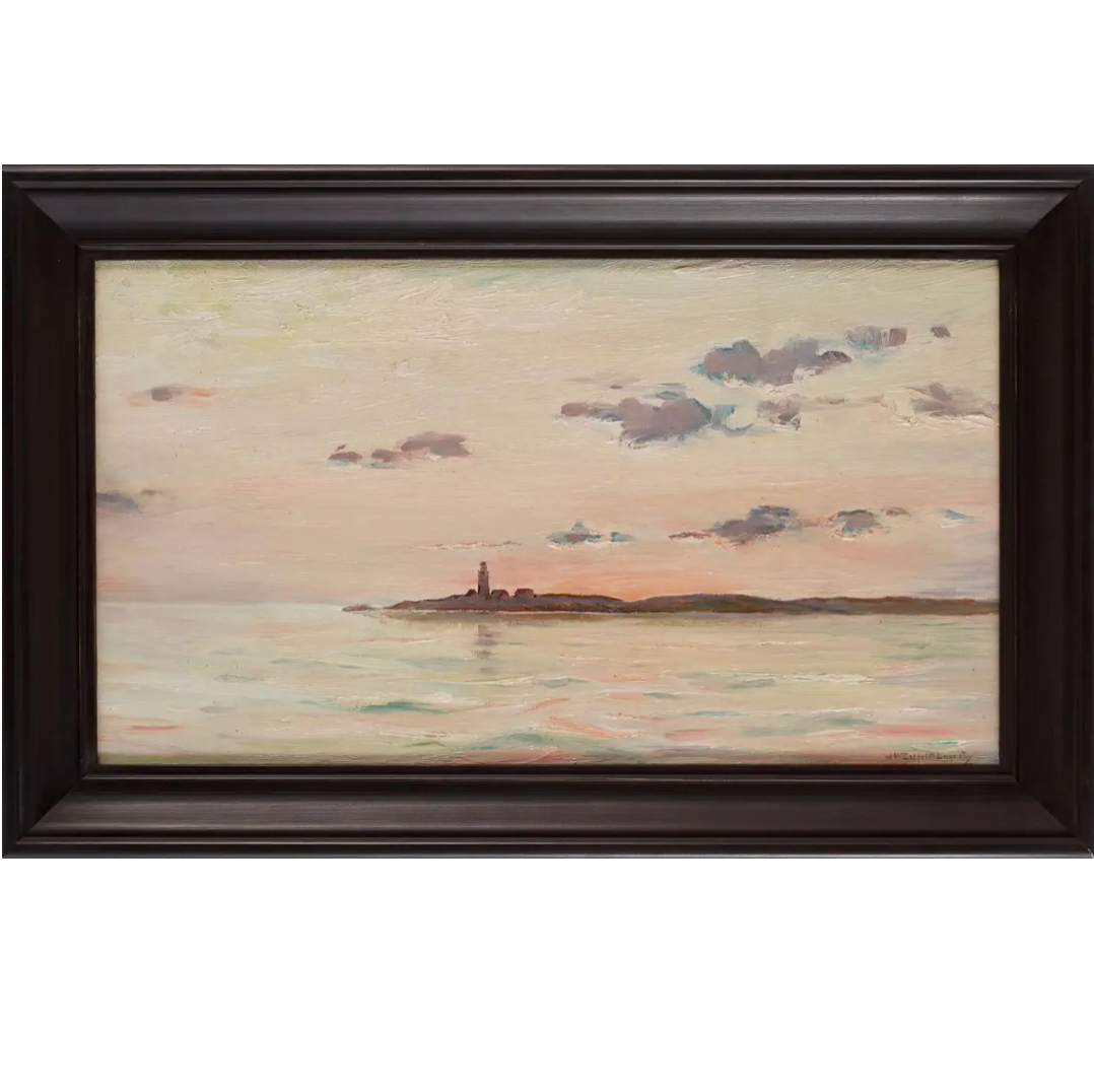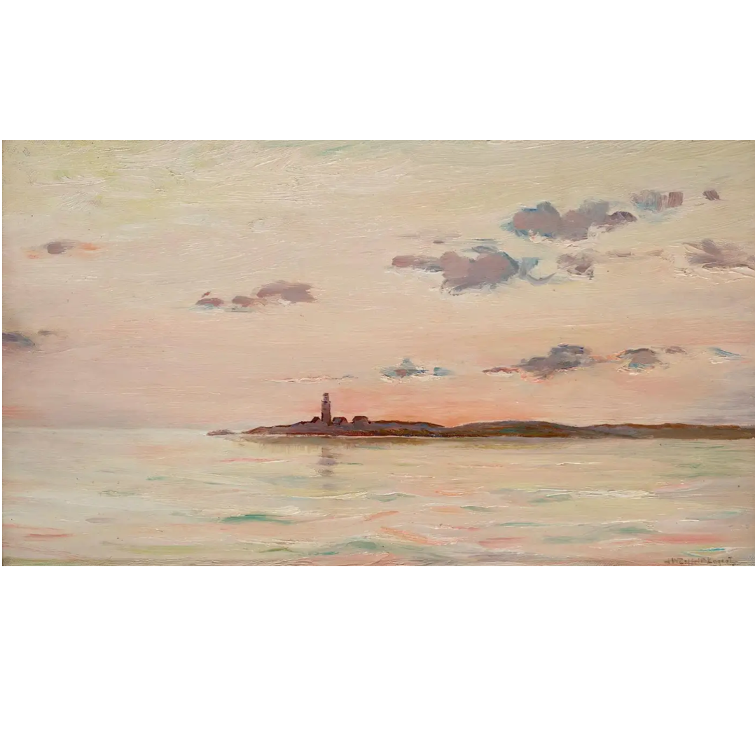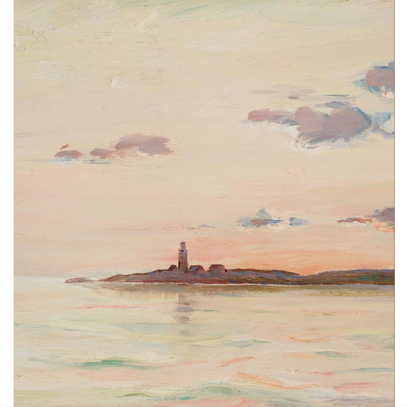 This beautiful painting by the female artist, Ingeborg Westfelt-Eggertz (1855-1936), depicts the sunset outside Smögen on the Swedish west coast looking towards the very beautiful island and nature reserve of Hållö and its lighthouse. The sun is setting just behind the island. It is signed "I. Westfelt-Eggertz" and indistinctly dated, possibly 1893 or 1903. Oil on canvas laid on cardboard.