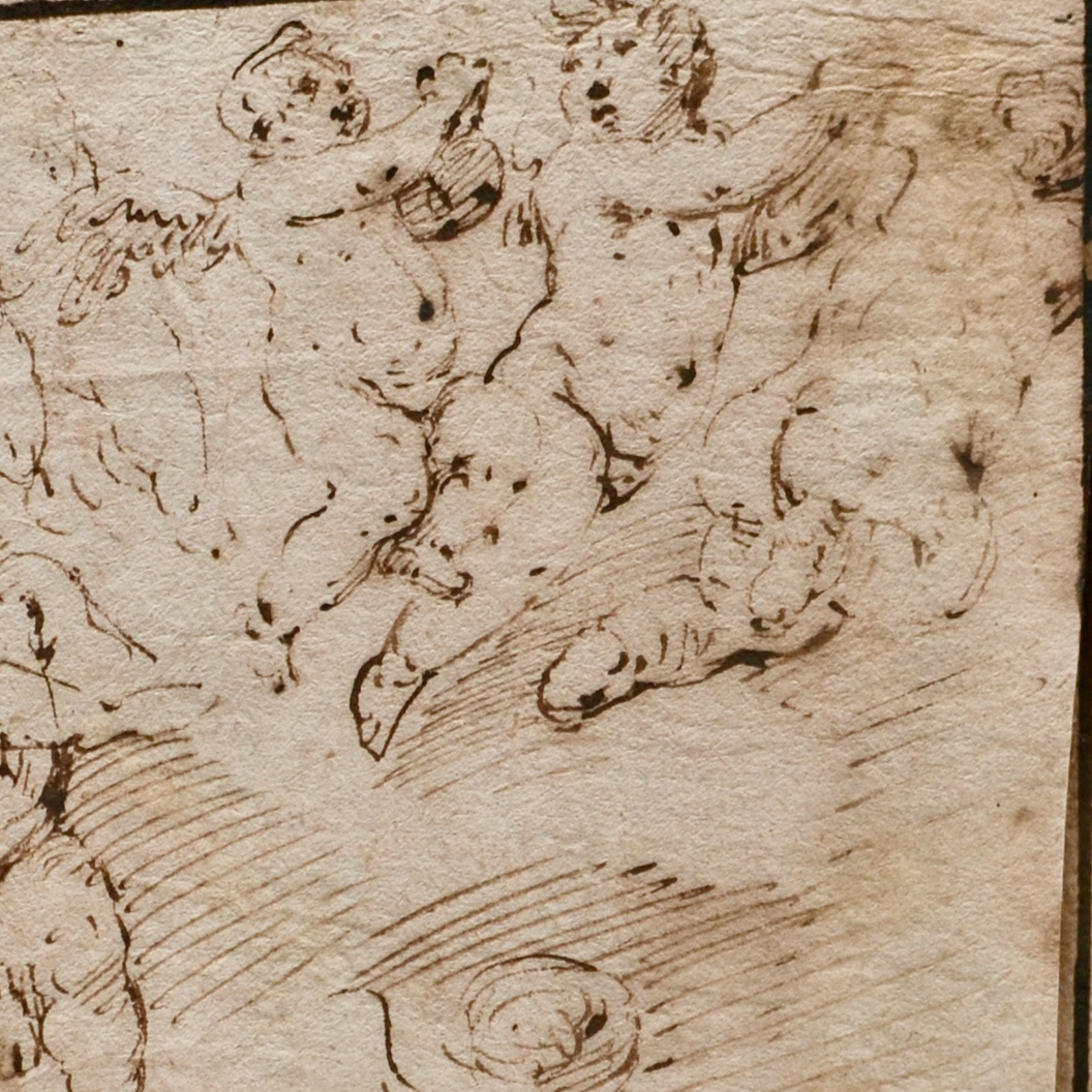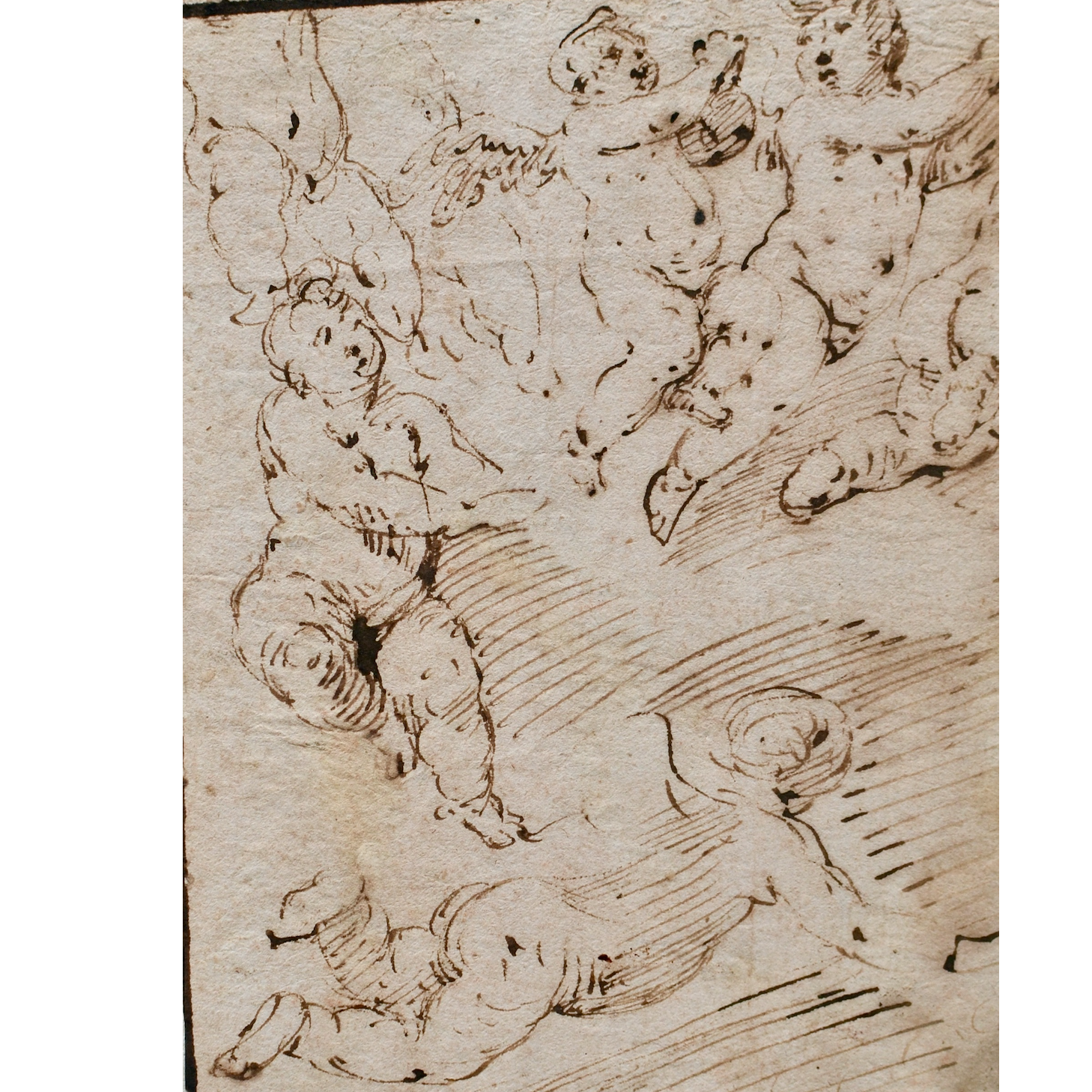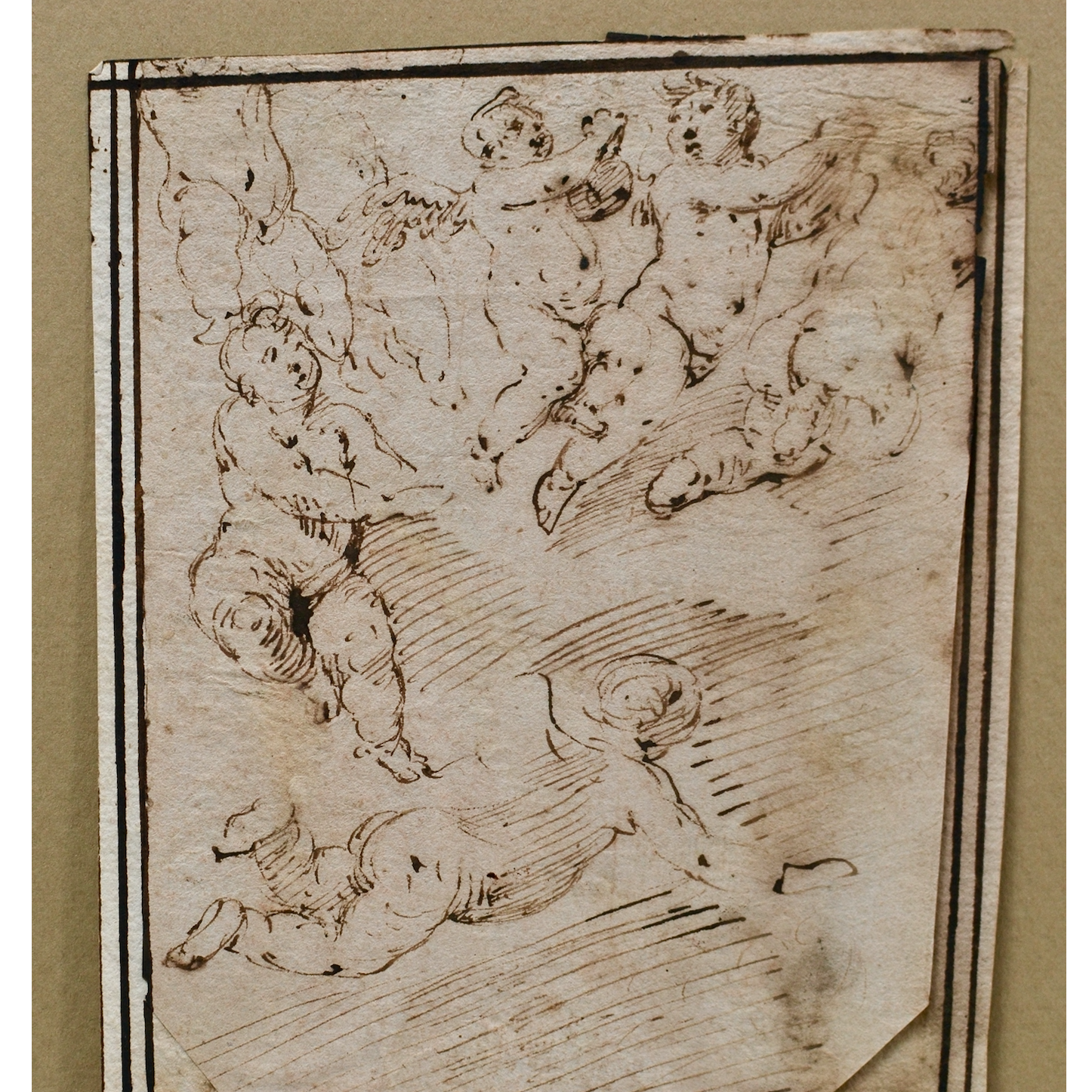 A fine small Italian 17th/18th century sepia ink study of 6 putti in different positions. Paper mounted on paper. A tergo written "Scuola Lombarda".