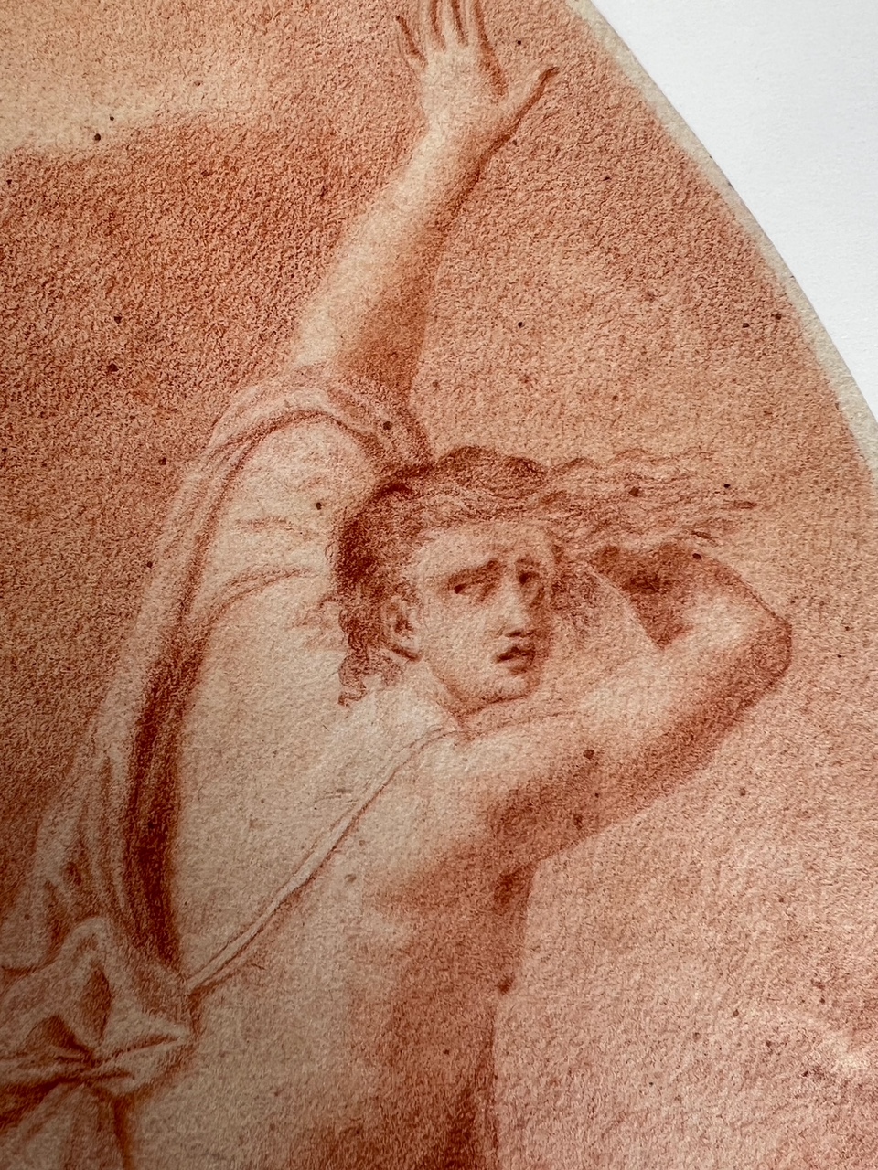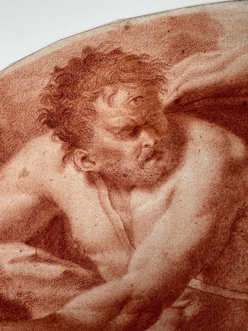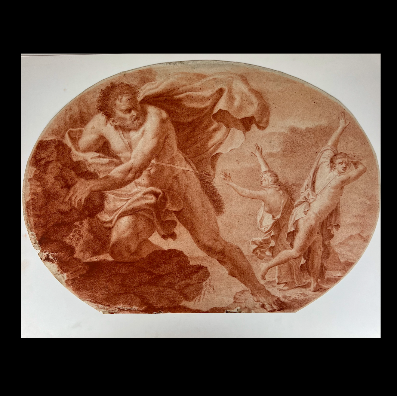 An Italian red chalk drawing depiction on paper, probably 17th or 18th century, illustrating the dramatic scene of Polyphemus hurling a boulder at Acis and Galatea. Attributed to an unidentified, probably Italian master, the composition portrays a narrative from ancient Greek mythology where the jealous giant cyclops Polyphemus, in a fit of rage, kills Acis by crushing him with a massive rock. This piece seems to draw inspiration from Annibale Carracci's renowned ceiling frescoes in the Palazzo Farnese, Rome, specifically the "Loves of the Gods" series painted circa 1597–1601. One particular fresco in this series depicts Polyphemus in the act of throwing a rock at Acis and Galatea, suggesting that the artist of this drawing may have been influenced by Carracci's interpretation. While there are notable differences, the compositional similarities indicate a study to the earlier masterpiece. Throughout the centuries, numerous artists visited the Farnese Gallery to study and draw inspiration from Carracci's work, underscoring its significant impact on subsequent art.