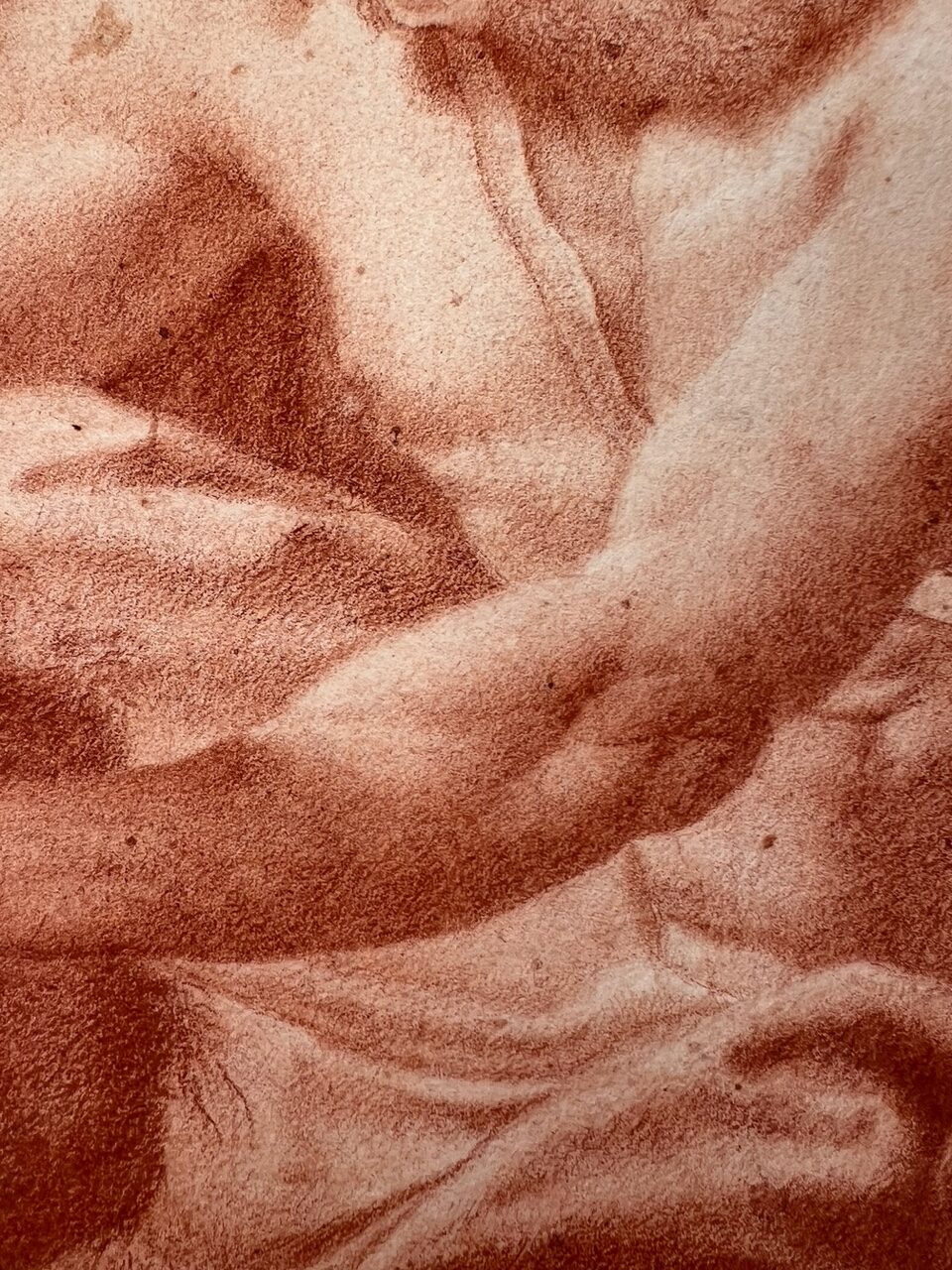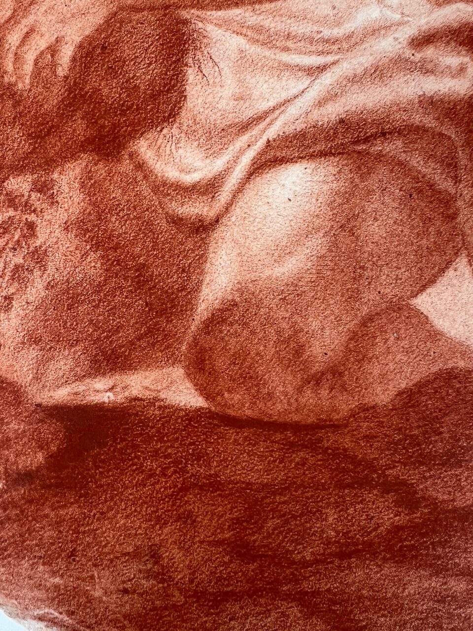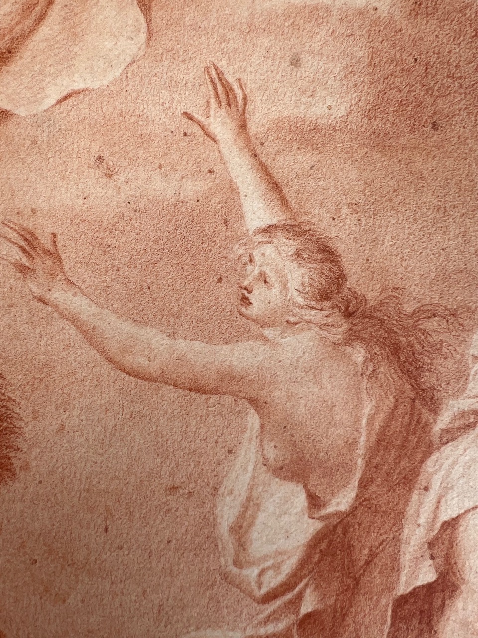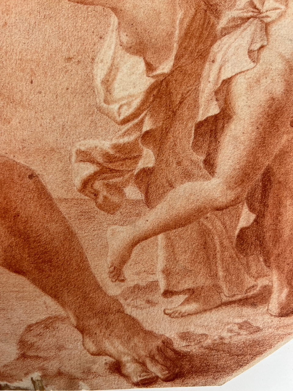 An Italian red chalk drawing depiction on paper, probably 17th or 18th century, illustrating the dramatic scene of Polyphemus hurling a boulder at Acis and Galatea. Attributed to an unidentified, probably Italian master, the composition portrays a narrative from ancient Greek mythology where the jealous giant cyclops Polyphemus, in a fit of rage, kills Acis by crushing him with a massive rock. This piece seems to draw inspiration from Annibale Carracci's renowned ceiling frescoes in the Palazzo Farnese, Rome, specifically the "Loves of the Gods" series painted circa 1597–1601. One particular fresco in this series depicts Polyphemus in the act of throwing a rock at Acis and Galatea, suggesting that the artist of this drawing may have been influenced by Carracci's interpretation. While there are notable differences, the compositional similarities indicate a study to the earlier masterpiece. Throughout the centuries, numerous artists visited the Farnese Gallery to study and draw inspiration from Carracci's work, underscoring its significant impact on subsequent art.