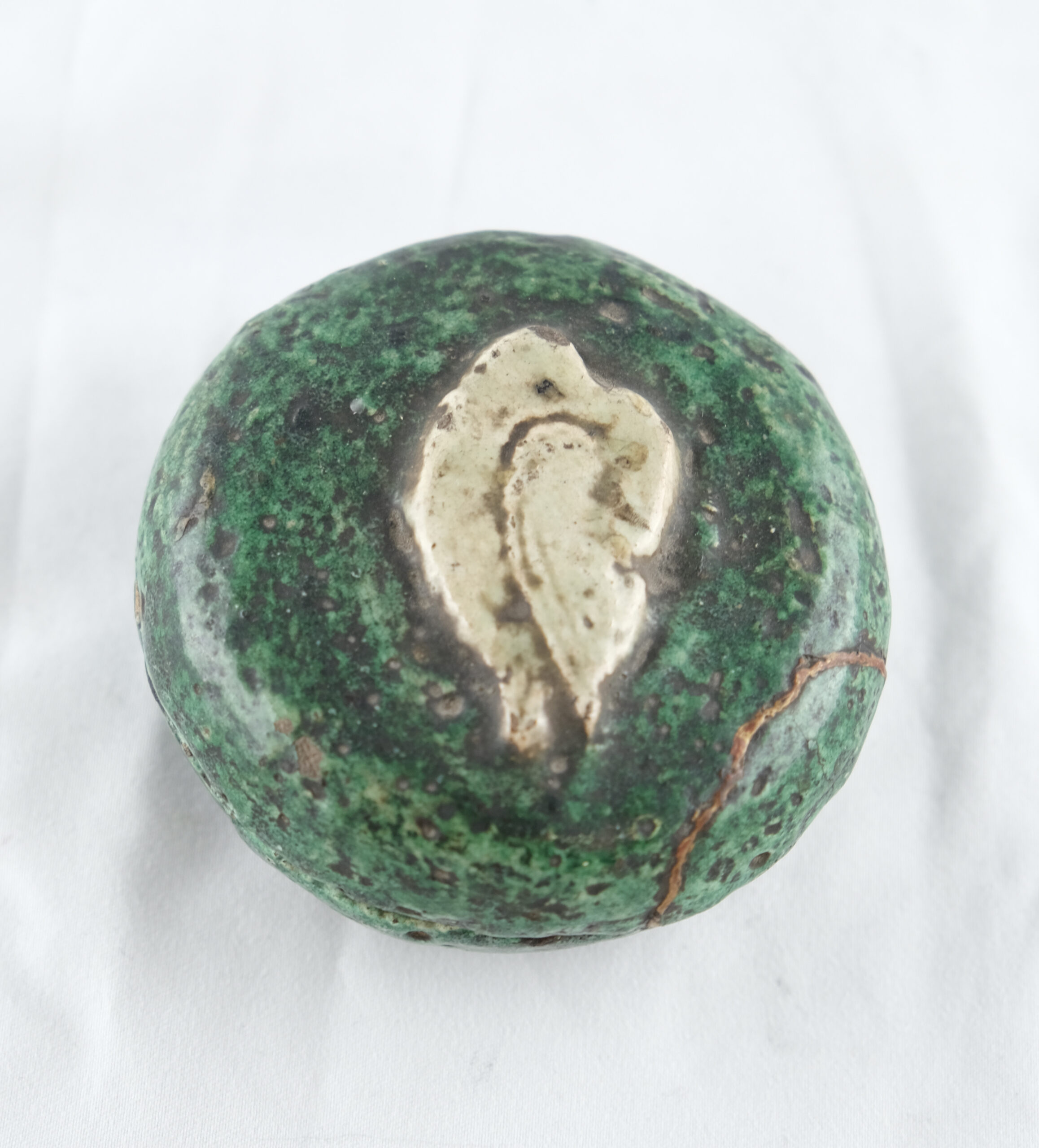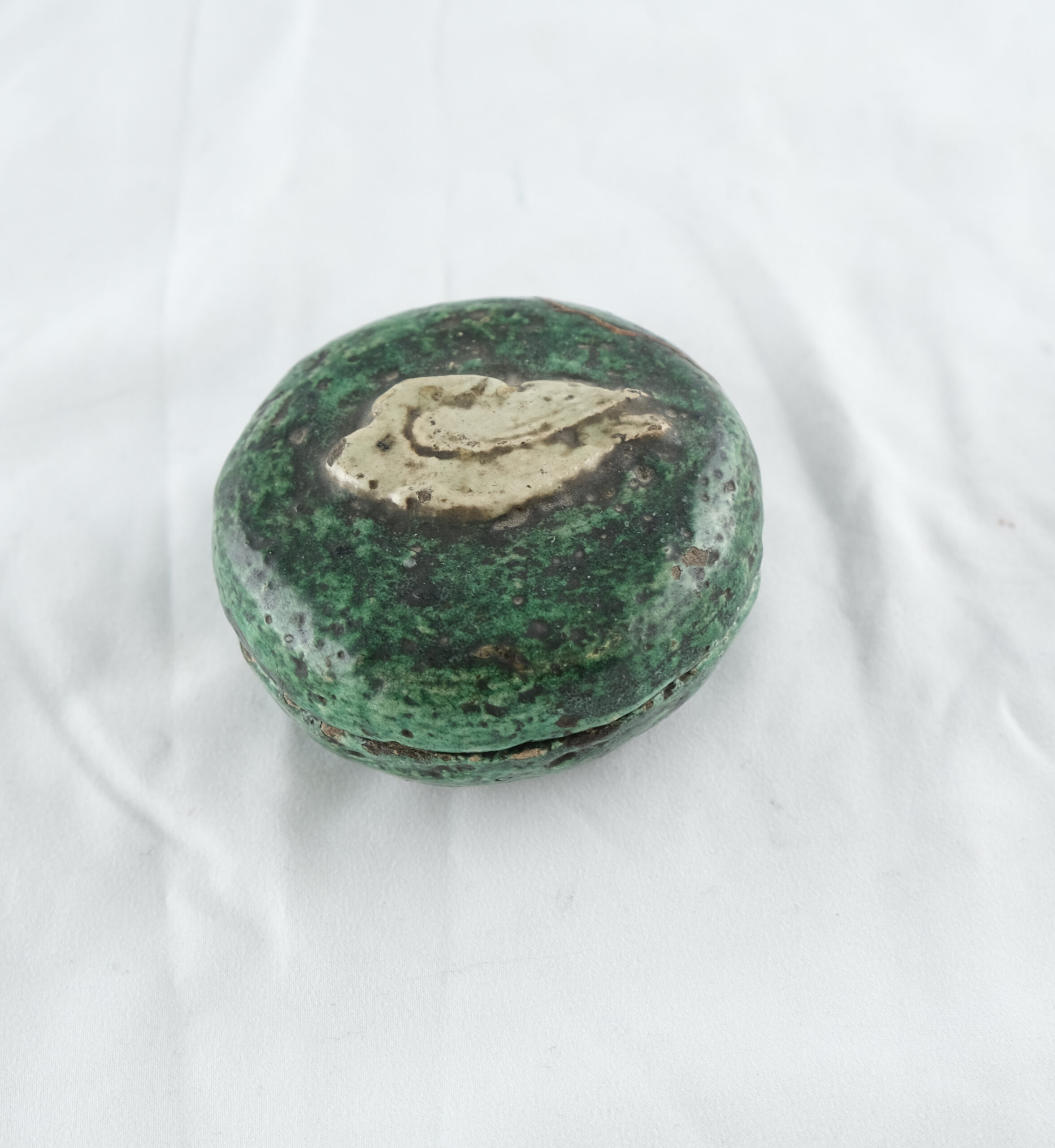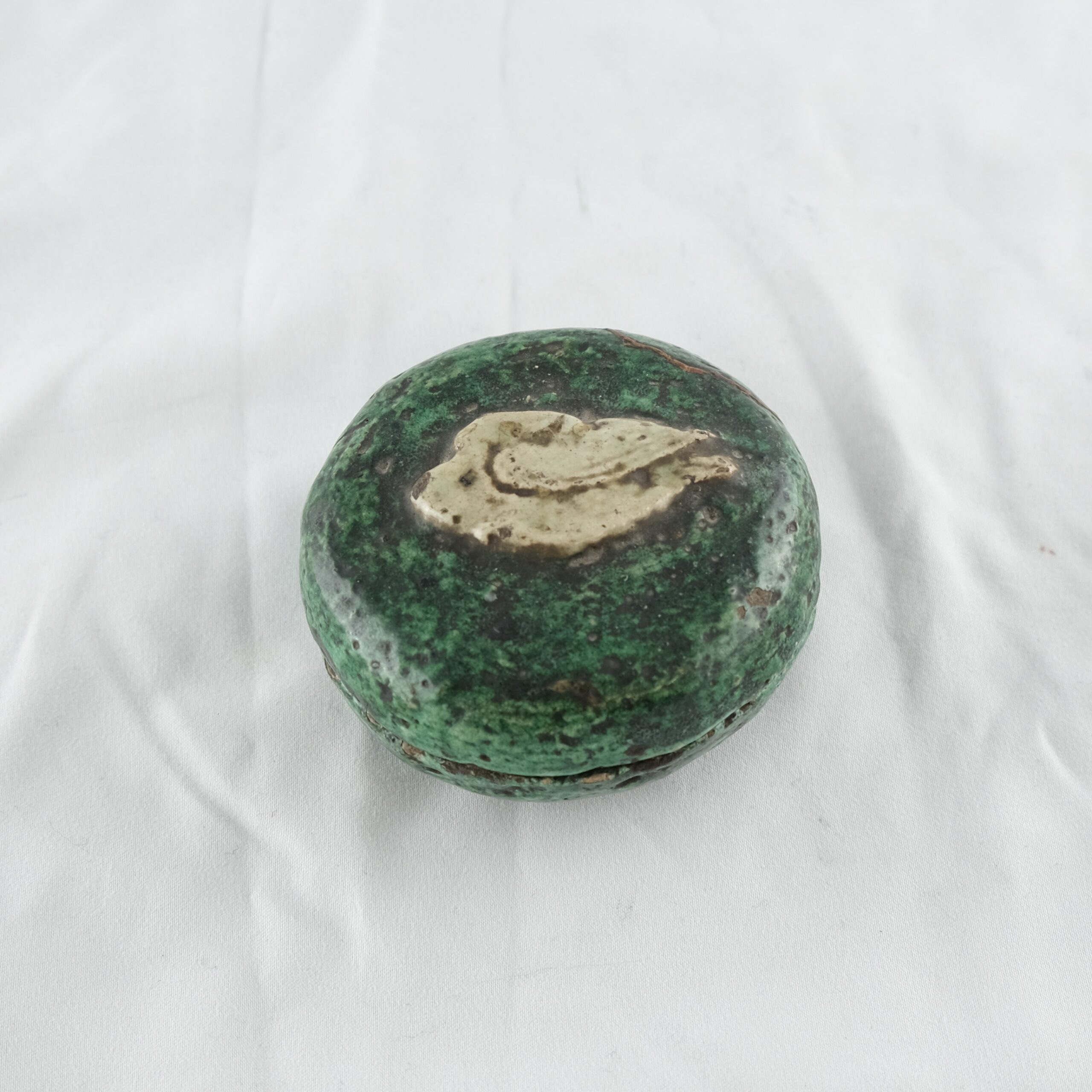 A small box with lid. Earthenware glazes in green and white colours. Mid 19th c. The lid has a motive of a stylized swan.