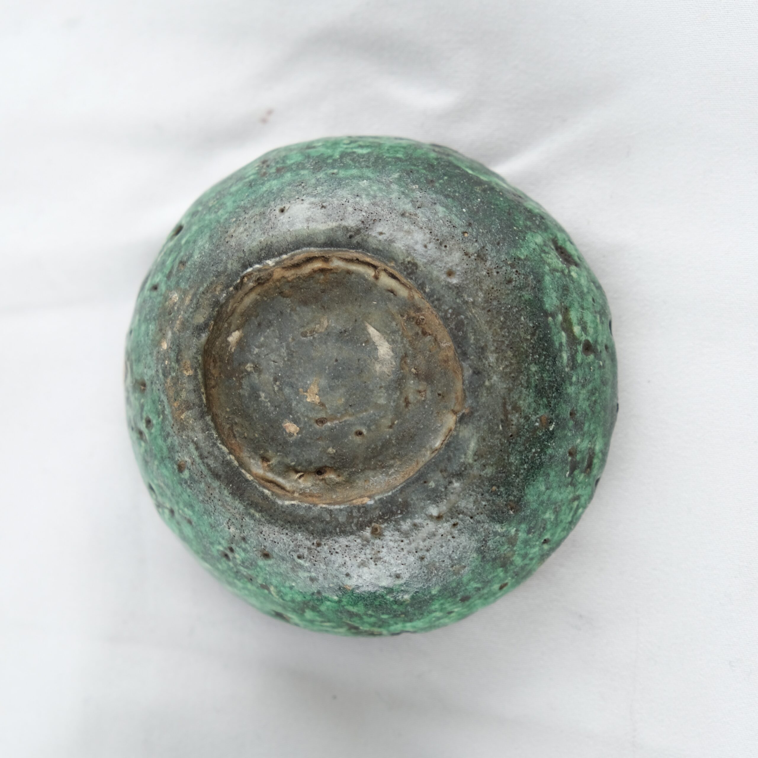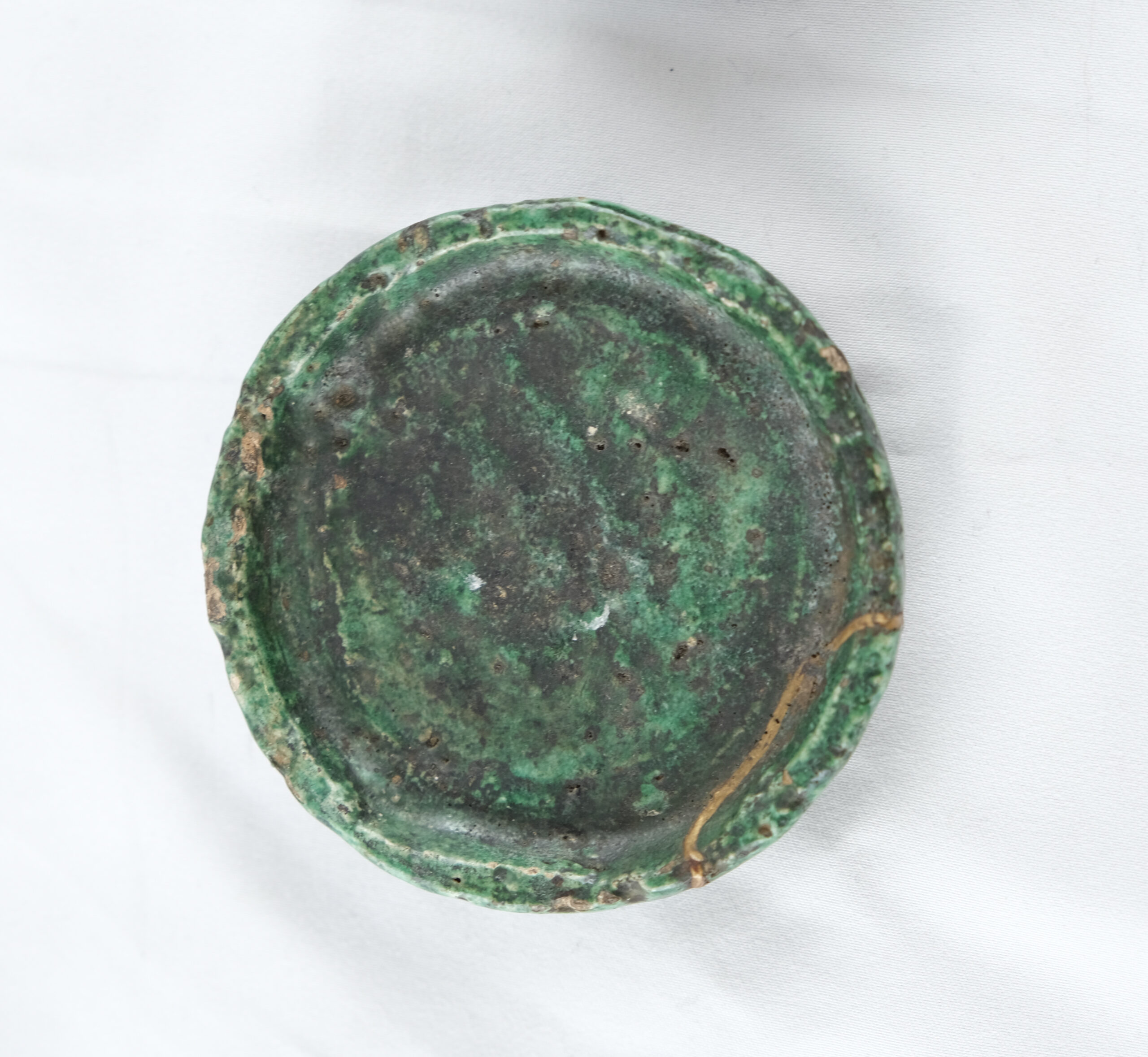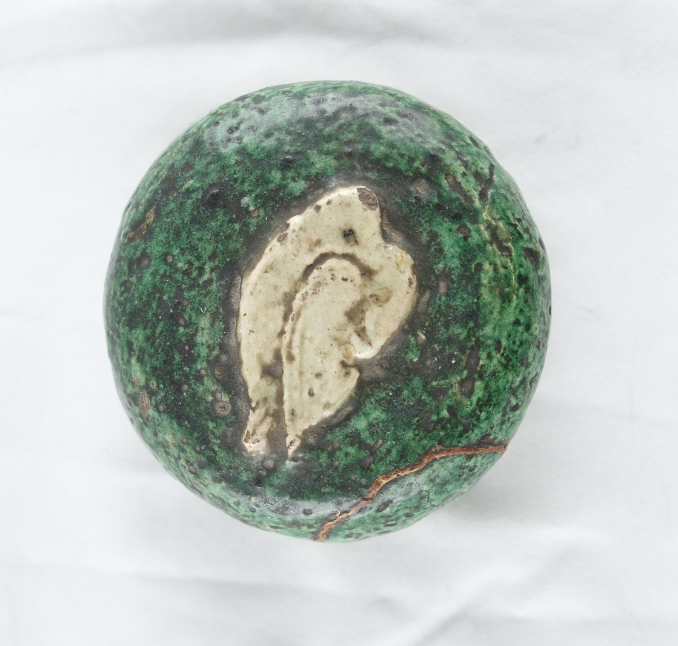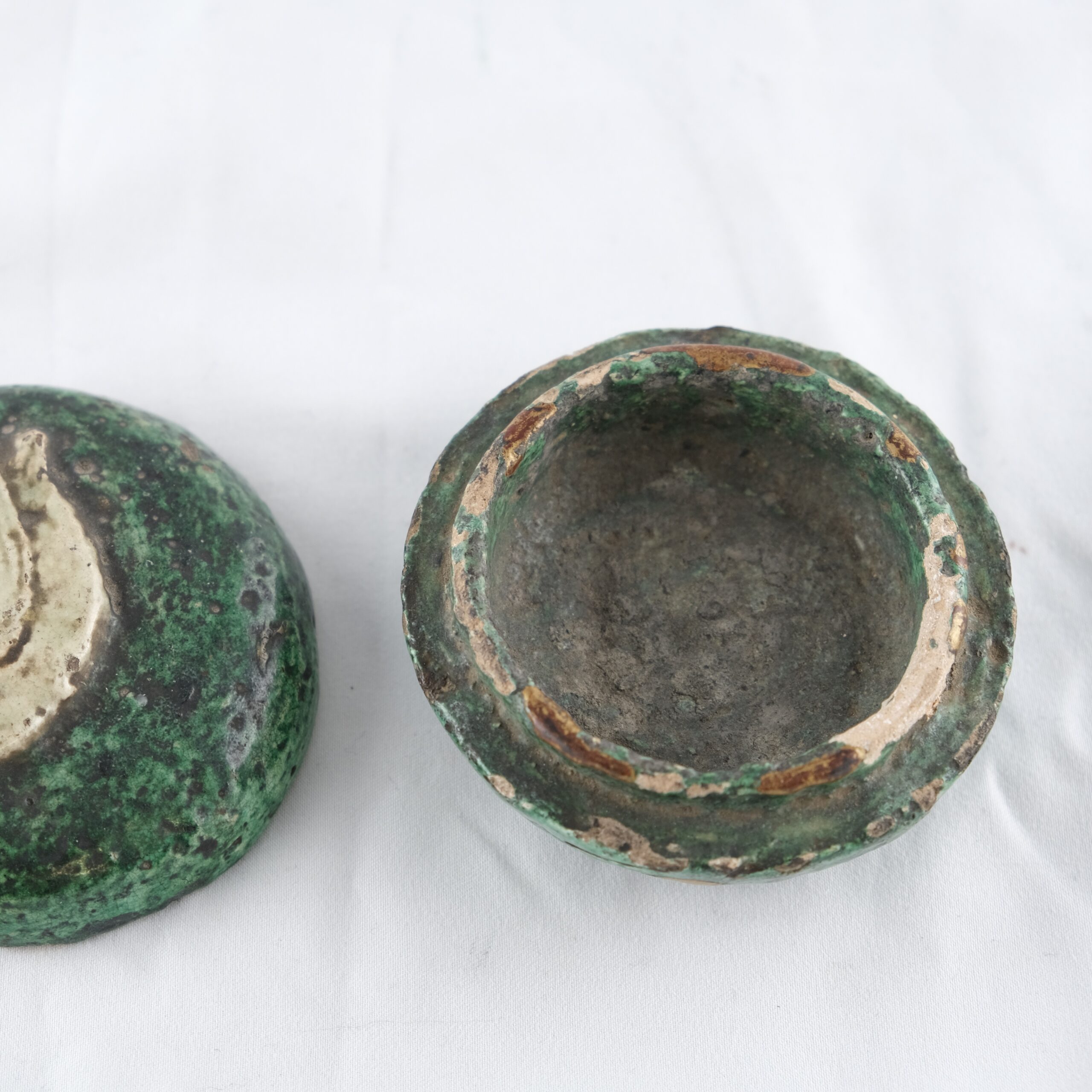 A small box with lid. Earthenware glazes in green and white colours. Mid 19th c. The lid has a motive of a stylized swan.
