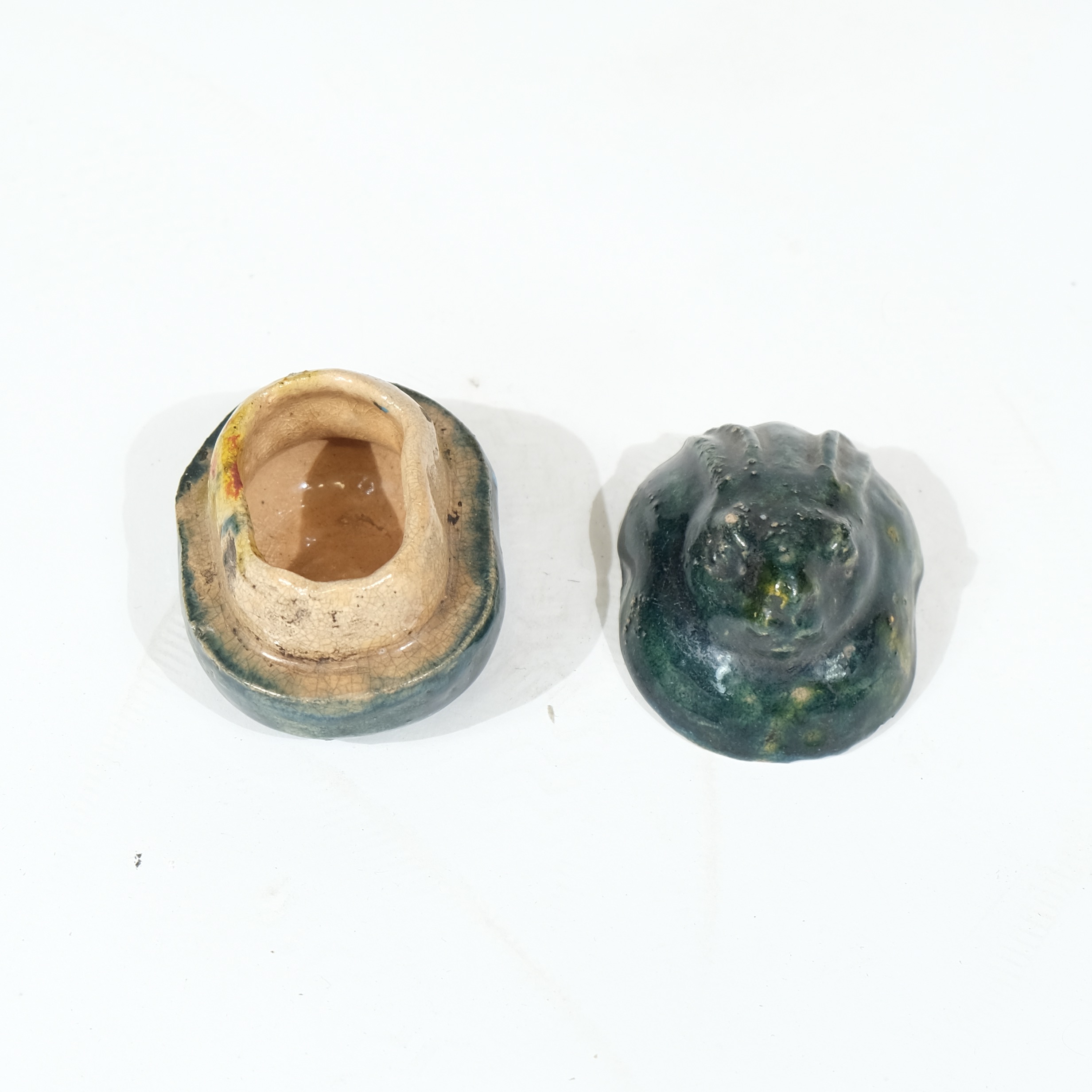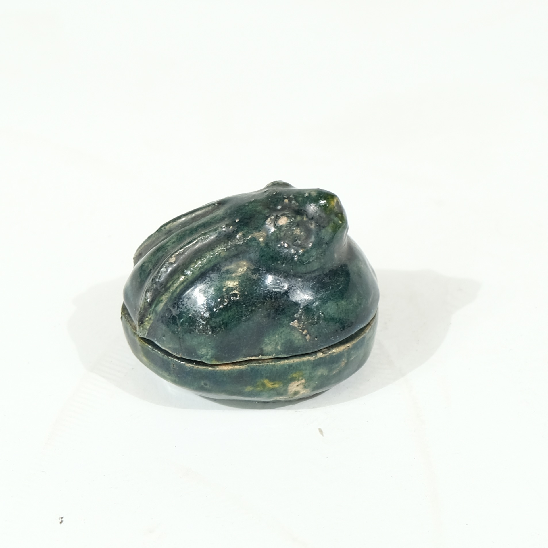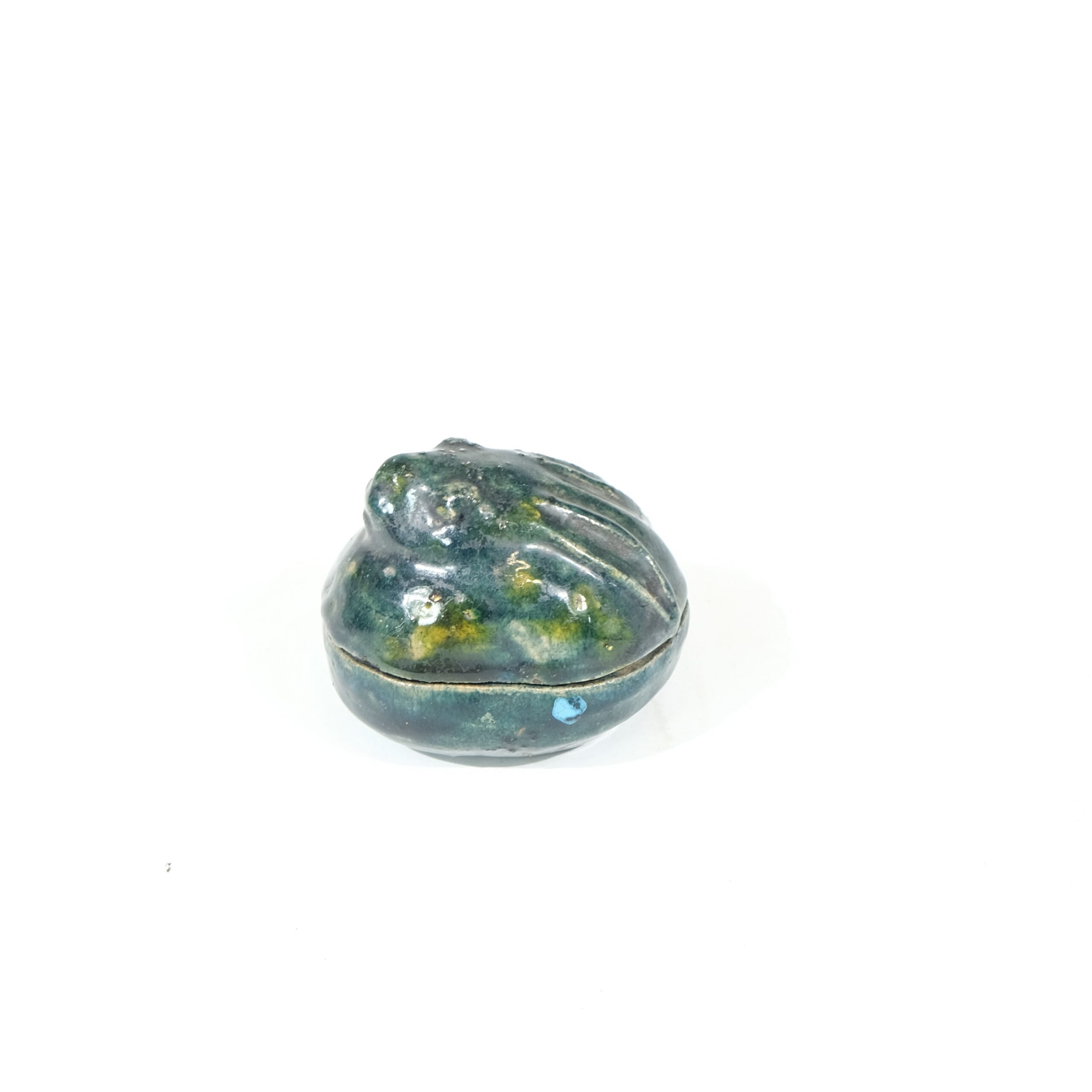 A charming small box with lid, Japanese and made in the mid 19th c in the shape of a rabbit. The box is glazed with a turquoise color.