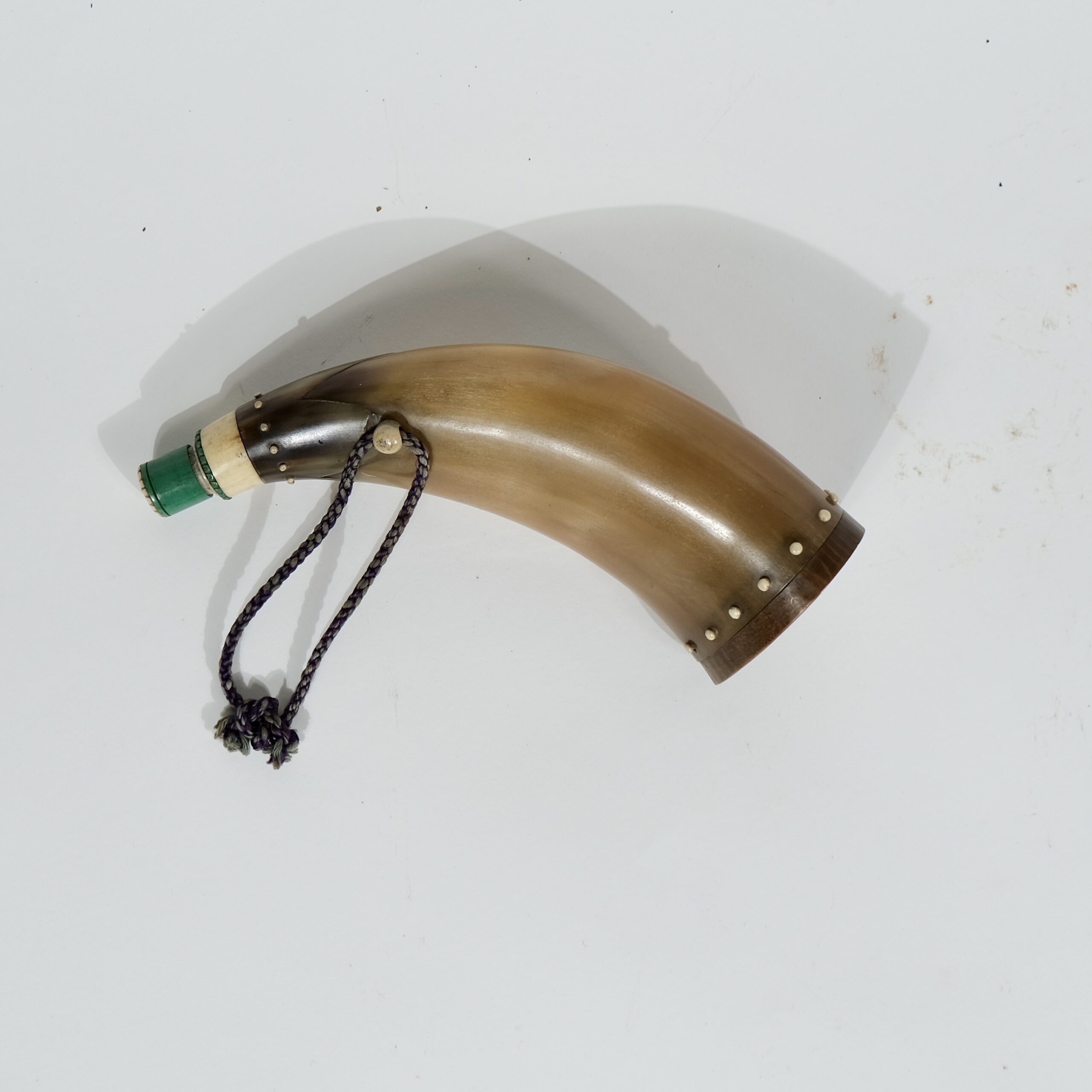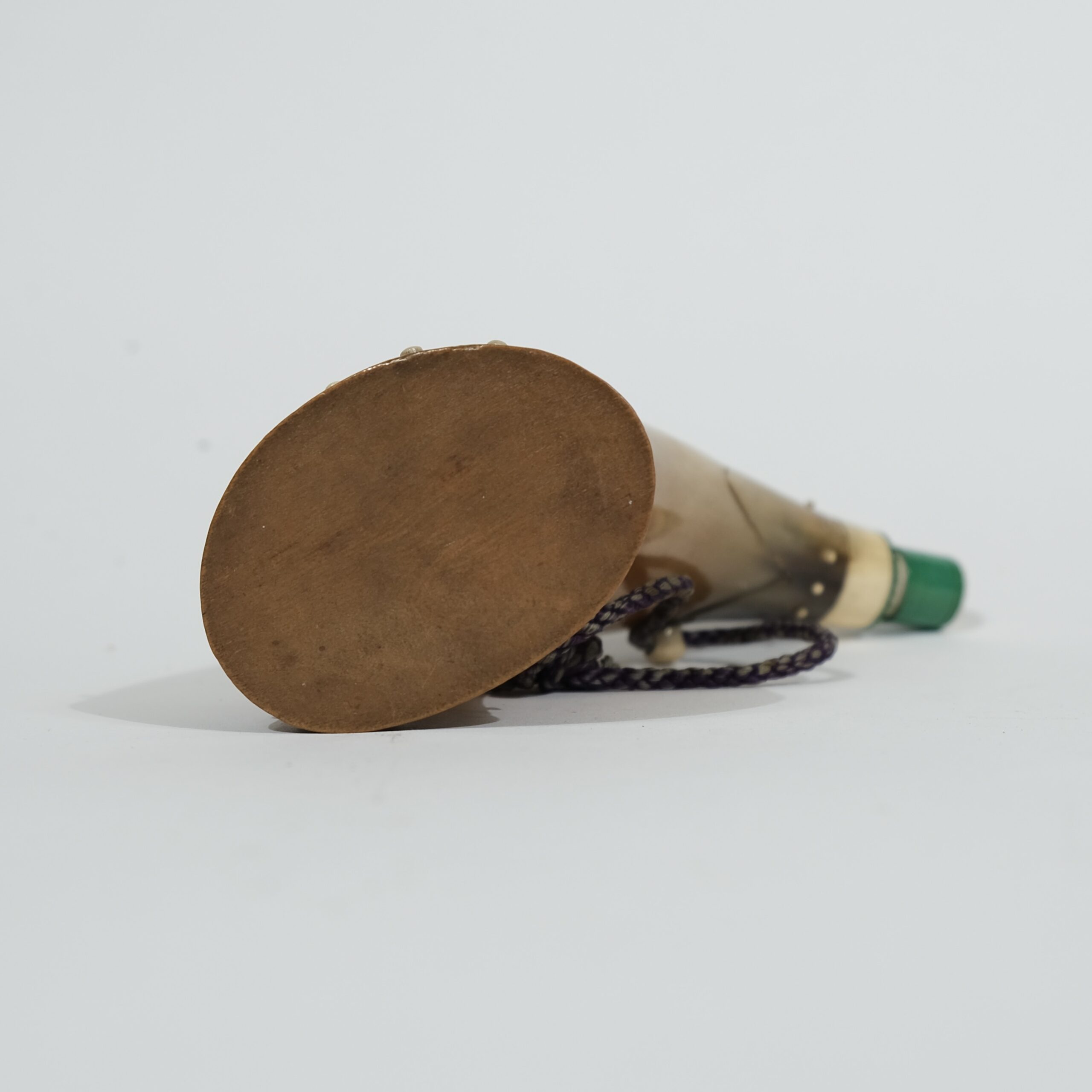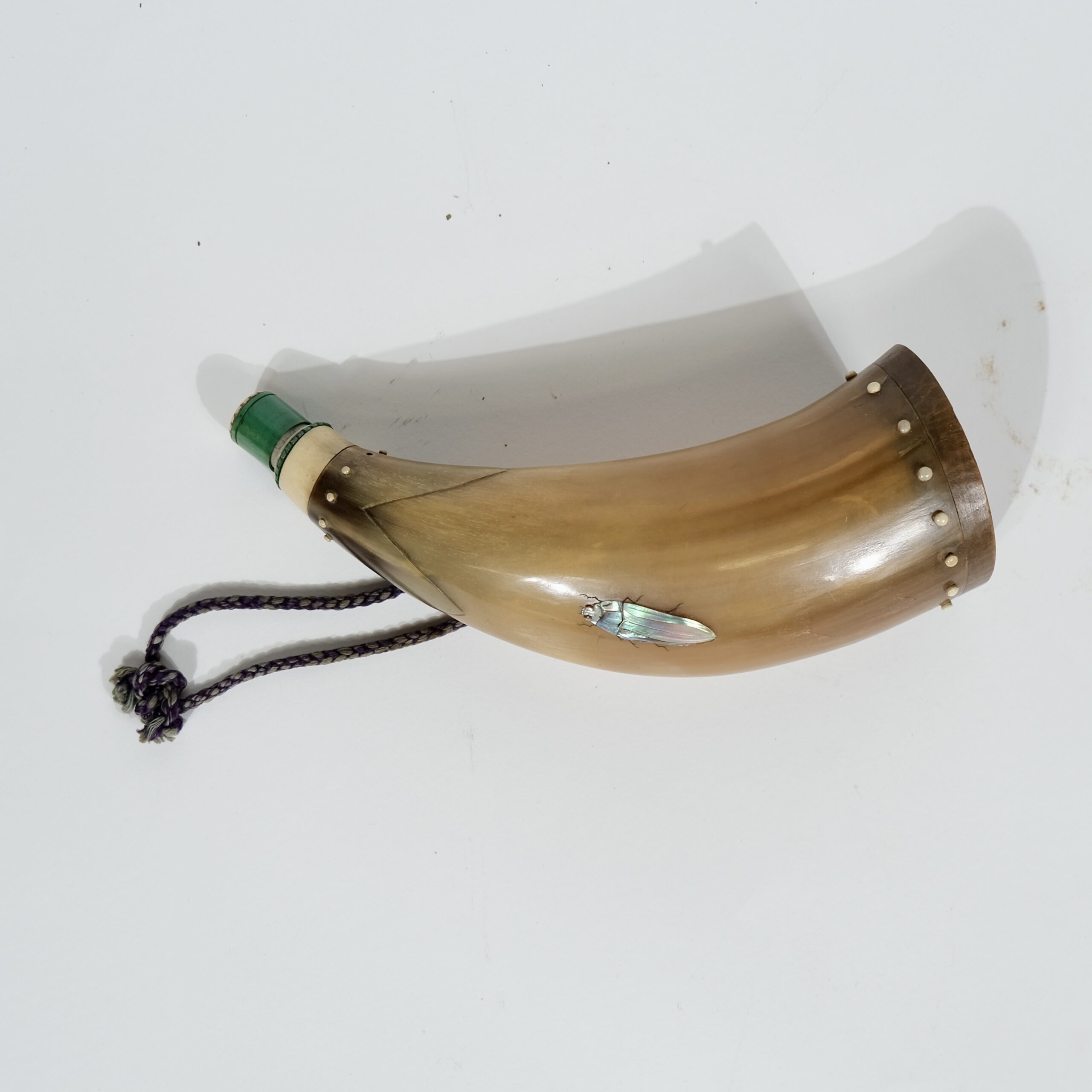 A fantastic Japanese powder horn made of horn , bone and mother of pearl. On the horn there is inlay of a grasshopper. A proof of the Japanese expertise in craftsmanship