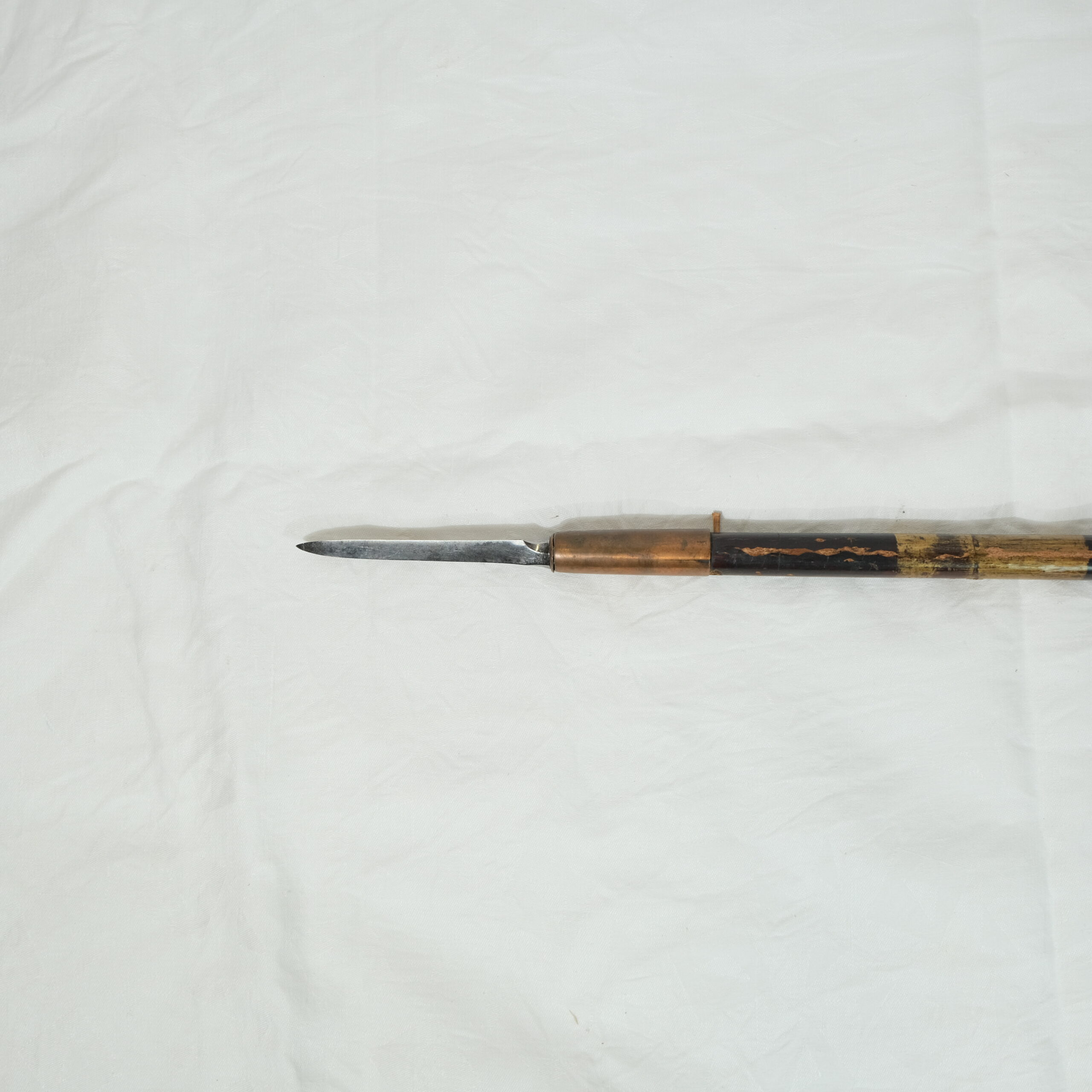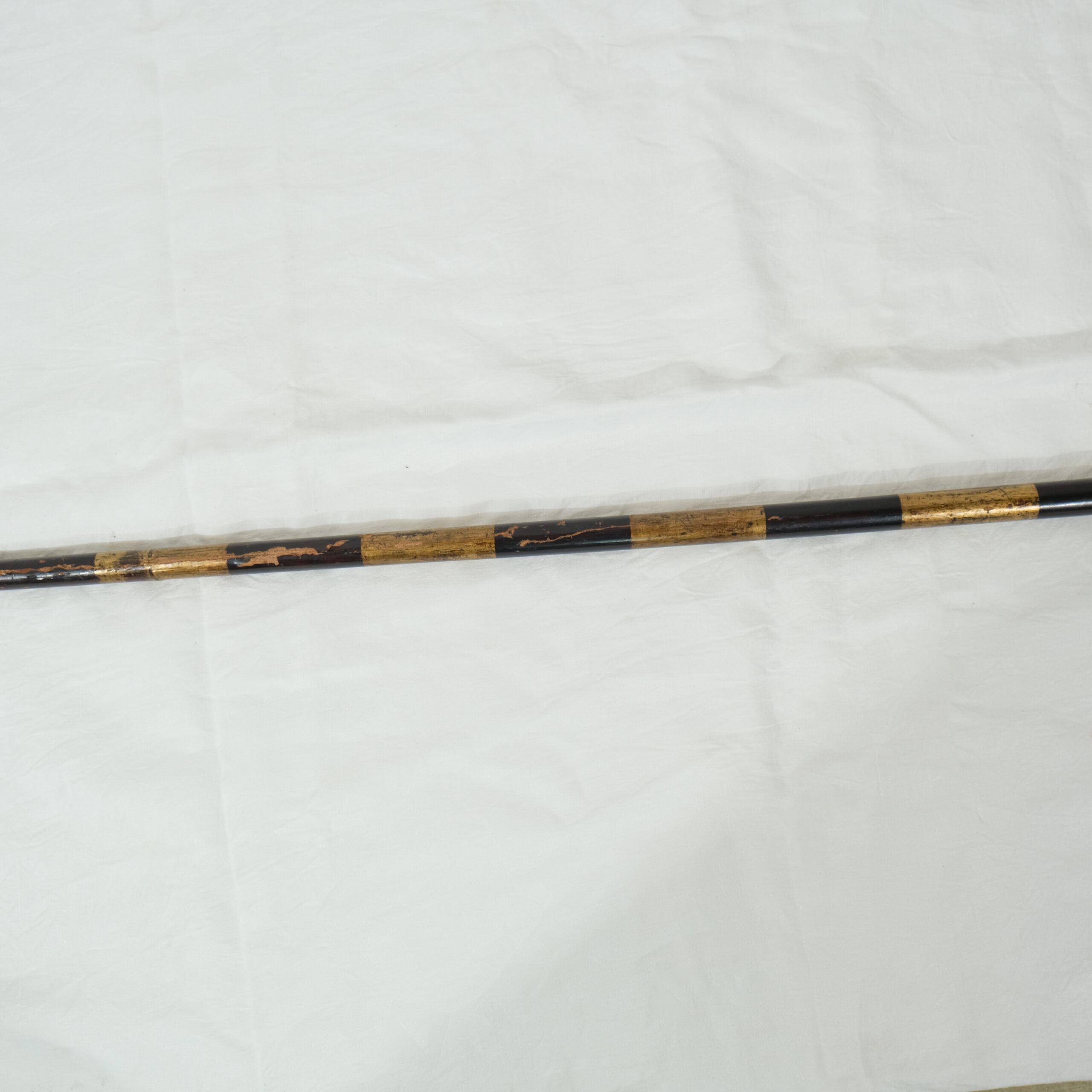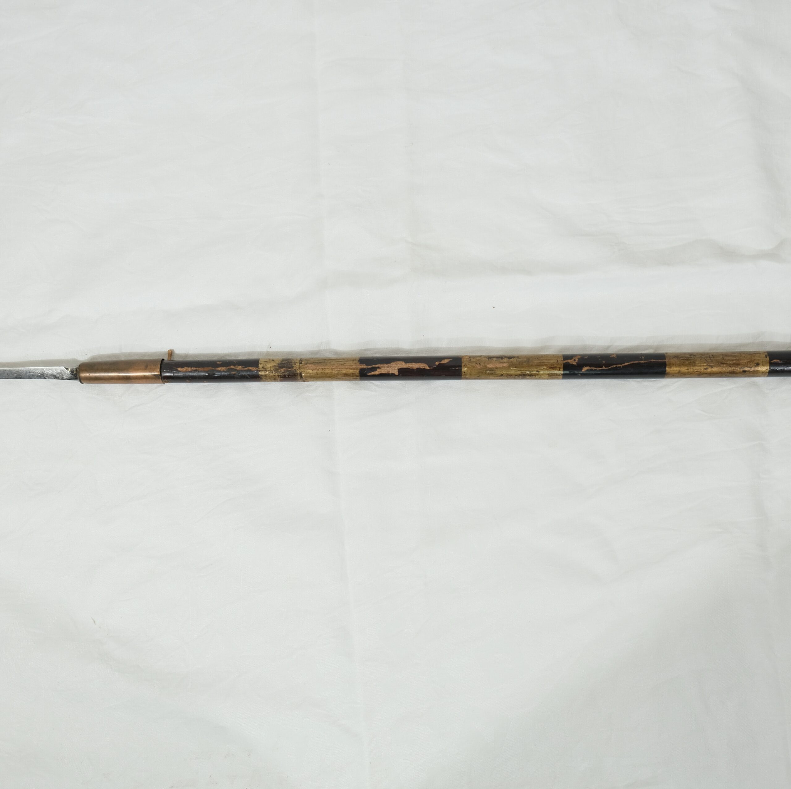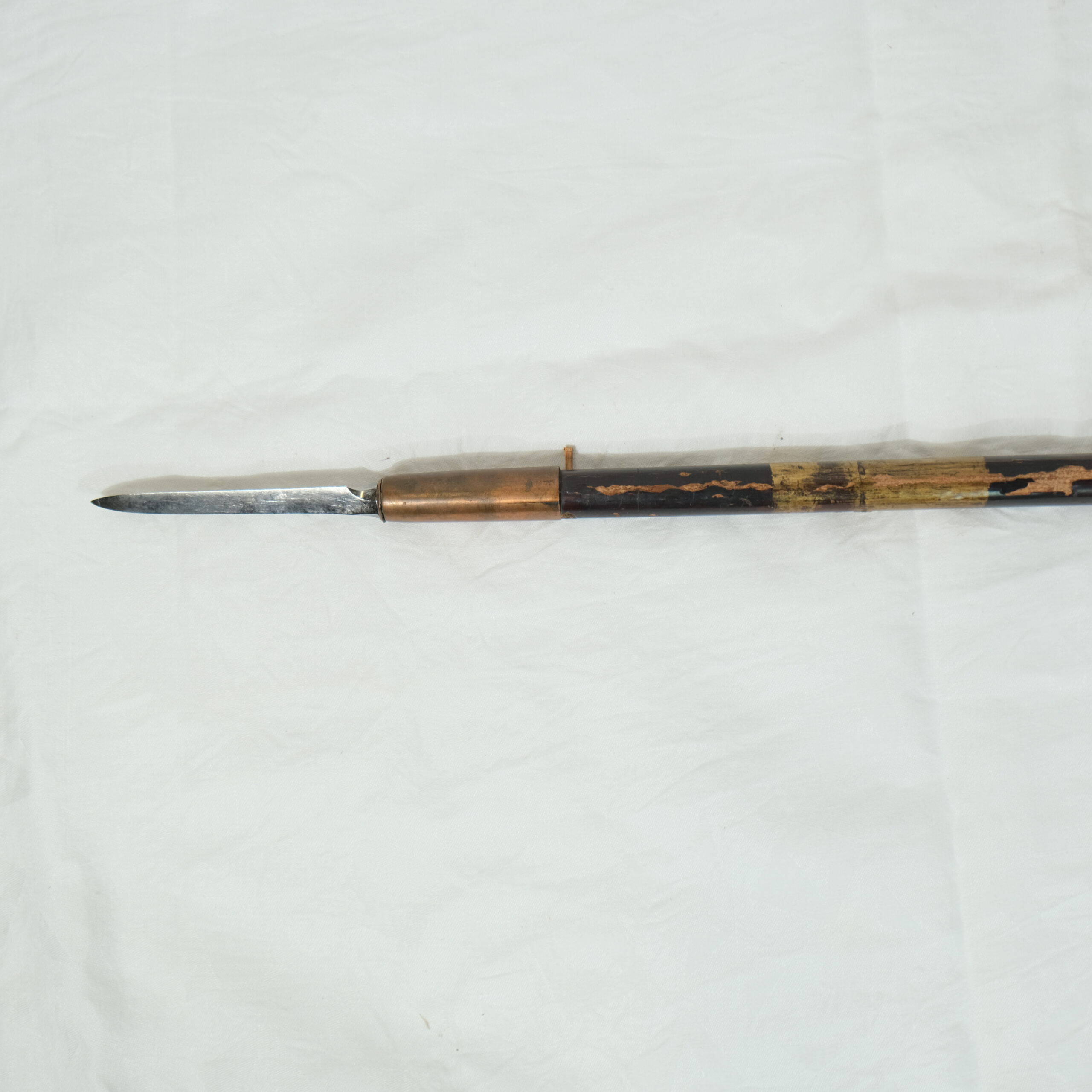 A Japanese long spear. Partly lacquered wood with a forged spearhead which bears signature. The wooden pin is decorated with lacquer in black and gold.