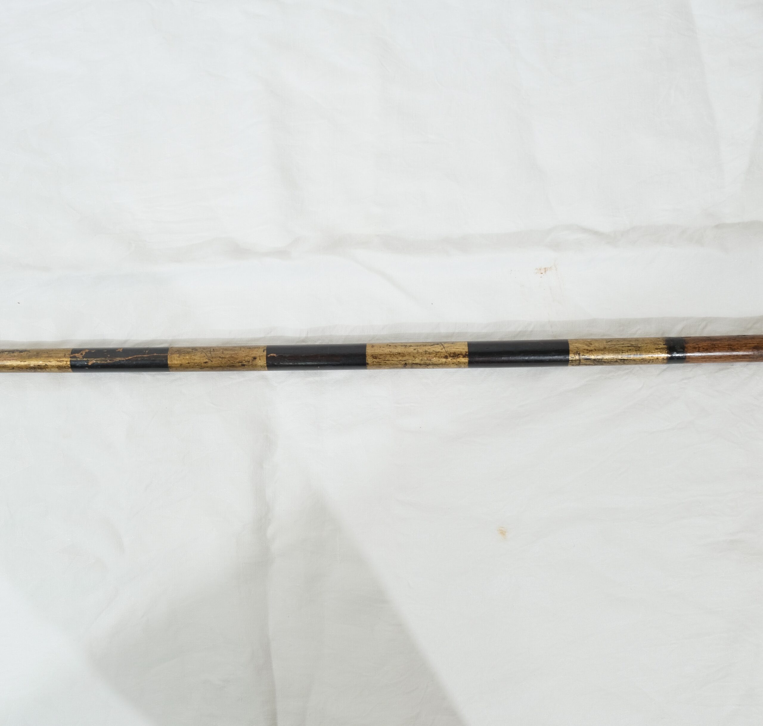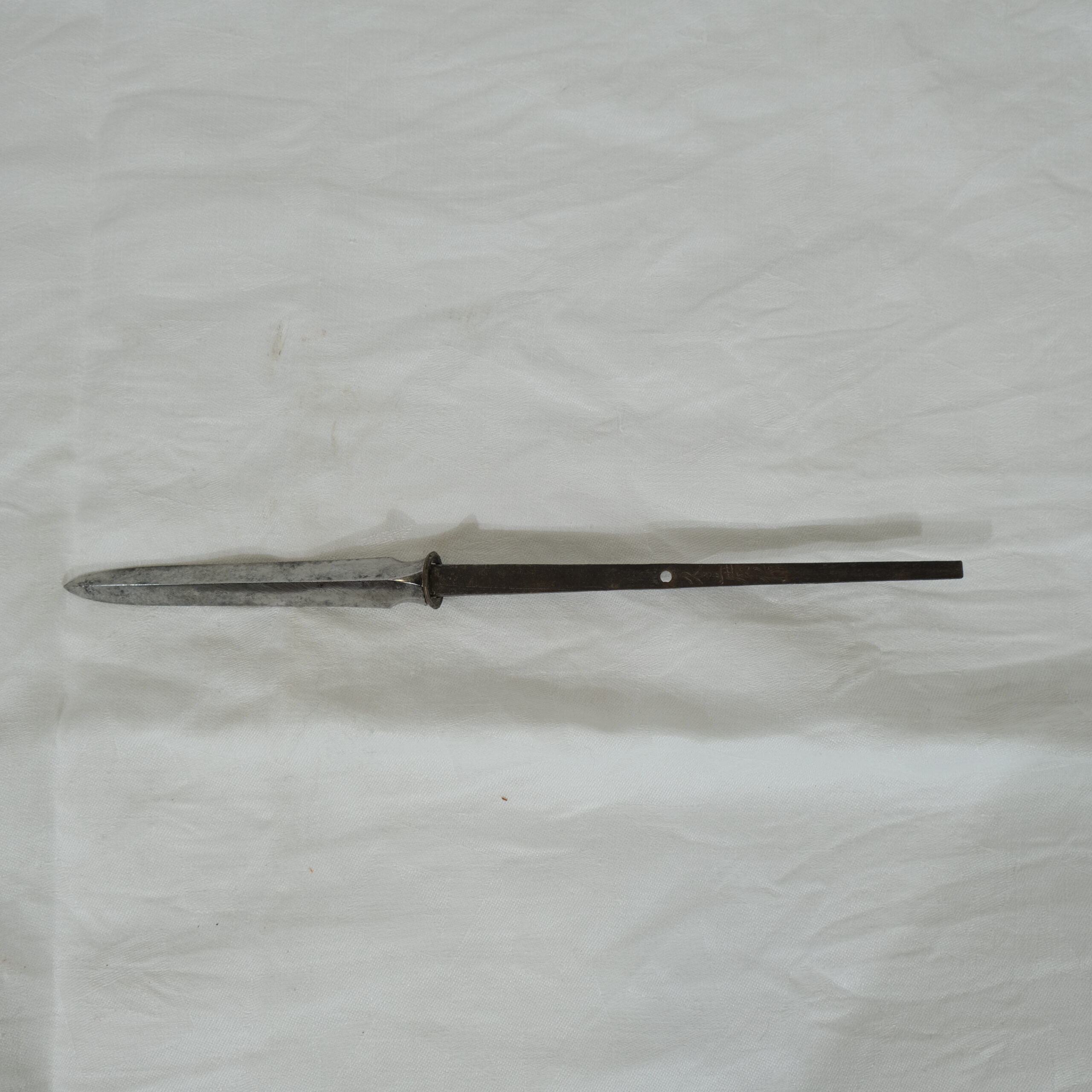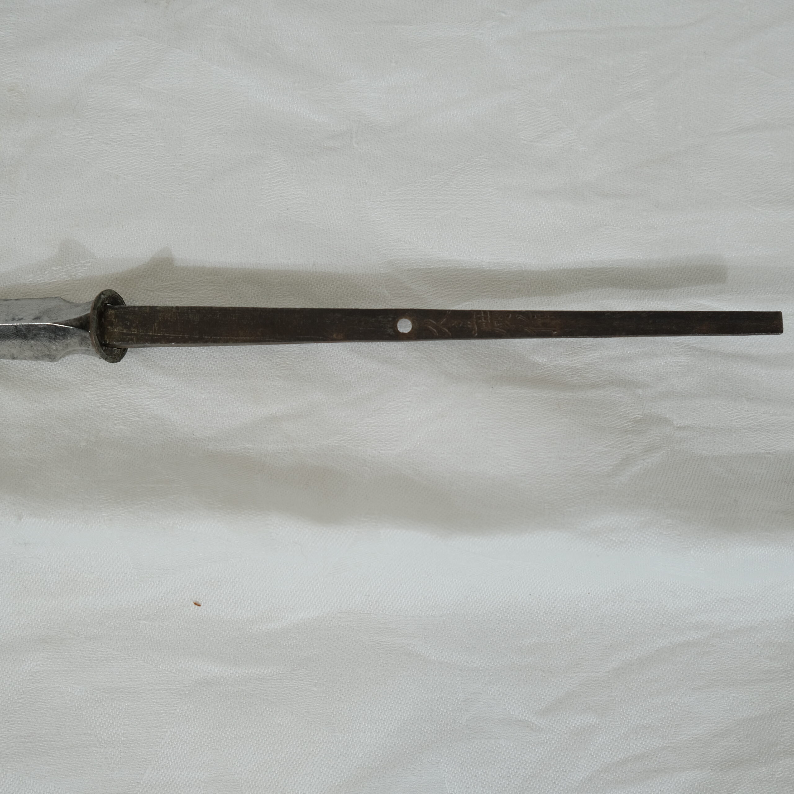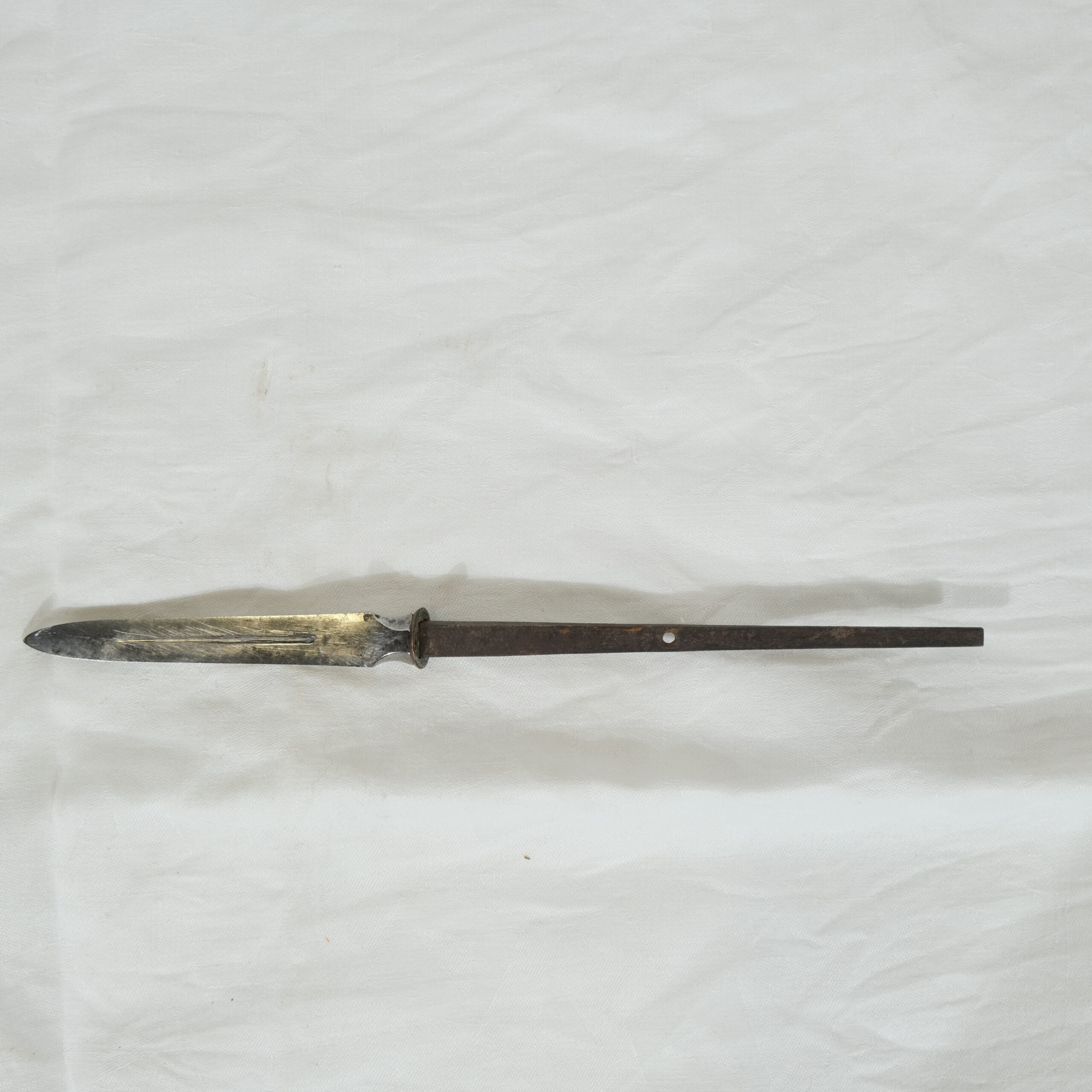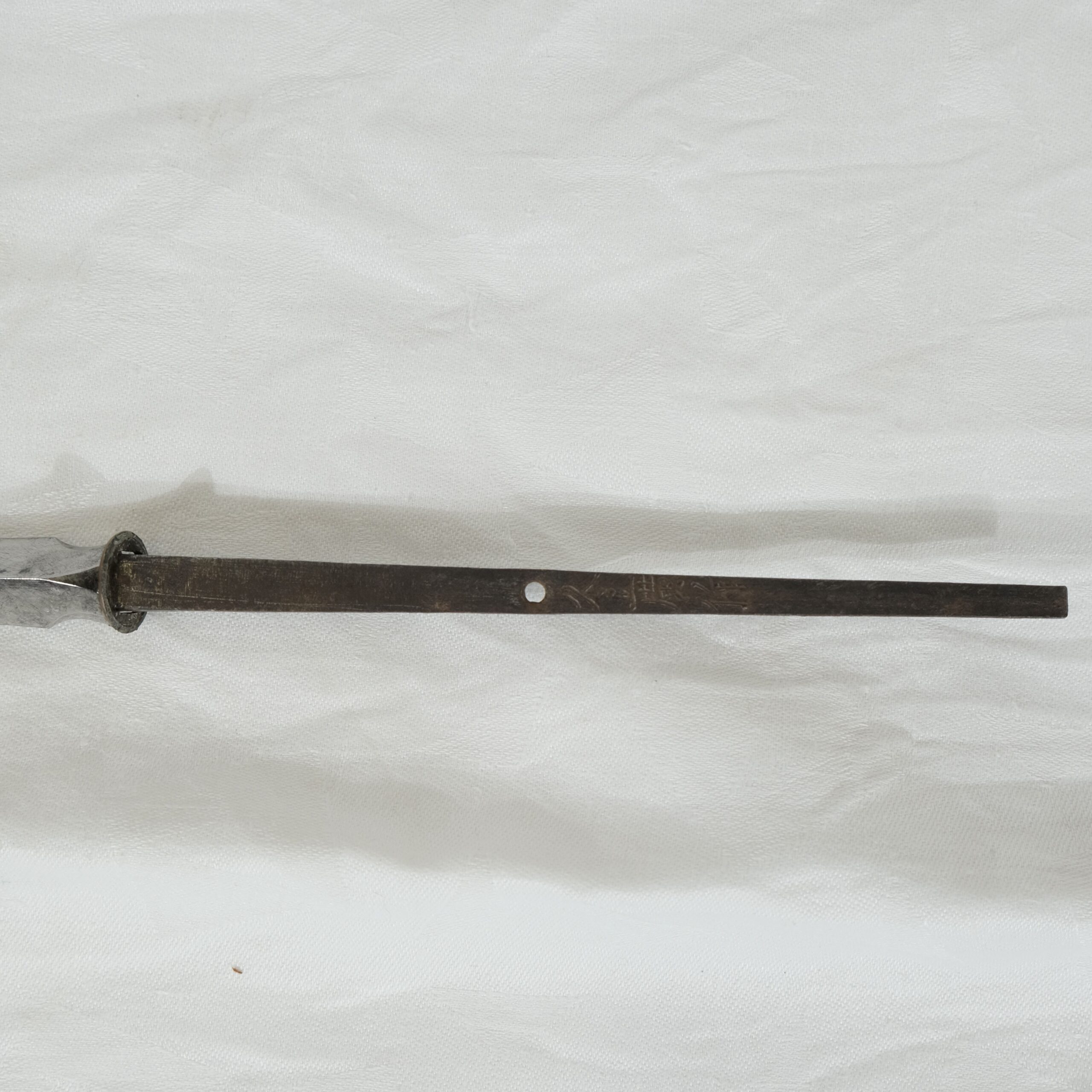 A Japanese long spear. Partly lacquered wood with a forged spearhead which bears signature. The wooden pin is decorated with lacquer in black and gold.