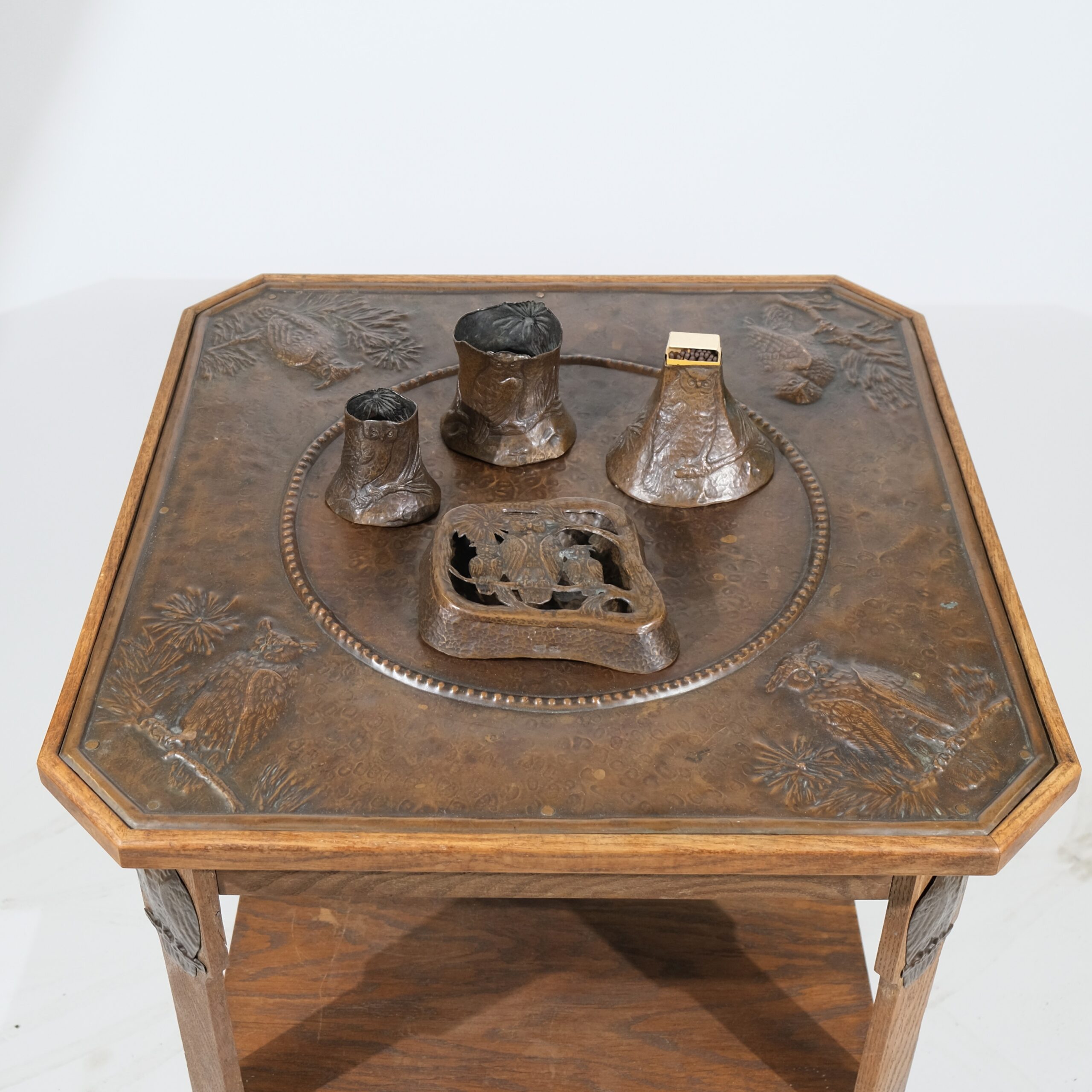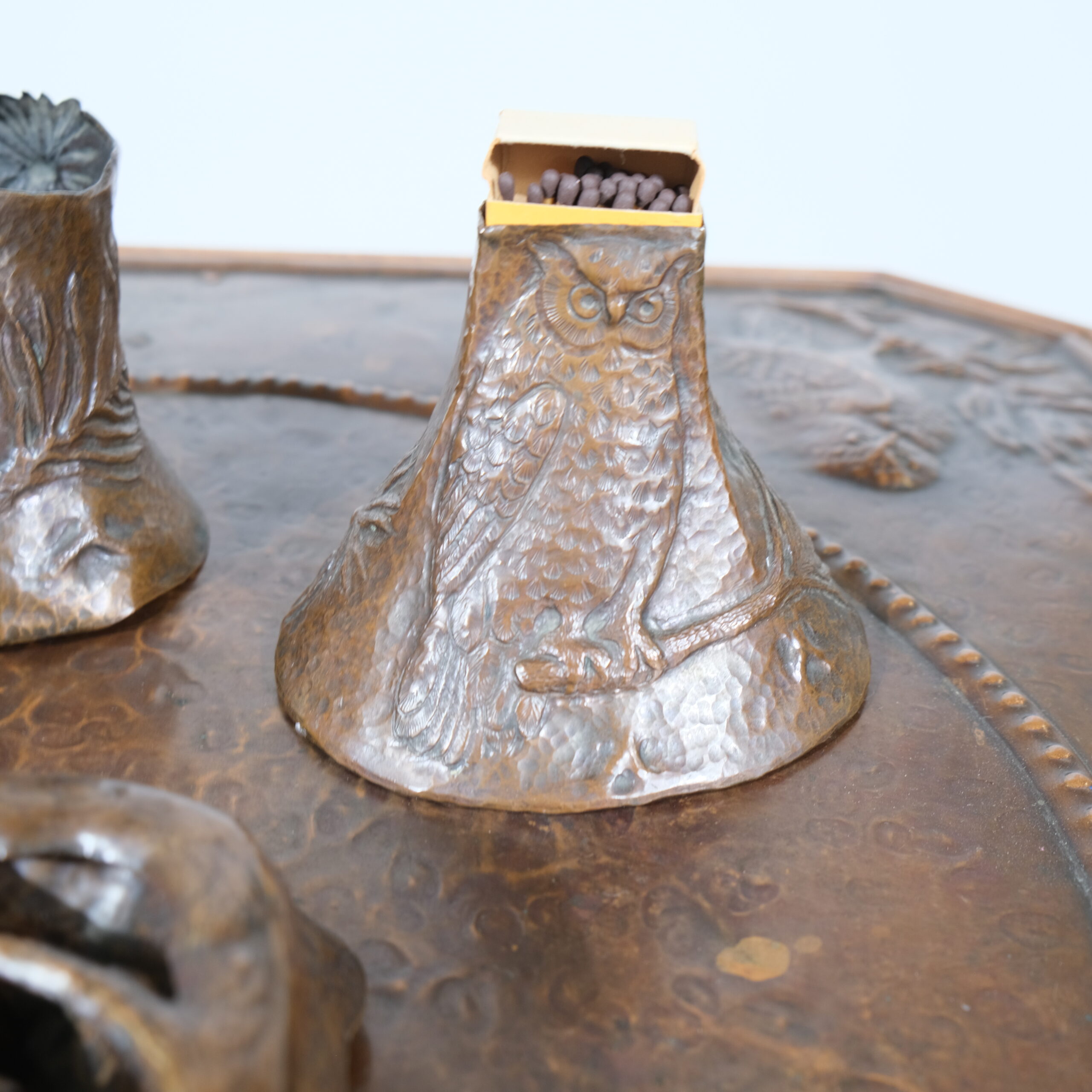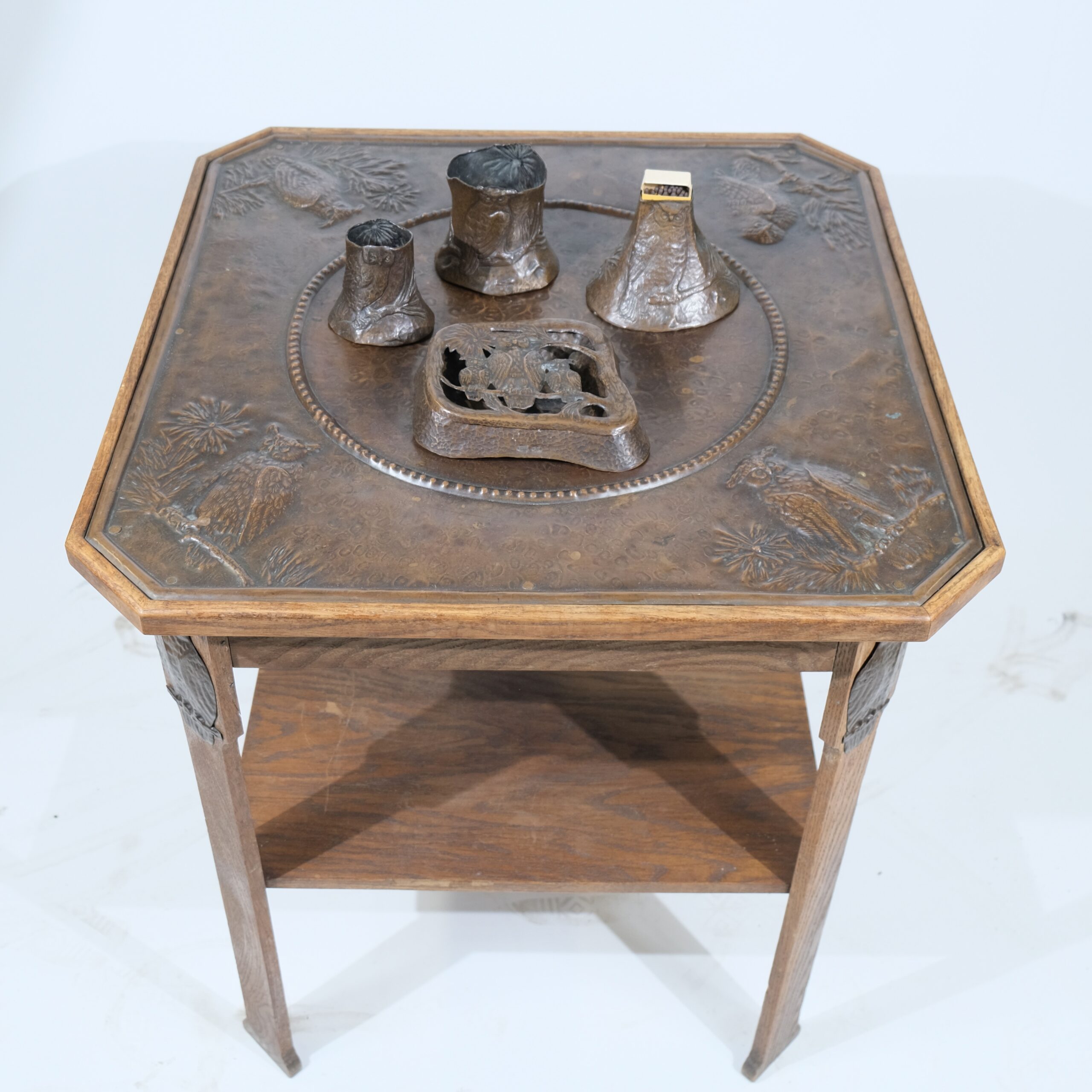 This is a unique oak and copper table, crafted with exceptional detail, made around 1905 in Jugendstyle. The tabletop is made of copper with intricate owl motifs in various postures, demonstrating fine craftsmanship and attention to naturalistic details. Signed by Harald Linder from Uddevalla (1880-1945), a noted artisan who contributed to the prestigious Stockholm exhibition in 1930, this piece reflects his skill and artistry. The table includes original accessories—jars, a match holder, and an ashtray—preserved over the years, enhancing its historical and aesthetic value. The combination of oak and copper creates a rustic yet elegant look, ideal for collectors of early Scandinavian decorative arts. This table serves not only as a functional piece but also as a work of art, embodying the timeless appeal of Linder’s design.