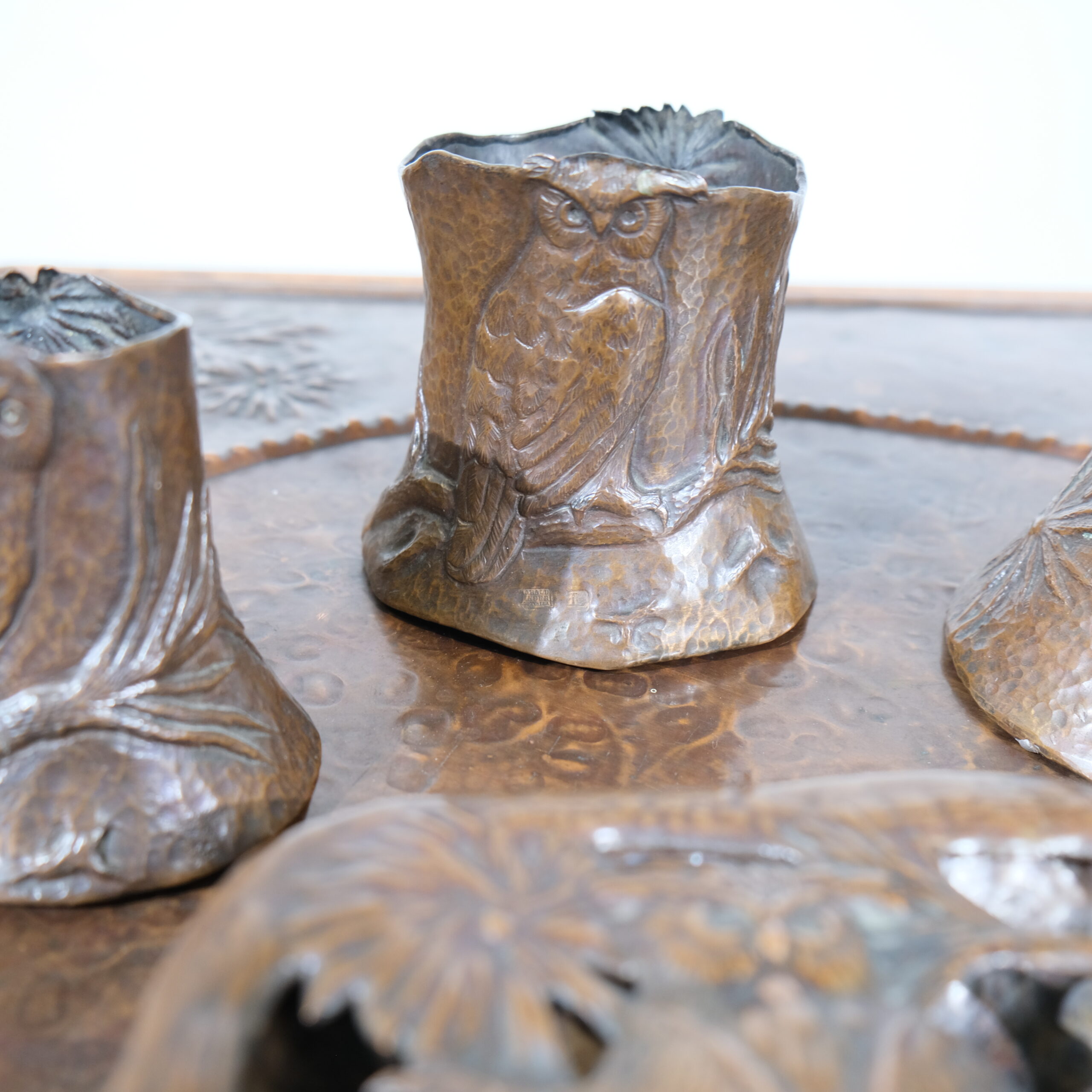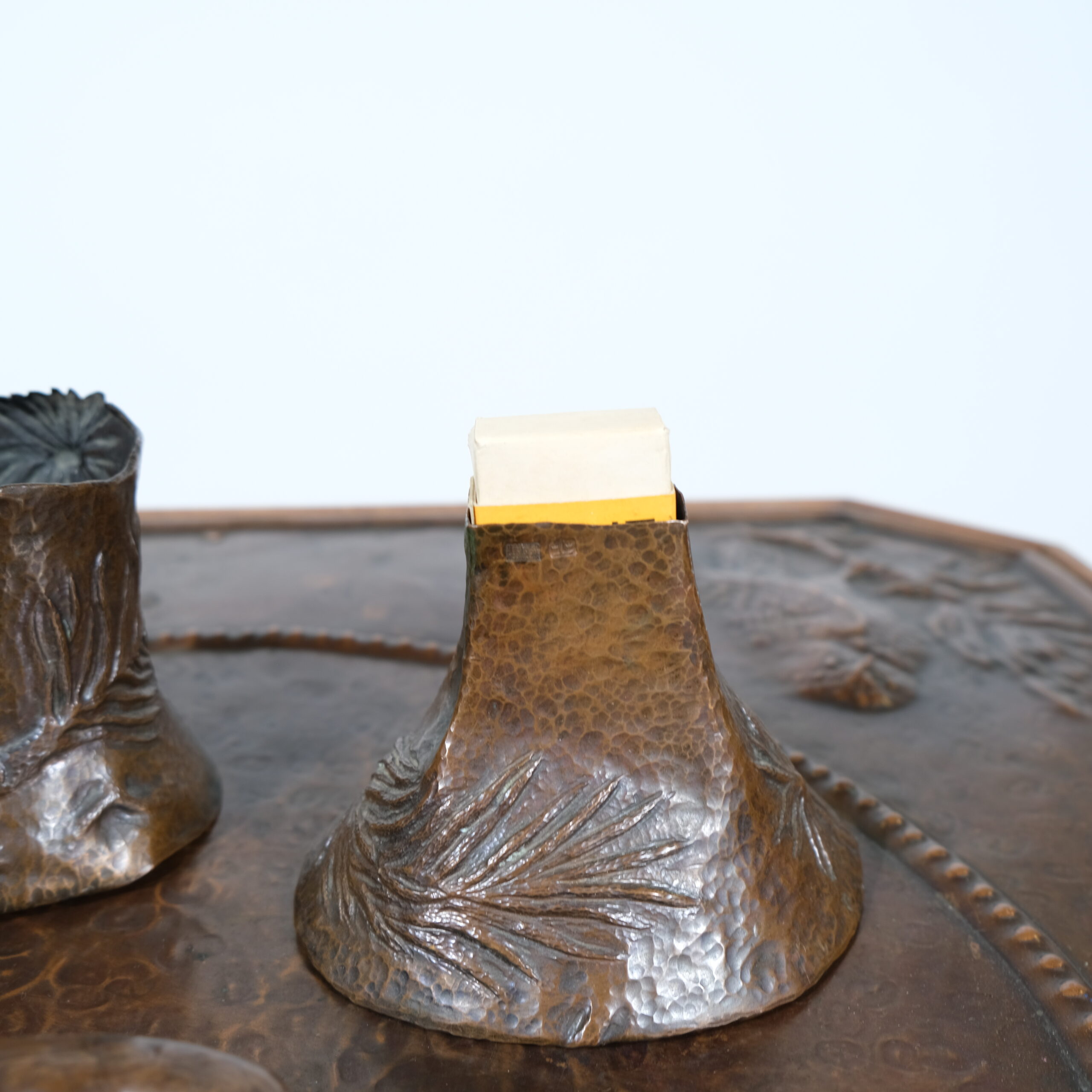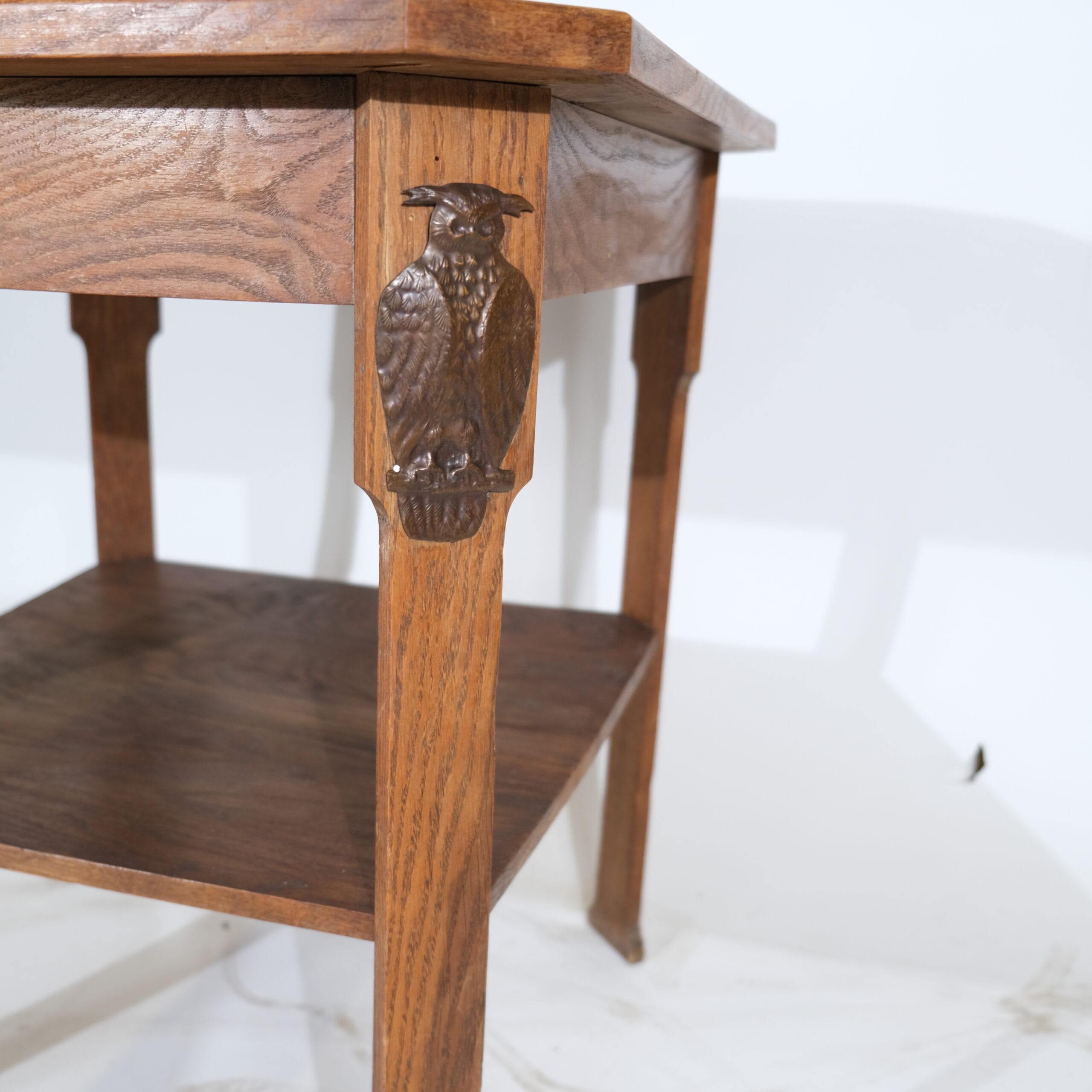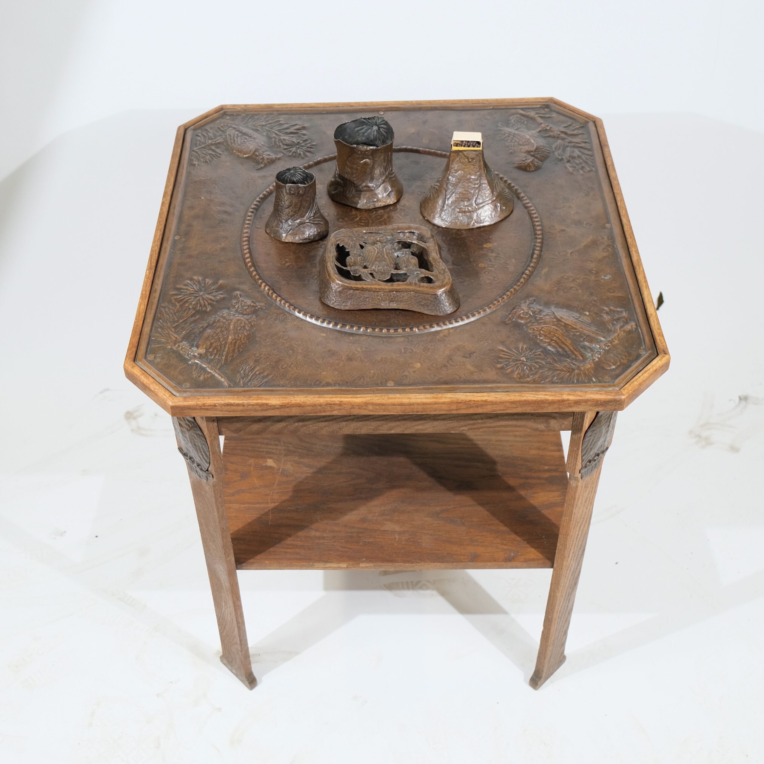 This is a unique oak and copper table, crafted with exceptional detail, made around 1905 in Jugendstyle. The tabletop is made of copper with intricate owl motifs in various postures, demonstrating fine craftsmanship and attention to naturalistic details. Signed by Harald Linder from Uddevalla (1880-1945), a noted artisan who contributed to the prestigious Stockholm exhibition in 1930, this piece reflects his skill and artistry. The table includes original accessories—jars, a match holder, and an ashtray—preserved over the years, enhancing its historical and aesthetic value. The combination of oak and copper creates a rustic yet elegant look, ideal for collectors of early Scandinavian decorative arts. This table serves not only as a functional piece but also as a work of art, embodying the timeless appeal of Linder’s design.