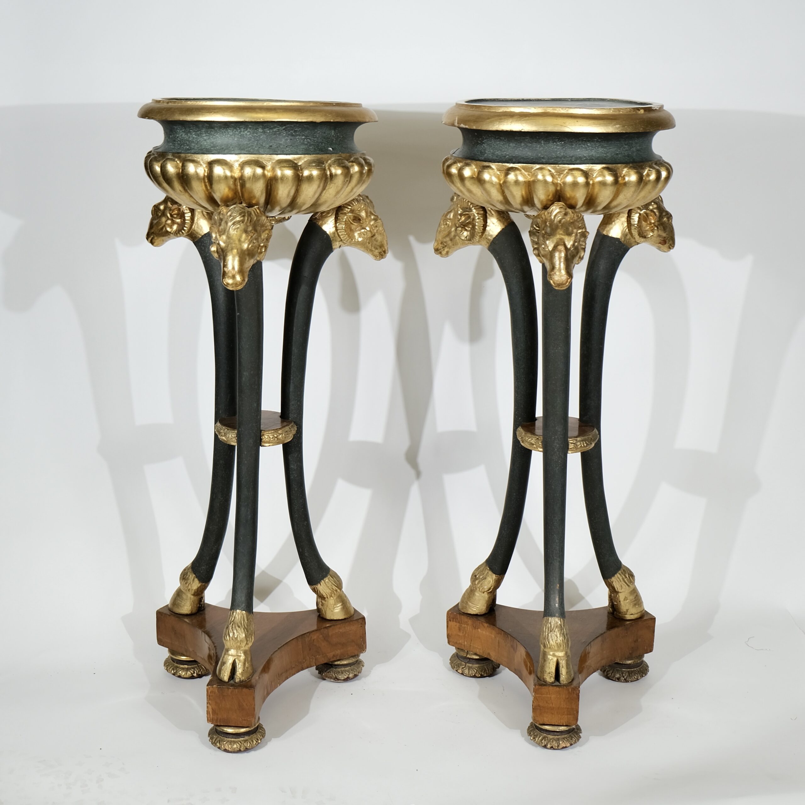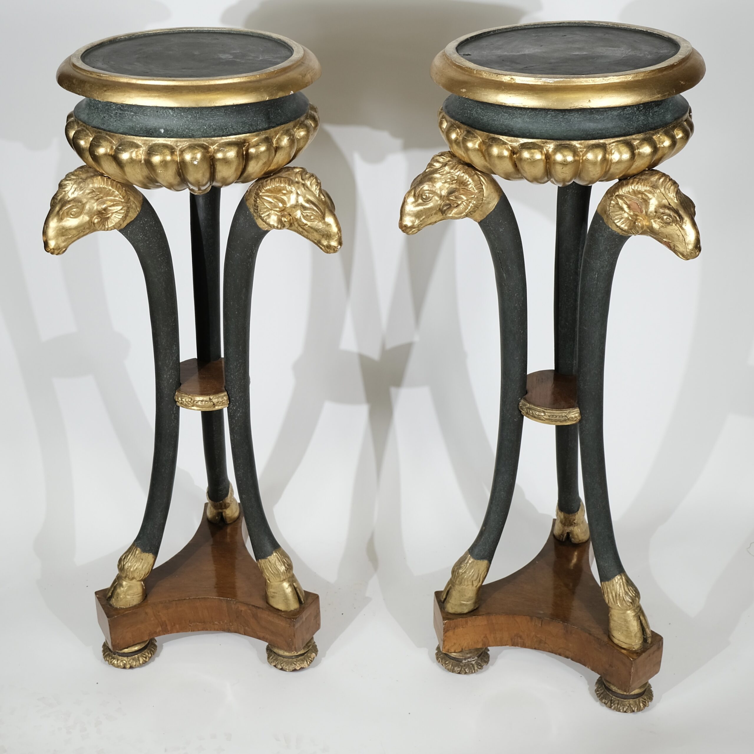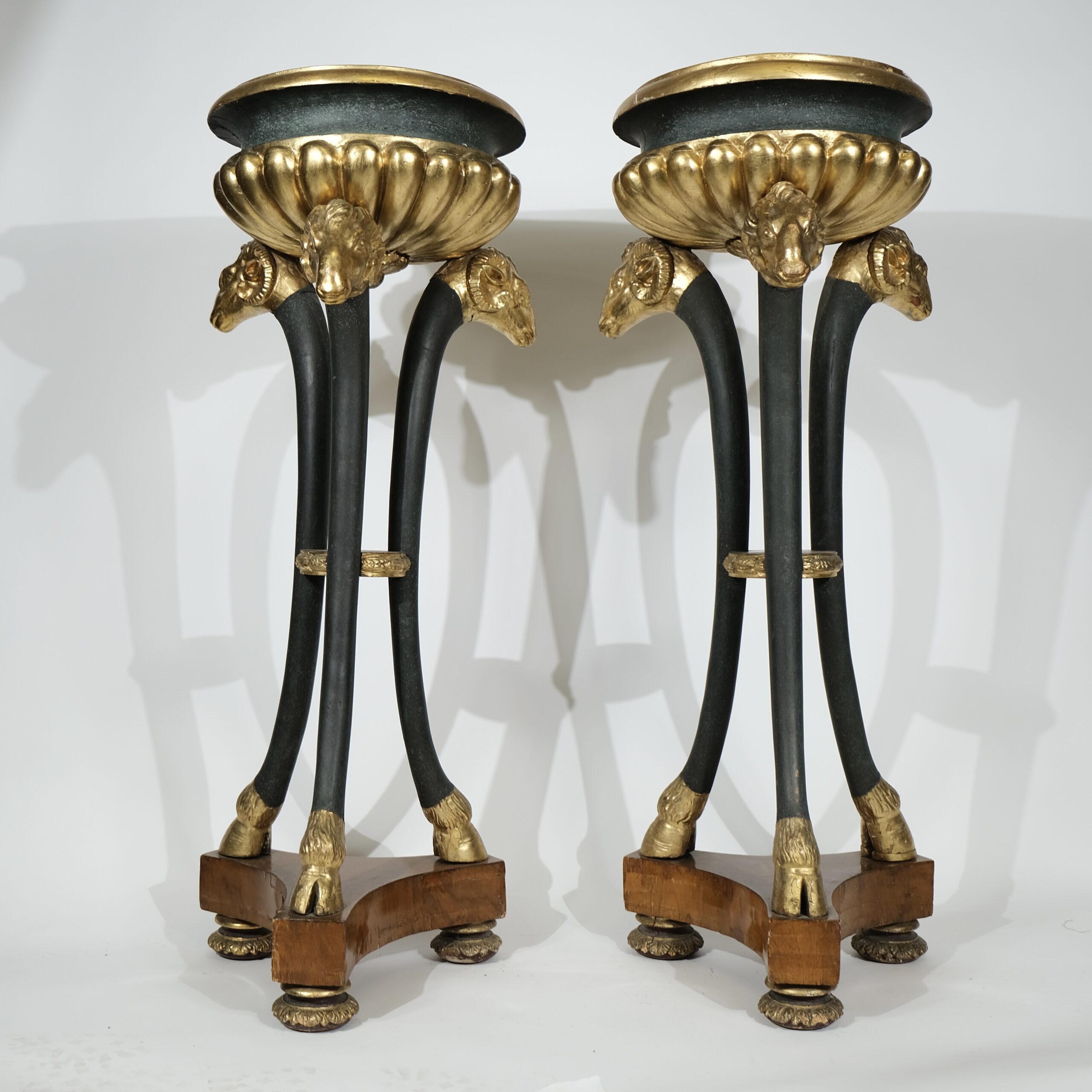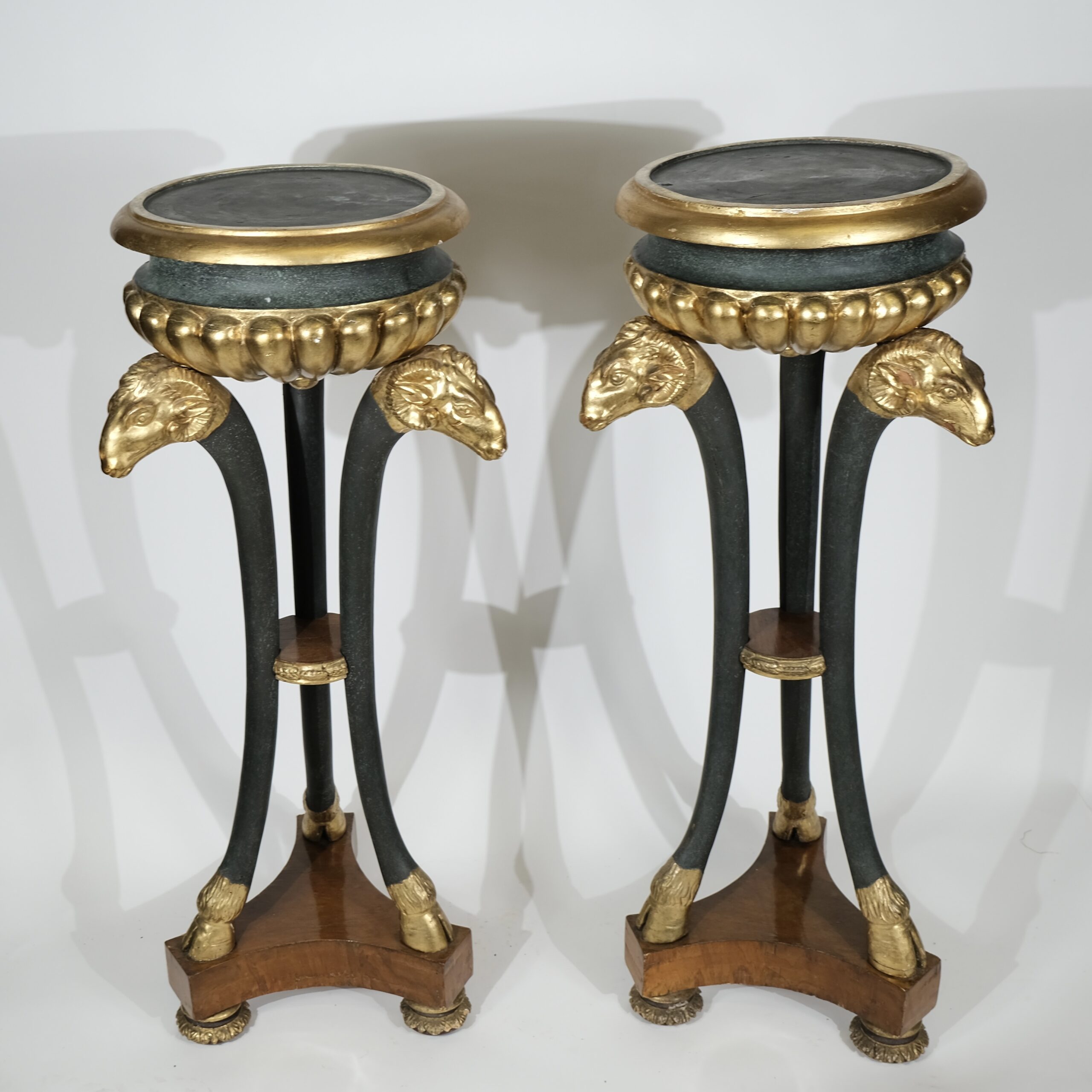 Pair of empire gilt and patinated and mahogany veneered wood gueridons, early 19th century.