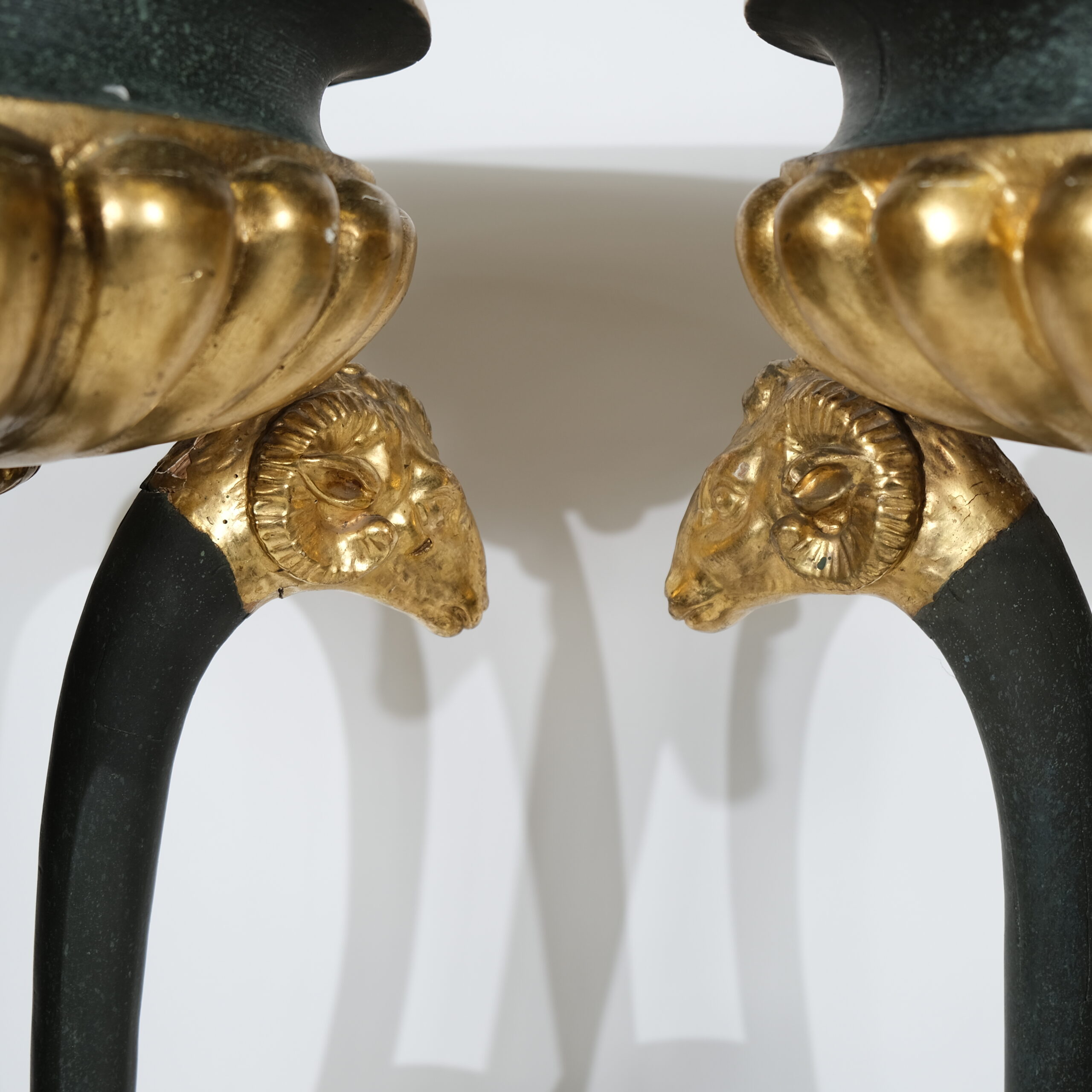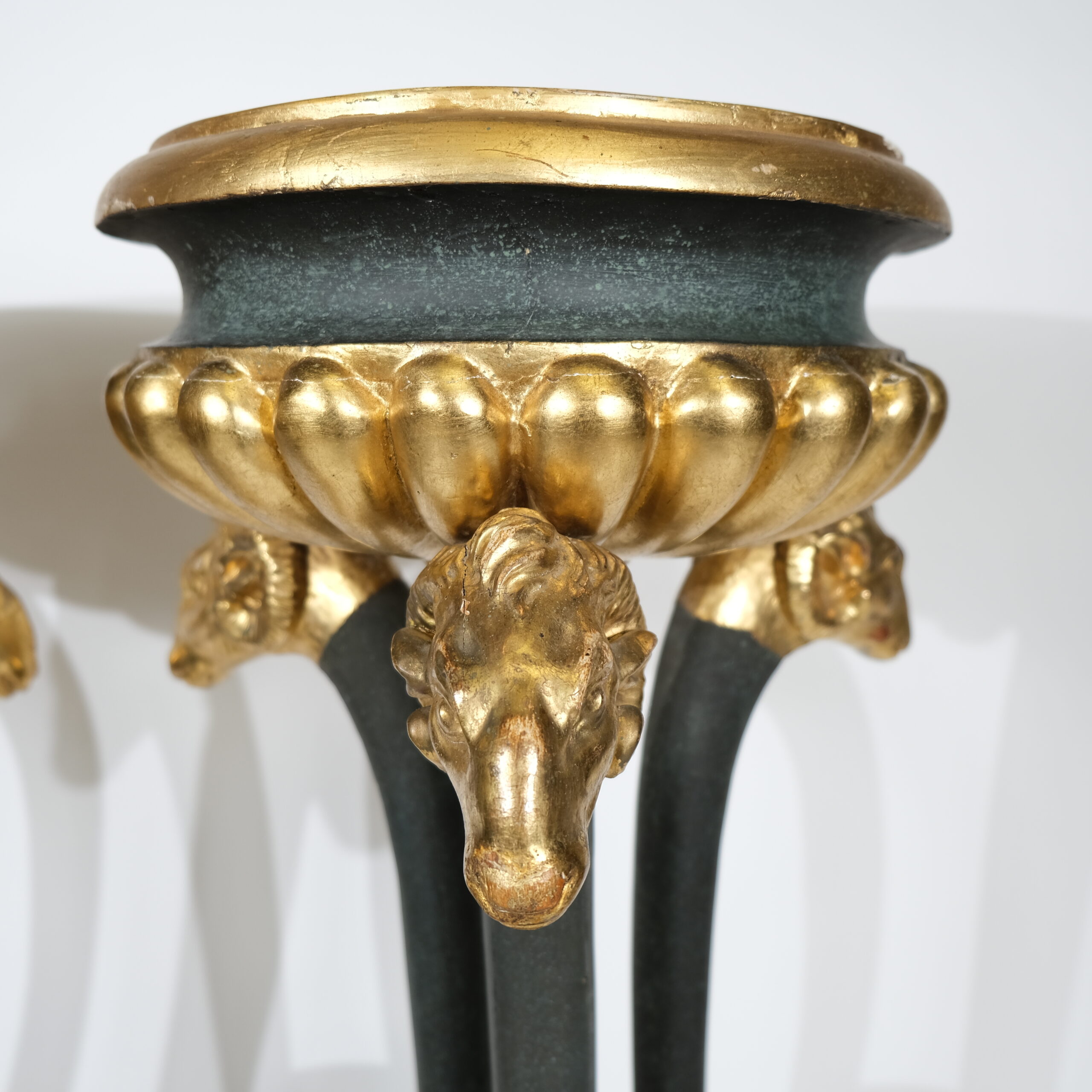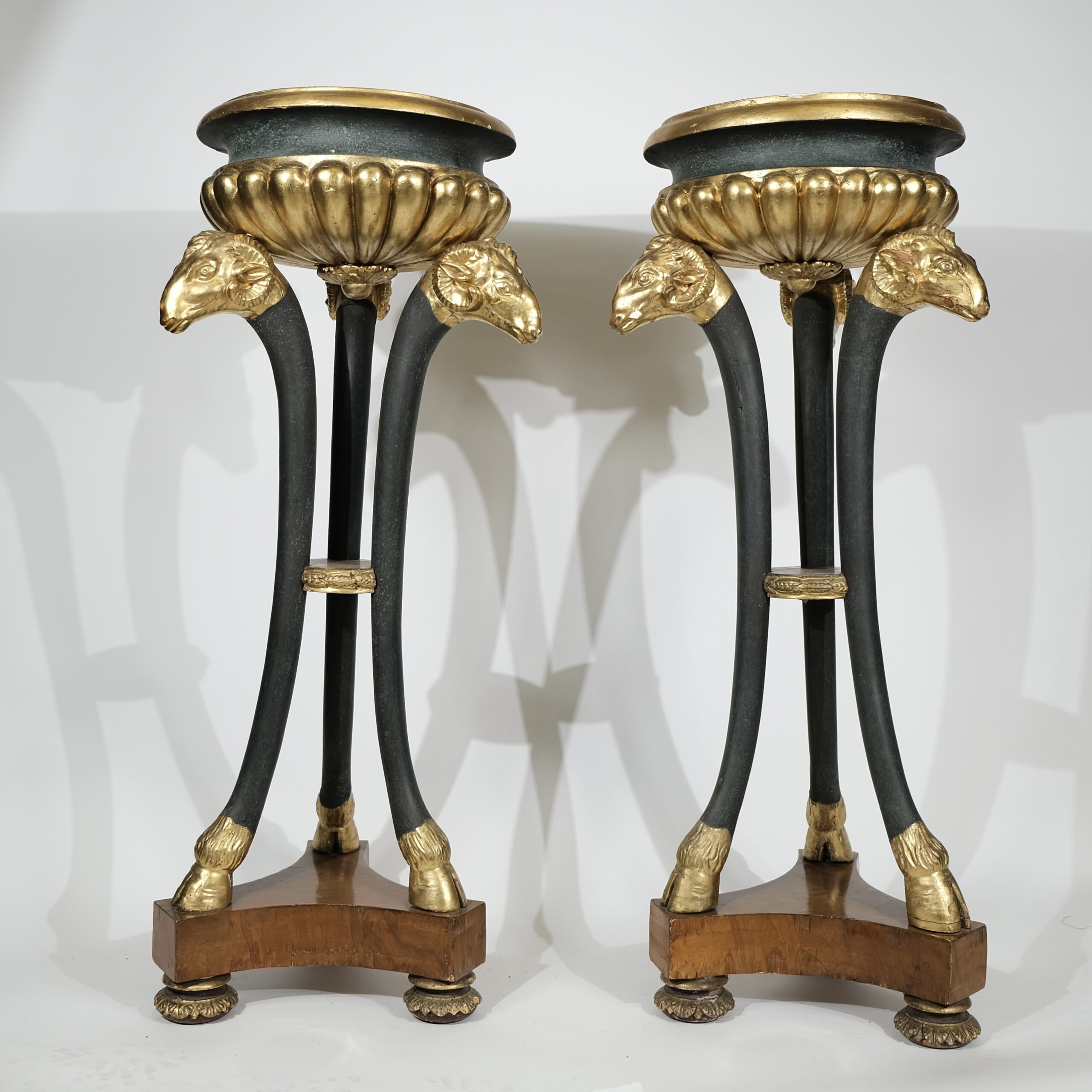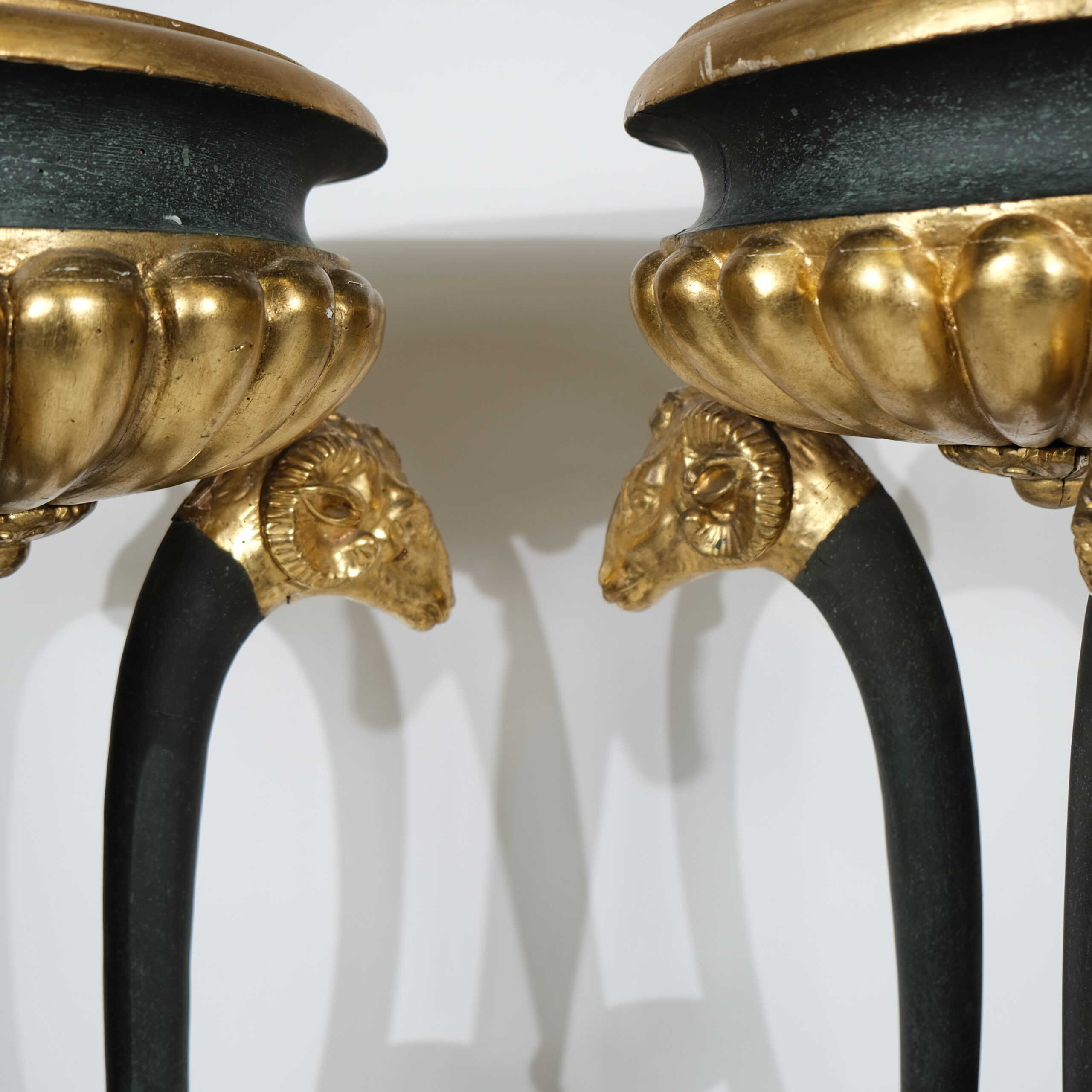 Pair of empire gilt and patinated and mahogany veneered wood gueridons, early 19th century.