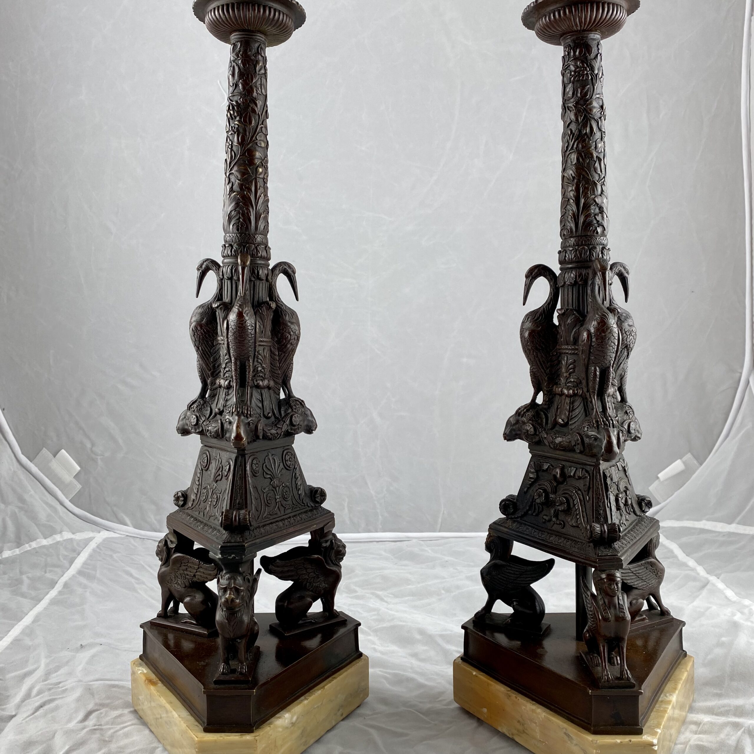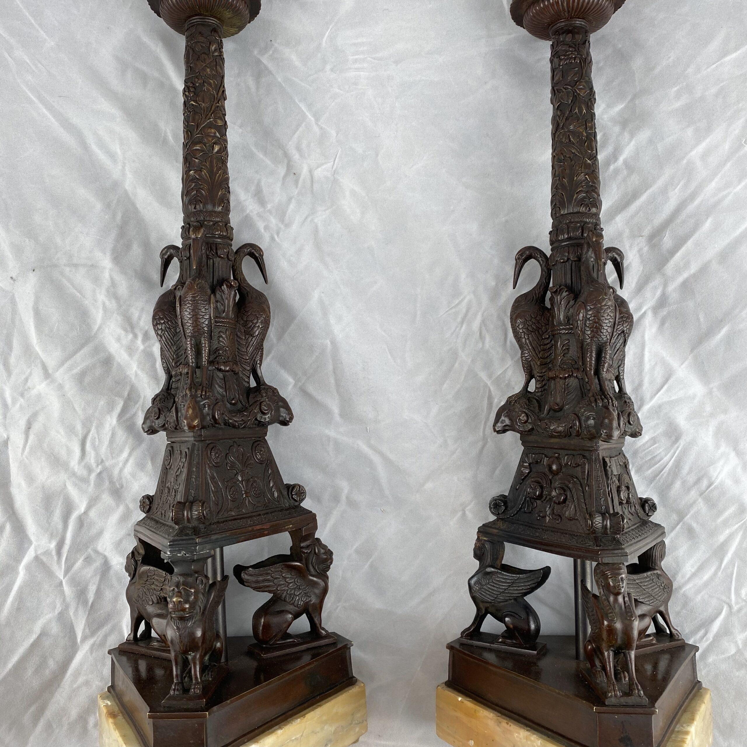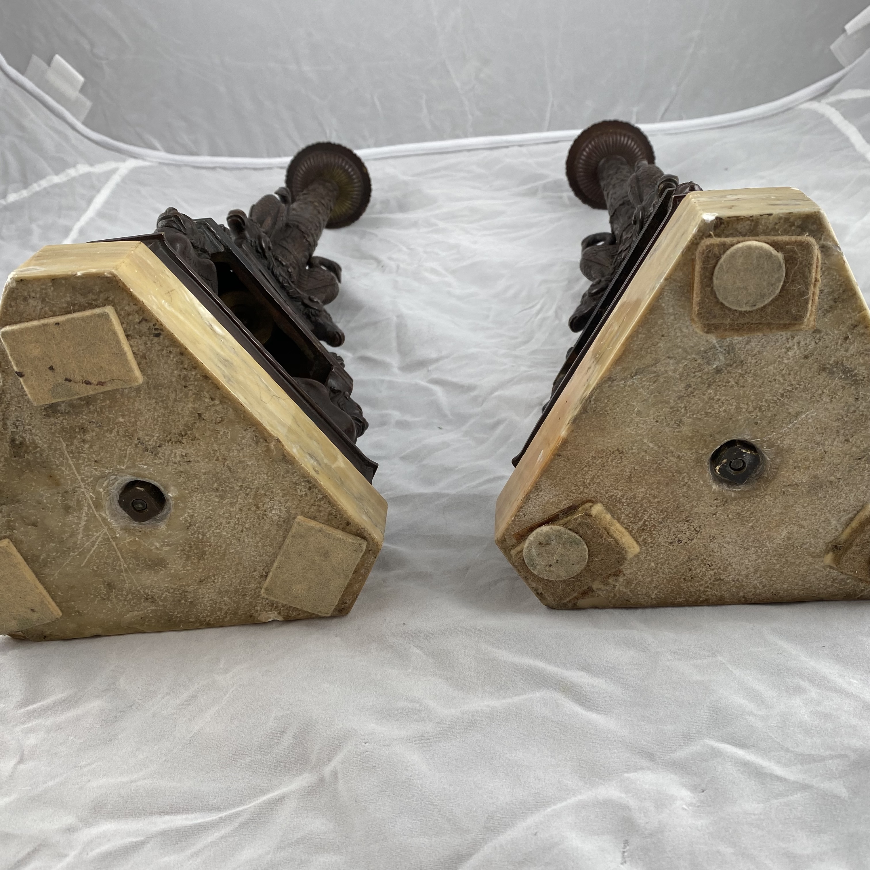 A very nice pair of Grand Tour candlesticks. Italian. Patinated bronze on marble bases.