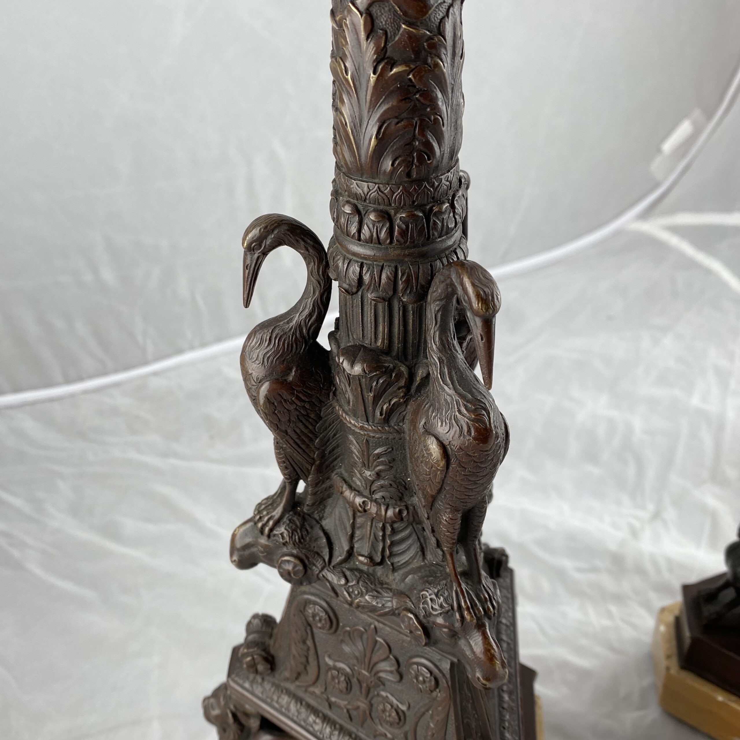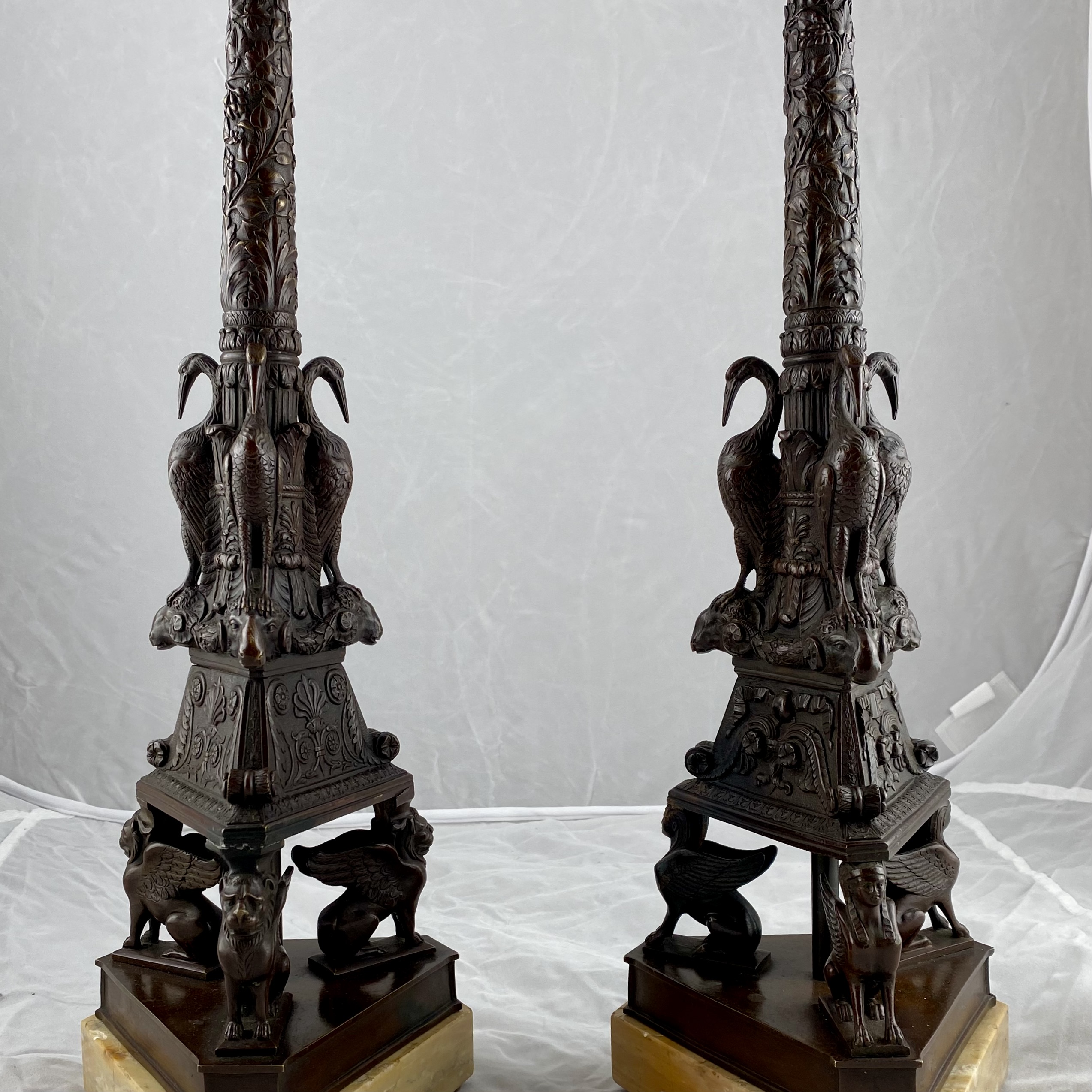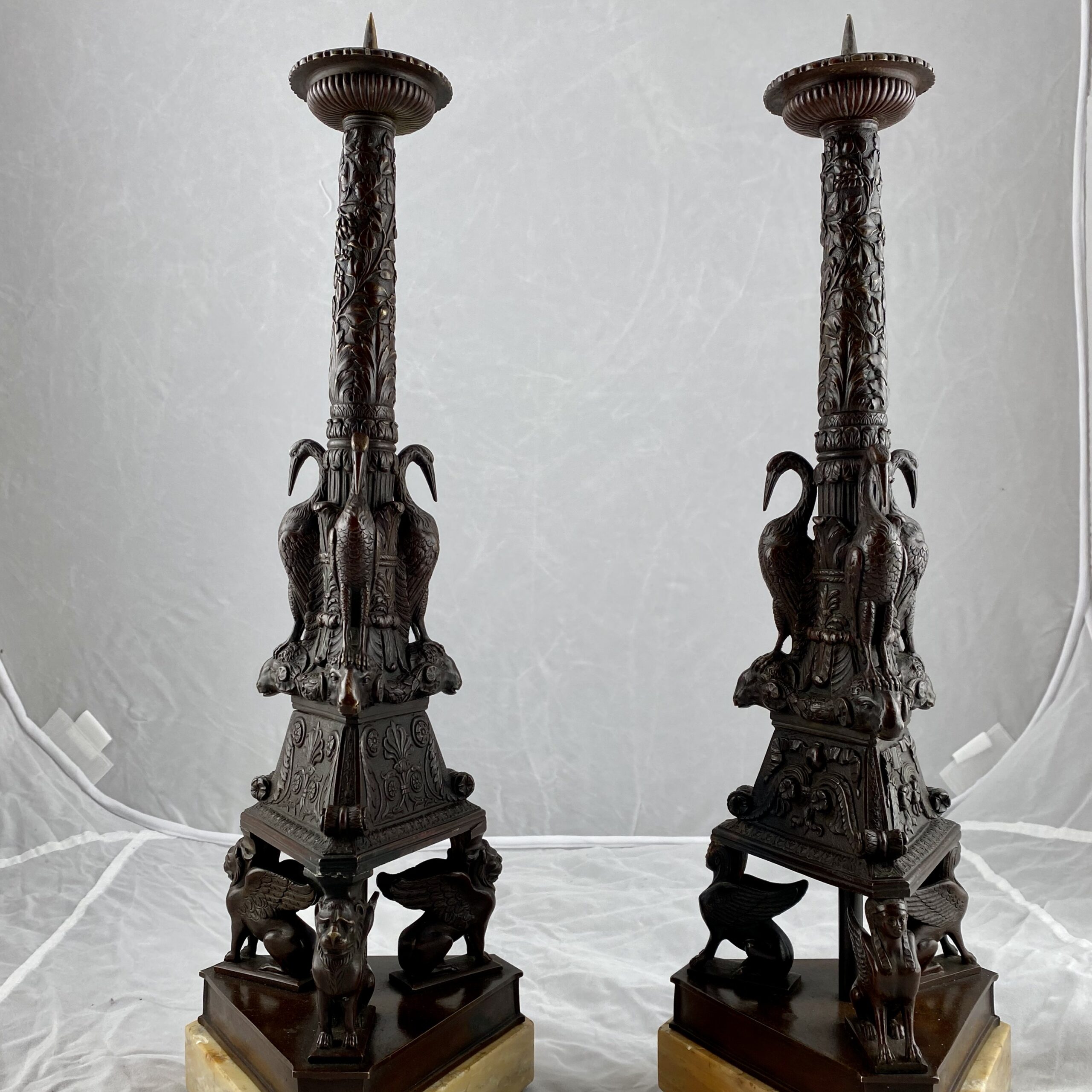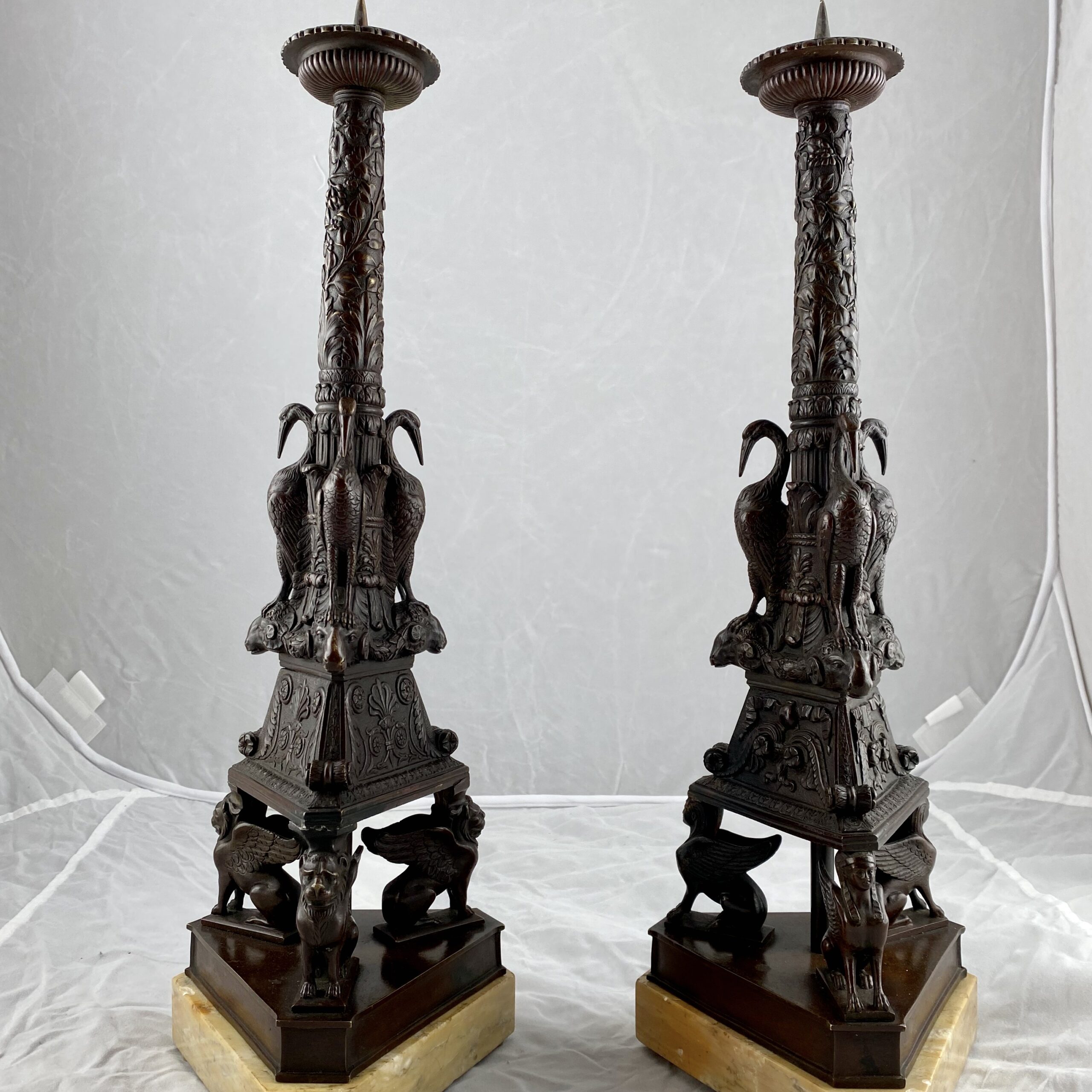 A very nice pair of Grand Tour candlesticks. Italian. Patinated bronze on marble bases.