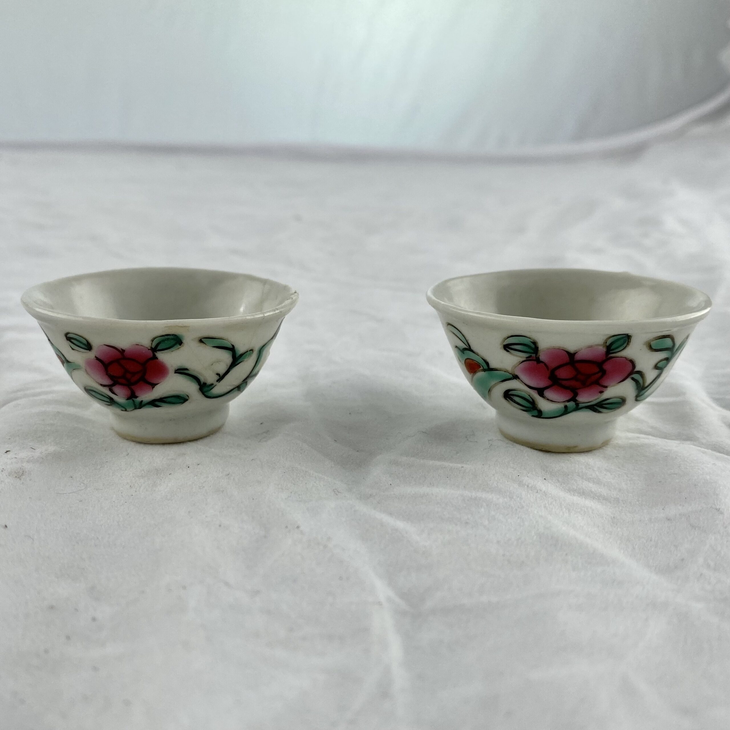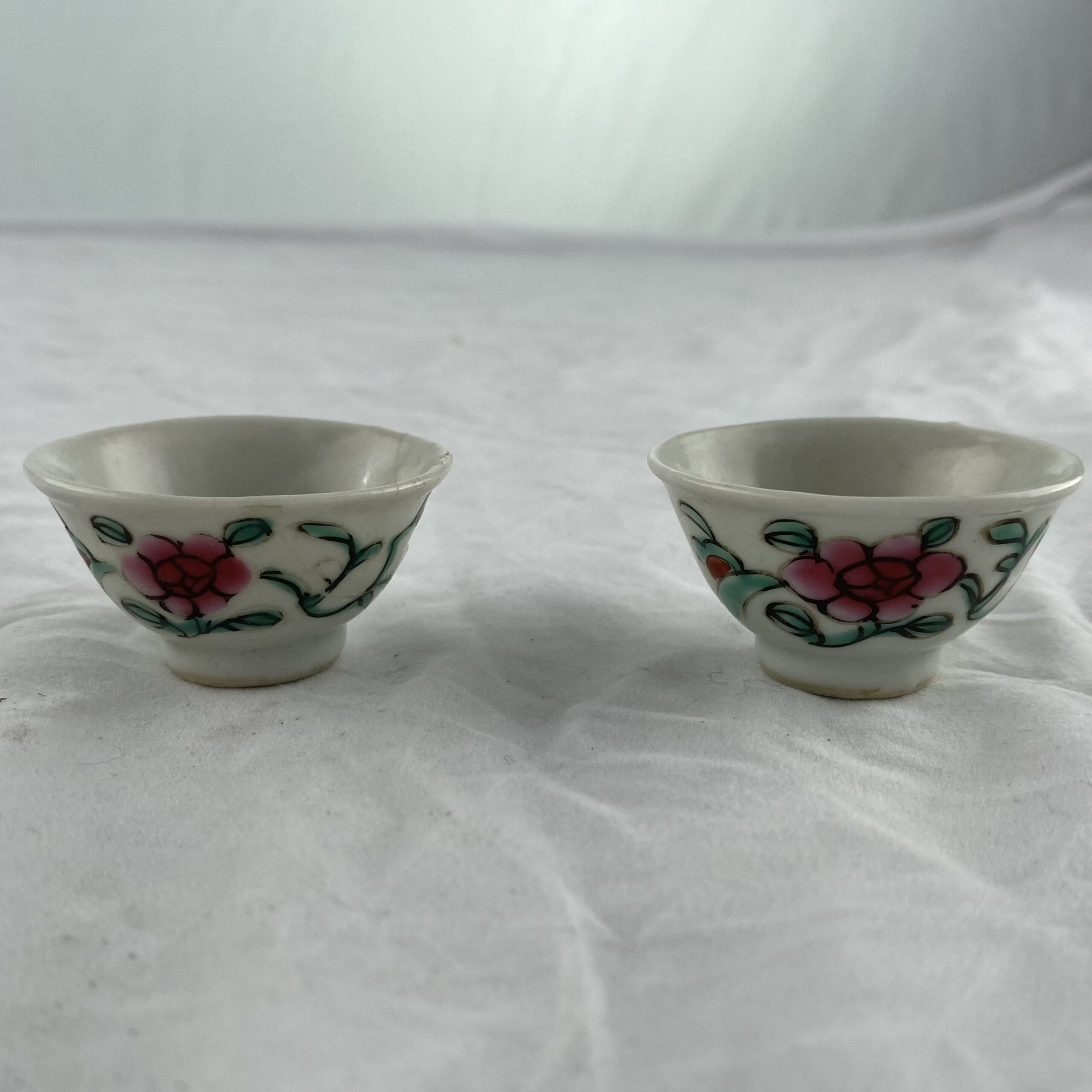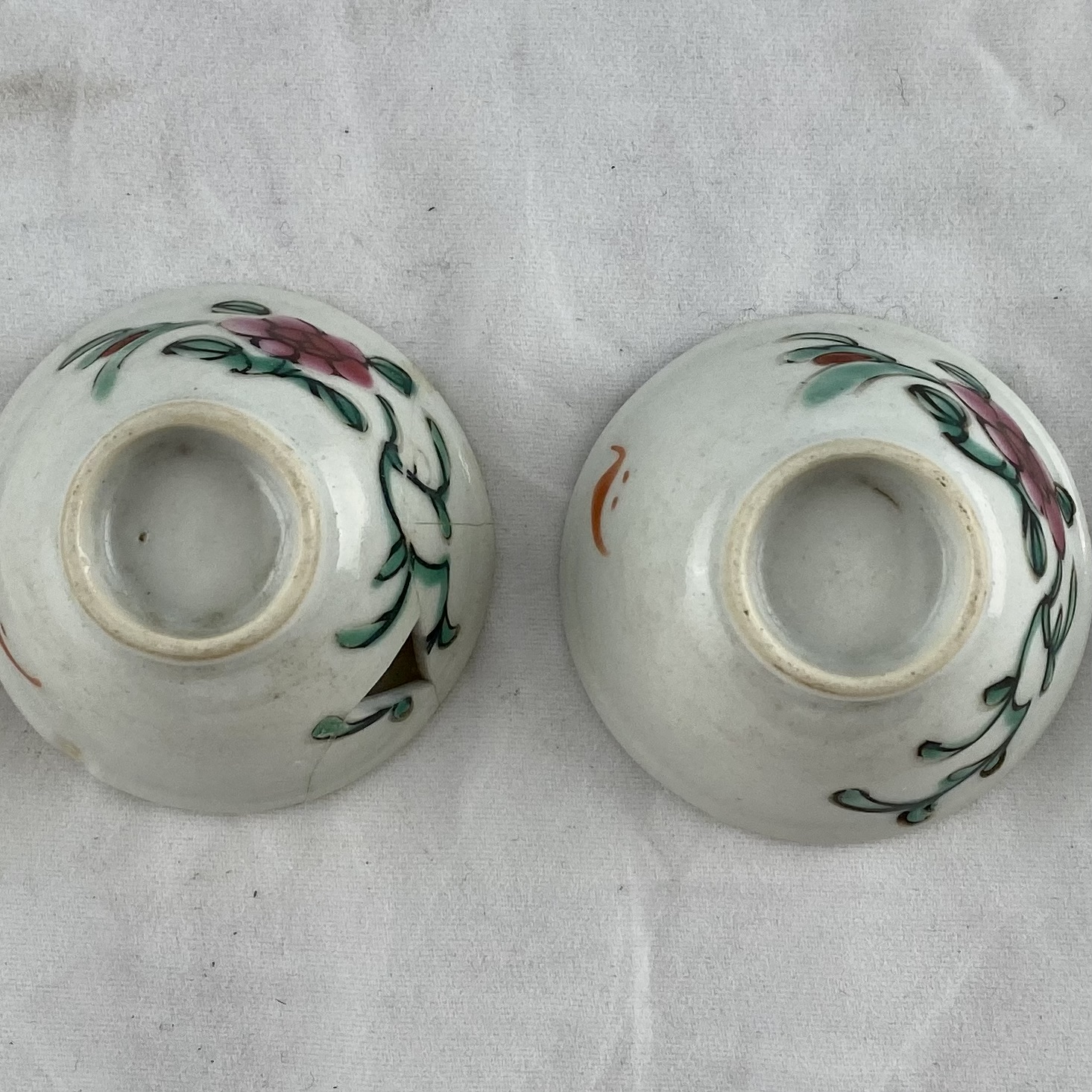 A pair of small porcelain cups decorated in famille rose colours, 18th c. One of the cups severely damaged/repaired.