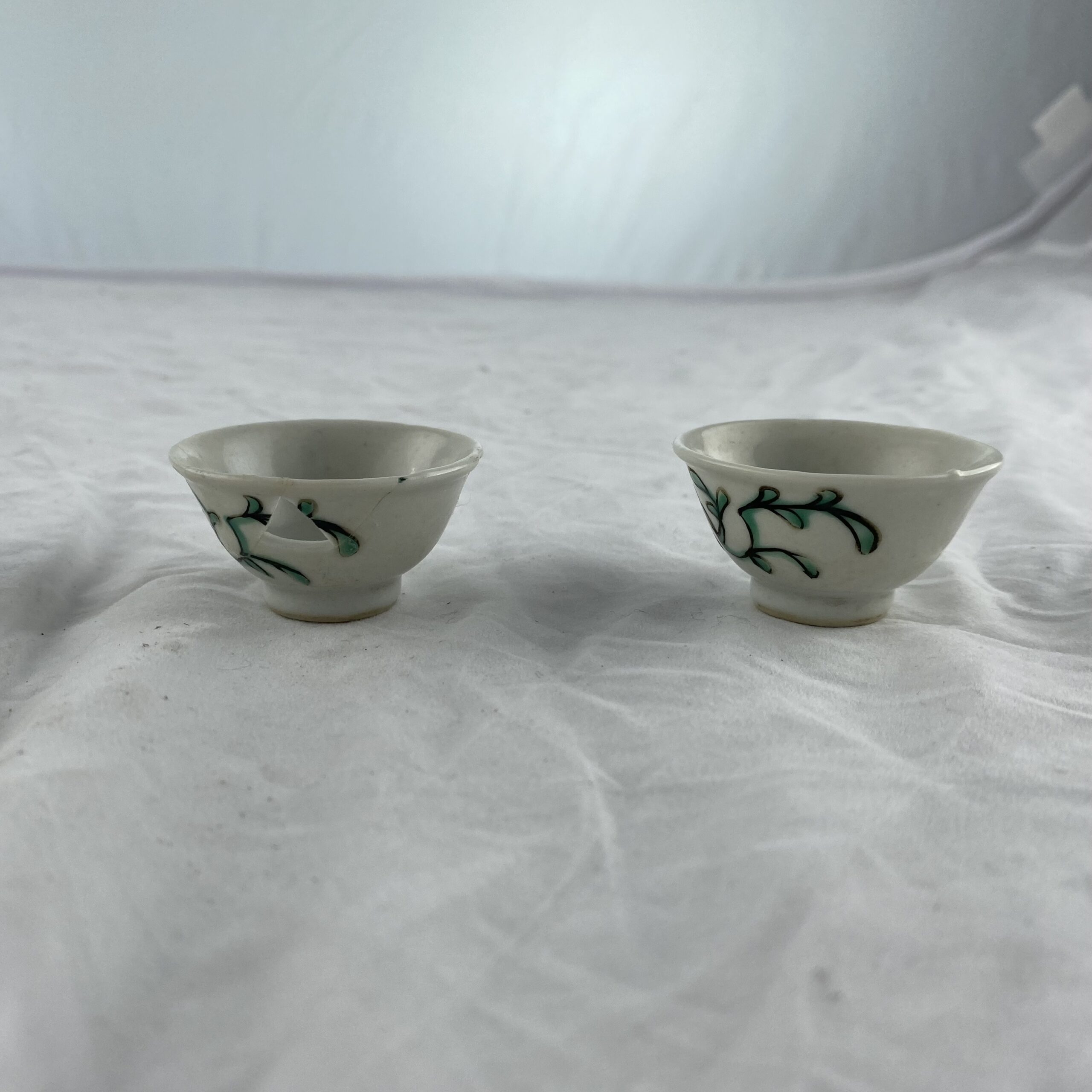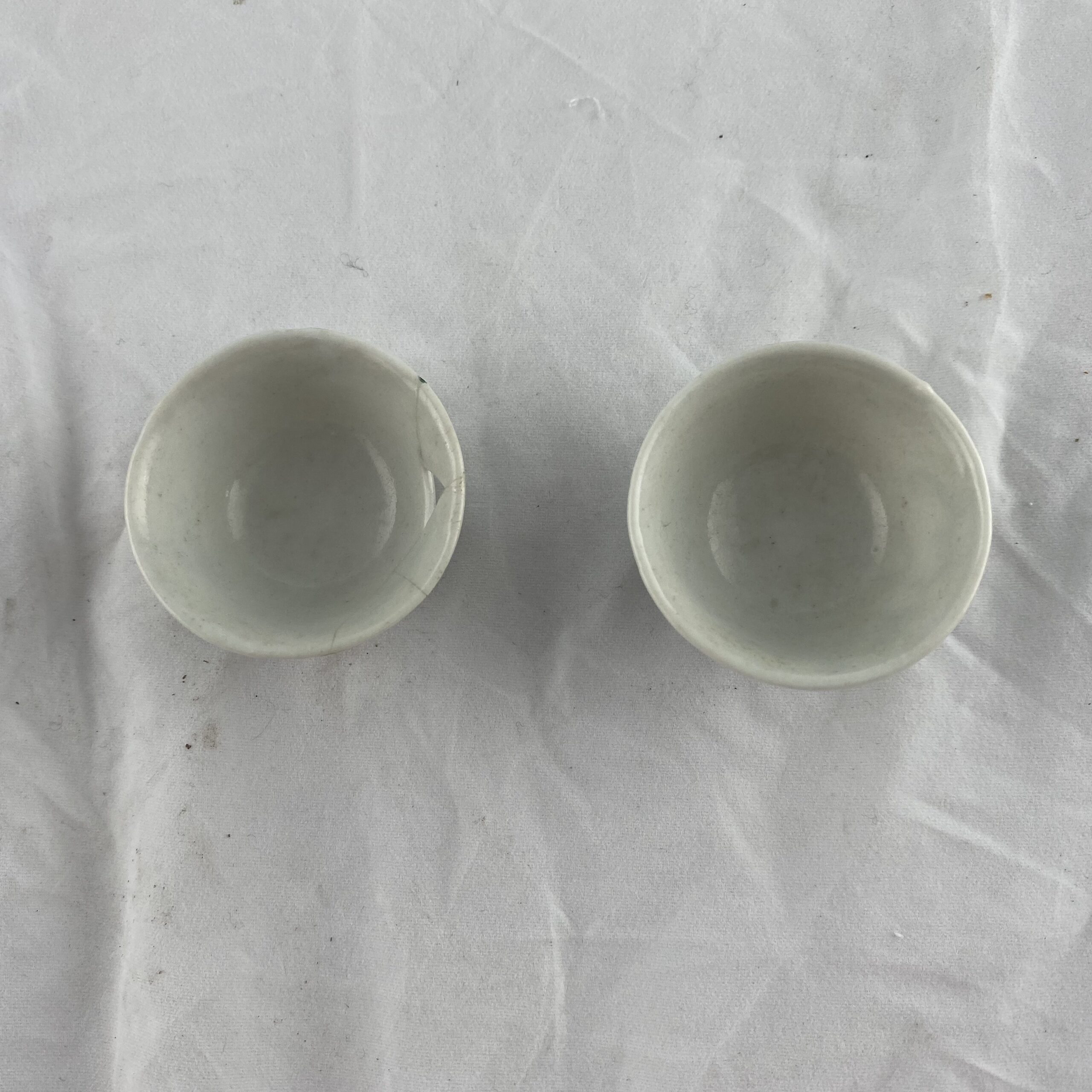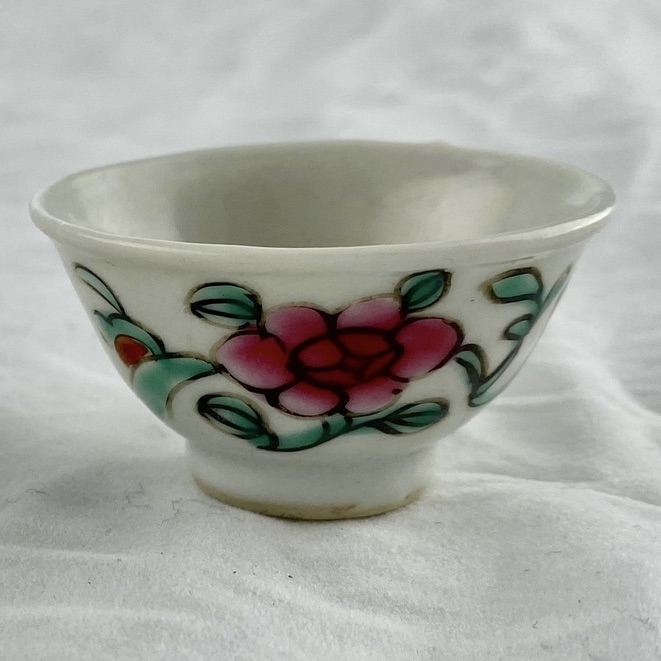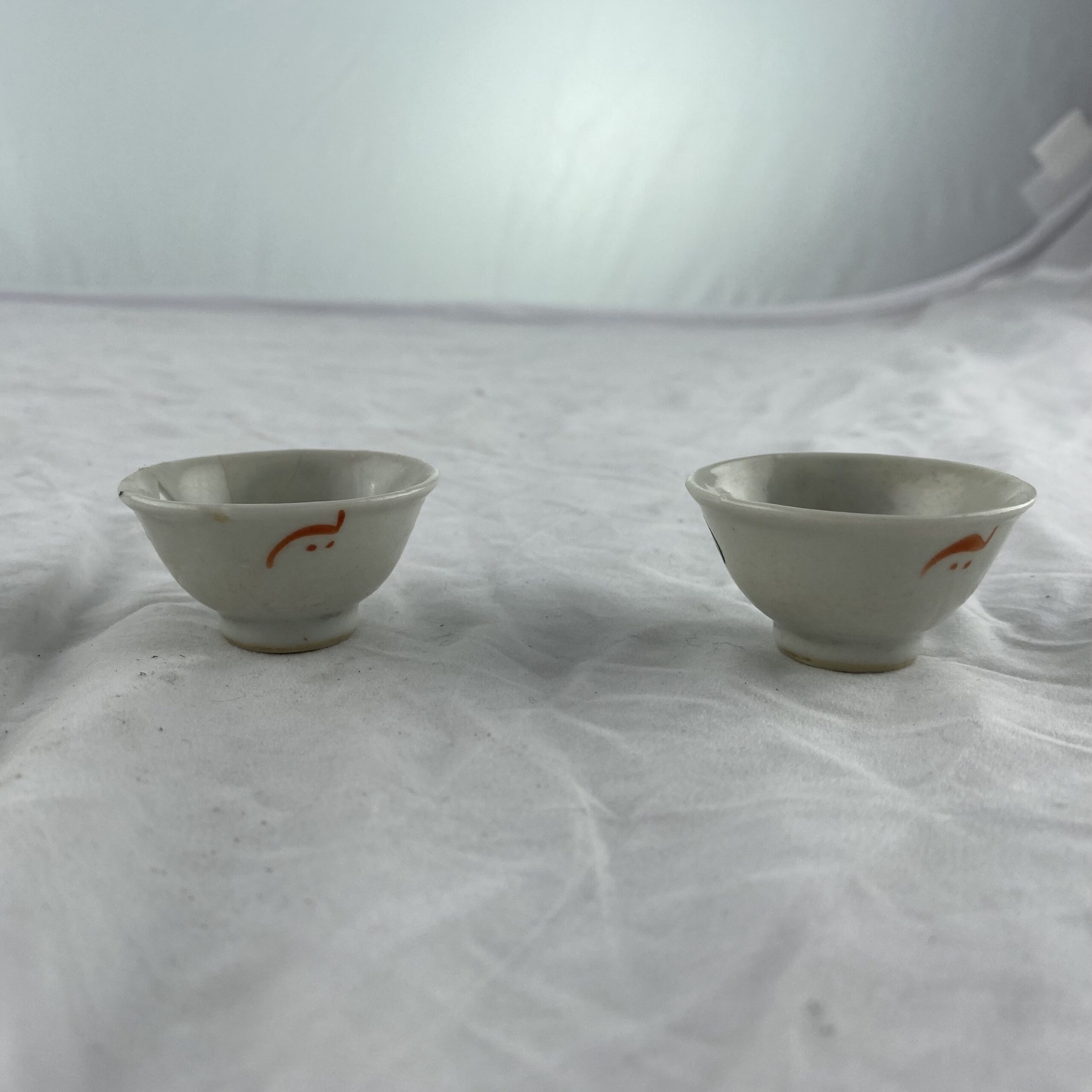 A pair of small porcelain cups decorated in famille rose colours, 18th c. One of the cups severely damaged/repaired.
