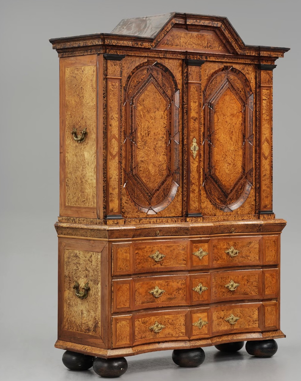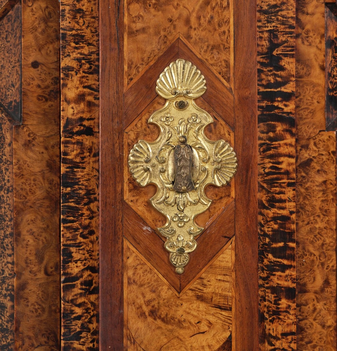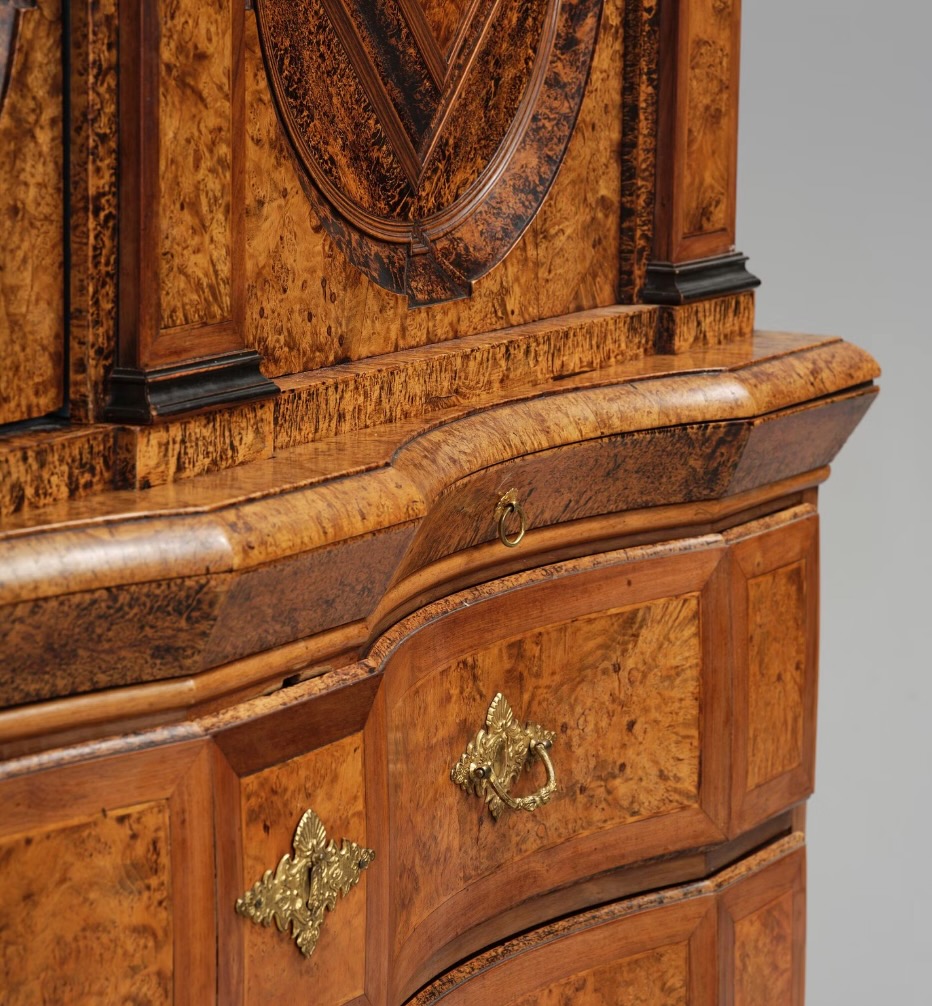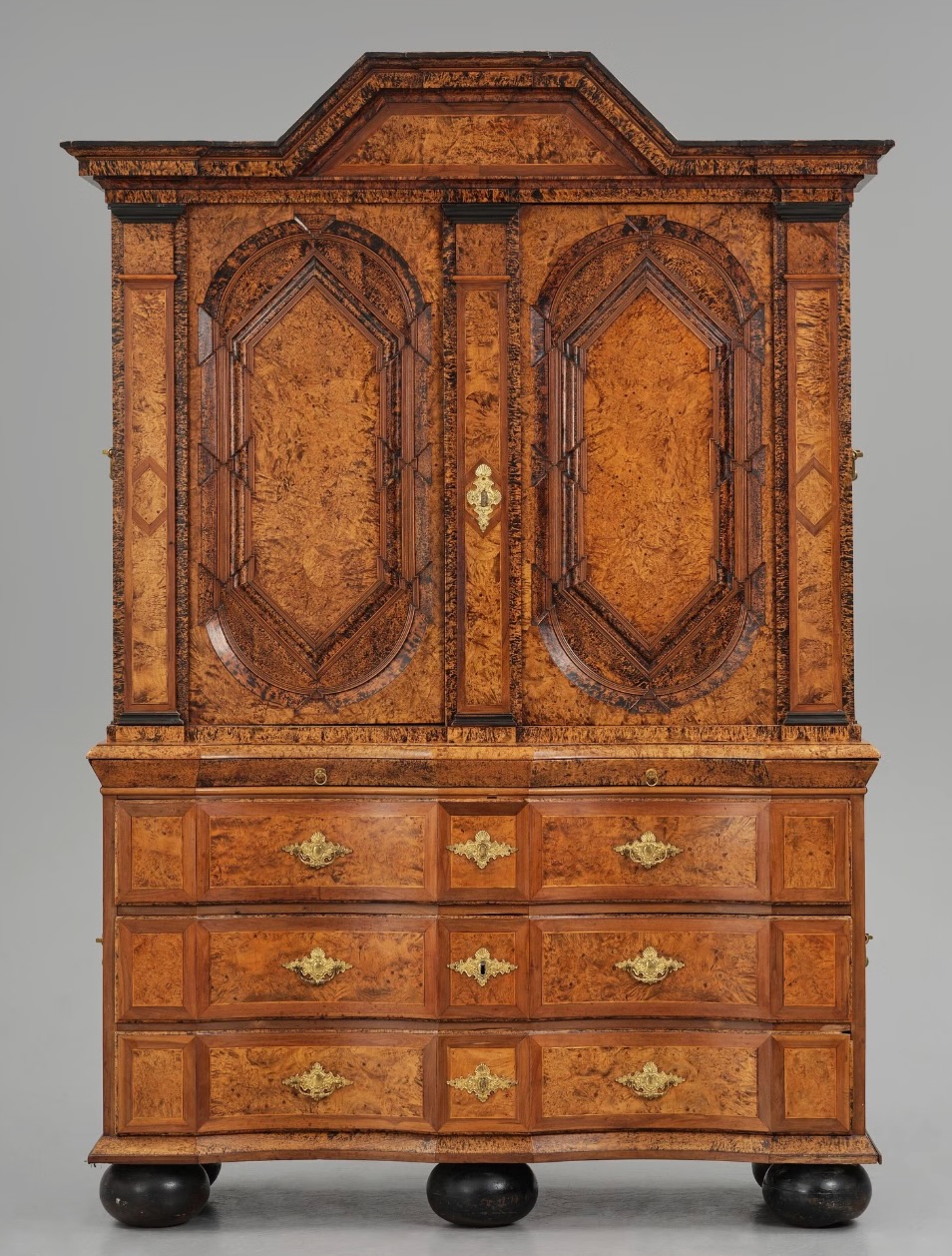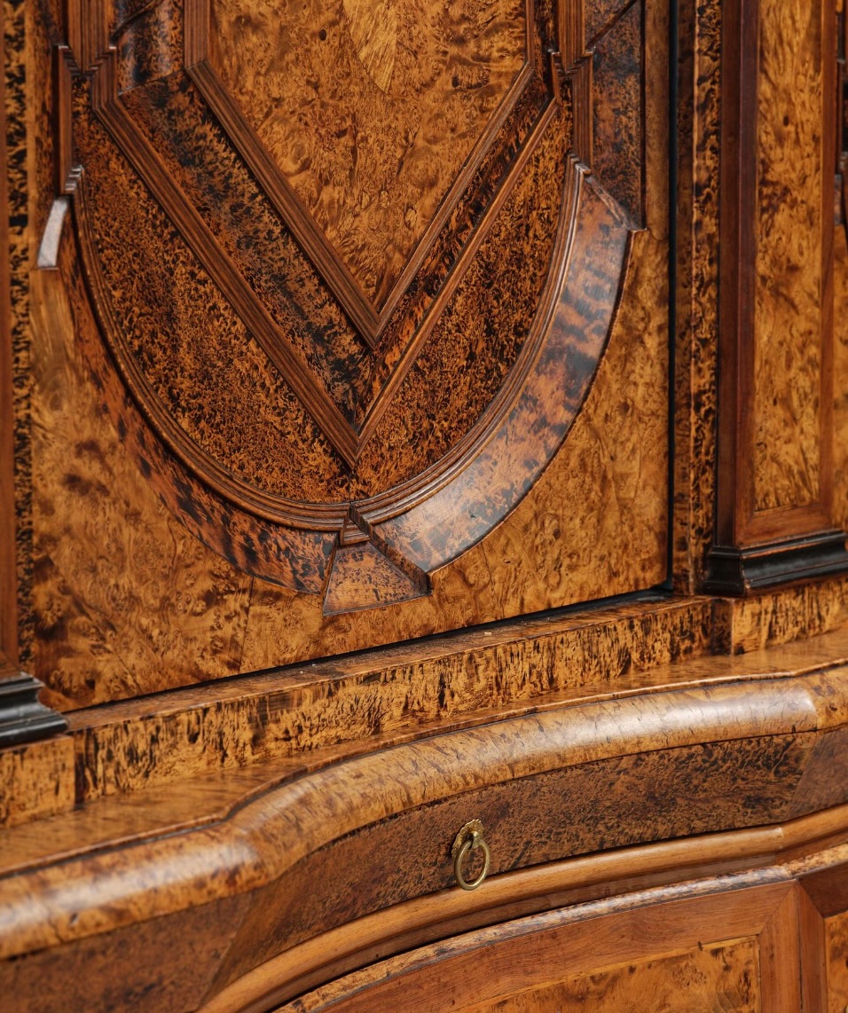 A Swedish baroque cabinet in amazing condition. Veneered with alder root, elm root, elm and masur beech. Fittings of gilded brass. Straight shape with broken crown. Profiled door mirrors with shelves and drawers behind, base cabinet with arched front, interior of four drawers. Sides with carrying handles. Blackened ball feet. The inside is painted in light blue. The inside has been repainted in the early 20th c but the original paint is under the newer paint and can be retrieved. These kind of cabinets were the pride of the home in those days. Not many has survived until today why it is rare to see them.