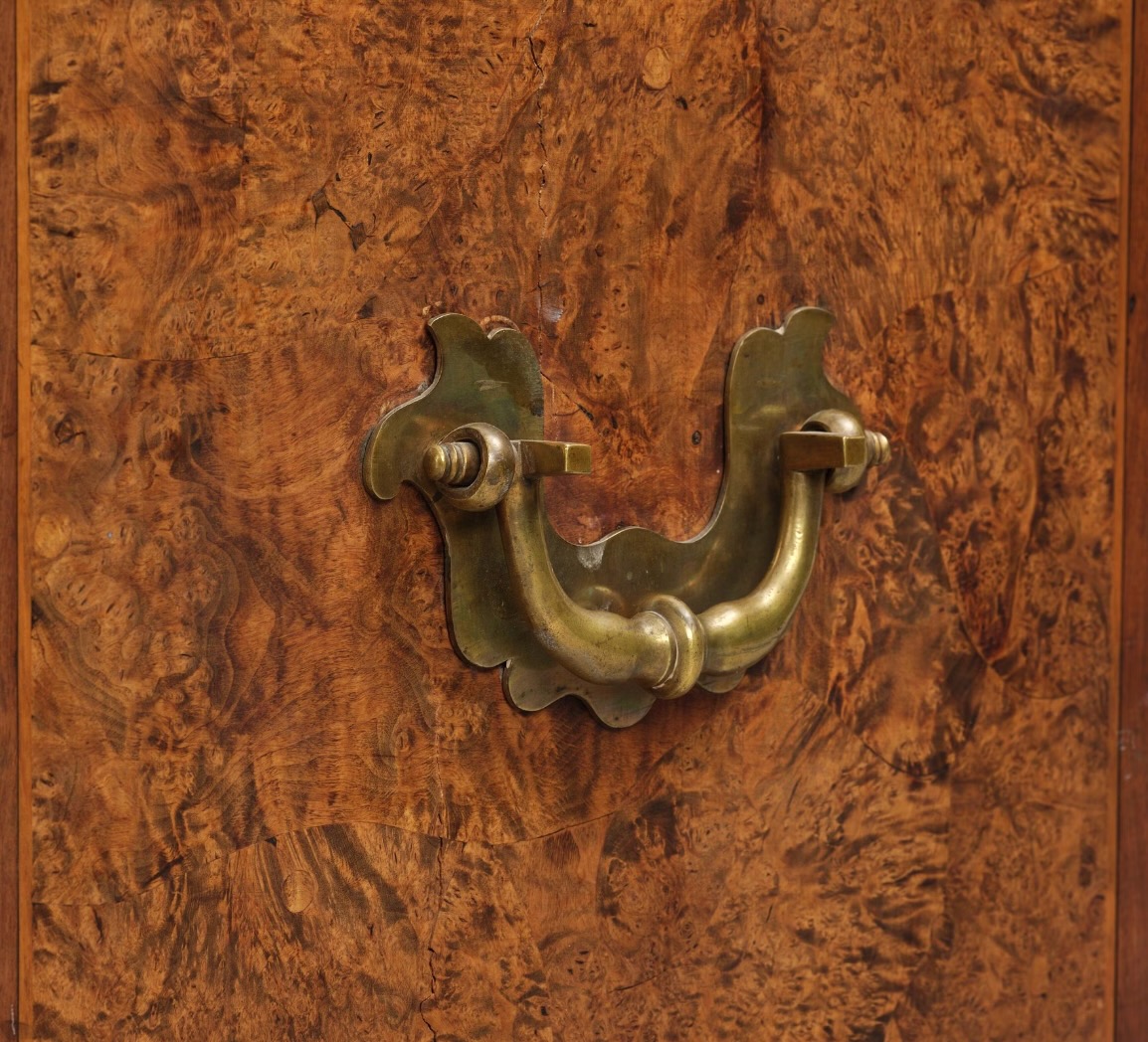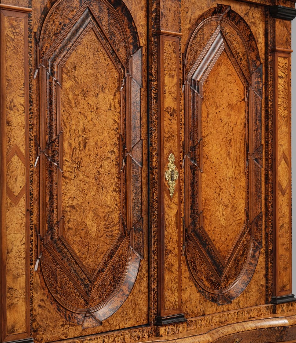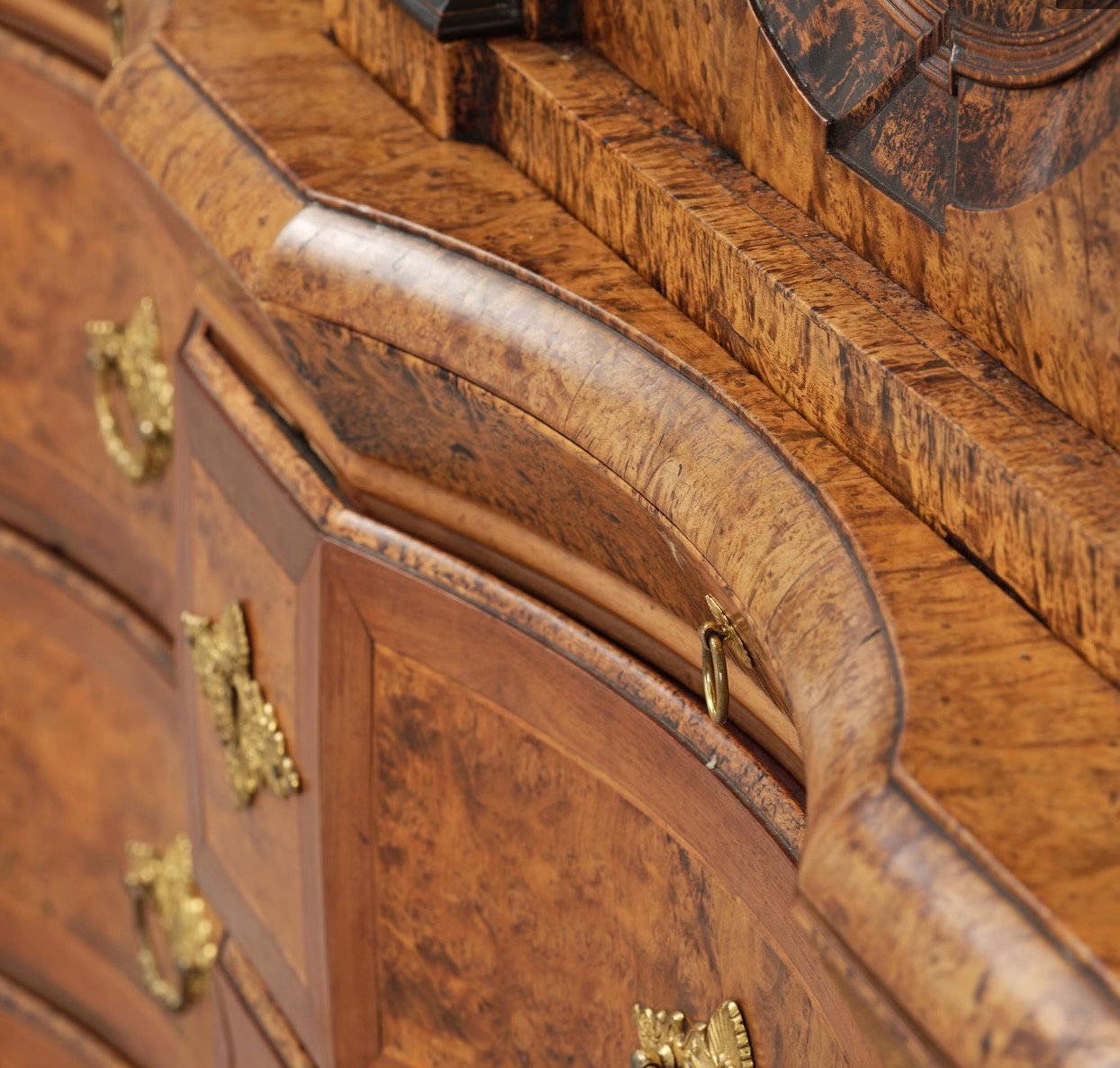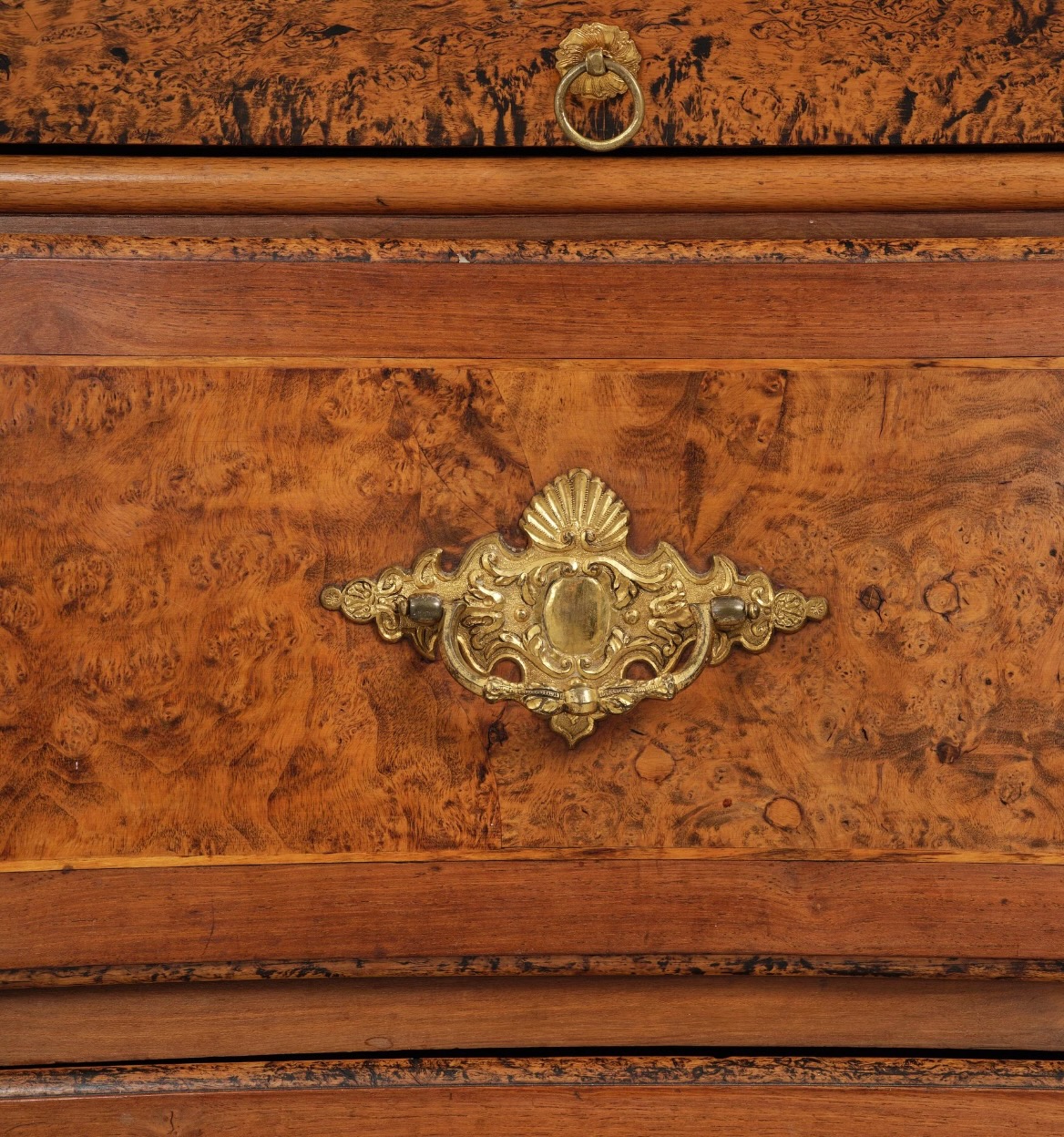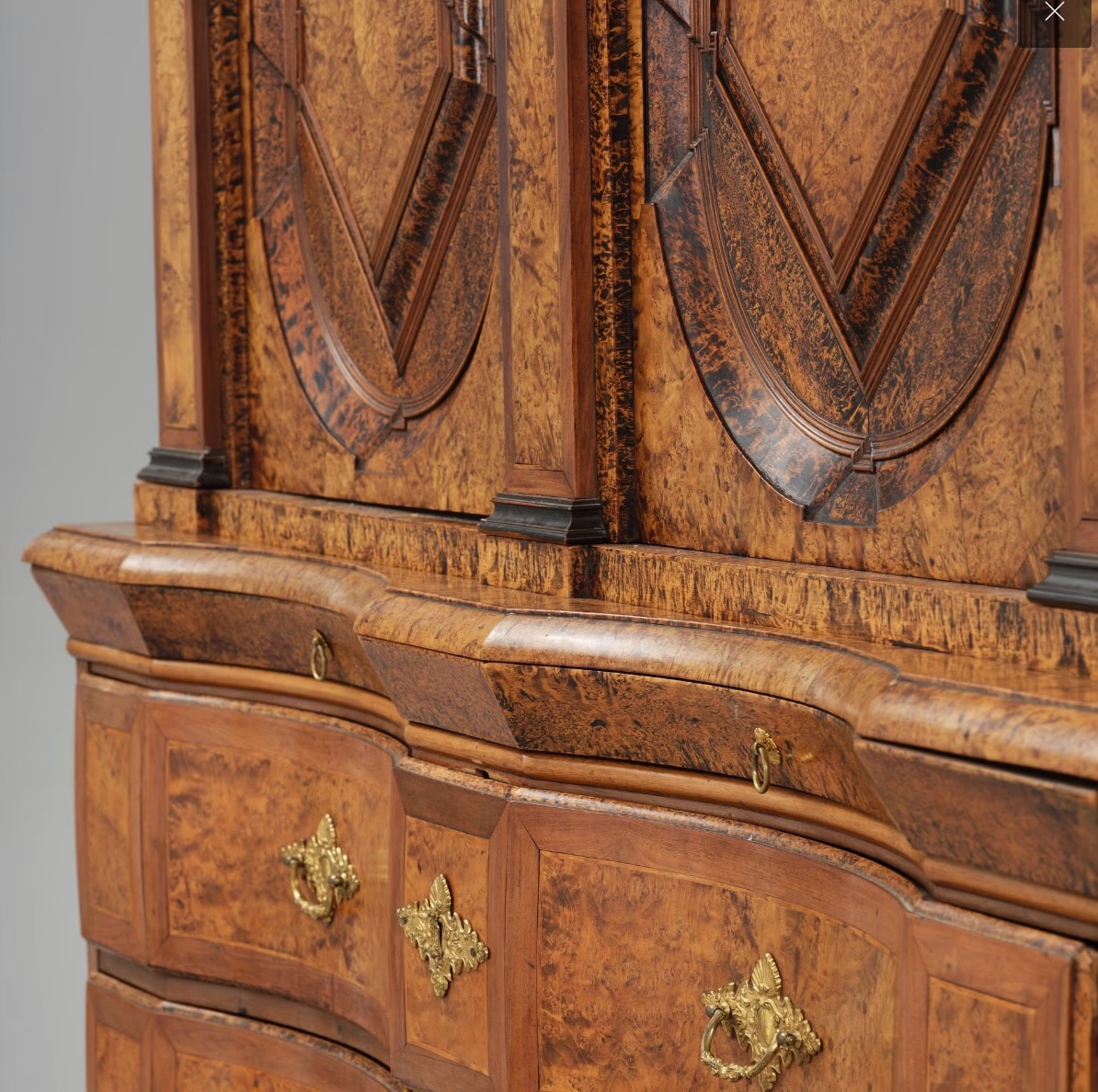A Swedish baroque cabinet in amazing condition. Veneered with alder root, elm root, elm and masur beech. Fittings of gilded brass. Straight shape with broken crown. Profiled door mirrors with shelves and drawers behind, base cabinet with arched front, interior of four drawers. Sides with carrying handles. Blackened ball feet. The inside is painted in light blue. The inside has been repainted in the early 20th c but the original paint is under the newer paint and can be retrieved. These kind of cabinets were the pride of the home in those days. Not many has survived until today why it is rare to see them.