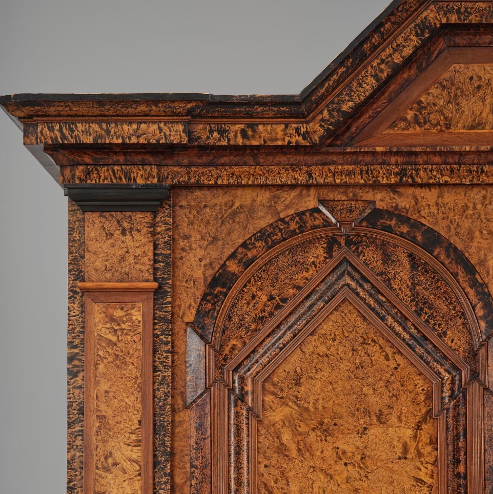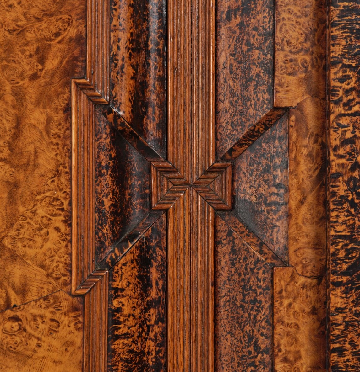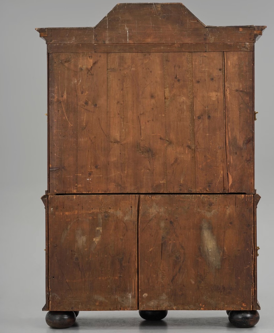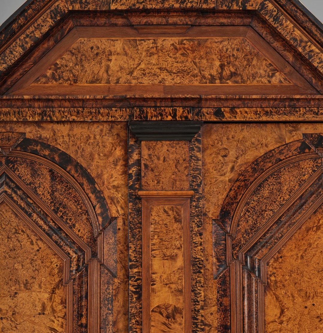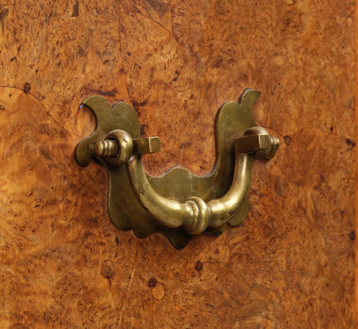 A Swedish baroque cabinet in amazing condition. Veneered with alder root, elm root, elm and masur beech. Fittings of gilded brass. Straight shape with broken crown. Profiled door mirrors with shelves and drawers behind, base cabinet with arched front, interior of four drawers. Sides with carrying handles. Blackened ball feet. The inside is painted in light blue. The inside has been repainted in the early 20th c but the original paint is under the newer paint and can be retrieved. These kind of cabinets were the pride of the home in those days. Not many has survived until today why it is rare to see them.