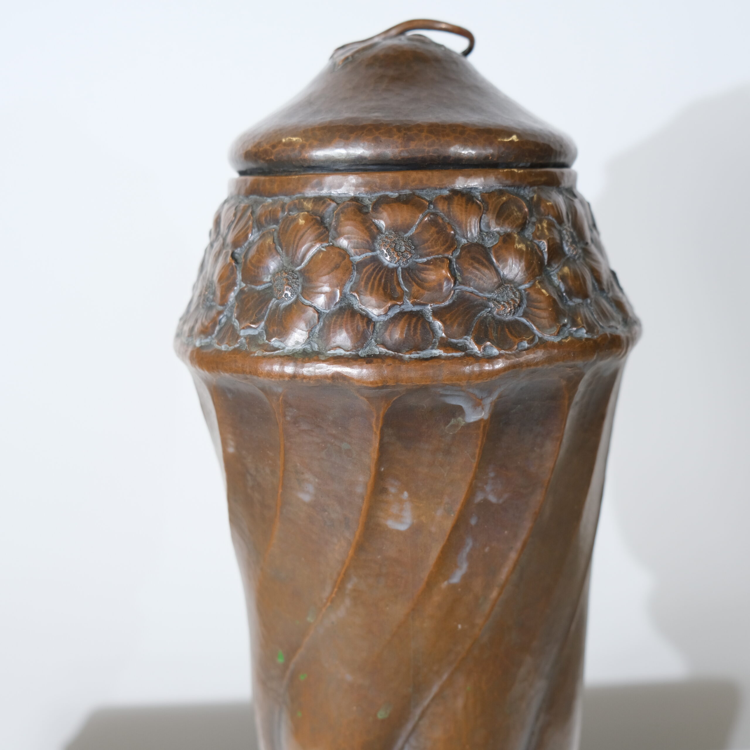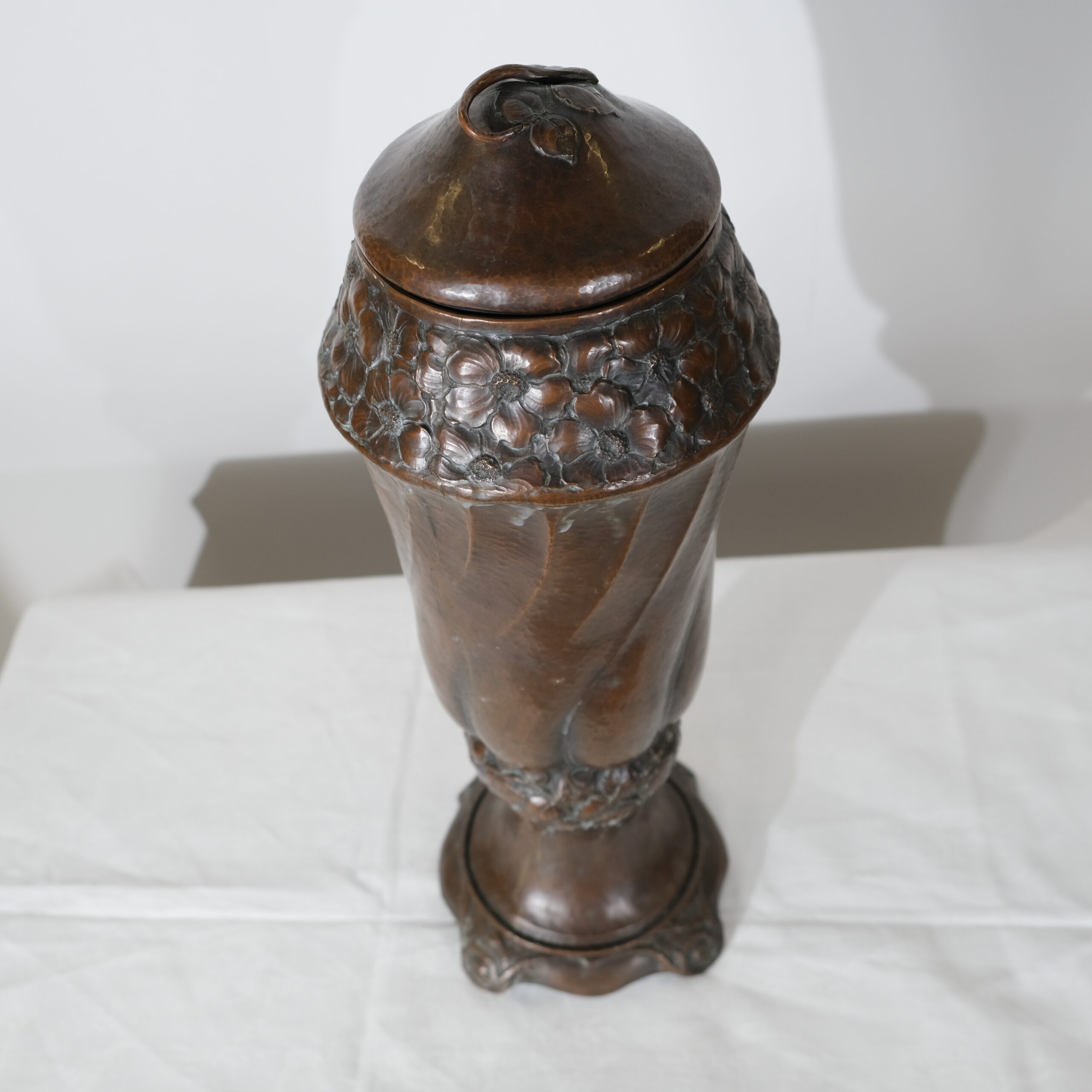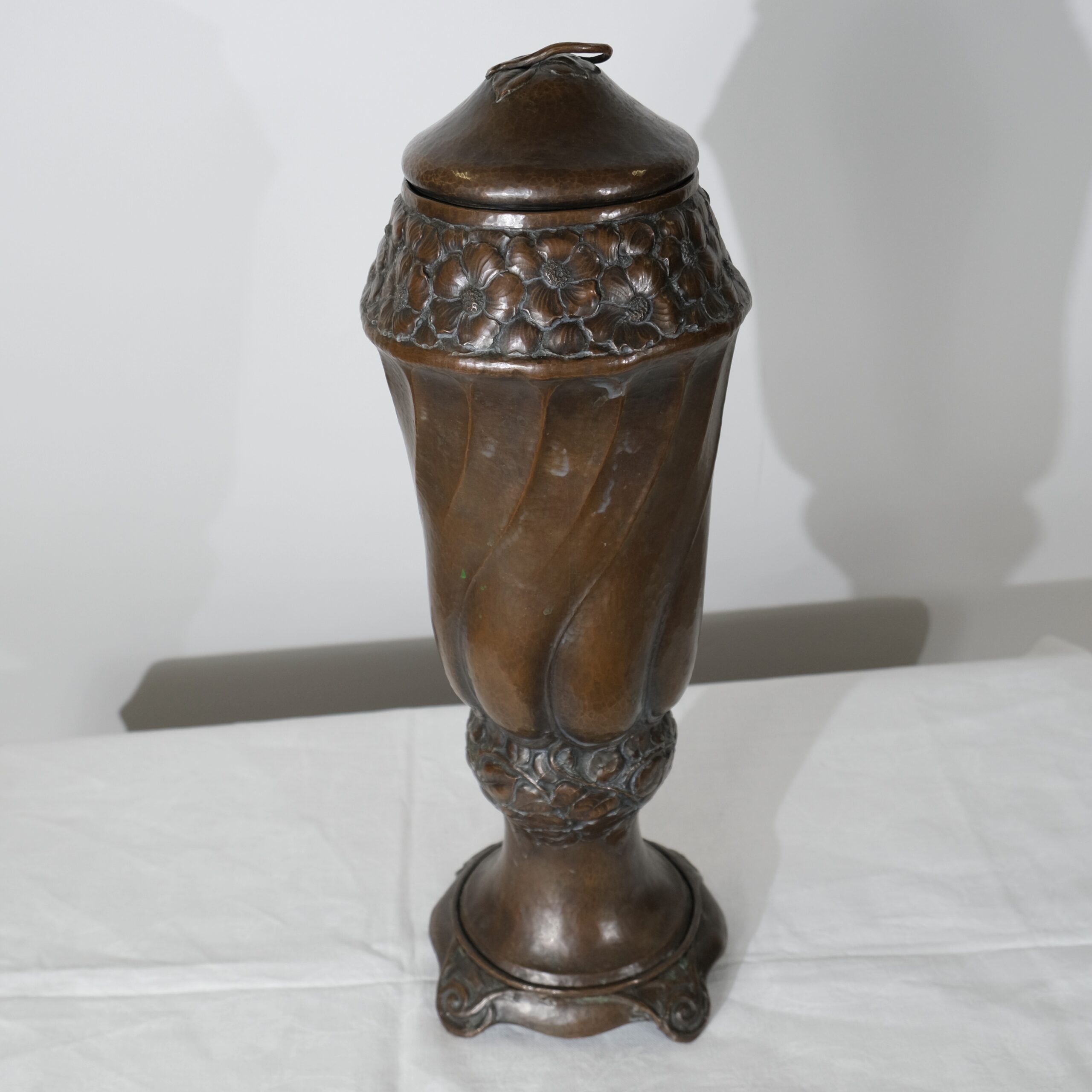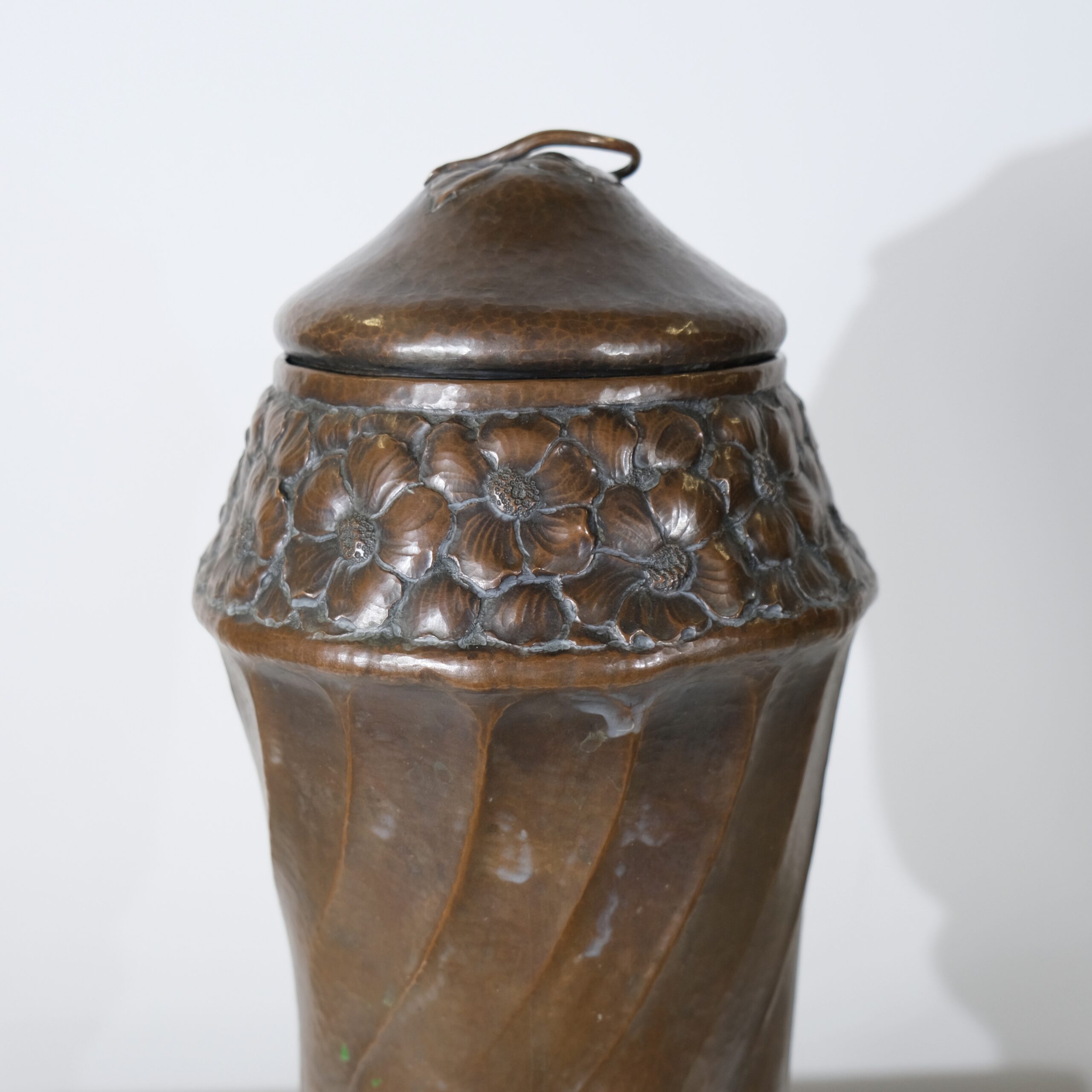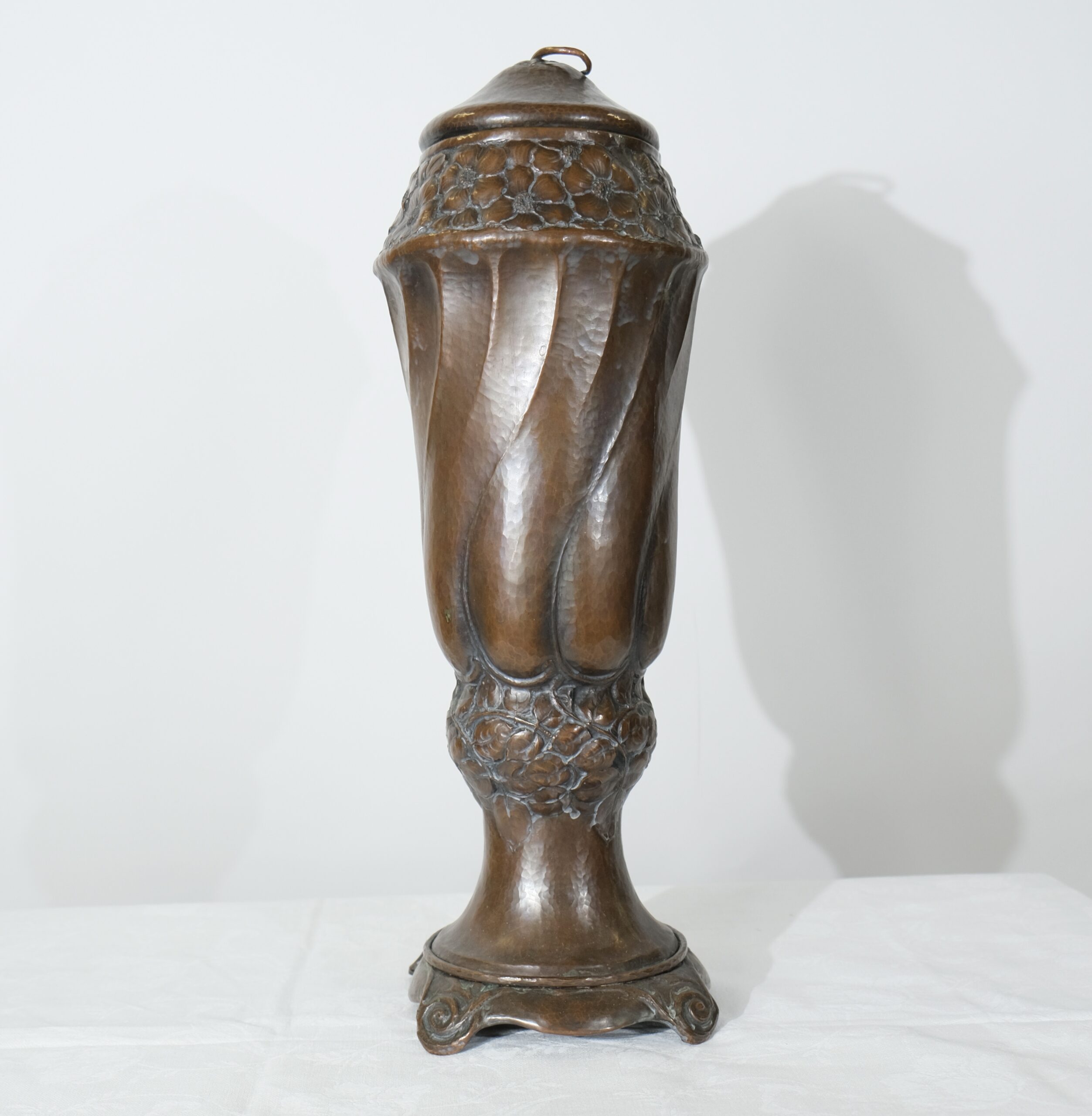This copper vase with a lid embodies the Art Nouveau style, characterized by its organic, flowing lines and intricate detailing. The vase features a twisted, elongated form with swirling, petal-like patterns that create a dynamic sense of movement, reminiscent of natural shapes like flower buds or swirling leaves. The surface and pattern is created by hammering its inside, all handcrafted. The top and bottom sections are adorned with delicate, floral motifs that seamlessly blend into the vase's overall design, adding texture and visual interest. The lid is gently domed, topped with a handle in the shape of a leaf, and complements the vase's elegant silhouette. The base is flared with subtle, curled feet that provide stability while enhancing its graceful, nature-inspired aesthetic, typical of Art Nouveau craftsmanship.